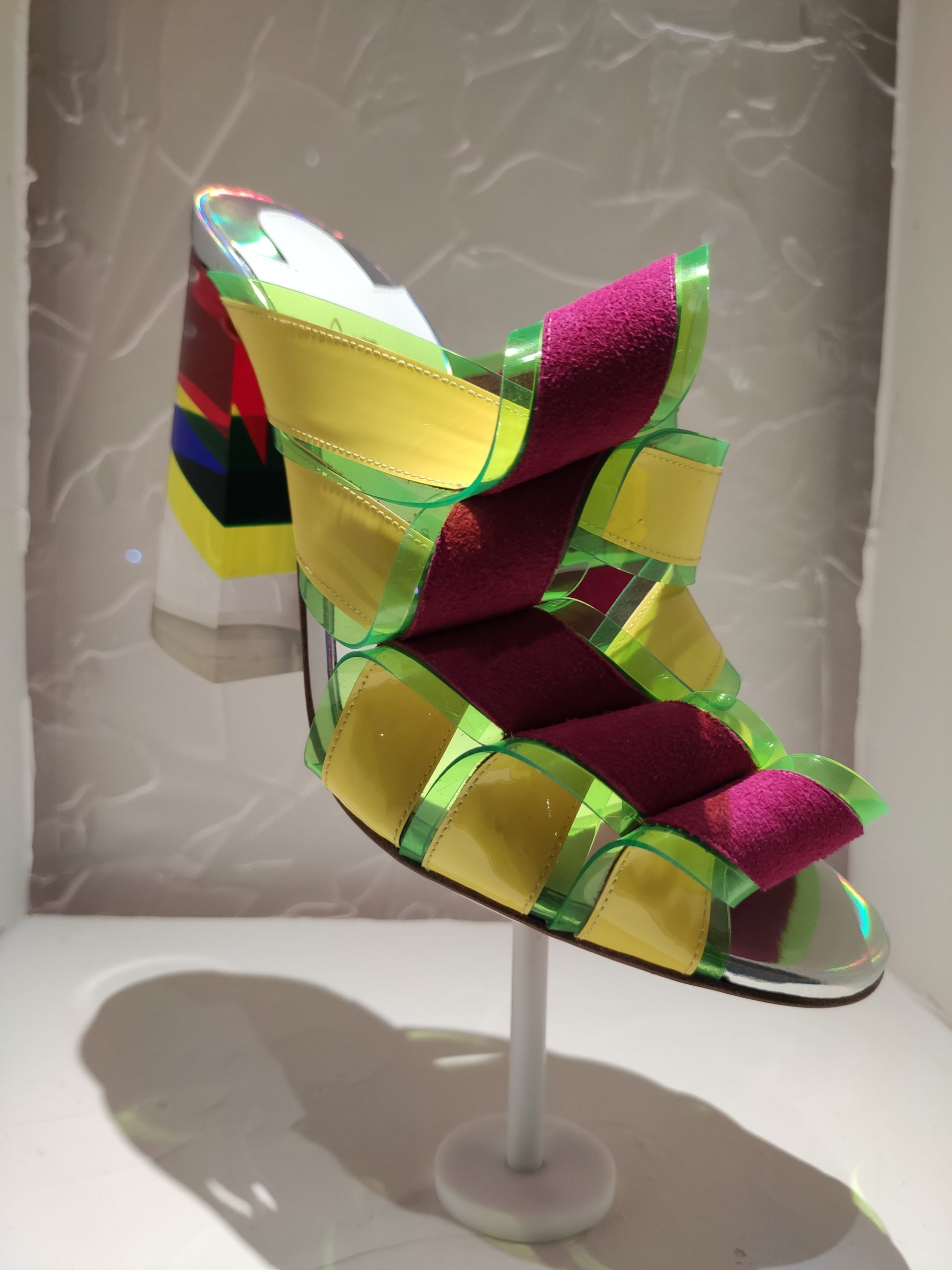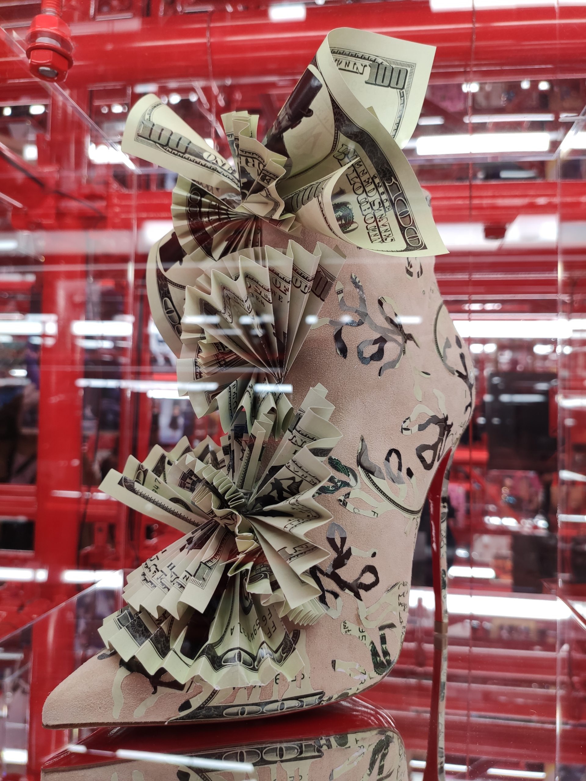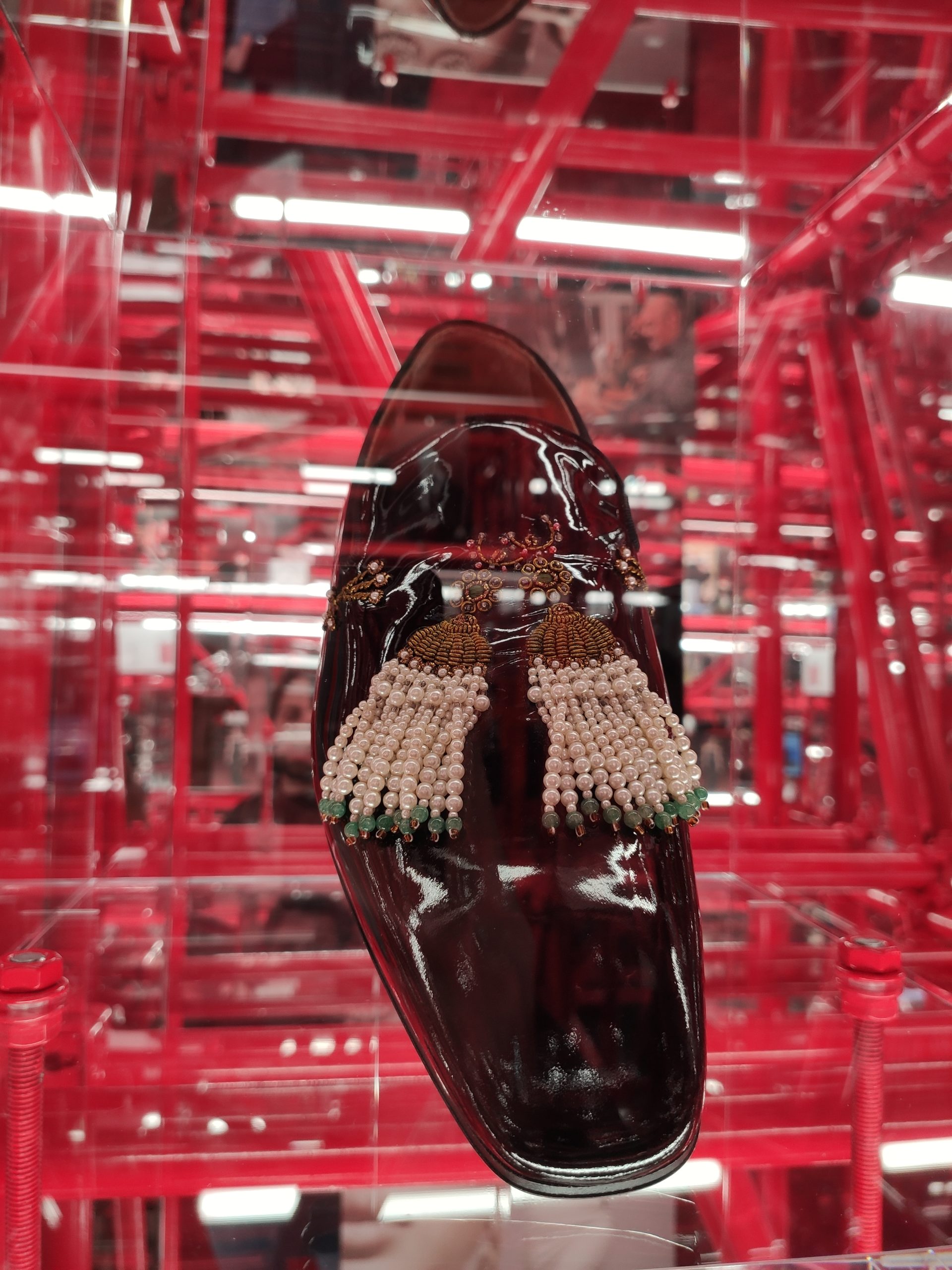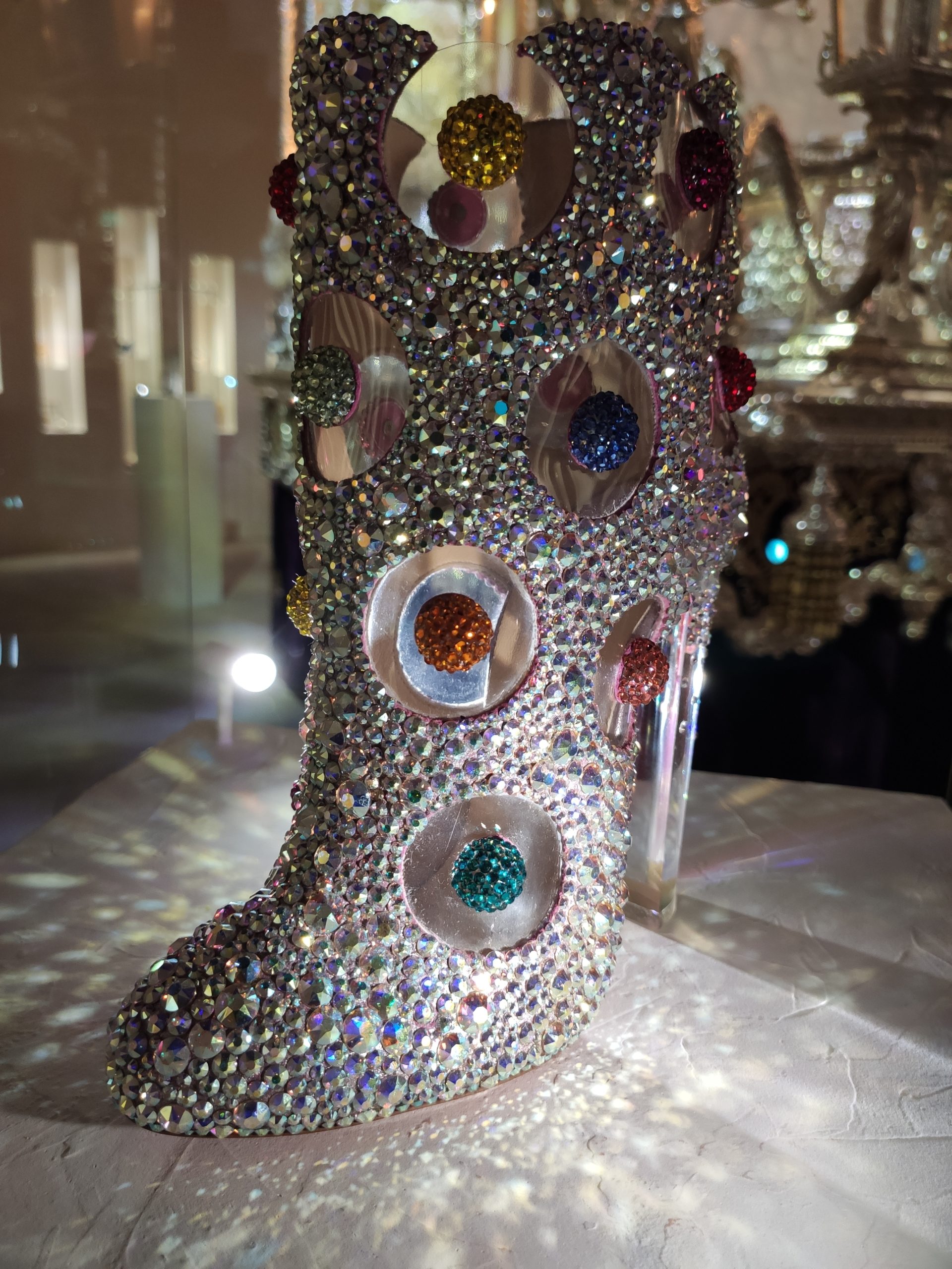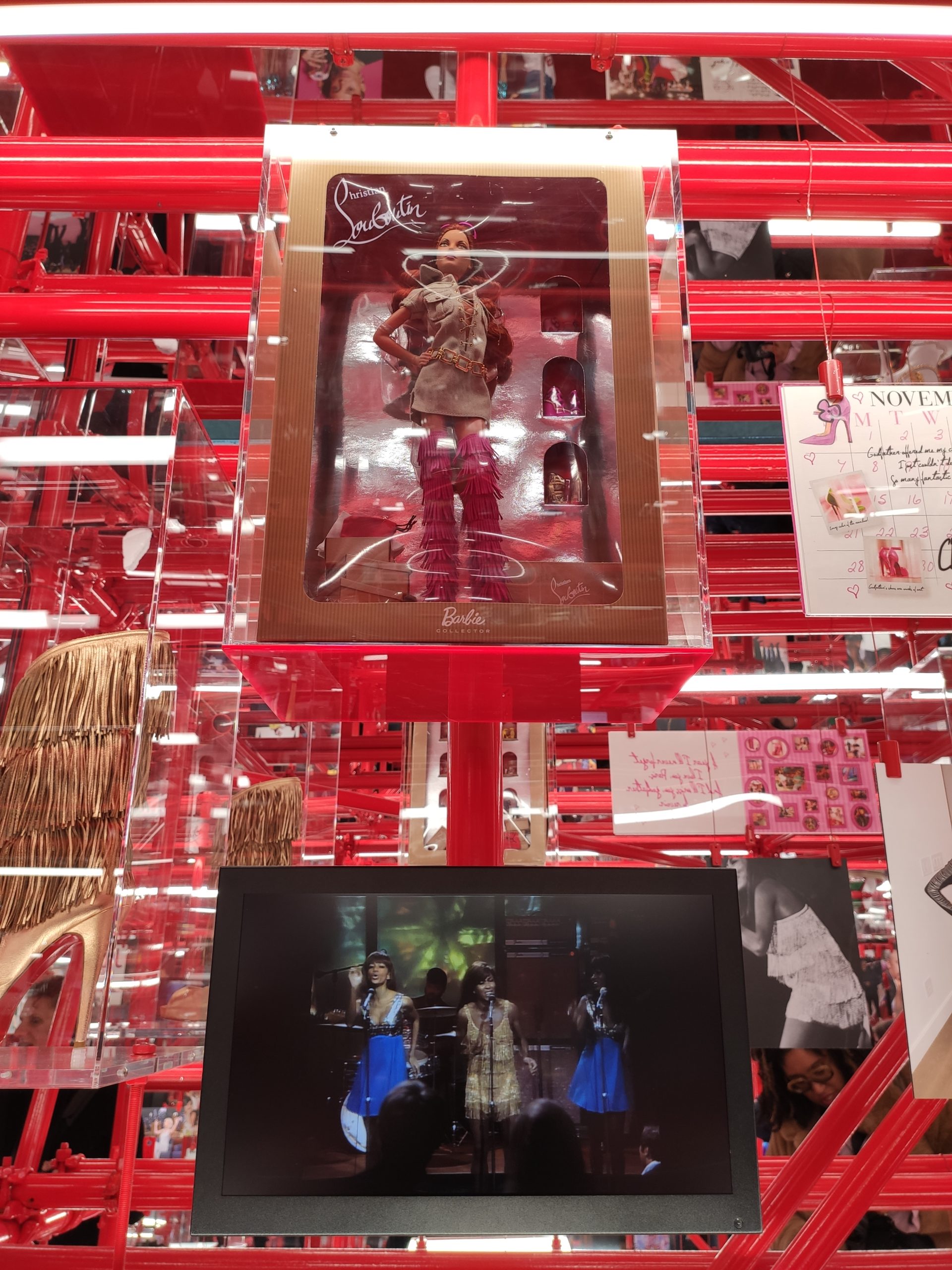 Une large sélection de souliers et croquis est présentée, dont certains jamais exposés. Ces pièces patrimoniales et artistiques sont exposées aux côtés de nombreuses collaborations qui soulignent l’attachement de Christian Louboutin pour les savoir-faire et les métiers d’art, comme des vitraux réalisés par la Maison du Vitrail à Paris, un palanquin d’argent réalisé par l’Orfebreria Villareal de Séville, ou encore un cabaret sculpté au Bhoutan.