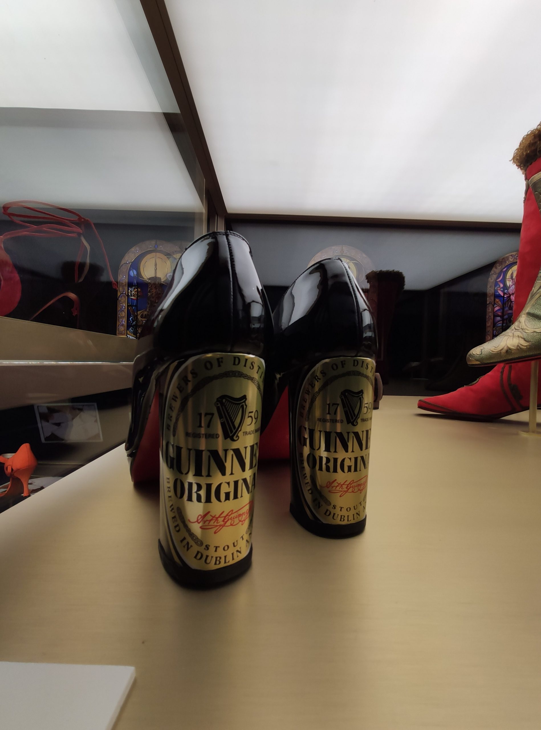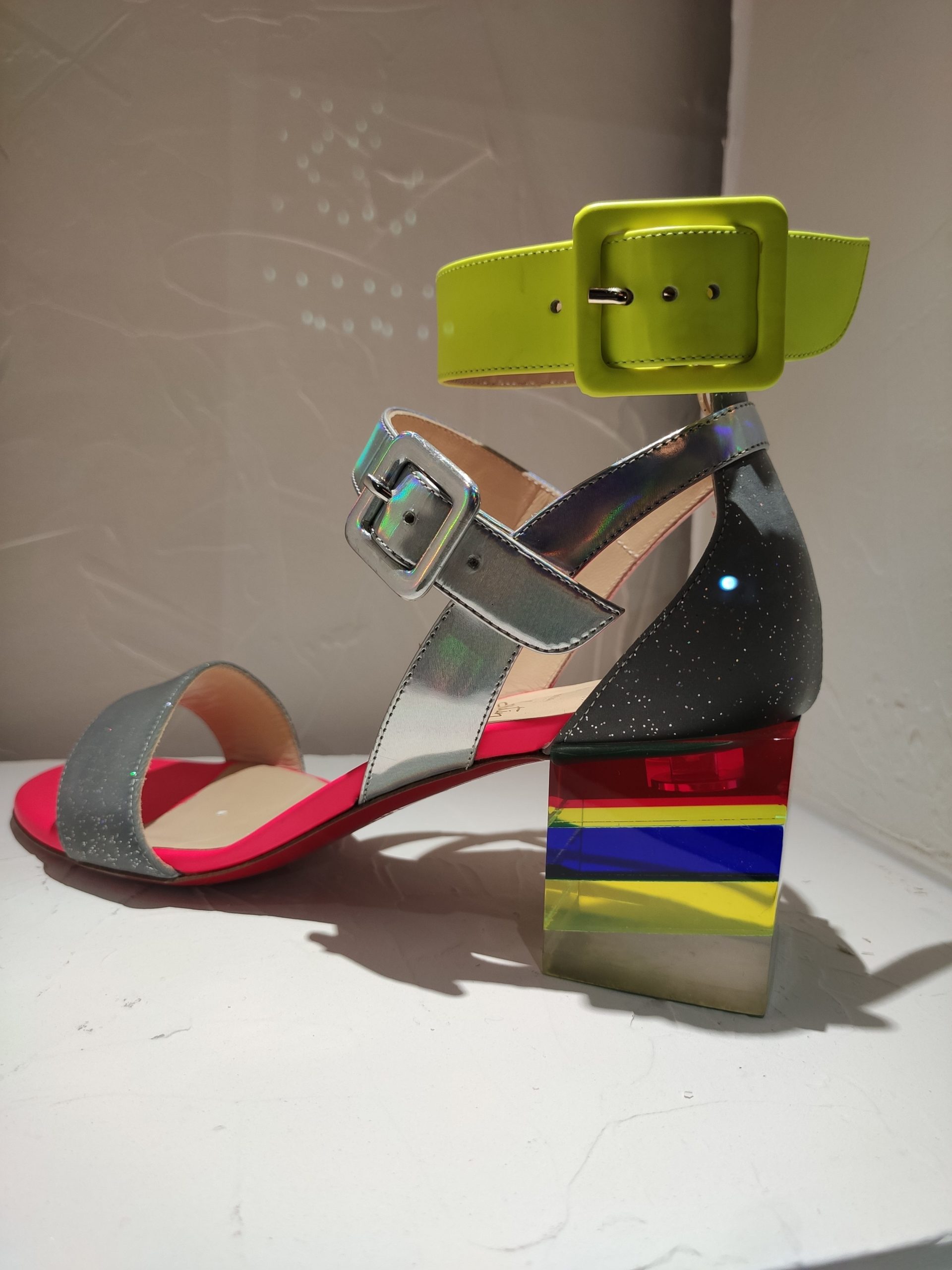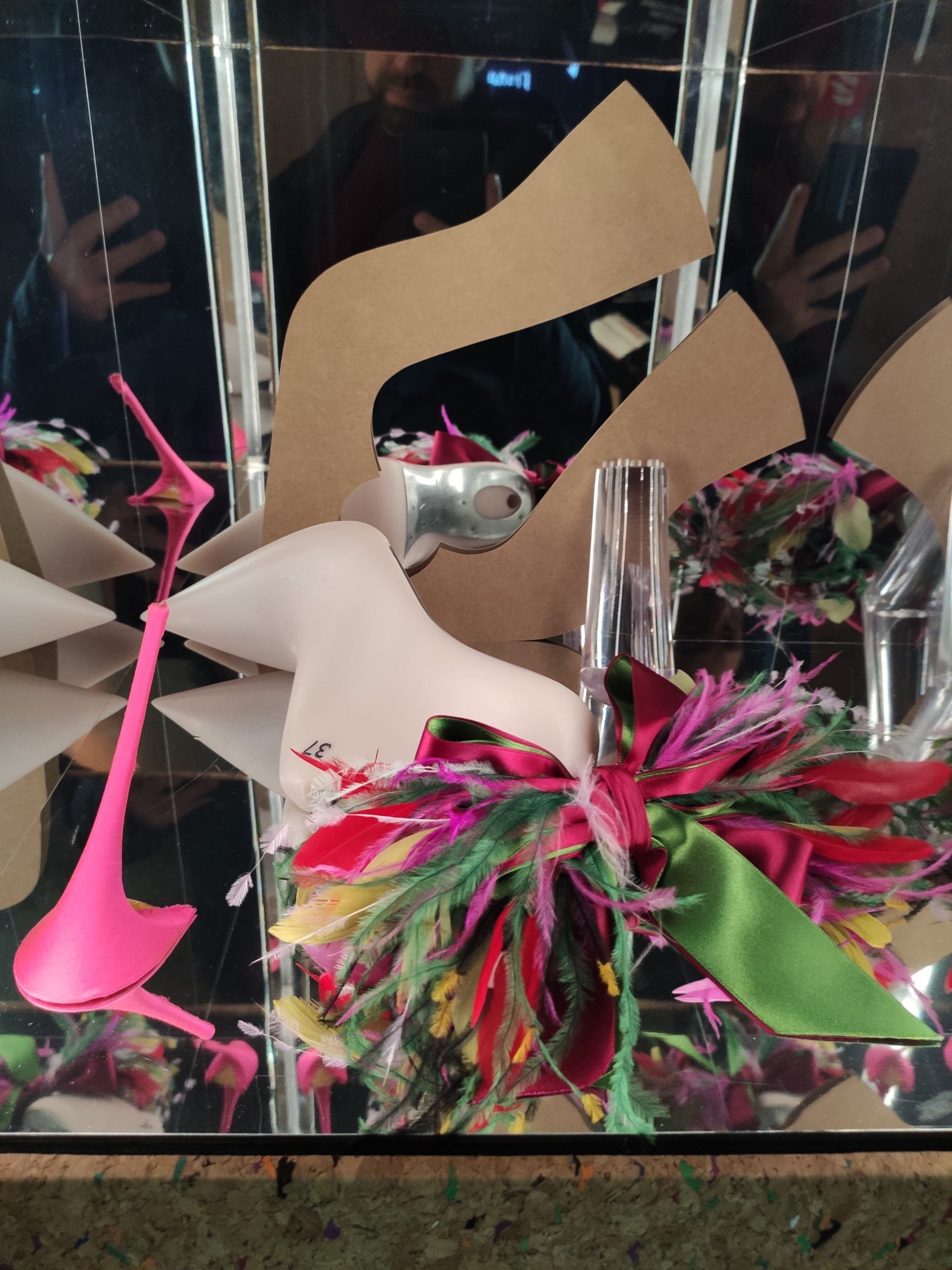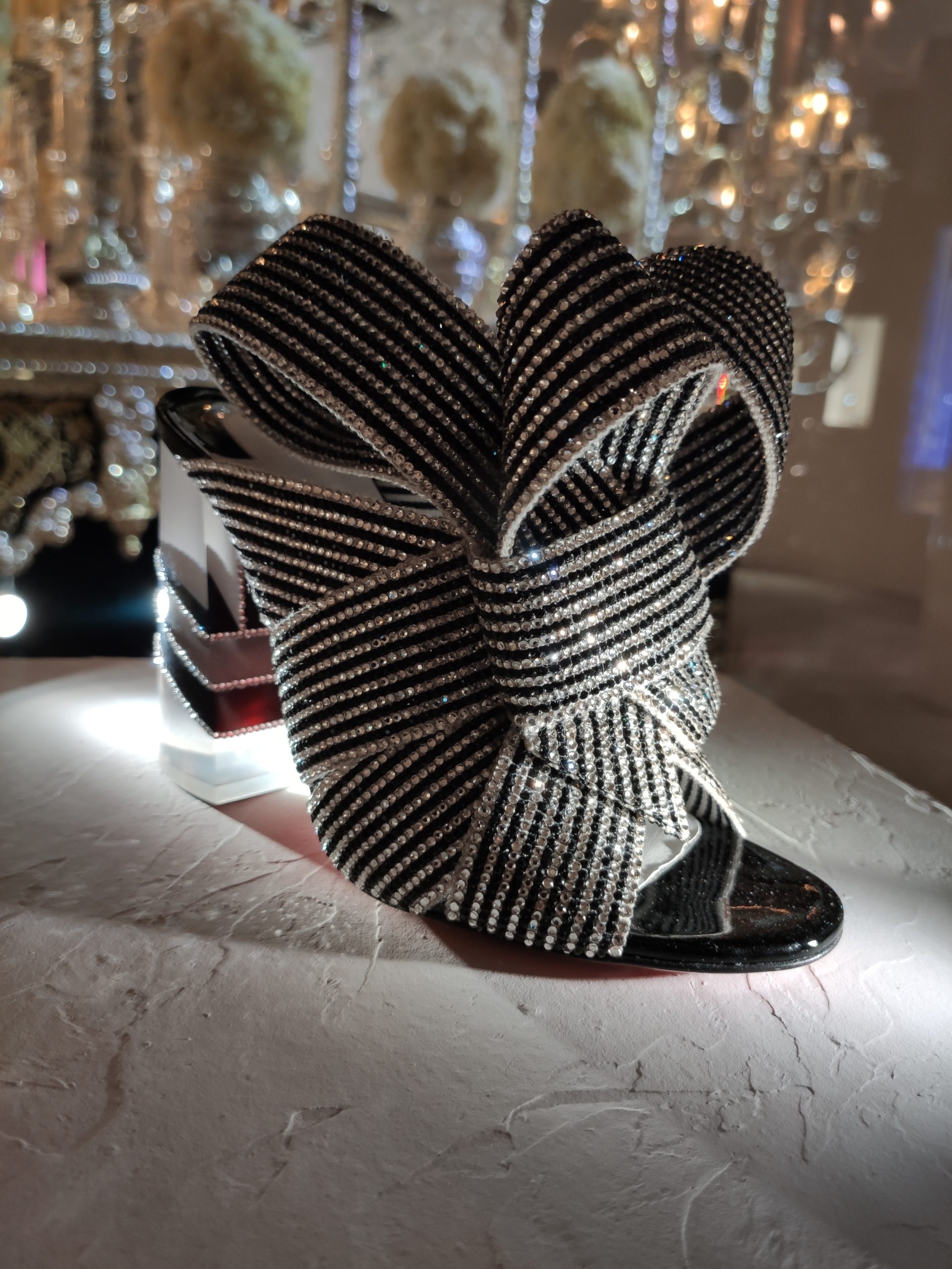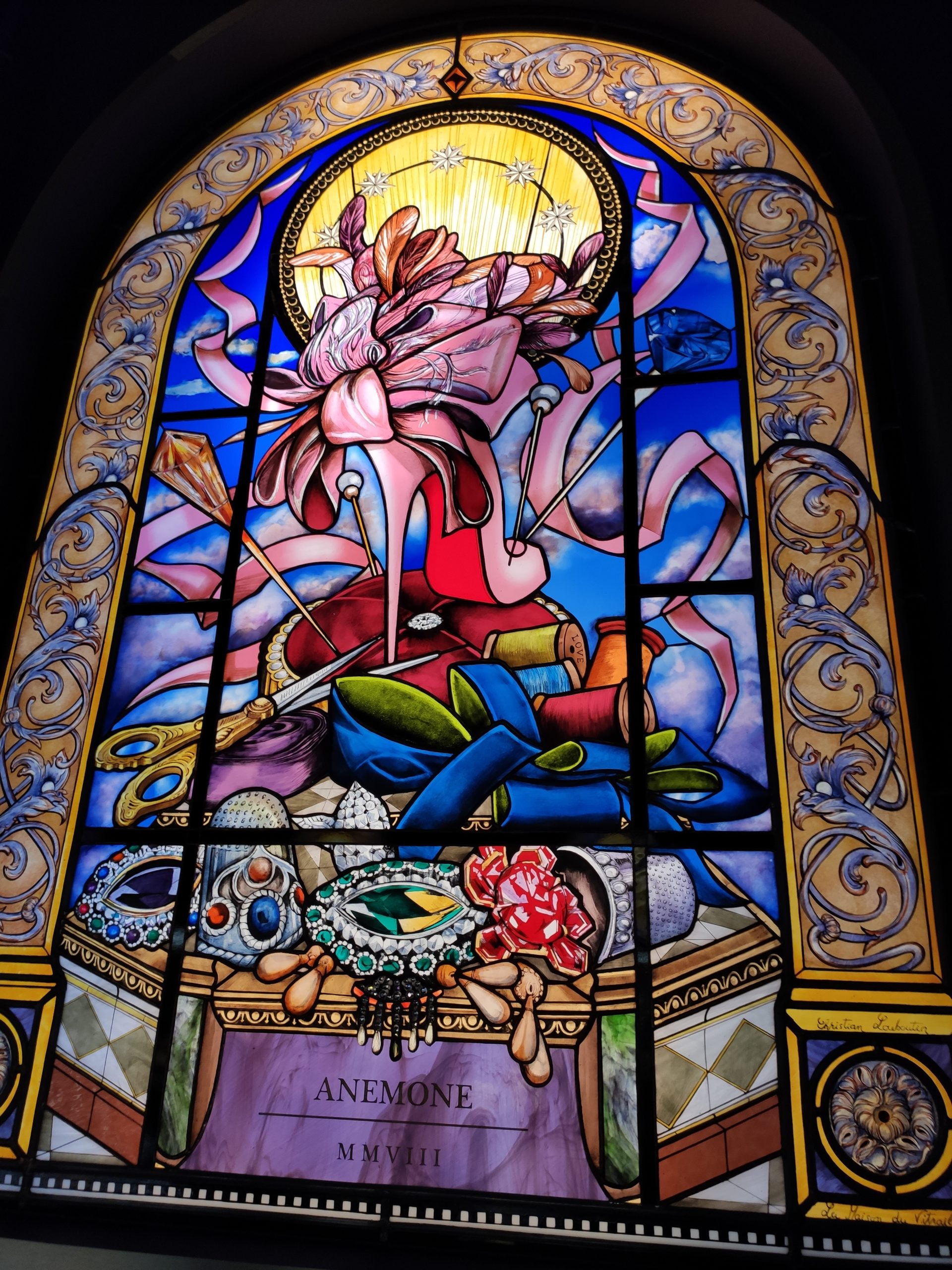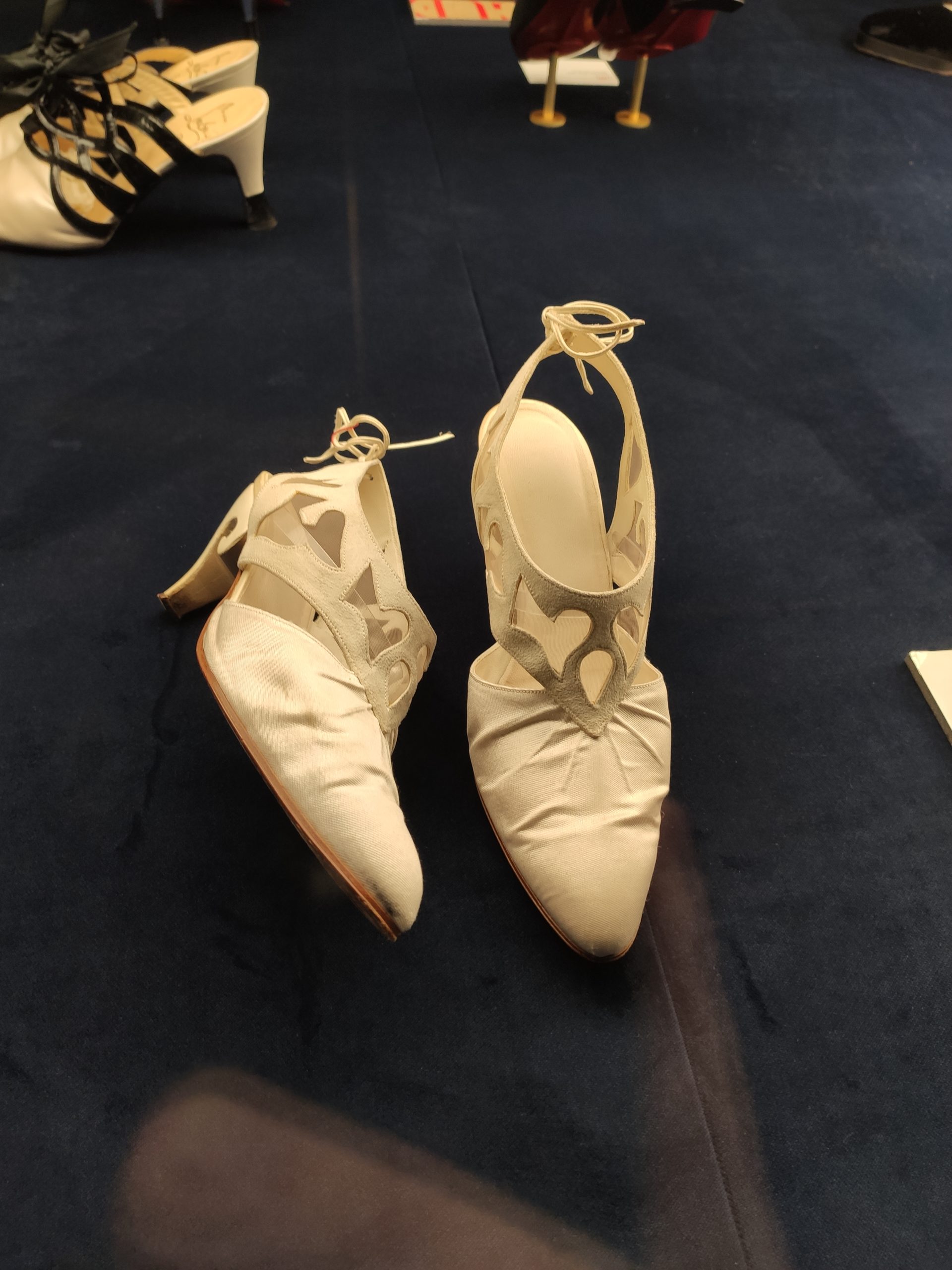 Une large sélection de souliers et croquis est présentée, dont certains jamais exposés. Ces pièces patrimoniales et artistiques sont exposées aux côtés de nombreuses collaborations qui soulignent l’attachement de Christian Louboutin pour les savoir-faire et les métiers d’art, comme des vitraux réalisés par la Maison du Vitrail à Paris, un palanquin d’argent réalisé par l’Orfebreria Villareal de Séville, ou encore un cabaret sculpté au Bhoutan.