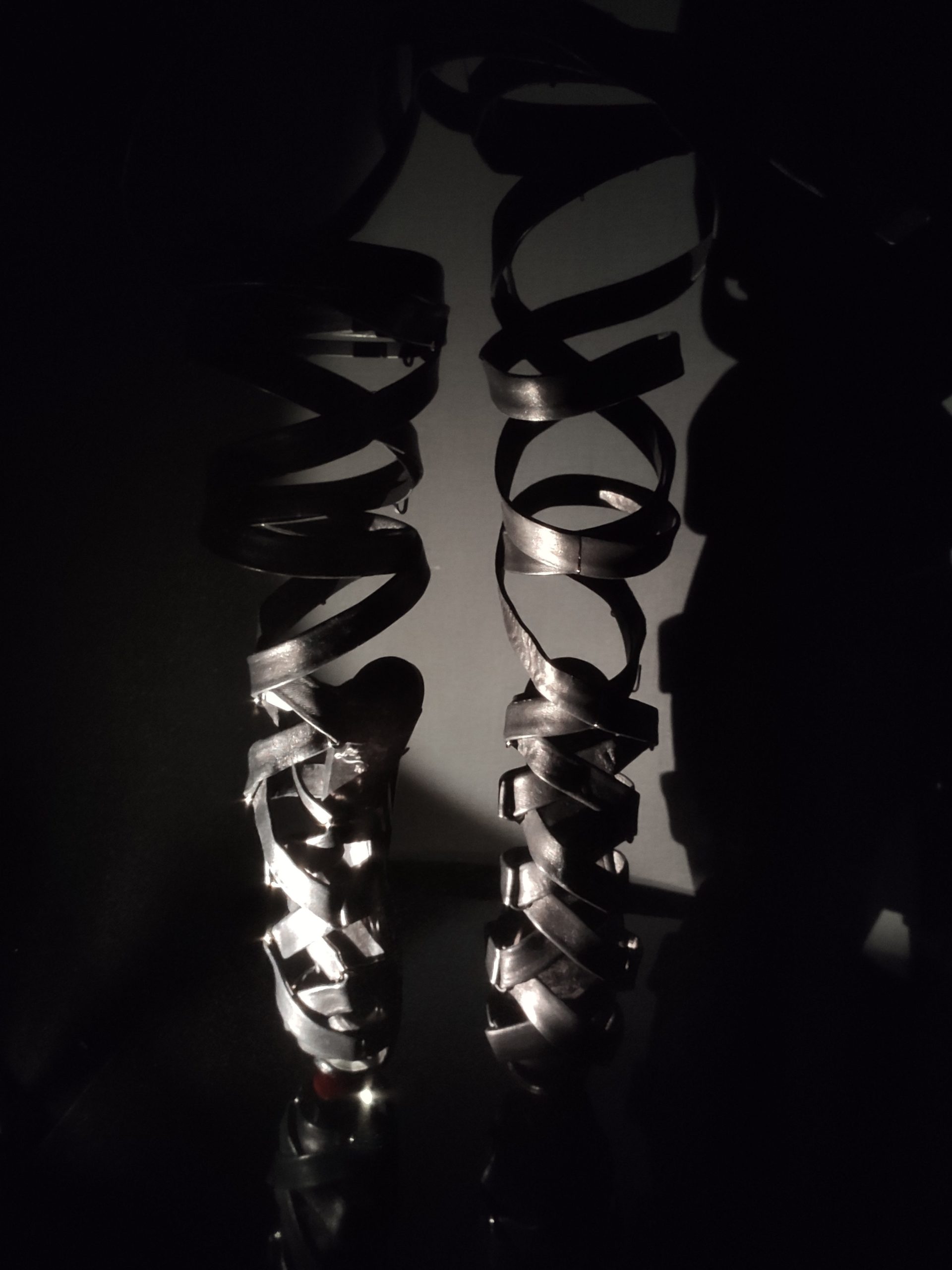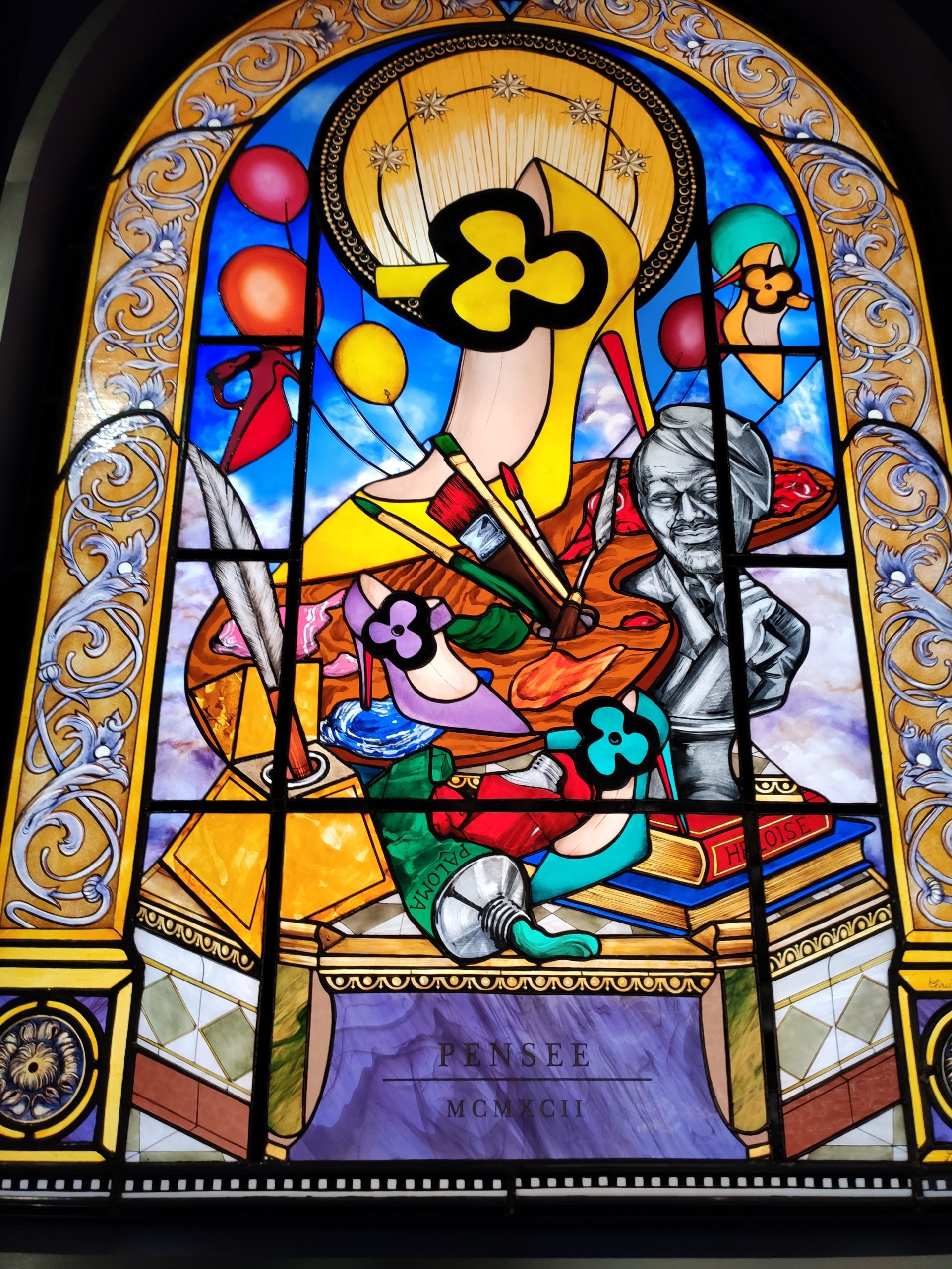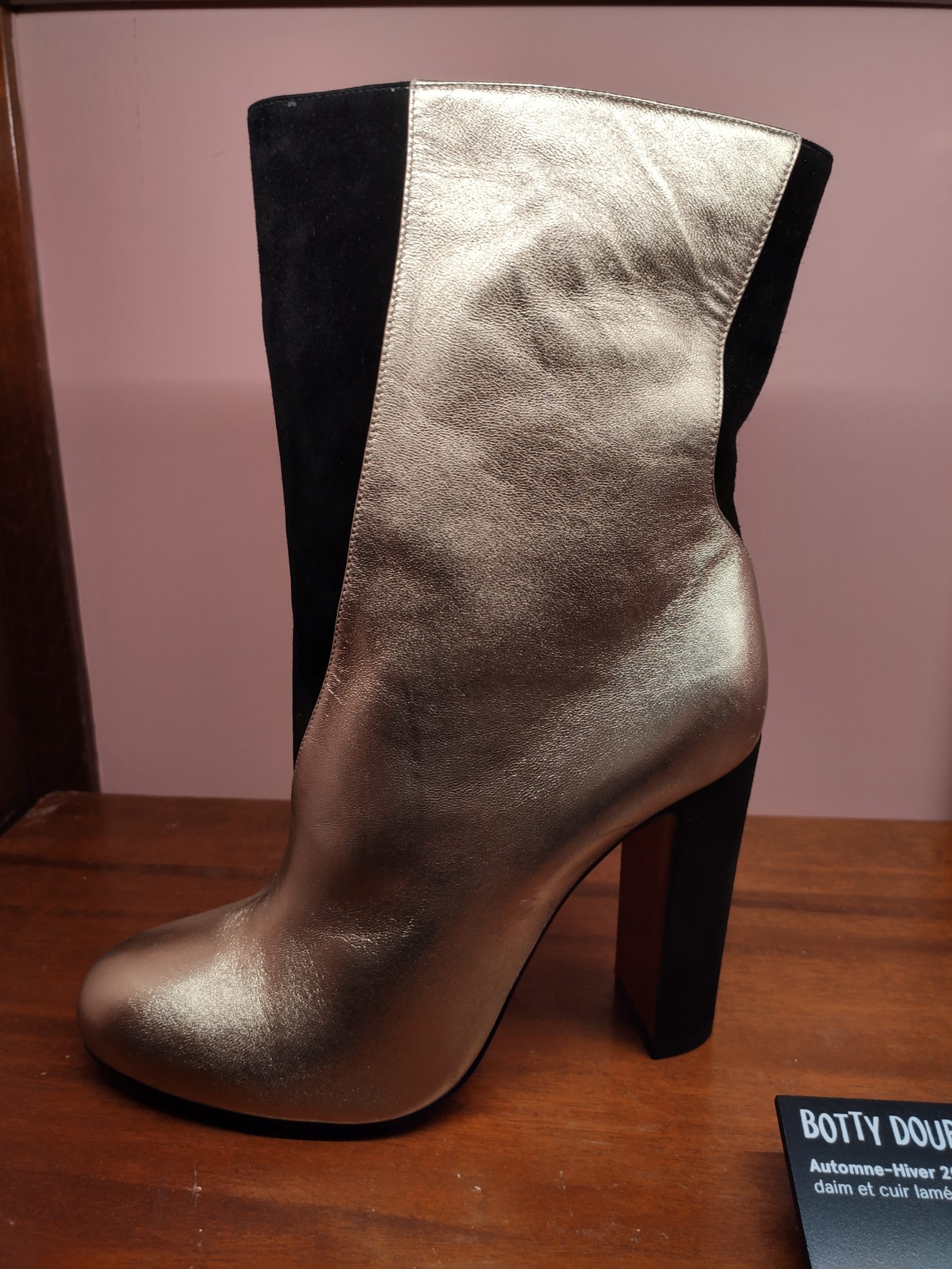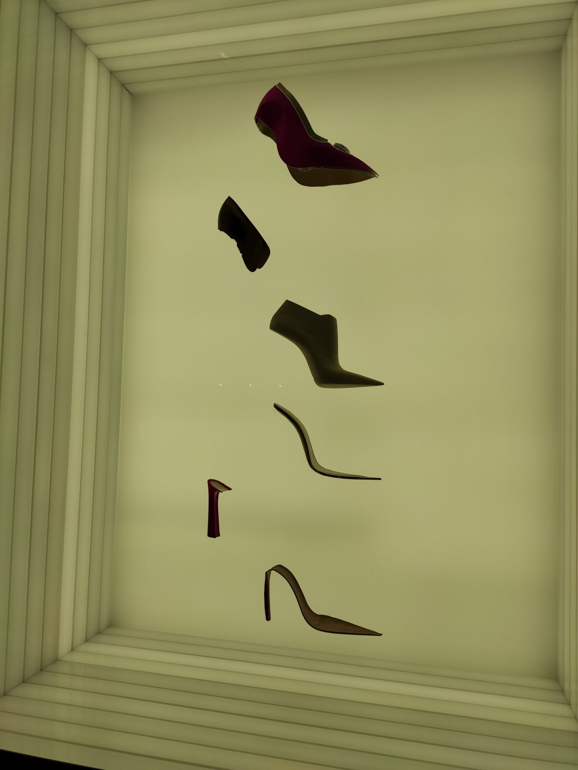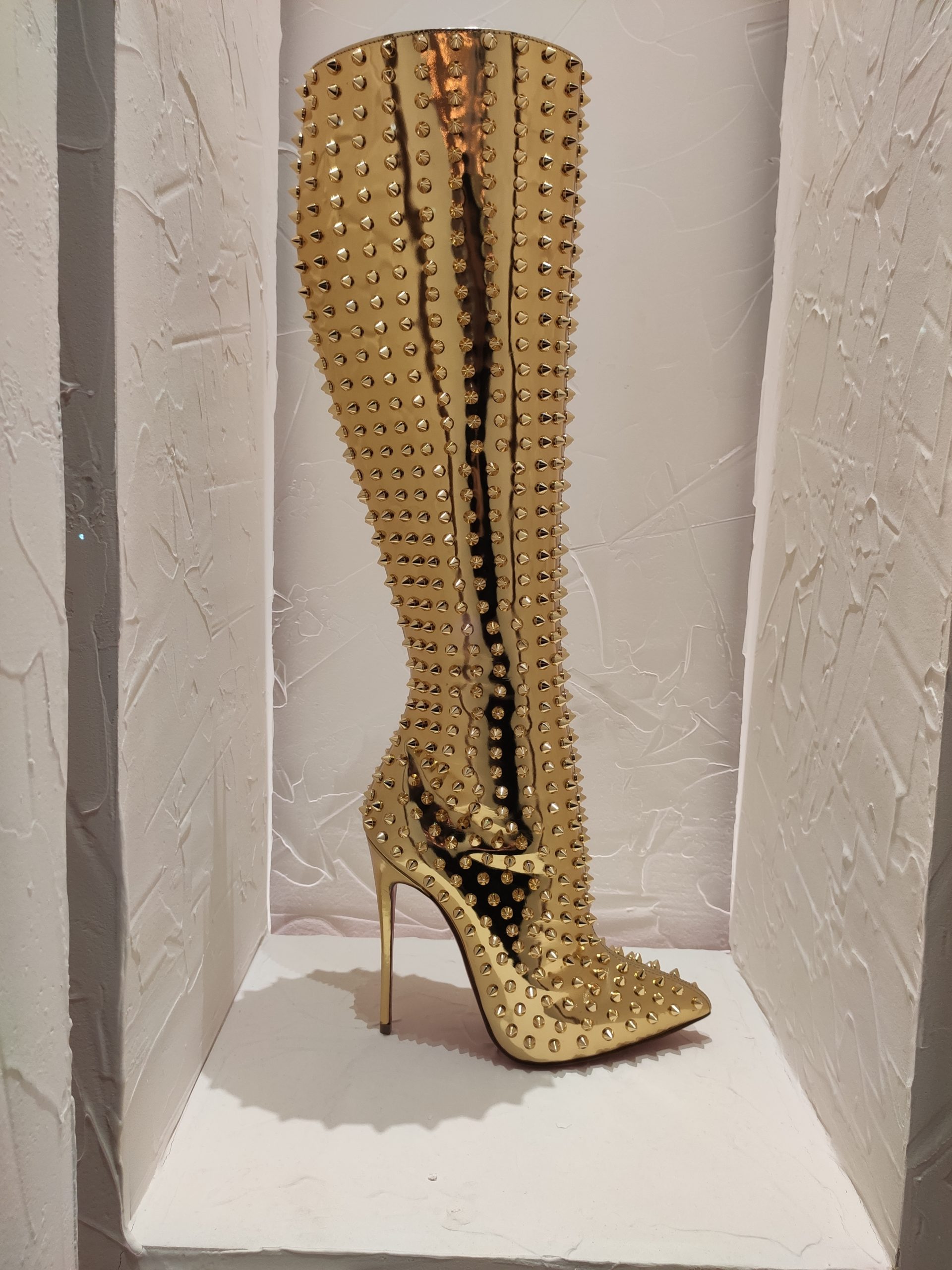 Une large sélection de souliers et croquis est présentée, dont certains jamais exposés. Ces pièces patrimoniales et artistiques sont exposées aux côtés de nombreuses collaborations qui soulignent l’attachement de Christian Louboutin pour les savoir-faire et les métiers d’art, comme des vitraux réalisés par la Maison du Vitrail à Paris, un palanquin d’argent réalisé par l’Orfebreria Villareal de Séville, ou encore un cabaret sculpté au Bhoutan.