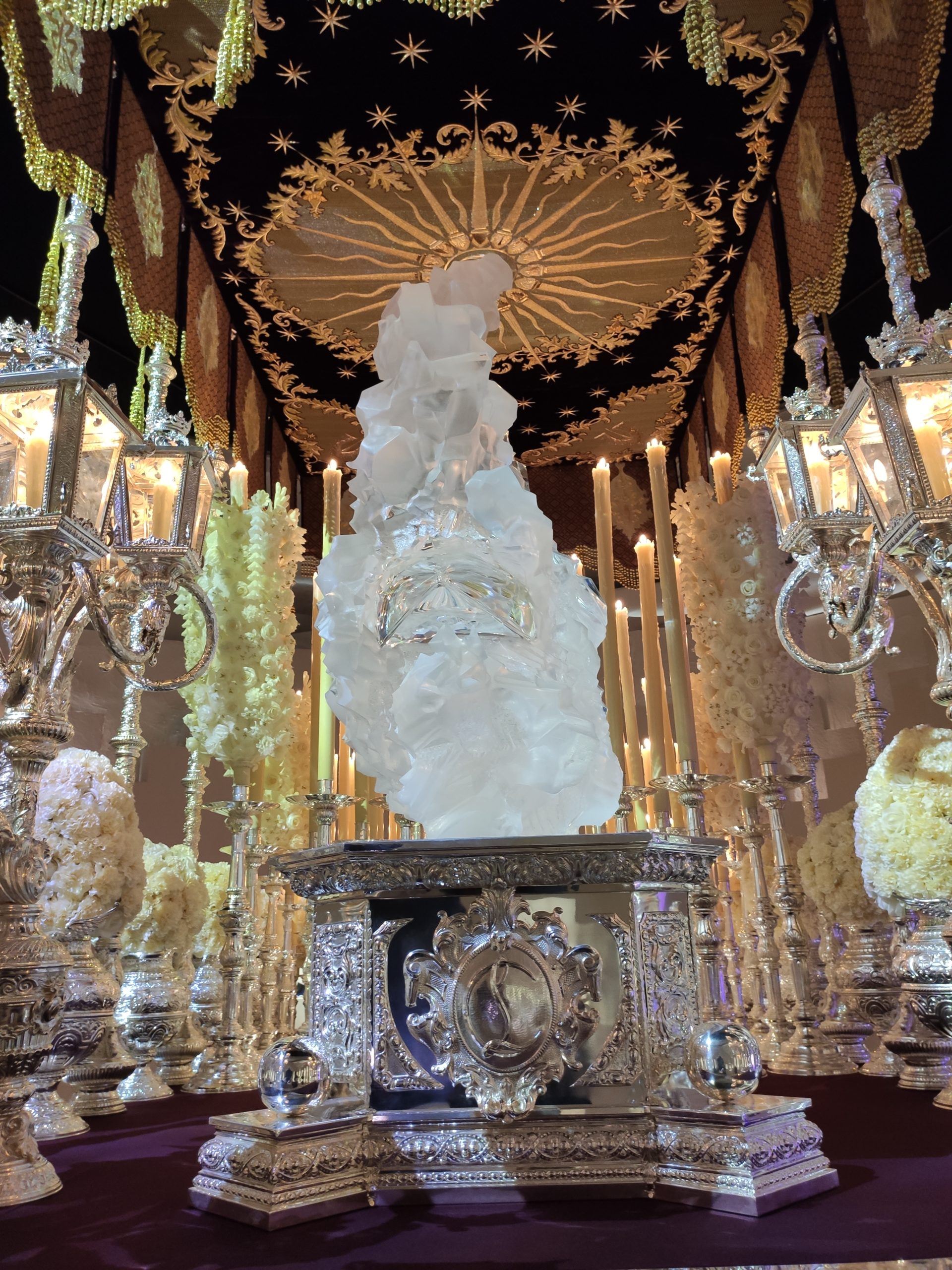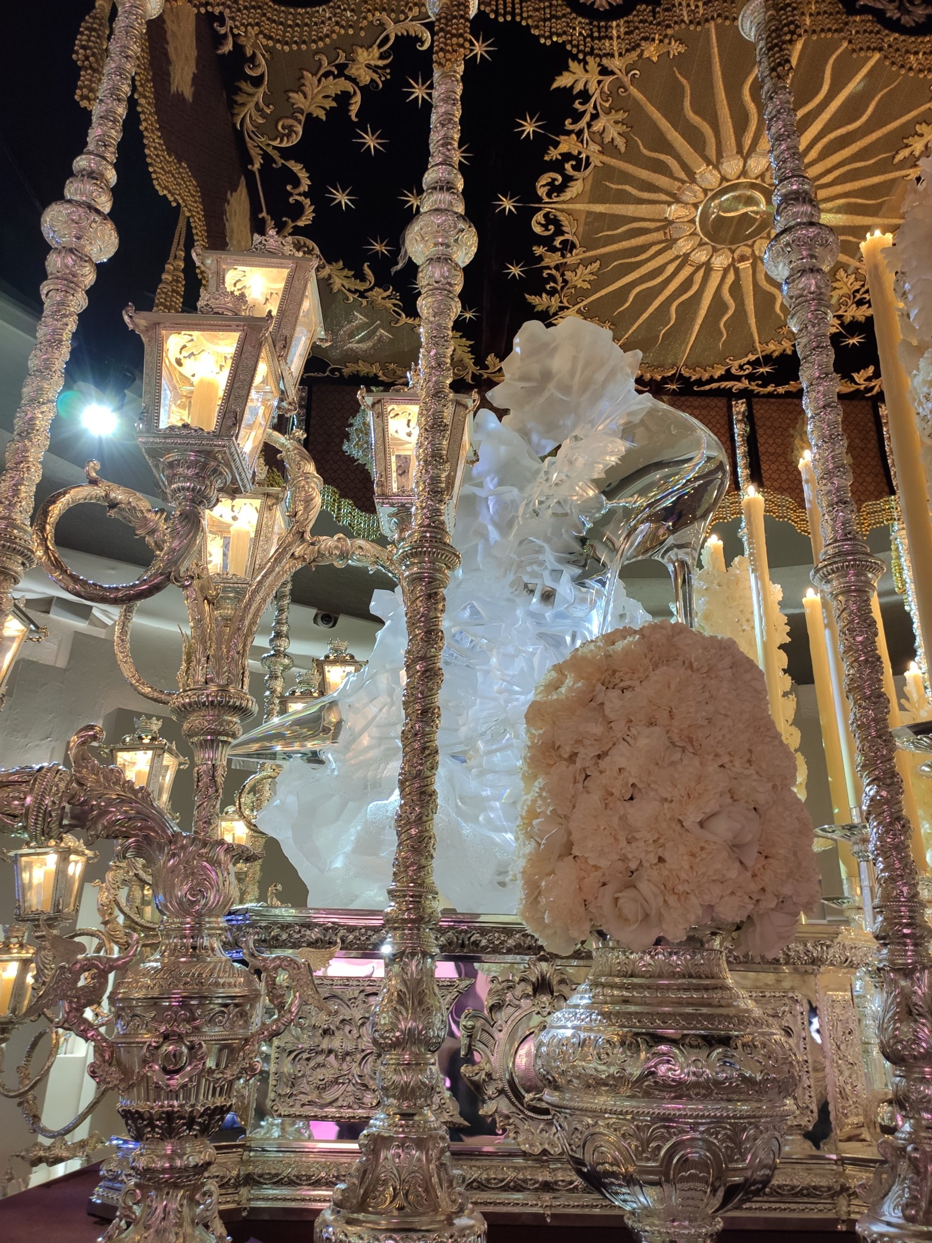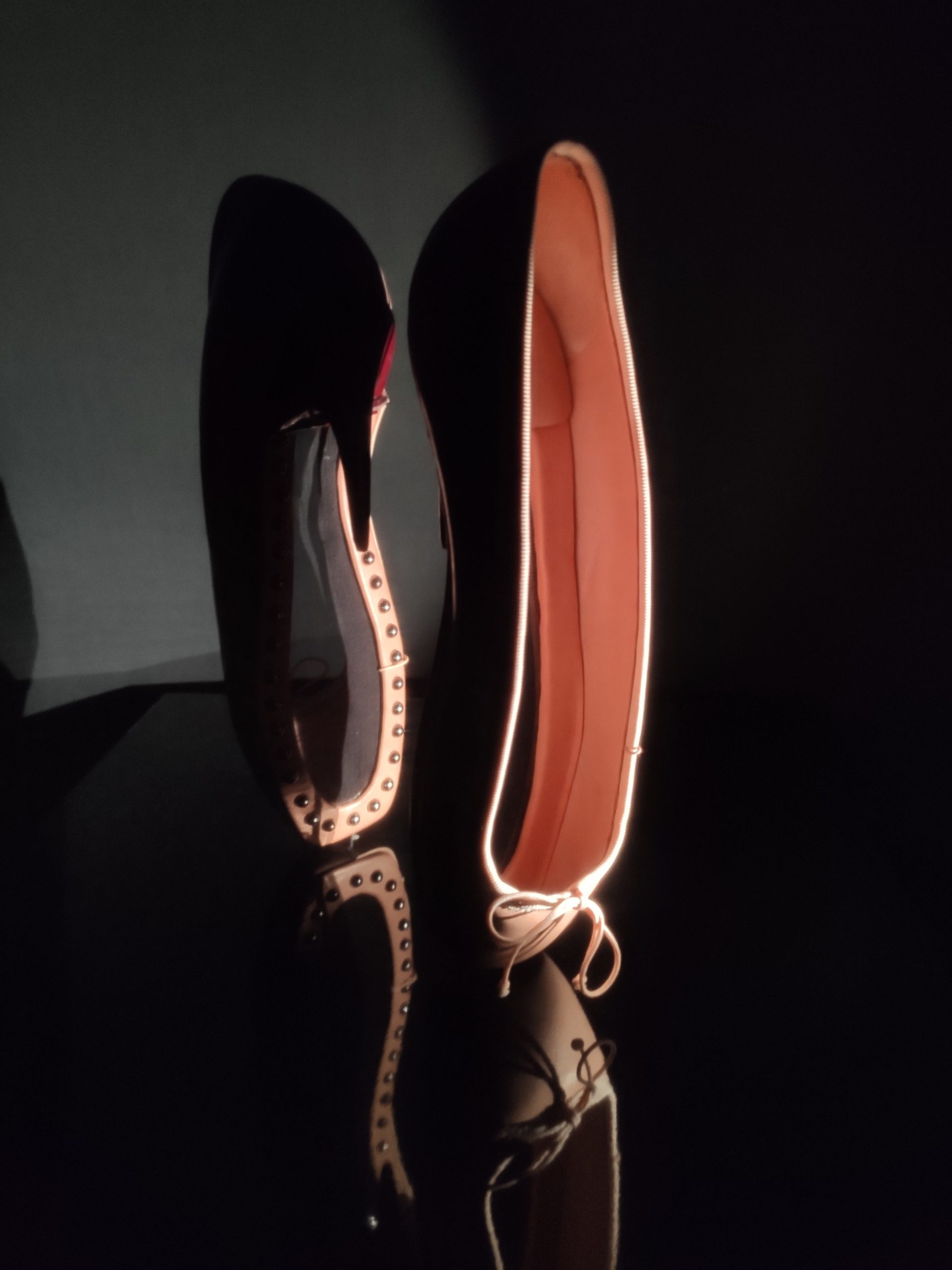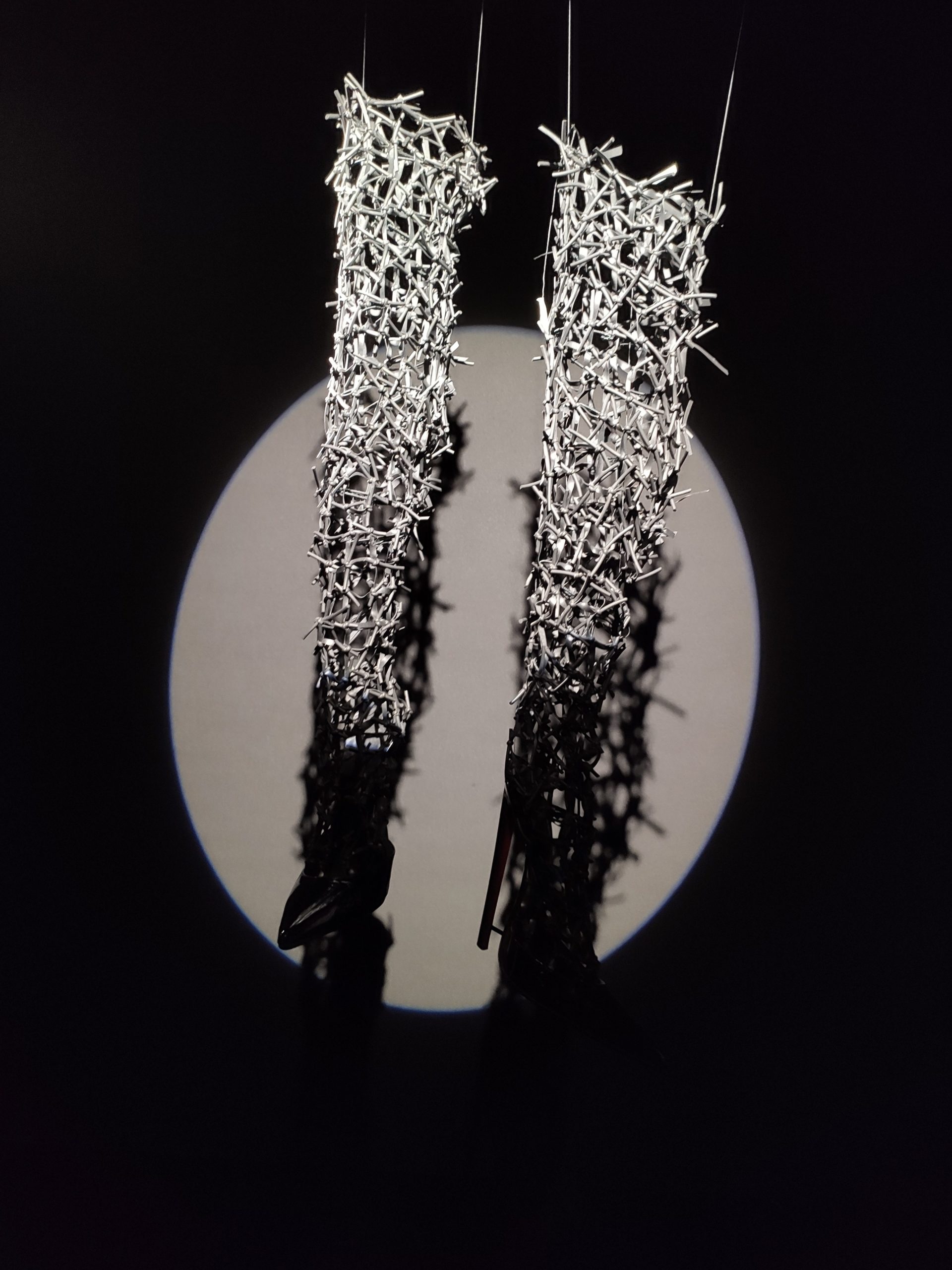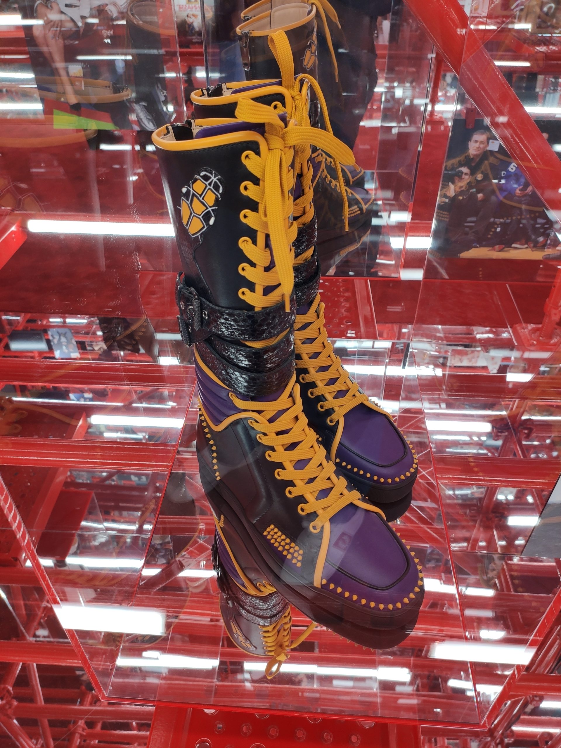 Une large sélection de souliers et croquis est présentée, dont certains jamais exposés. Ces pièces patrimoniales et artistiques sont exposées aux côtés de nombreuses collaborations qui soulignent l’attachement de Christian Louboutin pour les savoir-faire et les métiers d’art, comme des vitraux réalisés par la Maison du Vitrail à Paris, un palanquin d’argent réalisé par l’Orfebreria Villareal de Séville, ou encore un cabaret sculpté au Bhoutan.