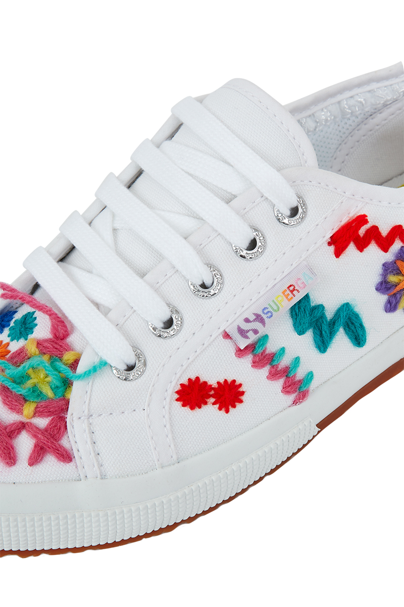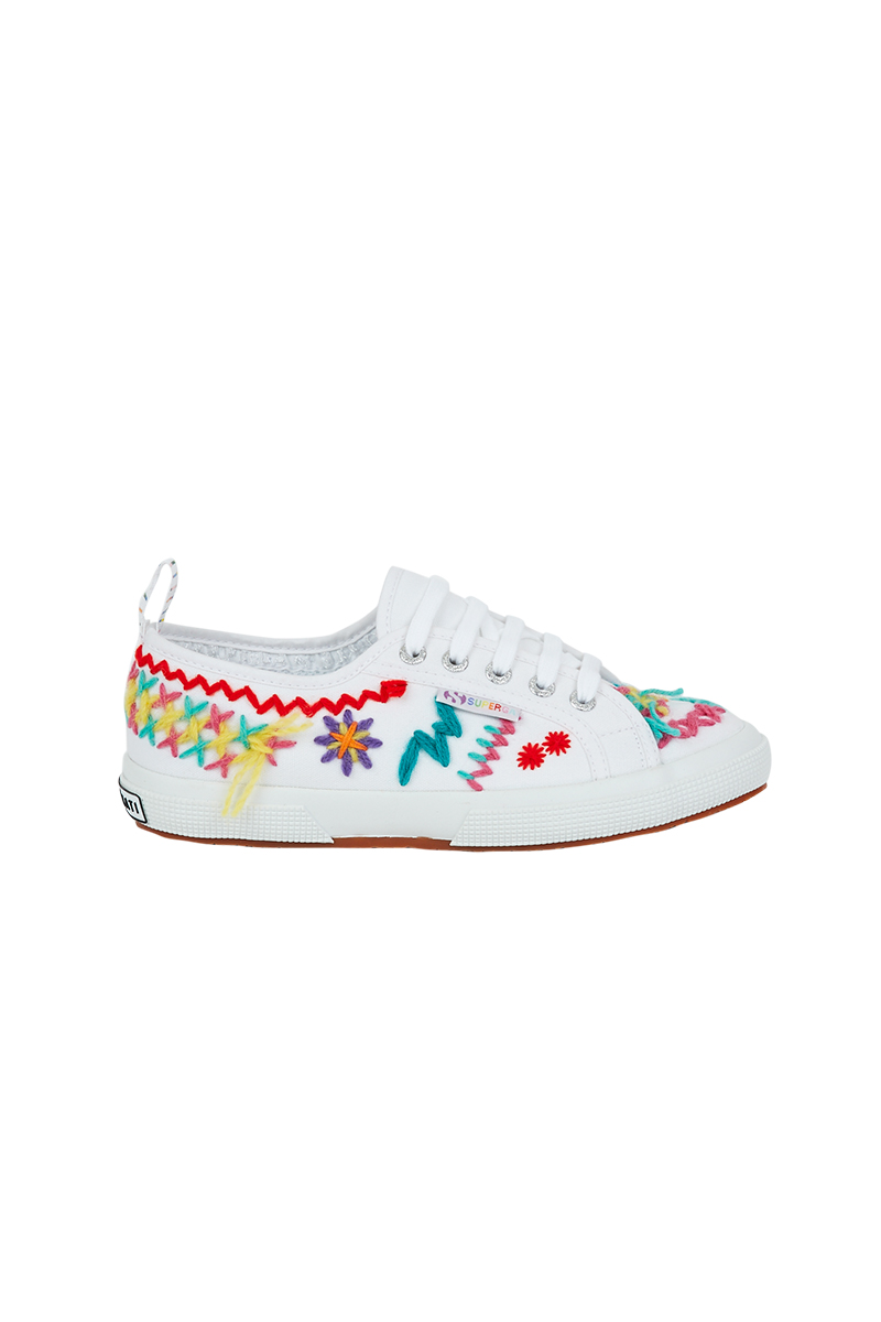 Cette collaboration présente la Superga classique blanche 2750 revisité, comprenant trois styles différents: l’un avec un arc-en-ciel de paillettes, le second avec des oeillets colorés et des lacets colorés et le troisième brodé avec des fils cousus.