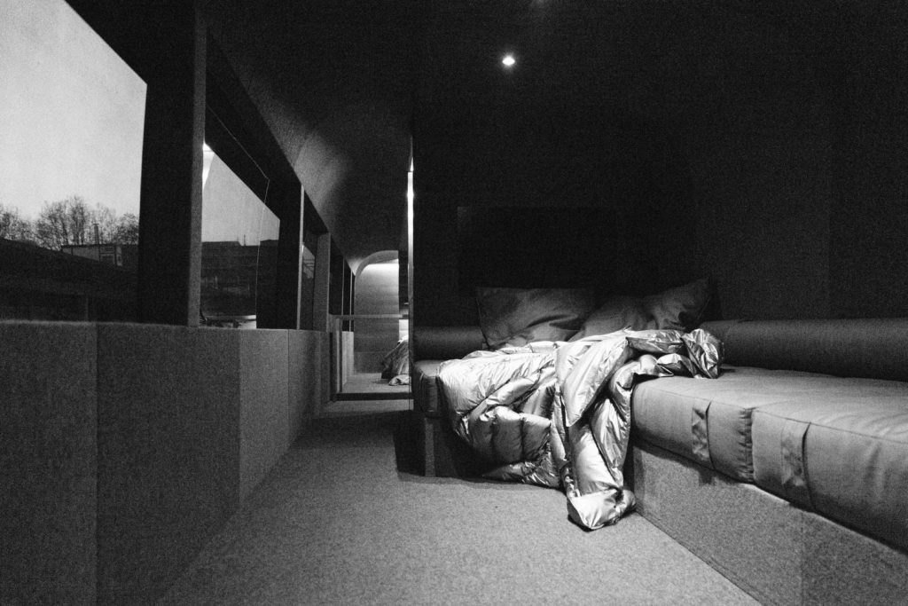 L’INTÉRIEUR GRIS RECOUVERT DE COUVERTURES DE L’ARMÉE.