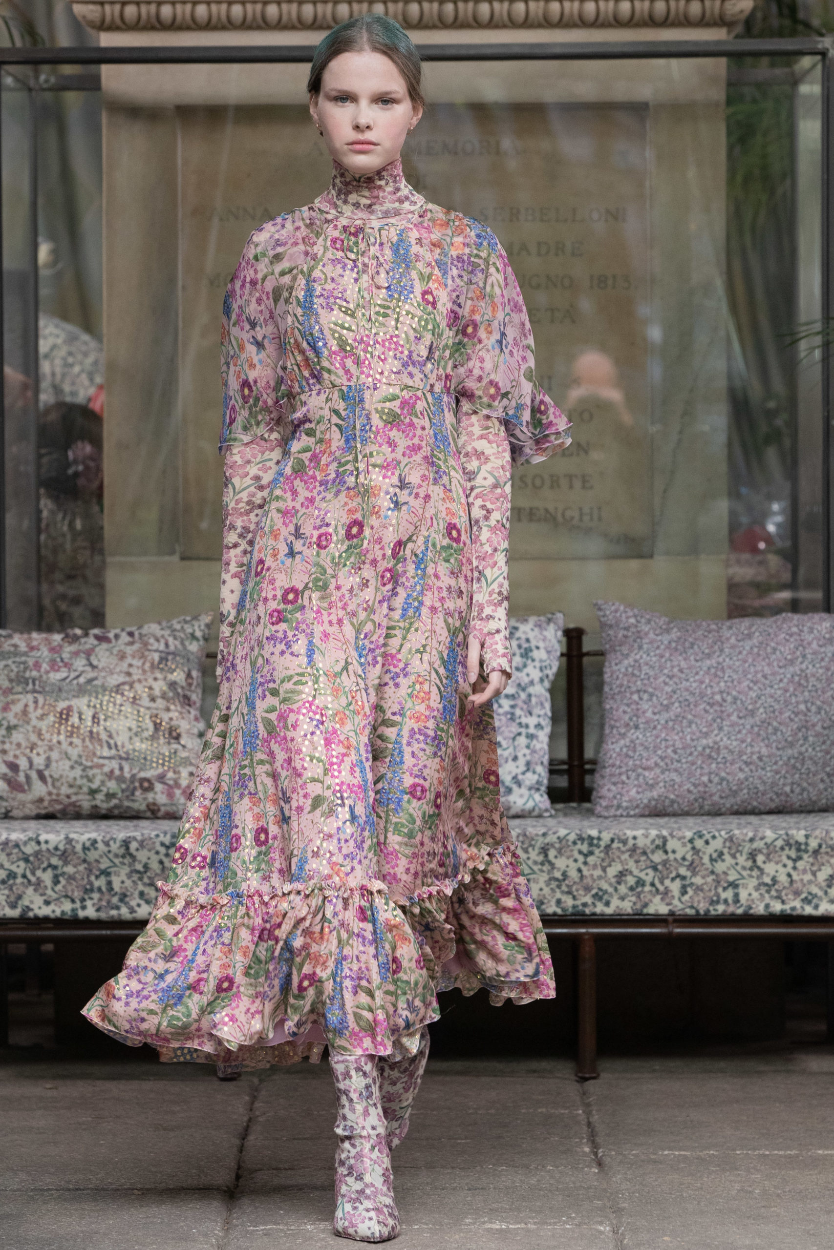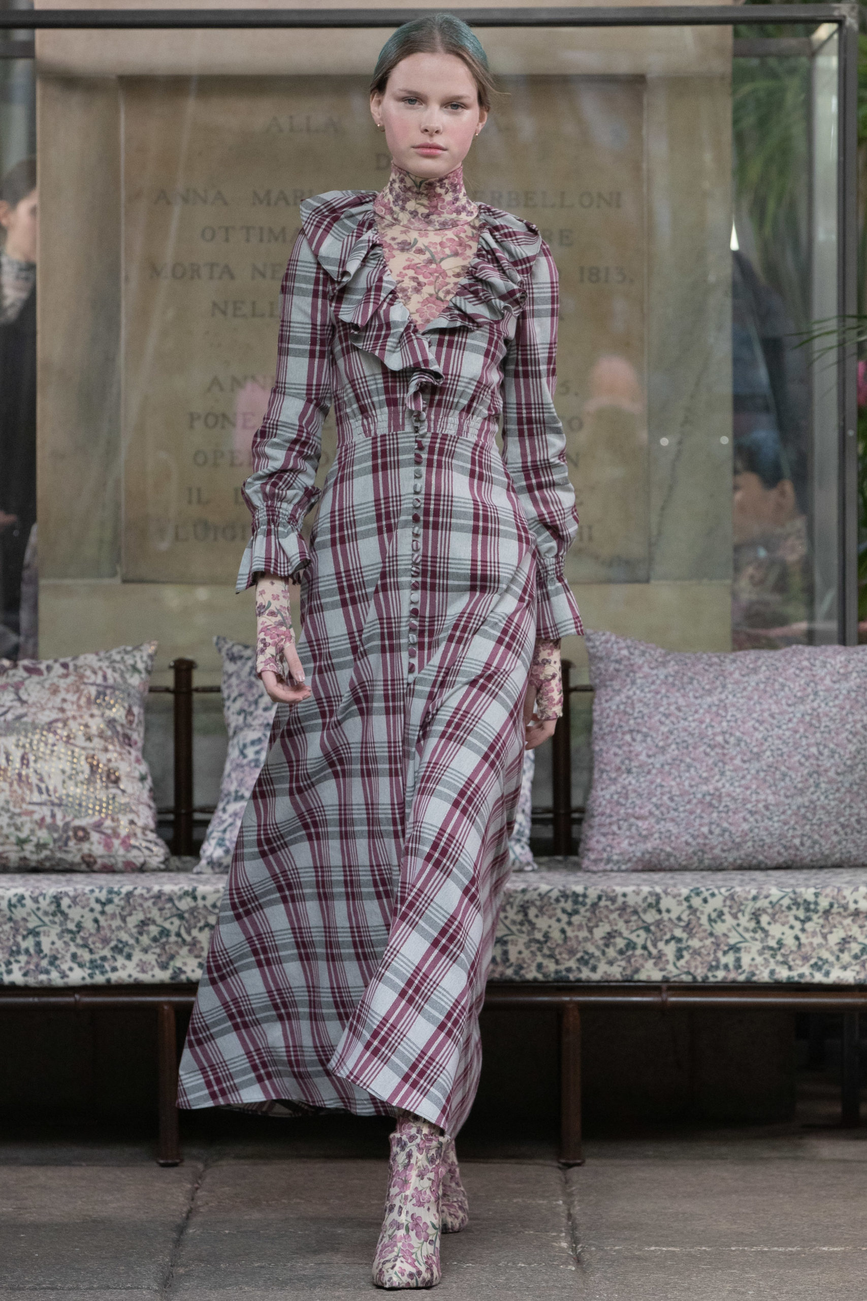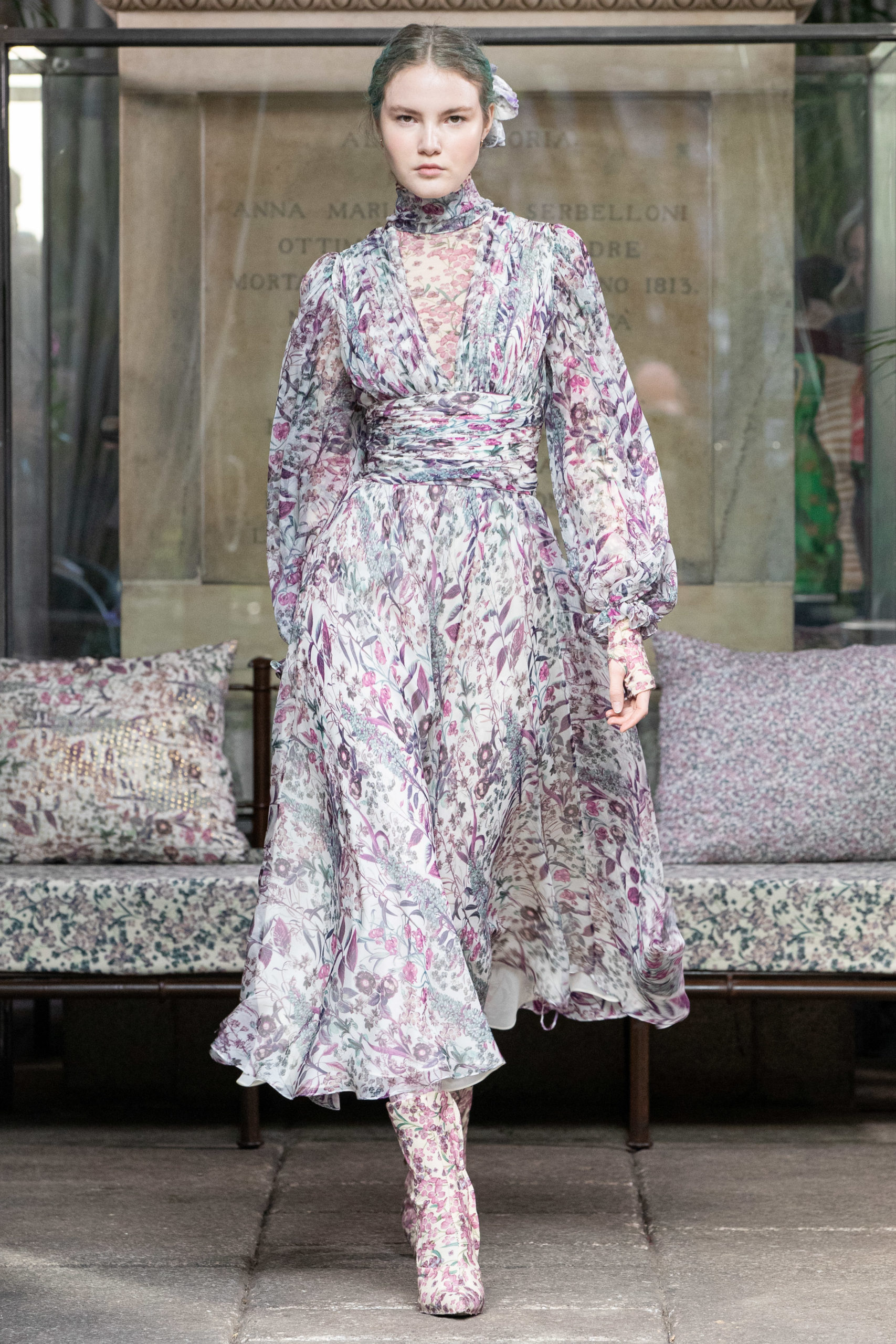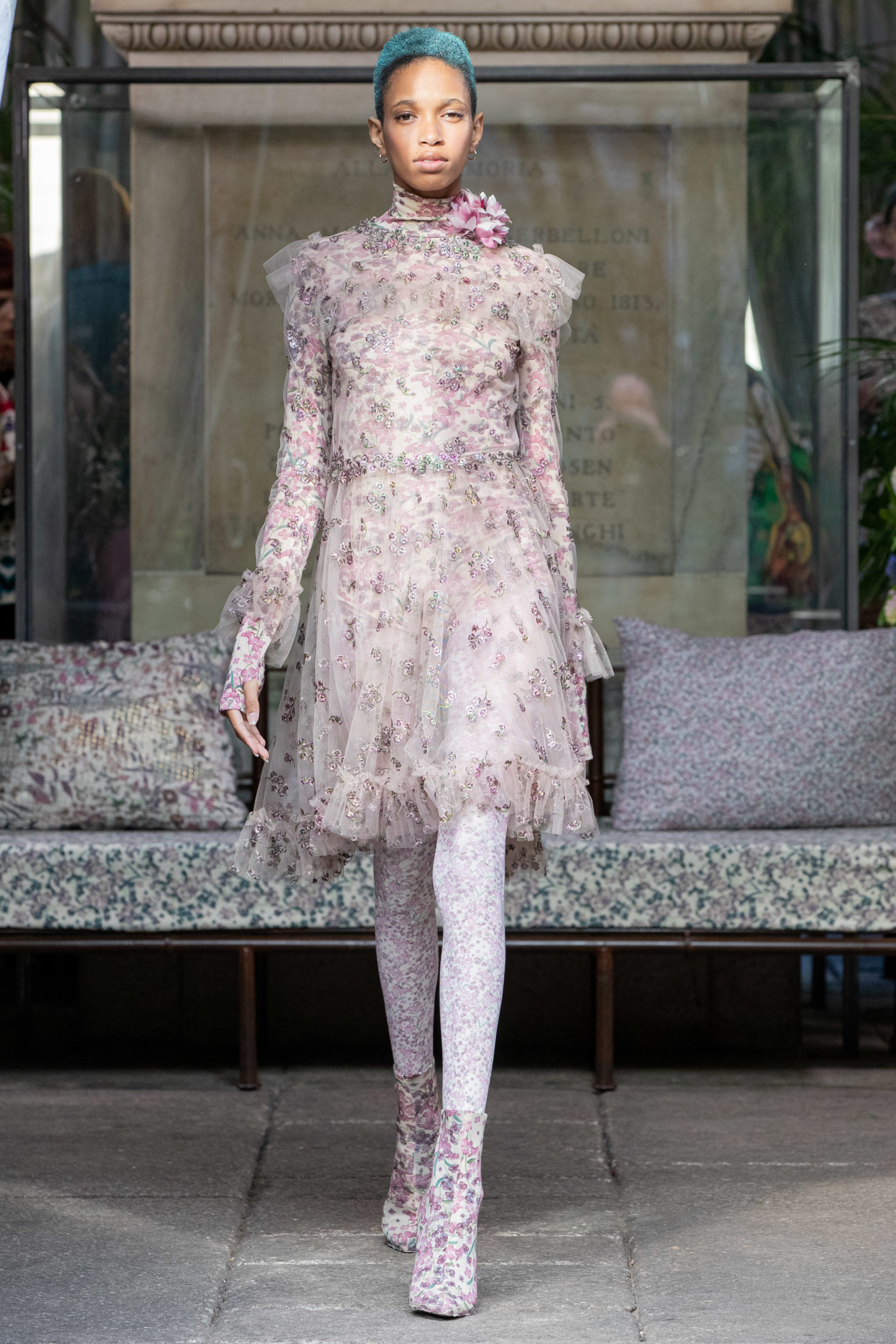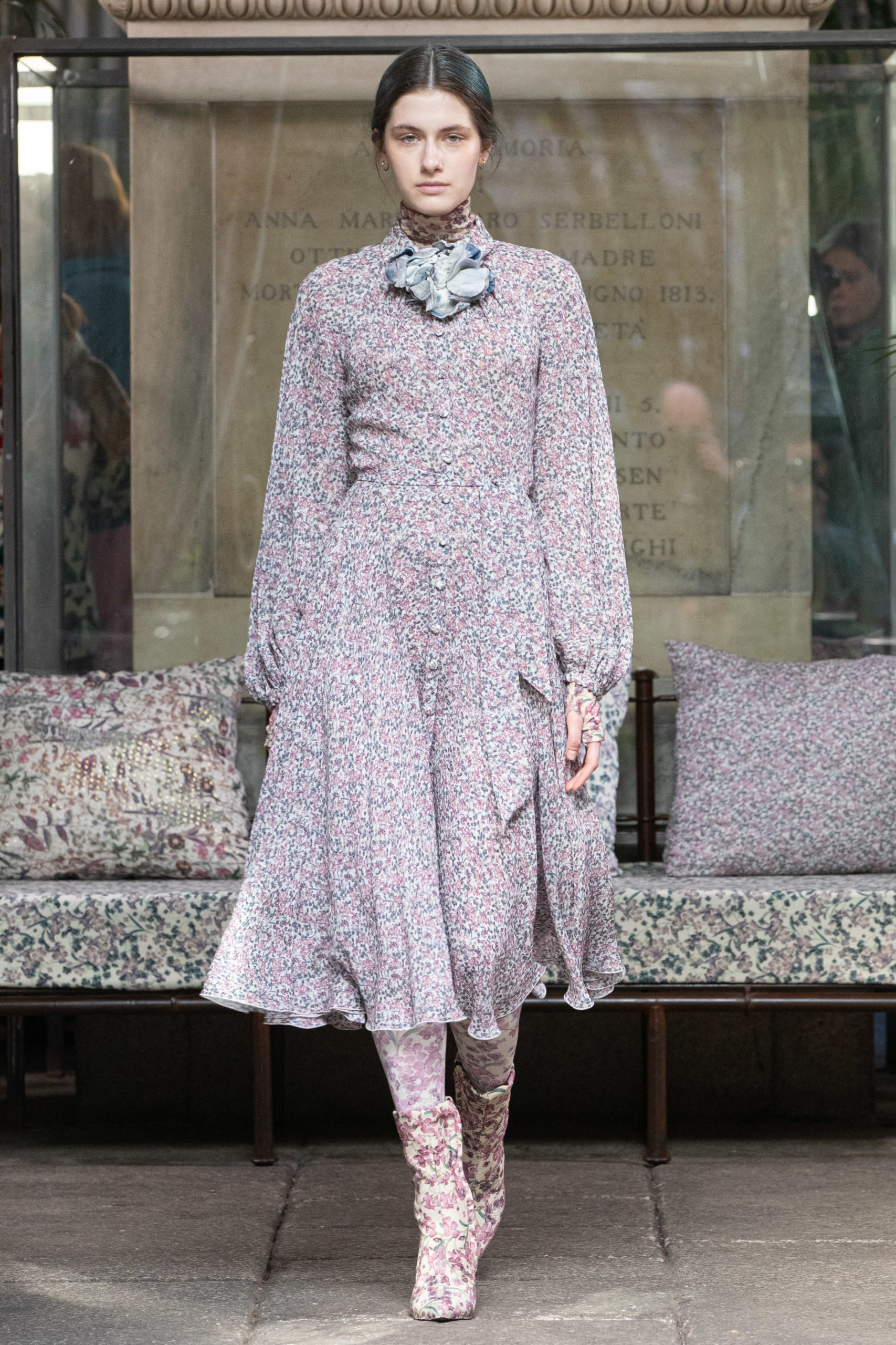 In a winter garden, cultivating scented herbs and exotic flowers. The Luisa Beccaria FW 2020 / 2021 woman lives a passionate, free life nurturing each day just like a delicate bud, protecting her being with both determination and kindness. Iridescent flares and herbal patterns outline the collection theme. Desaturated winterflowers can be the macro or micro motif on tights and turtleneck vests worn on wider volumes. It can become a printed stretch wool, forlong fitted dresses as well as for high-waisted, skin-tight trousers. Sometimes it blooms like an embroidery on light tulle overlapped on printed slips. It even weasels its way in warp and weft of soft cashmere pulls. Tartan and tweed counterpoint the “Nature” motif. The checked pattern, enriched with fine lurex lines, is seen on chemise, maxi pants and the iconicLuisa Wrap Dress. Bouclé-jacquard blazersmatch floral dressesand midi skirts of the same fabric. Warm and cosy coats have a pink or light blue herringbone theme with fine embroideries. Glares of the greenhouse crystals light up the night gowns. Gold, silver and blue-green straws are entrapped into overlapping nets of tulle, for waisted dresses with nude shoulders. Shapes are soft, enhancing the silhouette. Long, tight cuffs, high-waisted designs, fitted belts contrast slightly-A skirts and broad sleeves, in order to balance the figure. The fabrics are warm and light: cashmere, knitted wool, jersey, tweed, embroidered velvet, tulle, georgette and fil coupé chiffon. Powdery hues of autumn and winter inspire the colour palette. The entire range of pearly colours: light and rose pink, blush, mauve, plum. Thousand shades of cool grey and light blues, through wisteria, beau blue, cornflower, air force blue, aquamarine. Mother of pearl tones for the night. Among the accessories: boots and ankle boots covered up with the collection fabrics, waist belts, high jersey collars, fully printed stockings.
