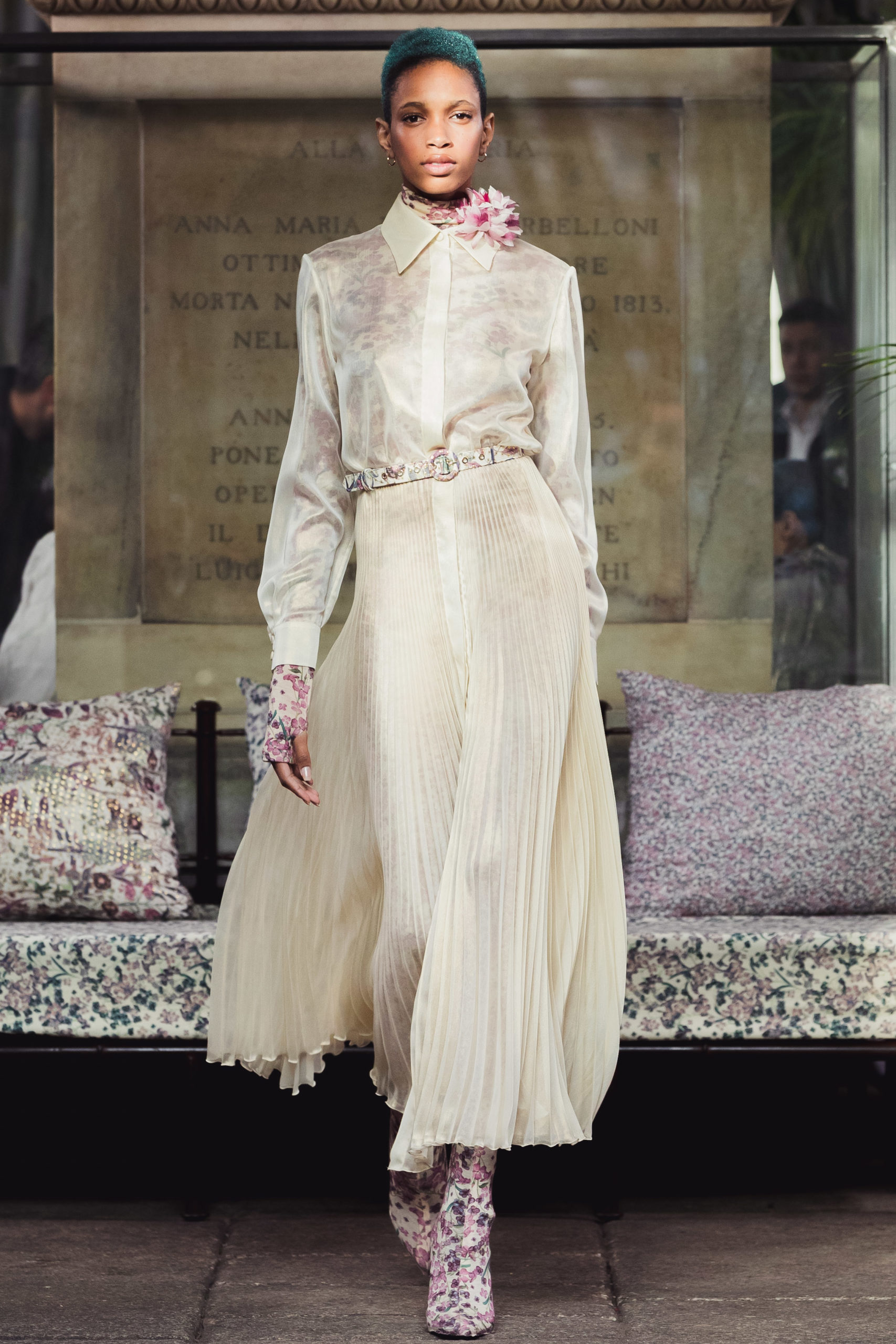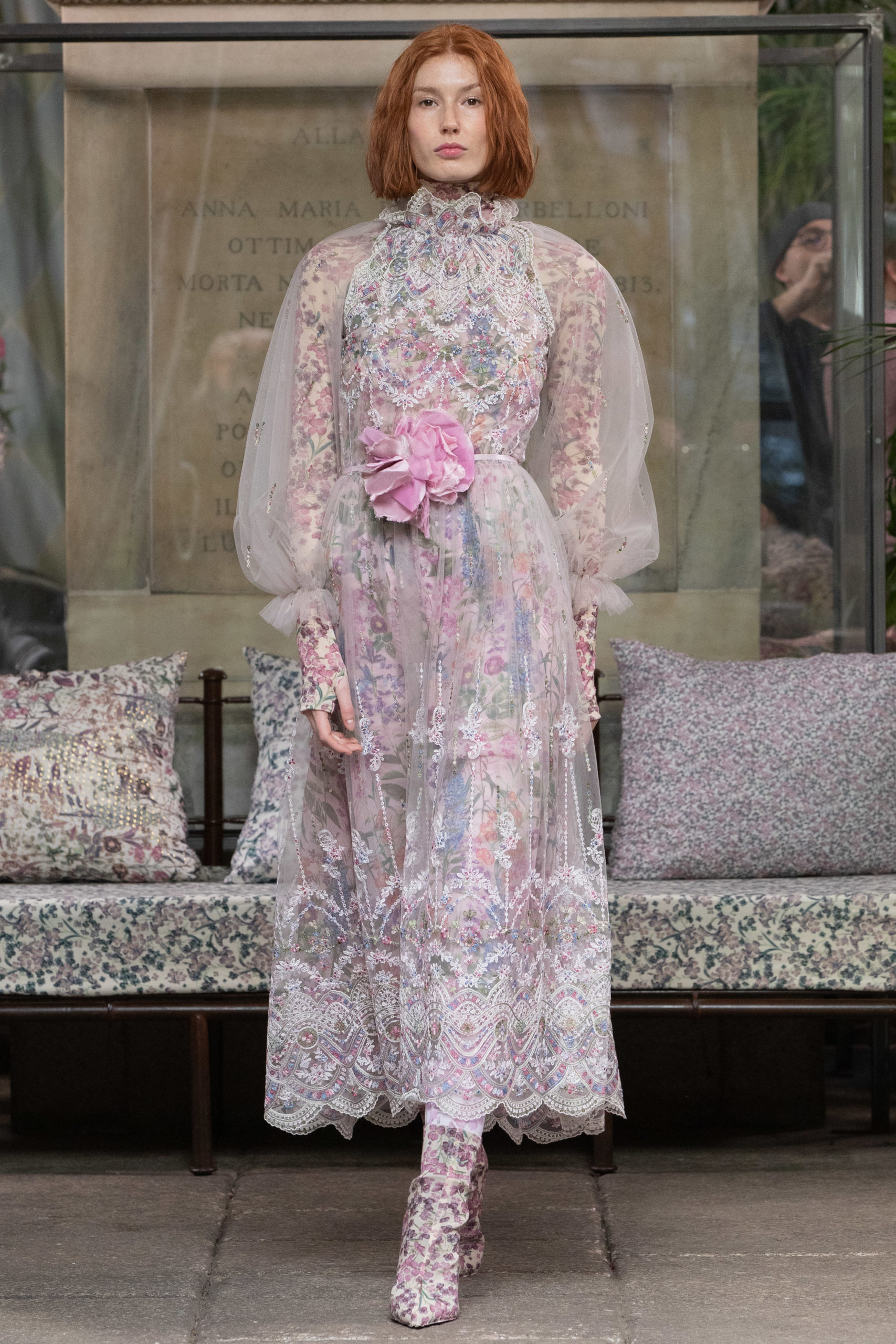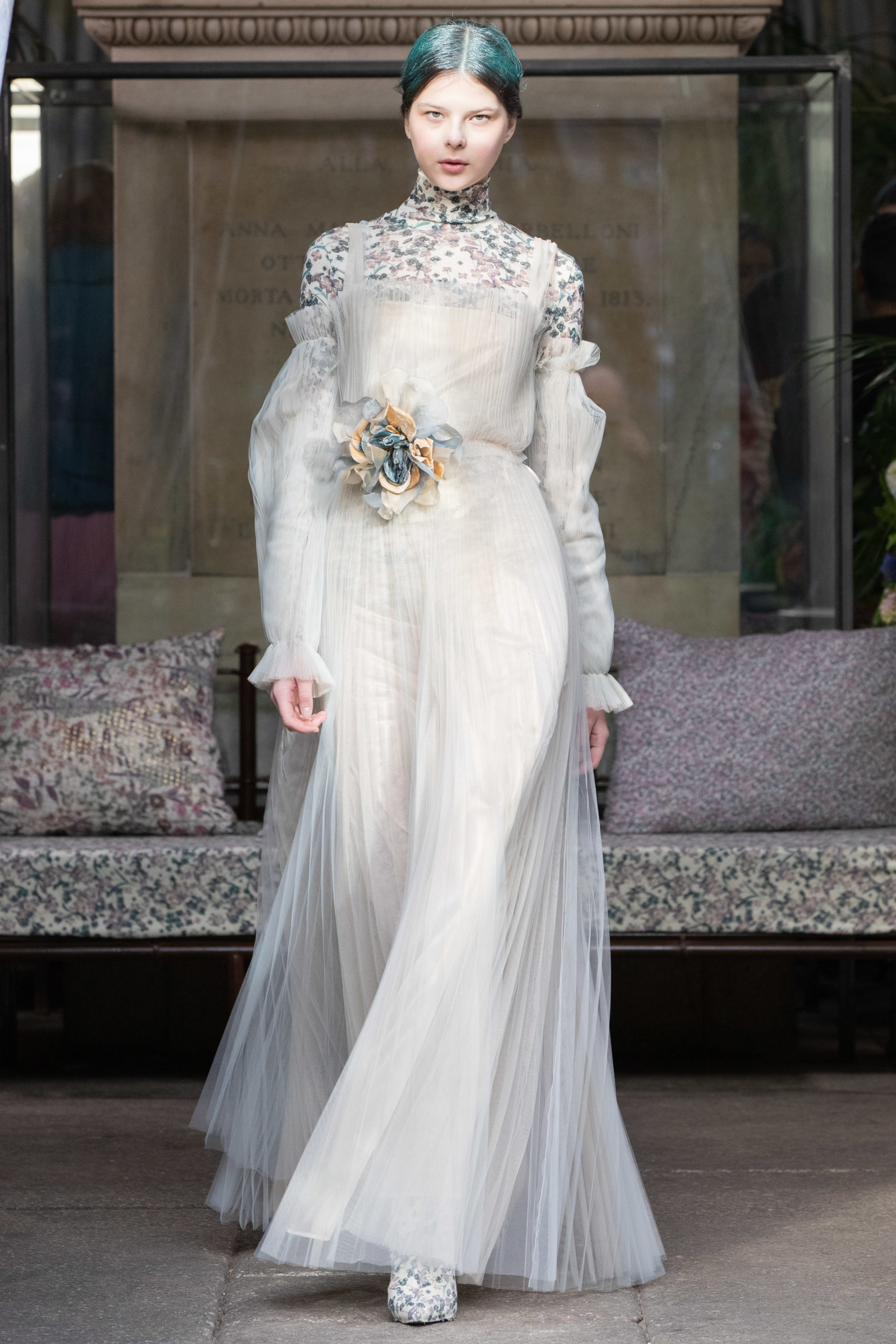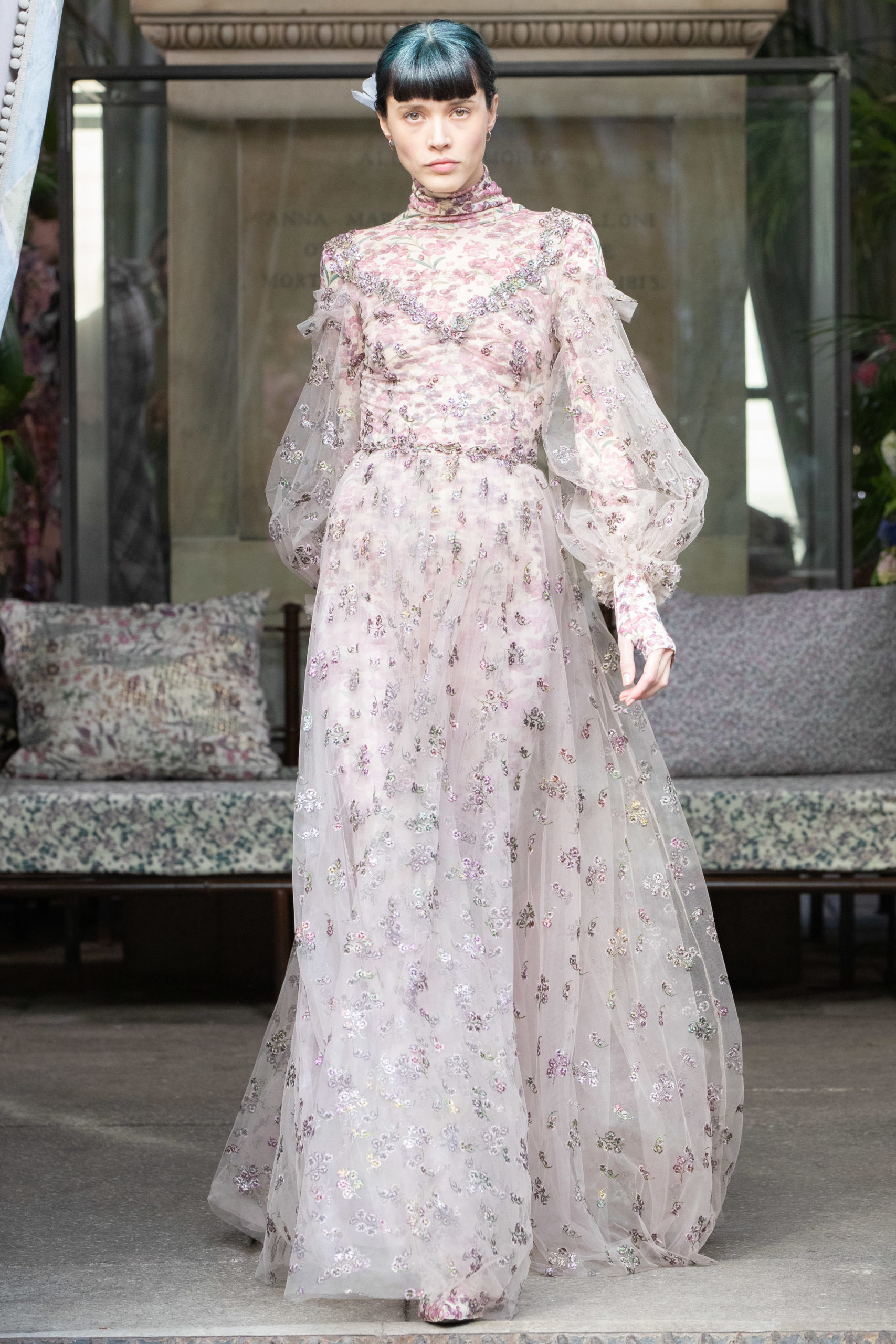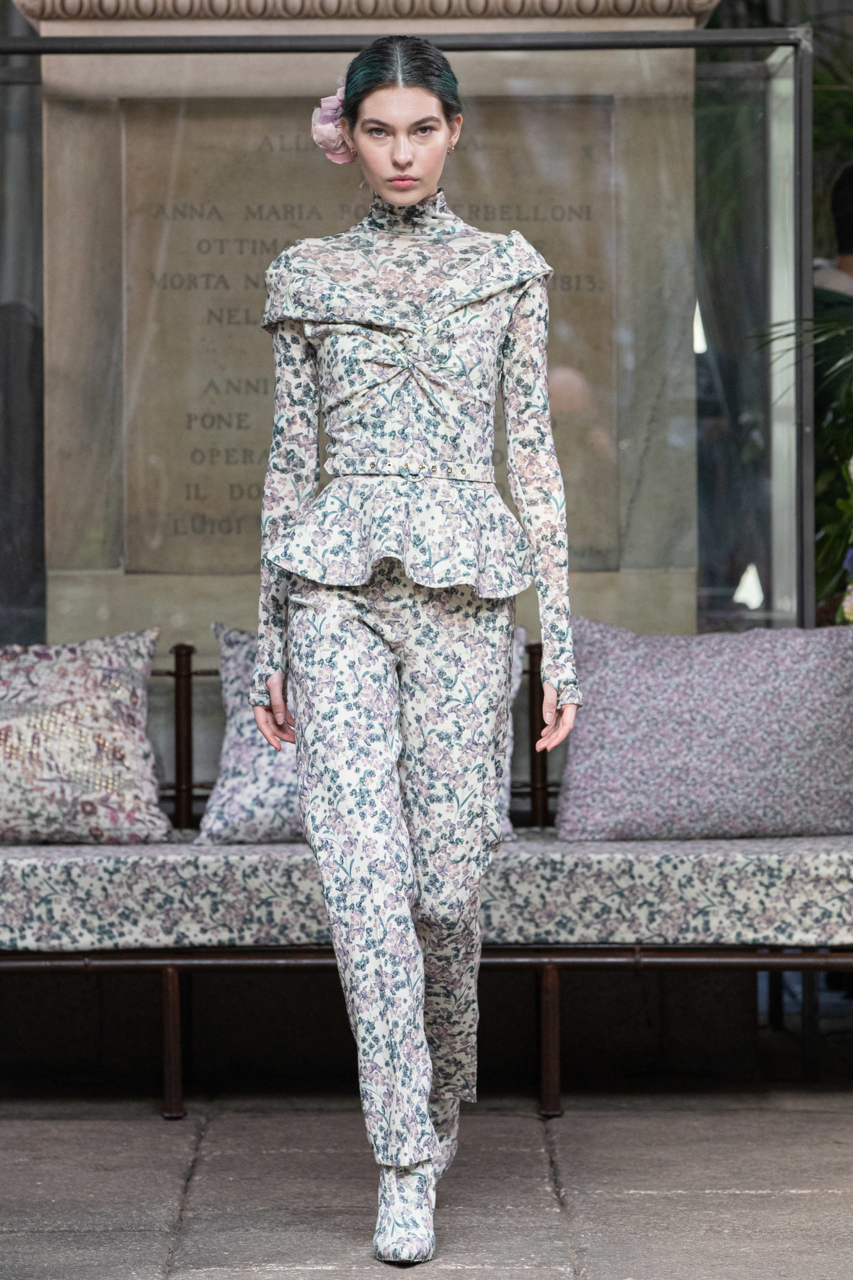 In a winter garden, cultivating scented herbs and exotic flowers. The Luisa Beccaria FW 2020 / 2021 woman lives a passionate, free life nurturing each day just like a delicate bud, protecting her being with both determination and kindness. Iridescent flares and herbal patterns outline the collection theme. Desaturated winterflowers can be the macro or micro motif on tights and turtleneck vests worn on wider volumes. It can become a printed stretch wool, forlong fitted dresses as well as for high-waisted, skin-tight trousers. Sometimes it blooms like an embroidery on light tulle overlapped on printed slips. It even weasels its way in warp and weft of soft cashmere pulls. Tartan and tweed counterpoint the “Nature” motif. The checked pattern, enriched with fine lurex lines, is seen on chemise, maxi pants and the iconicLuisa Wrap Dress. Bouclé-jacquard blazersmatch floral dressesand midi skirts of the same fabric. Warm and cosy coats have a pink or light blue herringbone theme with fine embroideries. Glares of the greenhouse crystals light up the night gowns. Gold, silver and blue-green straws are entrapped into overlapping nets of tulle, for waisted dresses with nude shoulders. Shapes are soft, enhancing the silhouette. Long, tight cuffs, high-waisted designs, fitted belts contrast slightly-A skirts and broad sleeves, in order to balance the figure. The fabrics are warm and light: cashmere, knitted wool, jersey, tweed, embroidered velvet, tulle, georgette and fil coupé chiffon. Powdery hues of autumn and winter inspire the colour palette. The entire range of pearly colours: light and rose pink, blush, mauve, plum. Thousand shades of cool grey and light blues, through wisteria, beau blue, cornflower, air force blue, aquamarine. Mother of pearl tones for the night. Among the accessories: boots and ankle boots covered up with the collection fabrics, waist belts, high jersey collars, fully printed stockings.