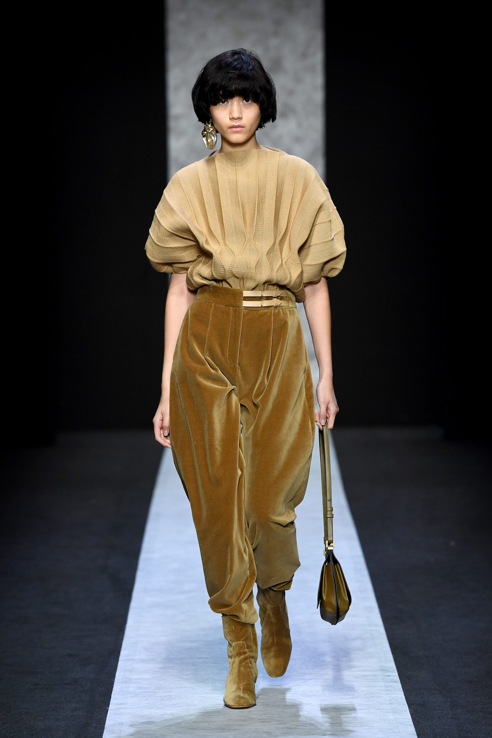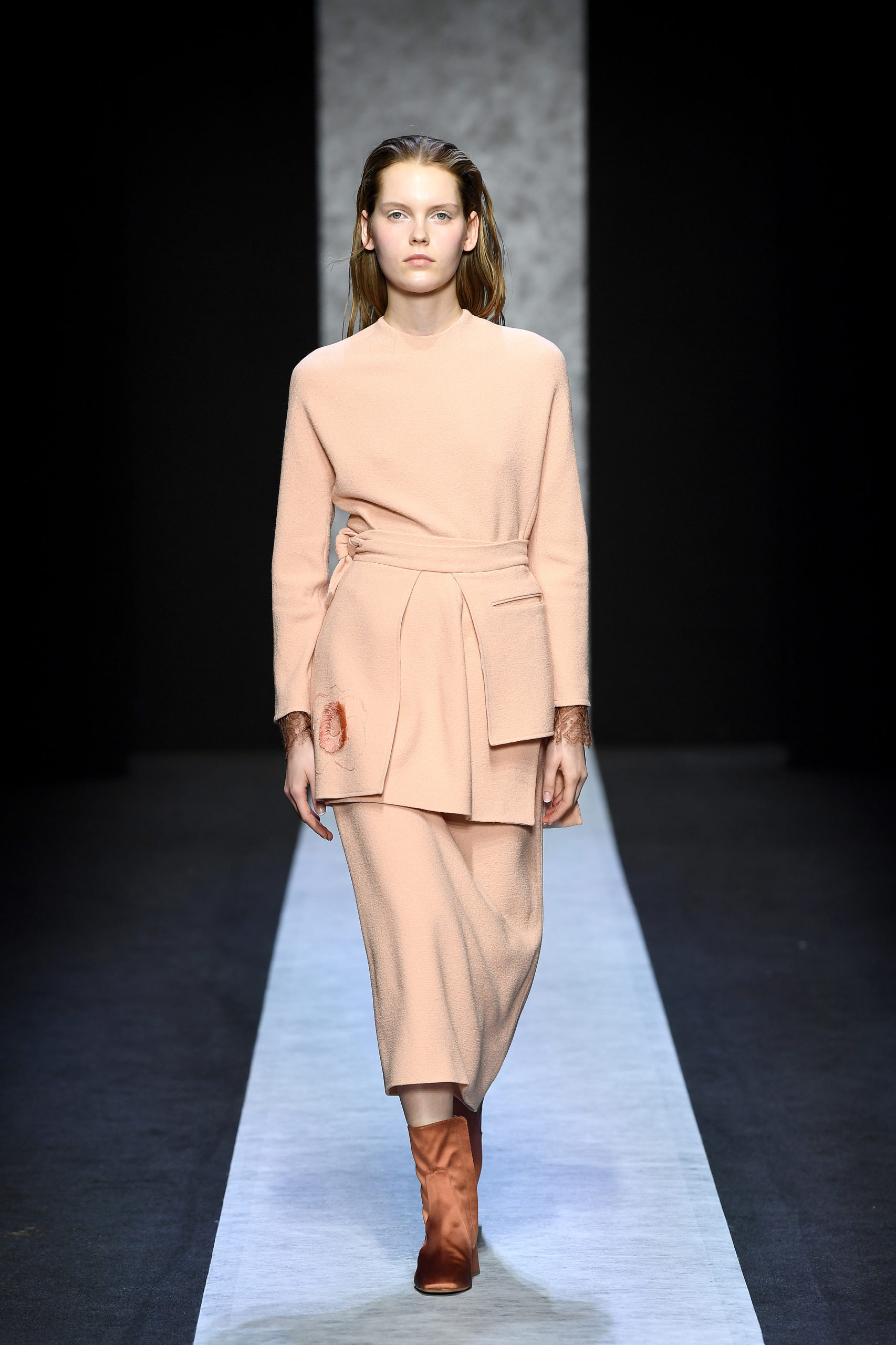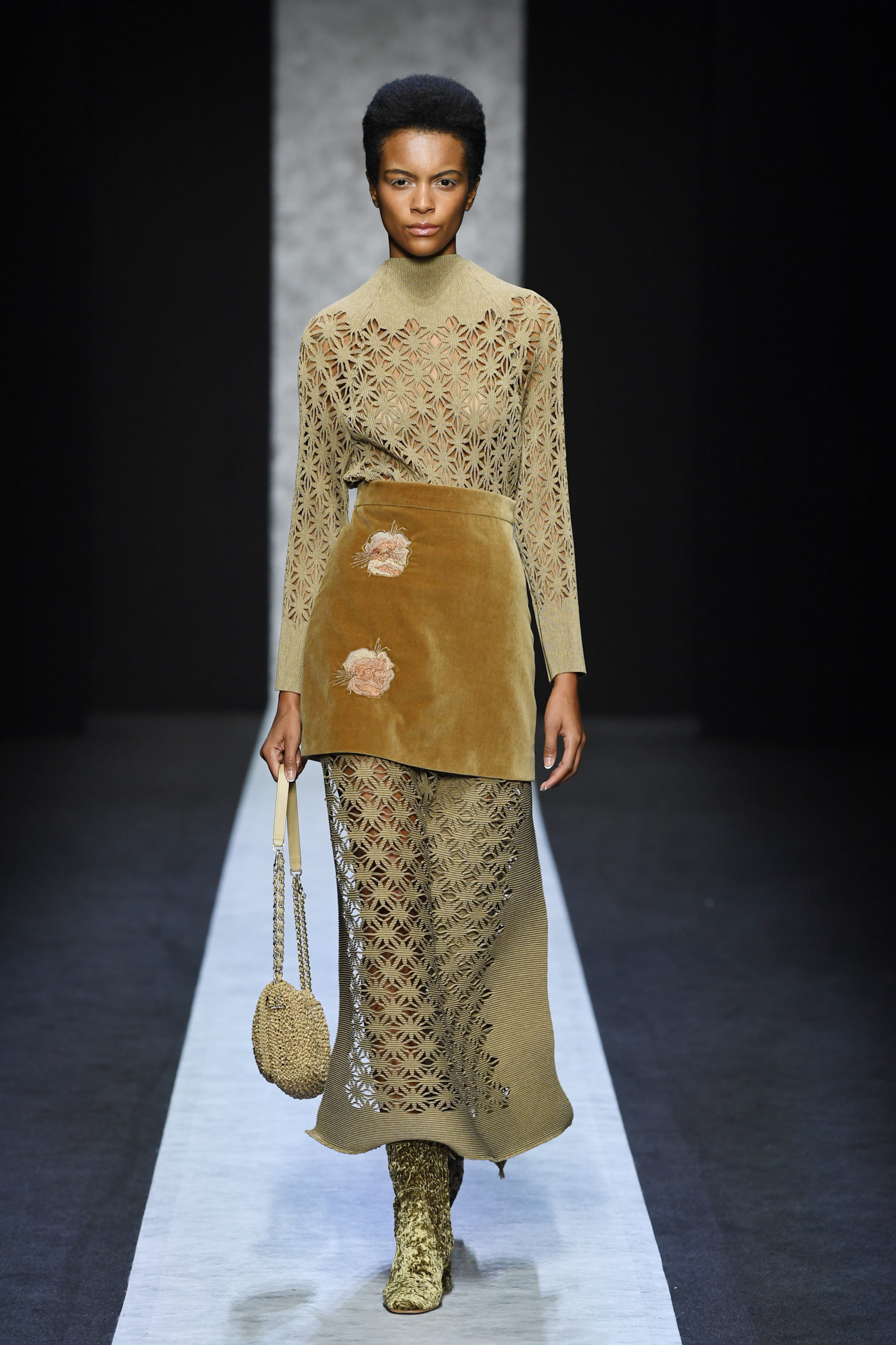 Strong shoulder, midi-boots, skirt belt
