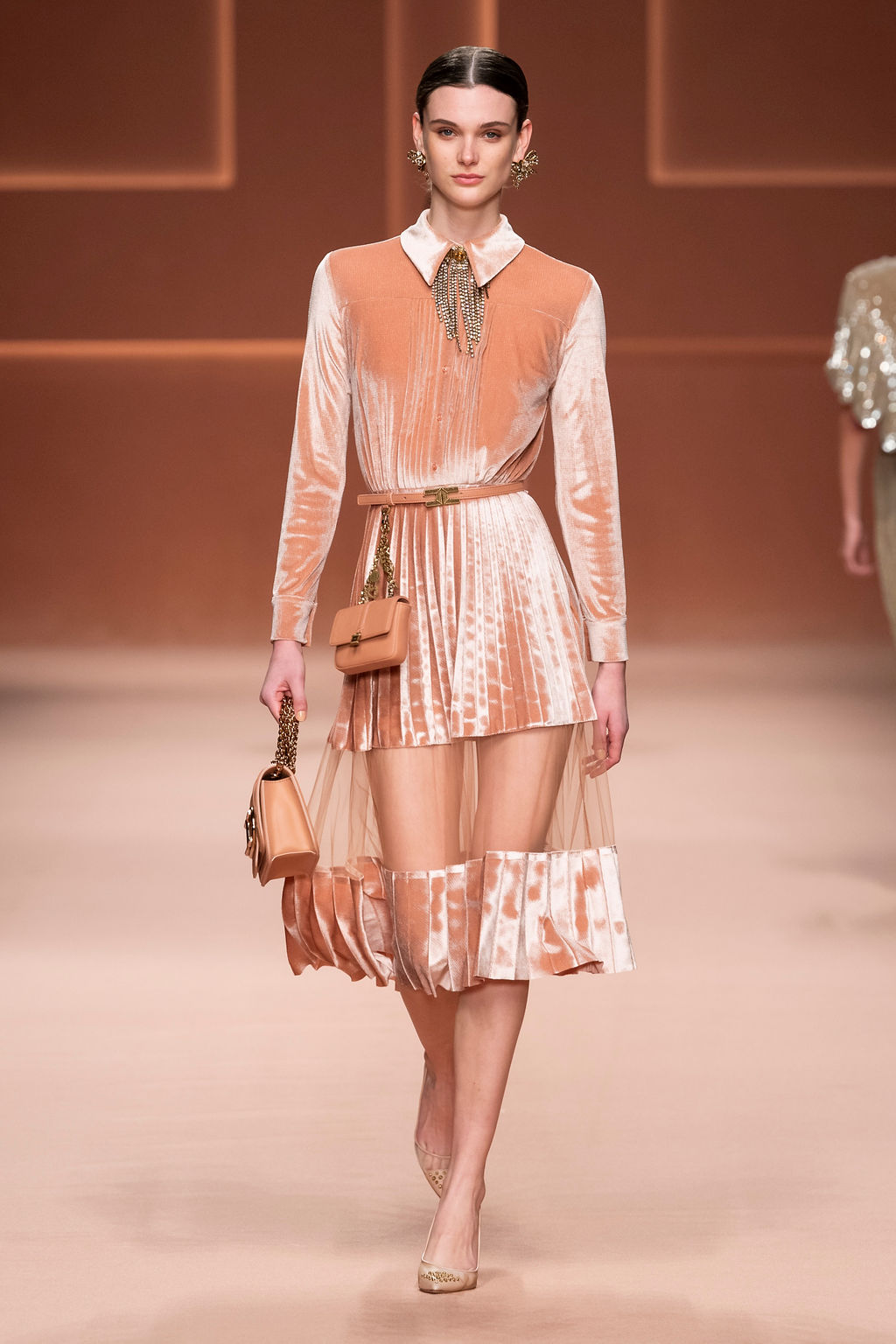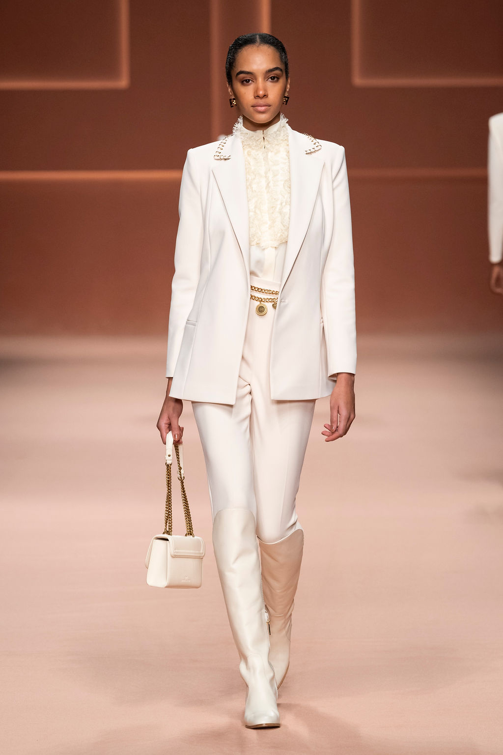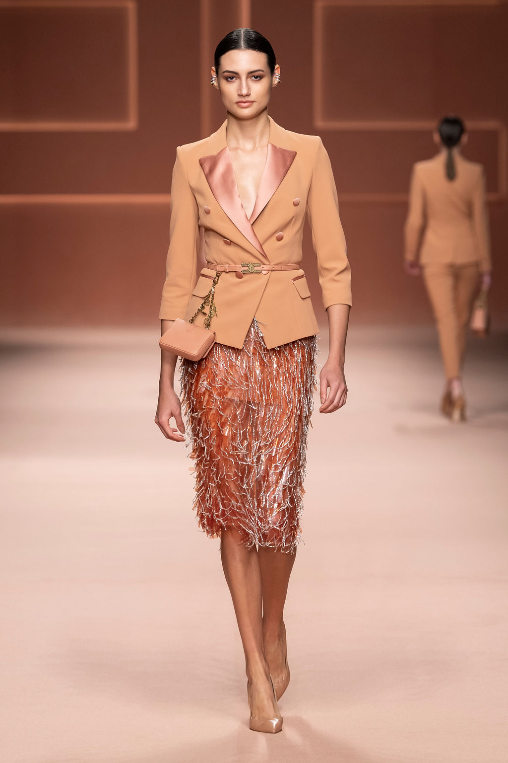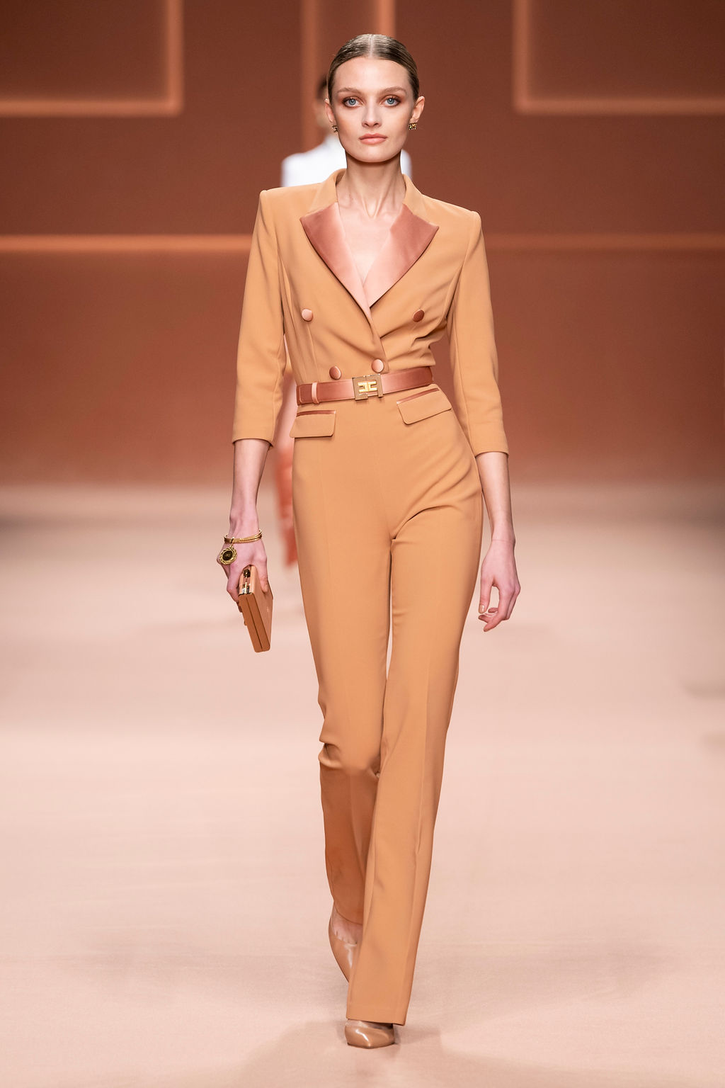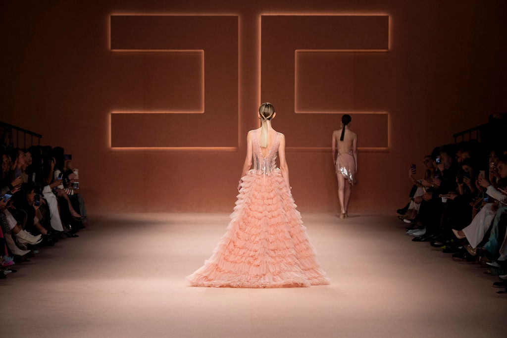 Rempli de forces inspirantes, le défilé célèbre une femme qui peut tout faire, libre d’être ce qu’elle veut, ressent et désire. Cette saison, Elisabetta Franchi communique l’unicité et la force de l’univers féminin à travers la couleur, en utilisant une palette faite de nuances douces sur une trajectoire de femmes différentes mais reconnaissables, dévoilant leur nature authentique.