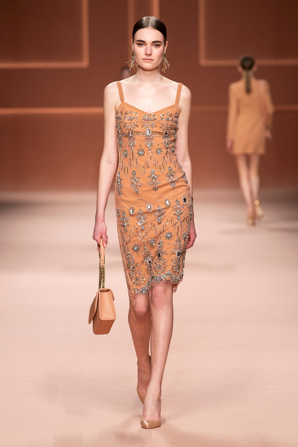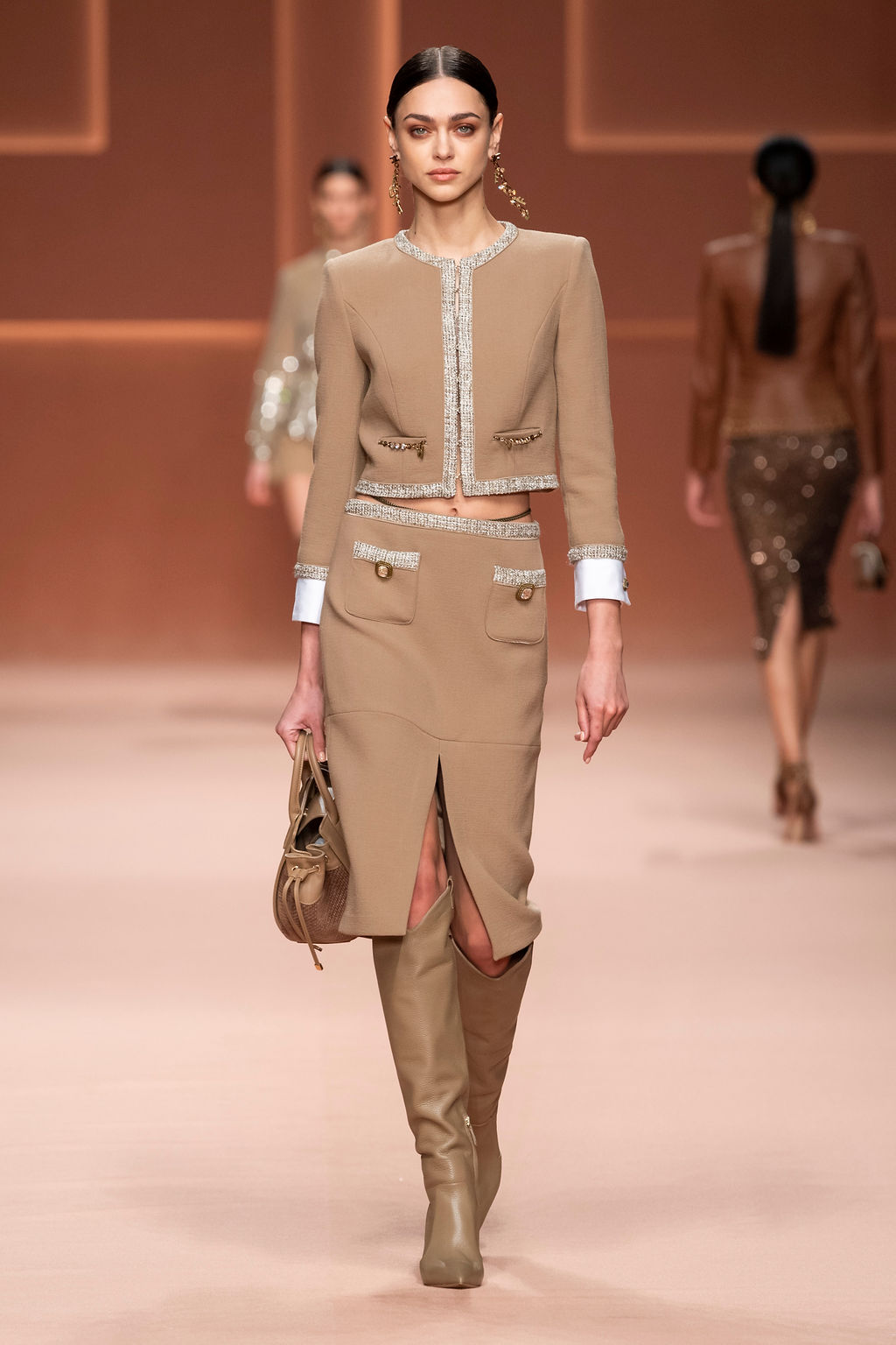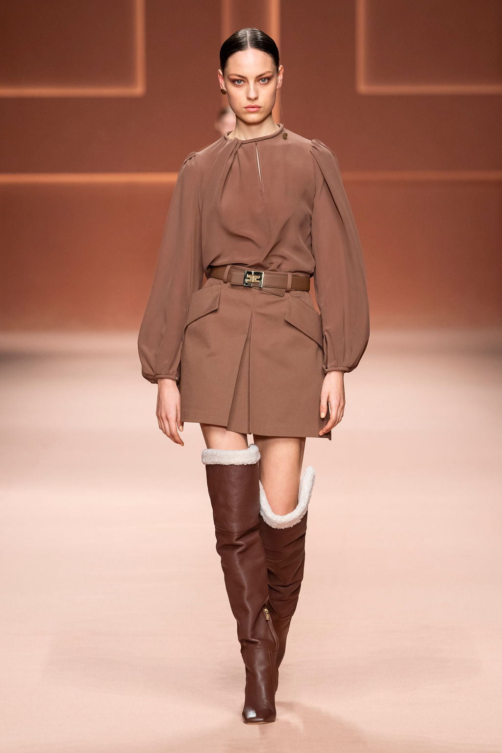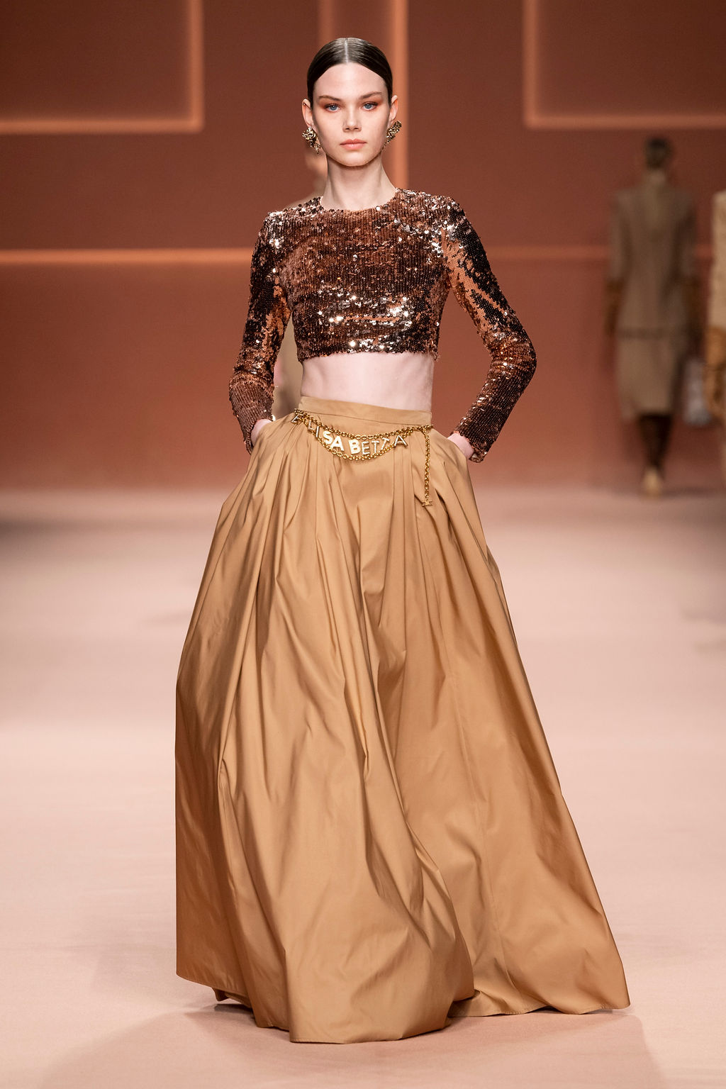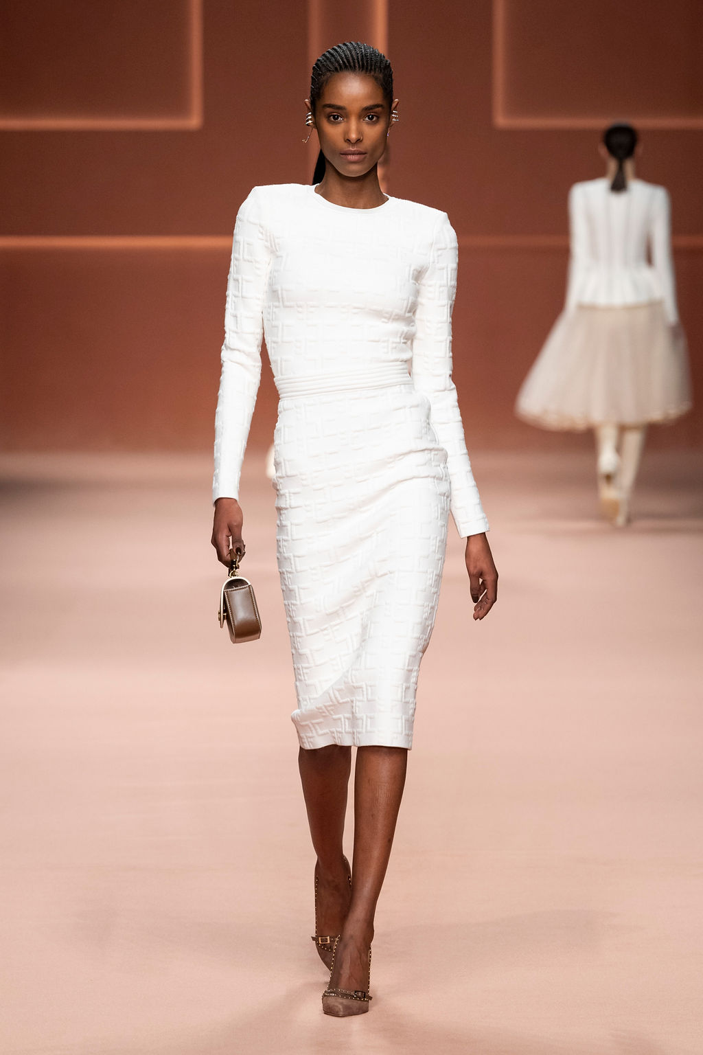 Rempli de forces inspirantes, le défilé célèbre une femme qui peut tout faire, libre d’être ce qu’elle veut, ressent et désire. Cette saison, Elisabetta Franchi communique l’unicité et la force de l’univers féminin à travers la couleur, en utilisant une palette faite de nuances douces sur une trajectoire de femmes différentes mais reconnaissables, dévoilant leur nature authentique.