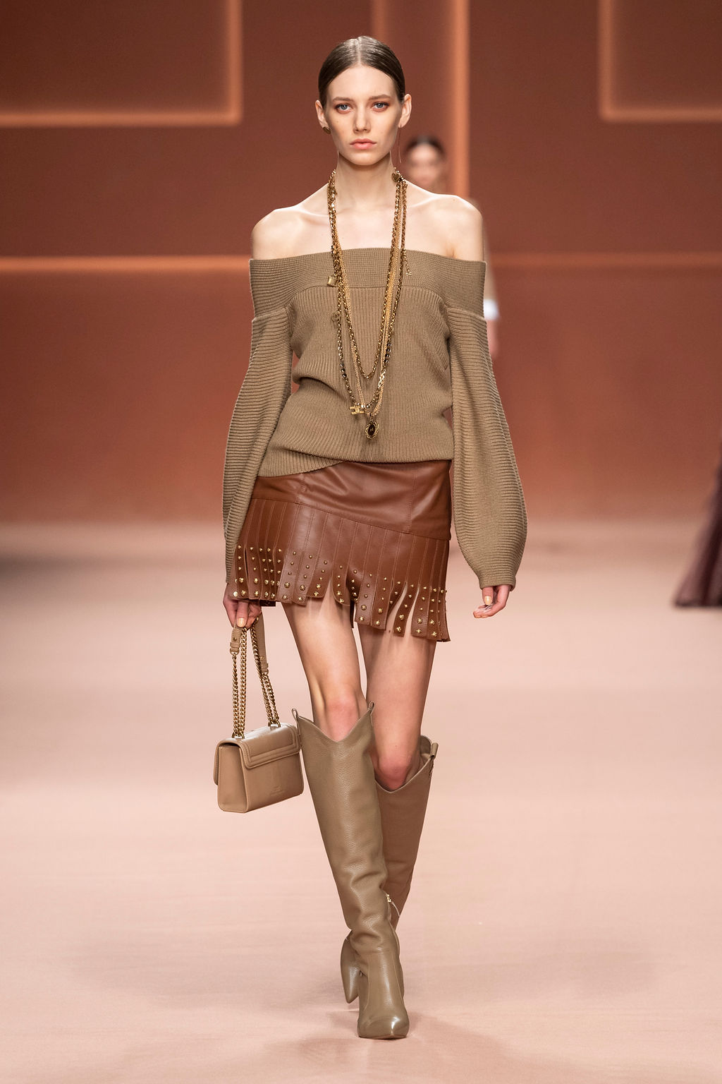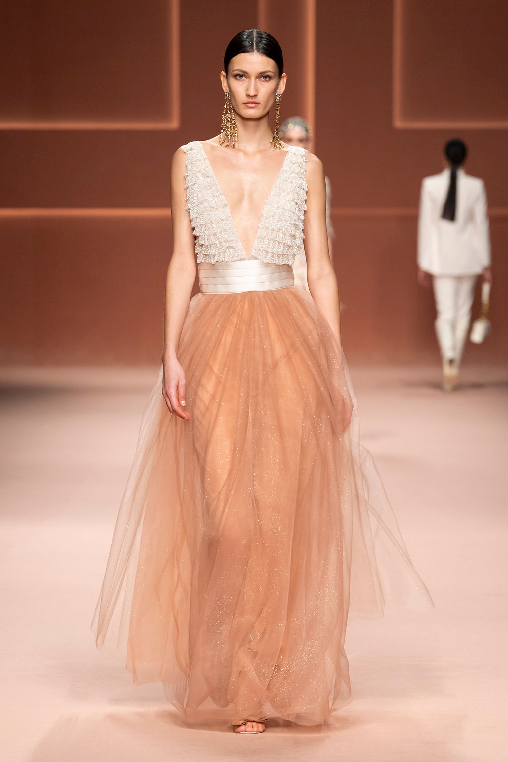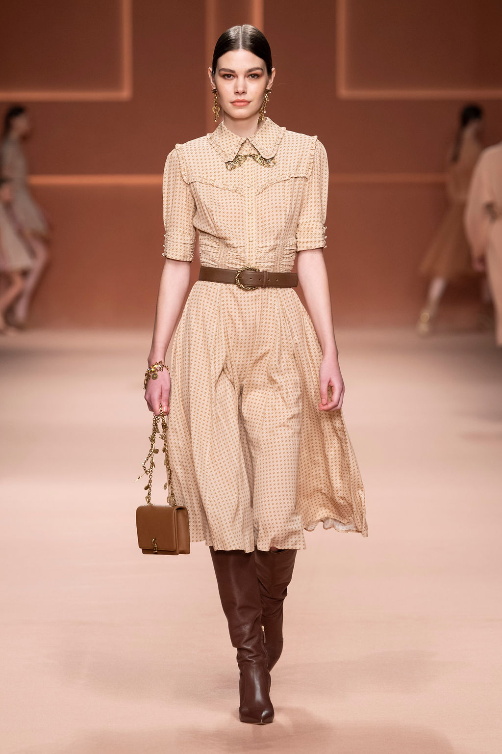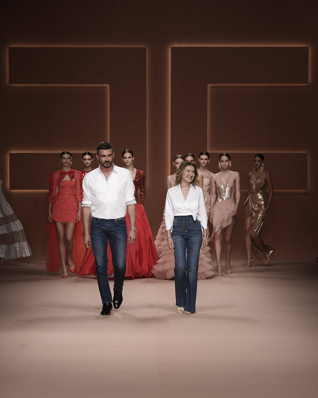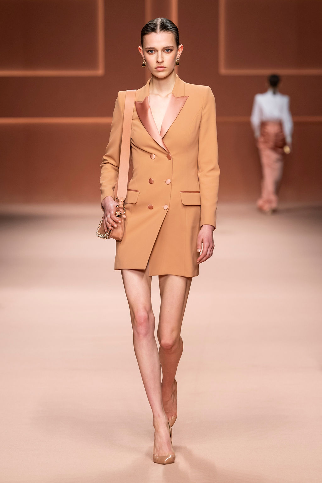Rempli de forces inspirantes, le défilé célèbre une femme qui peut tout faire, libre d’être ce qu’elle veut, ressent et désire. Cette saison, Elisabetta Franchi communique l’unicité et la force de l’univers féminin à travers la couleur, en utilisant une palette faite de nuances douces sur une trajectoire de femmes différentes mais reconnaissables, dévoilant leur nature authentique.