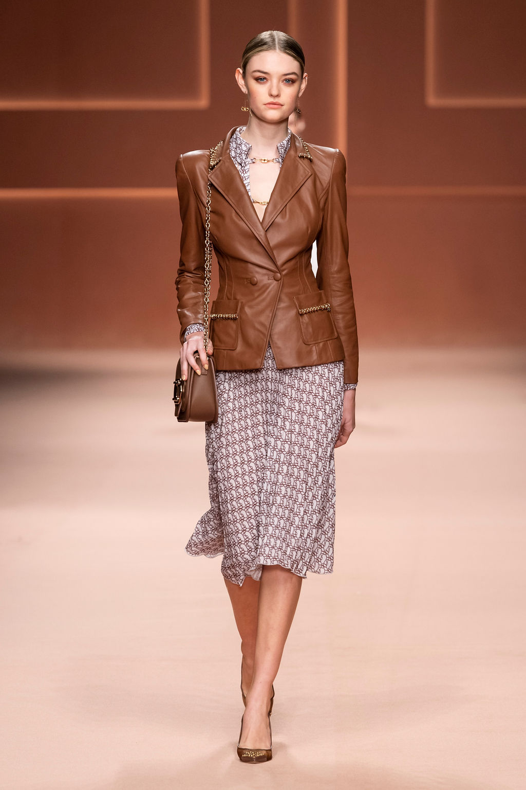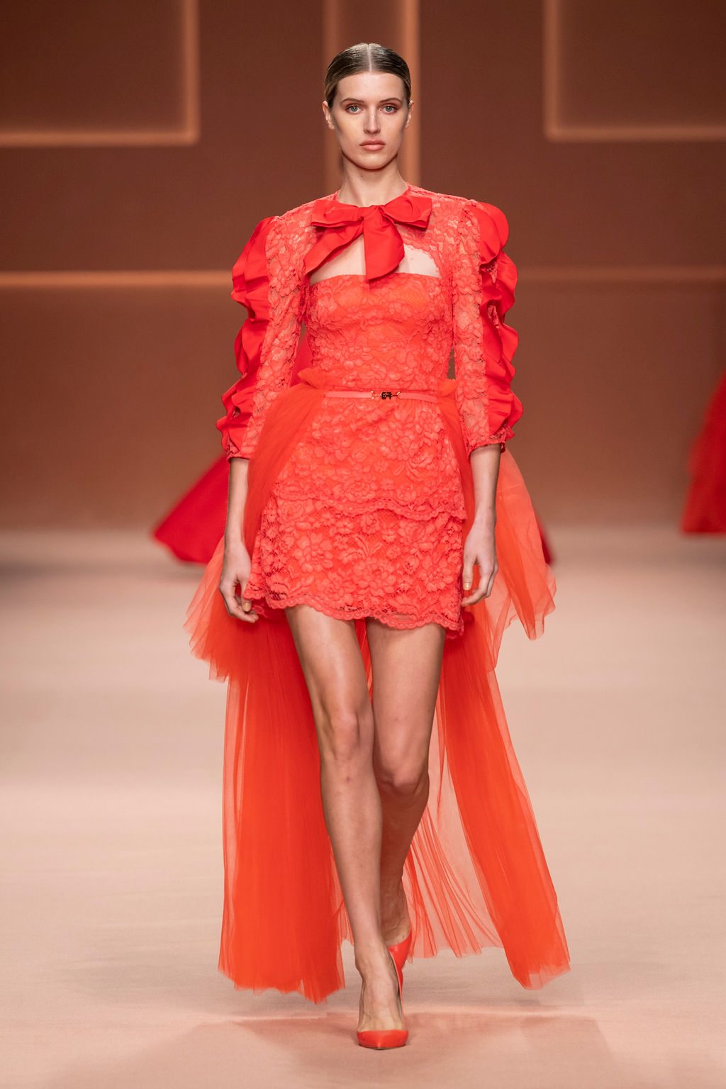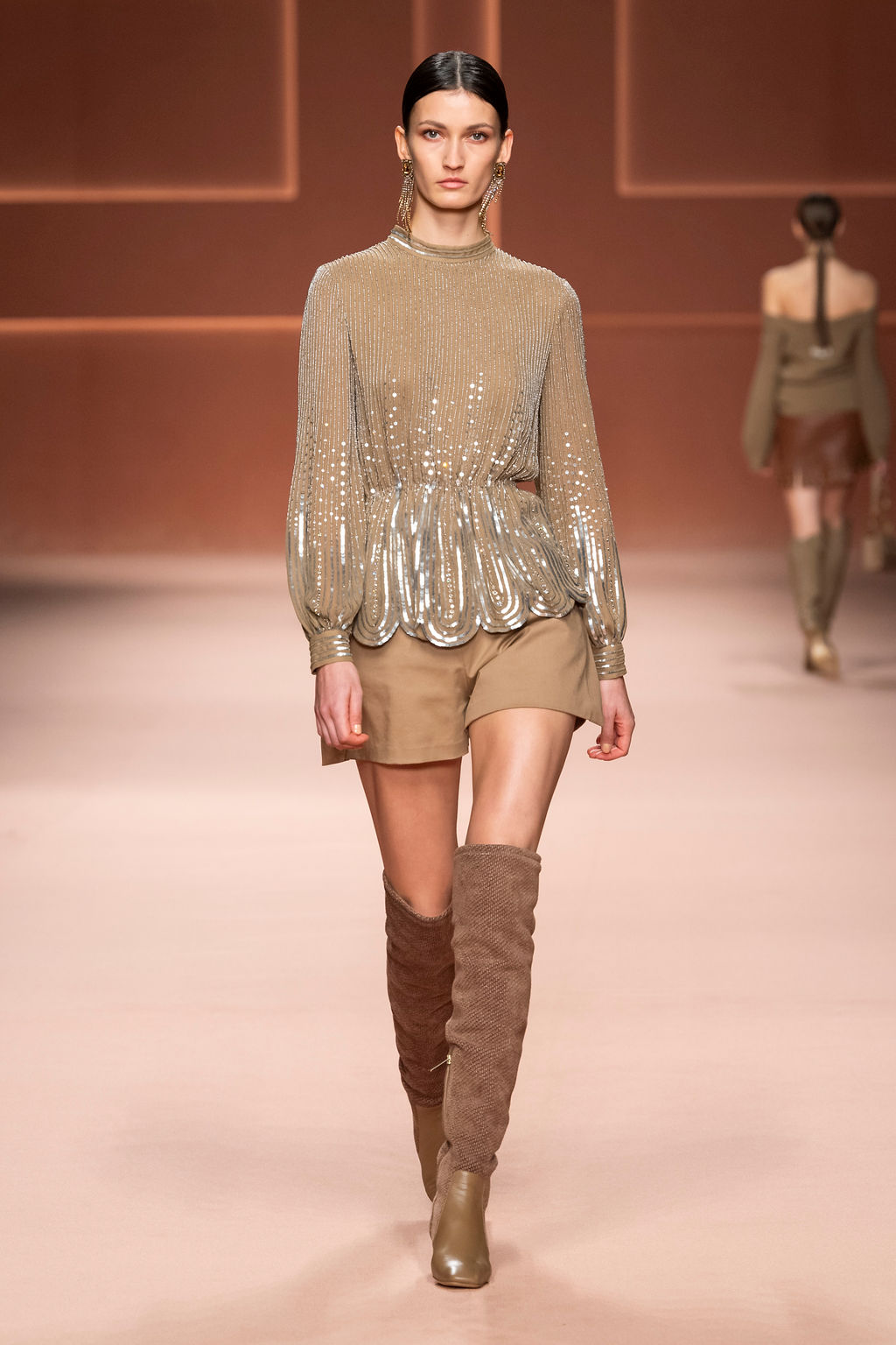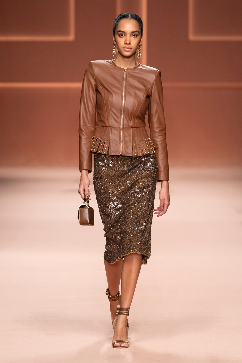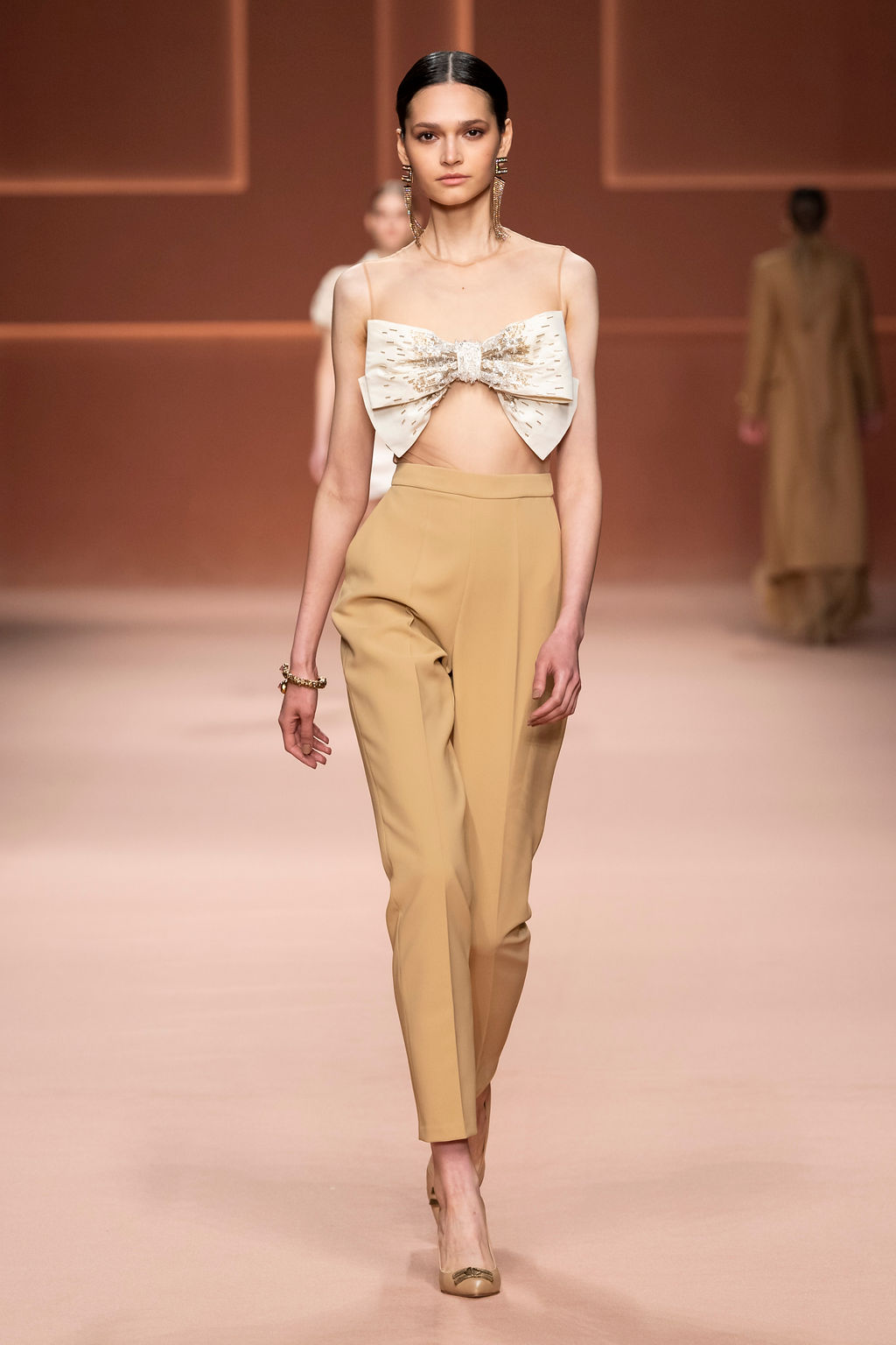 Rempli de forces inspirantes, le défilé célèbre une femme qui peut tout faire, libre d’être ce qu’elle veut, ressent et désire. Cette saison, Elisabetta Franchi communique l’unicité et la force de l’univers féminin à travers la couleur, en utilisant une palette faite de nuances douces sur une trajectoire de femmes différentes mais reconnaissables, dévoilant leur nature authentique.