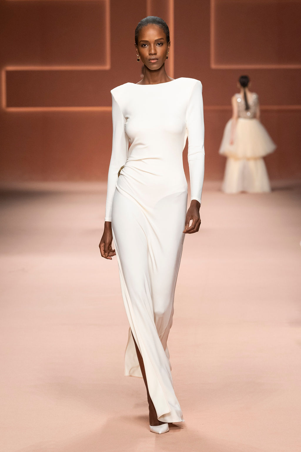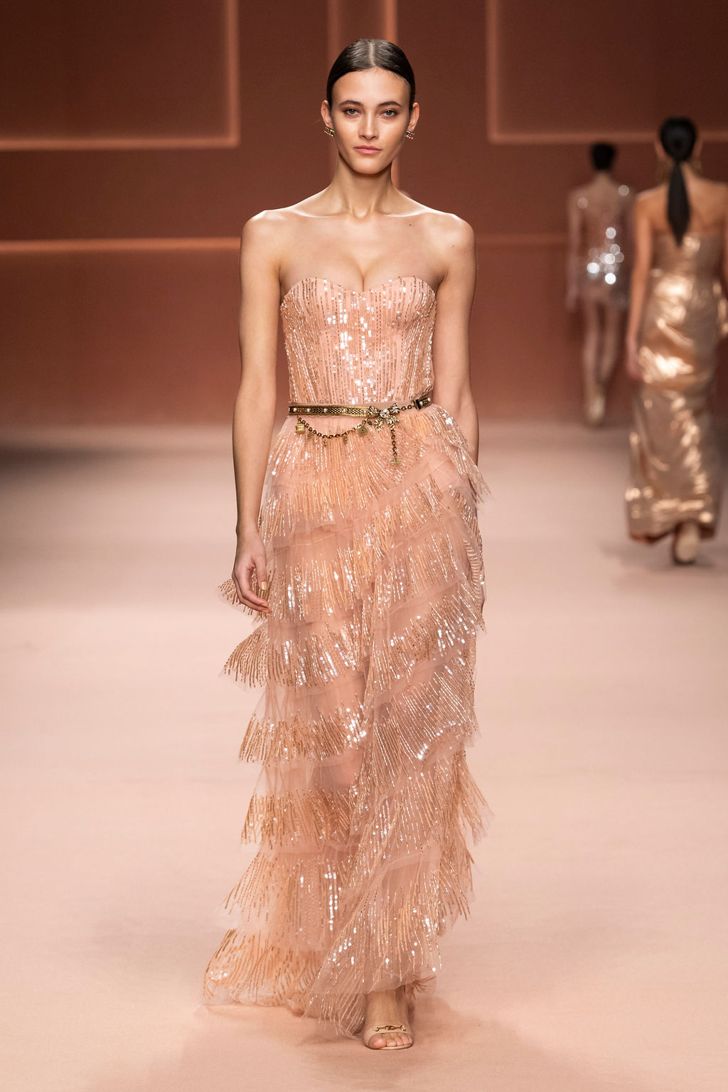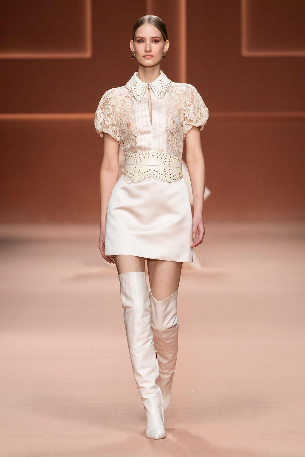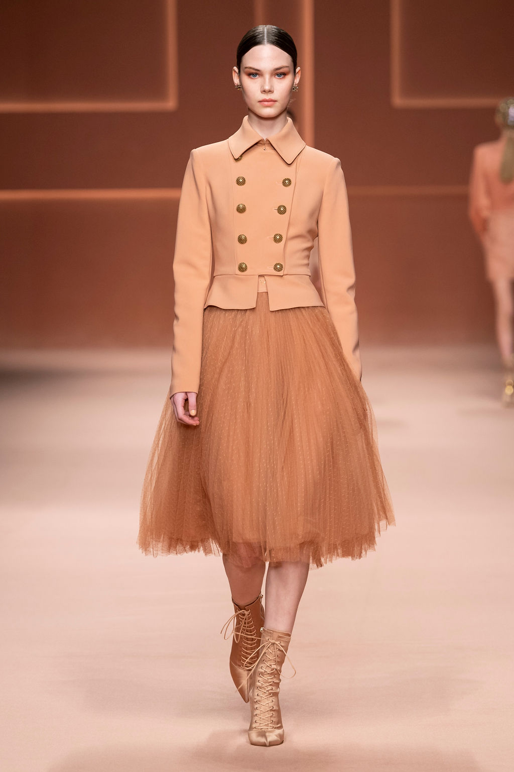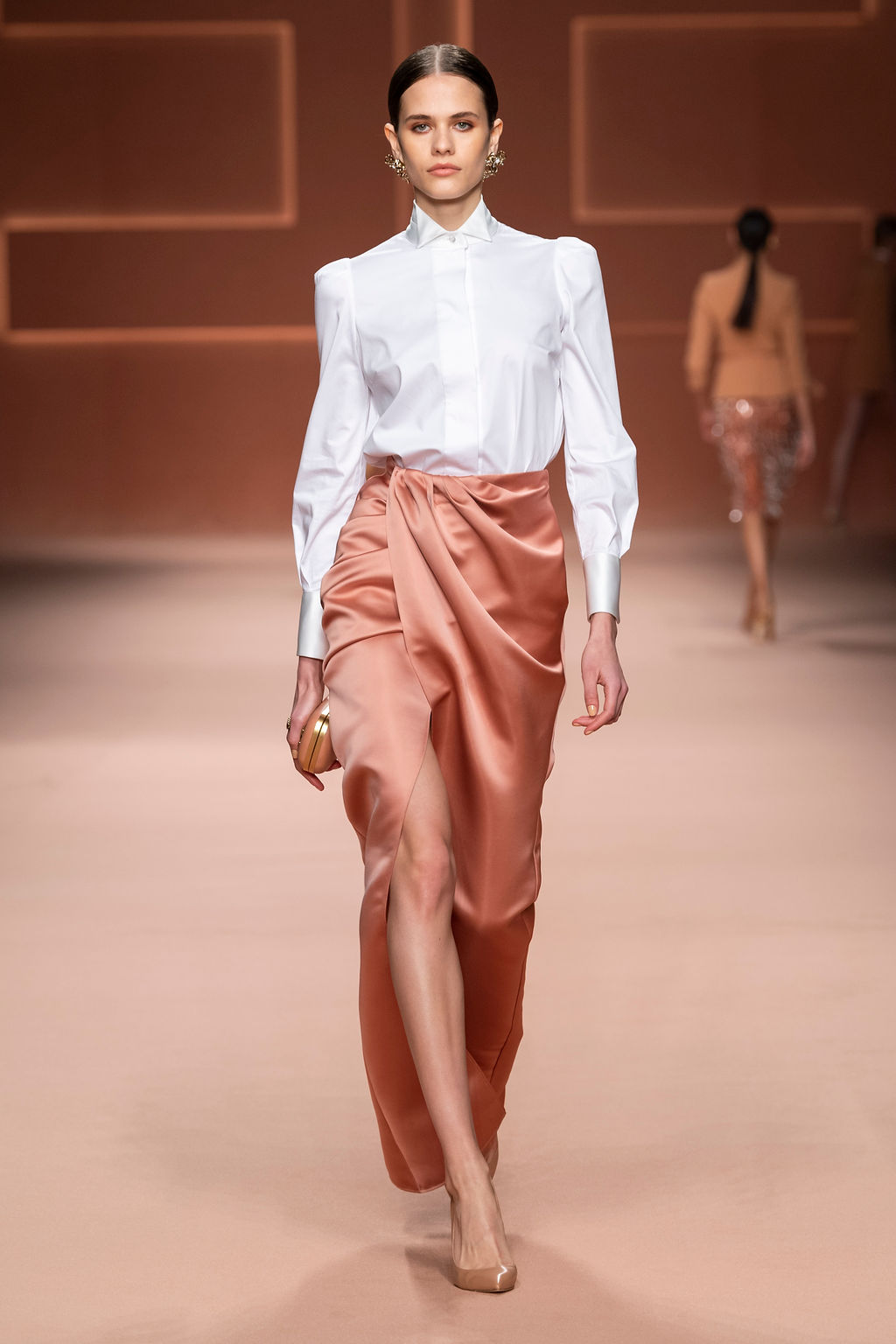 Rempli de forces inspirantes, le défilé célèbre une femme qui peut tout faire, libre d’être ce qu’elle veut, ressent et désire. Cette saison, Elisabetta Franchi communique l’unicité et la force de l’univers féminin à travers la couleur, en utilisant une palette faite de nuances douces sur une trajectoire de femmes différentes mais reconnaissables, dévoilant leur nature authentique.
