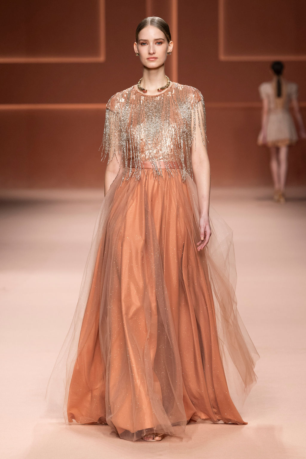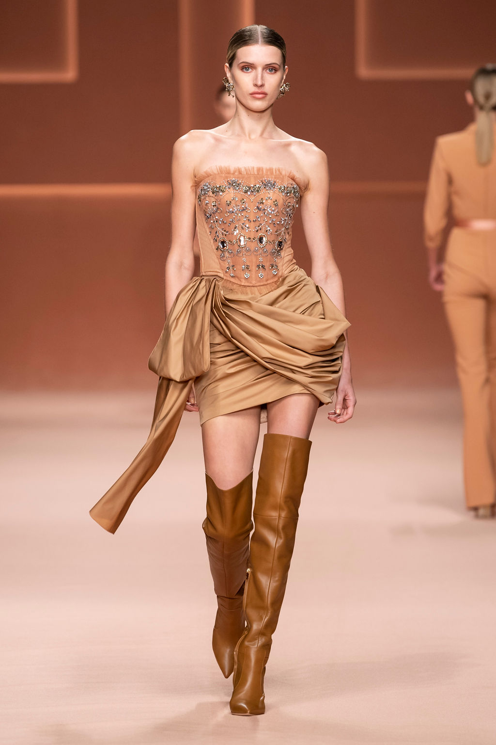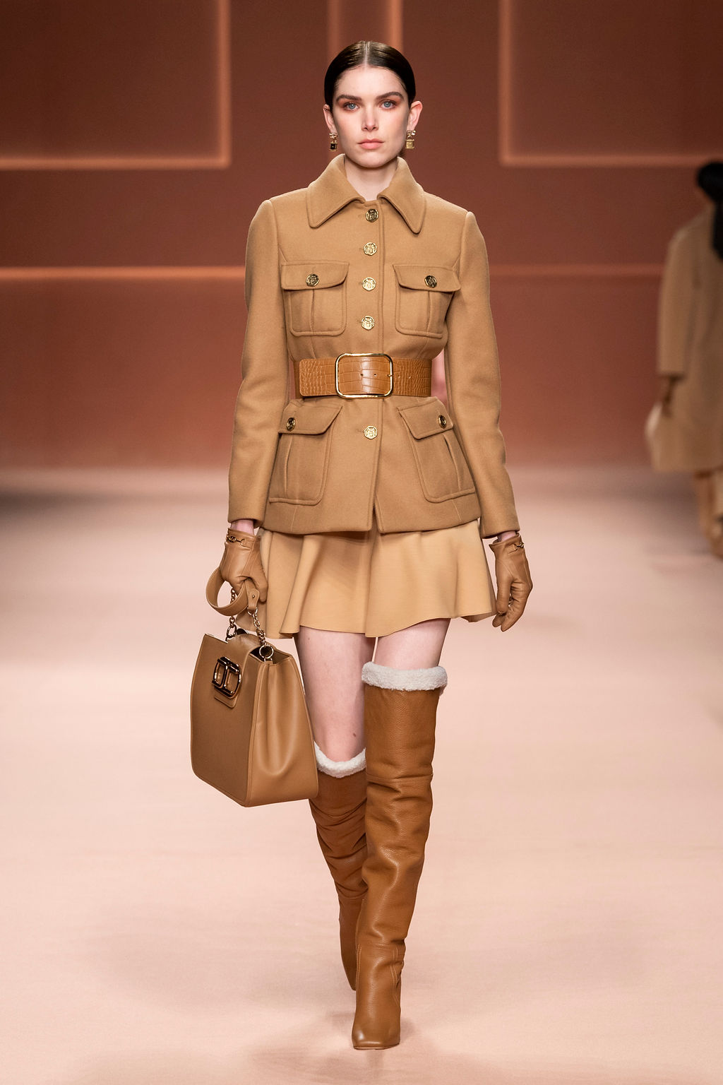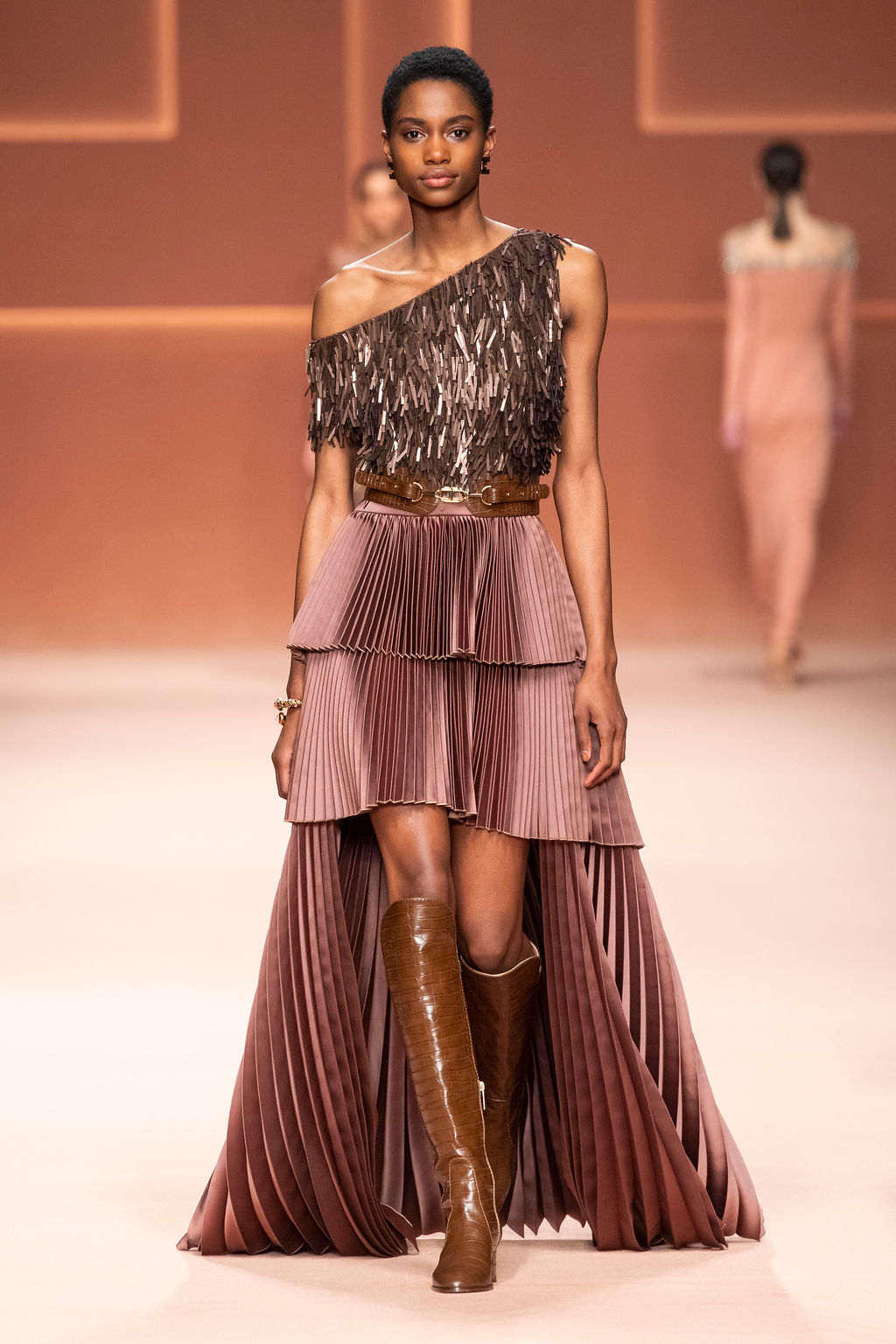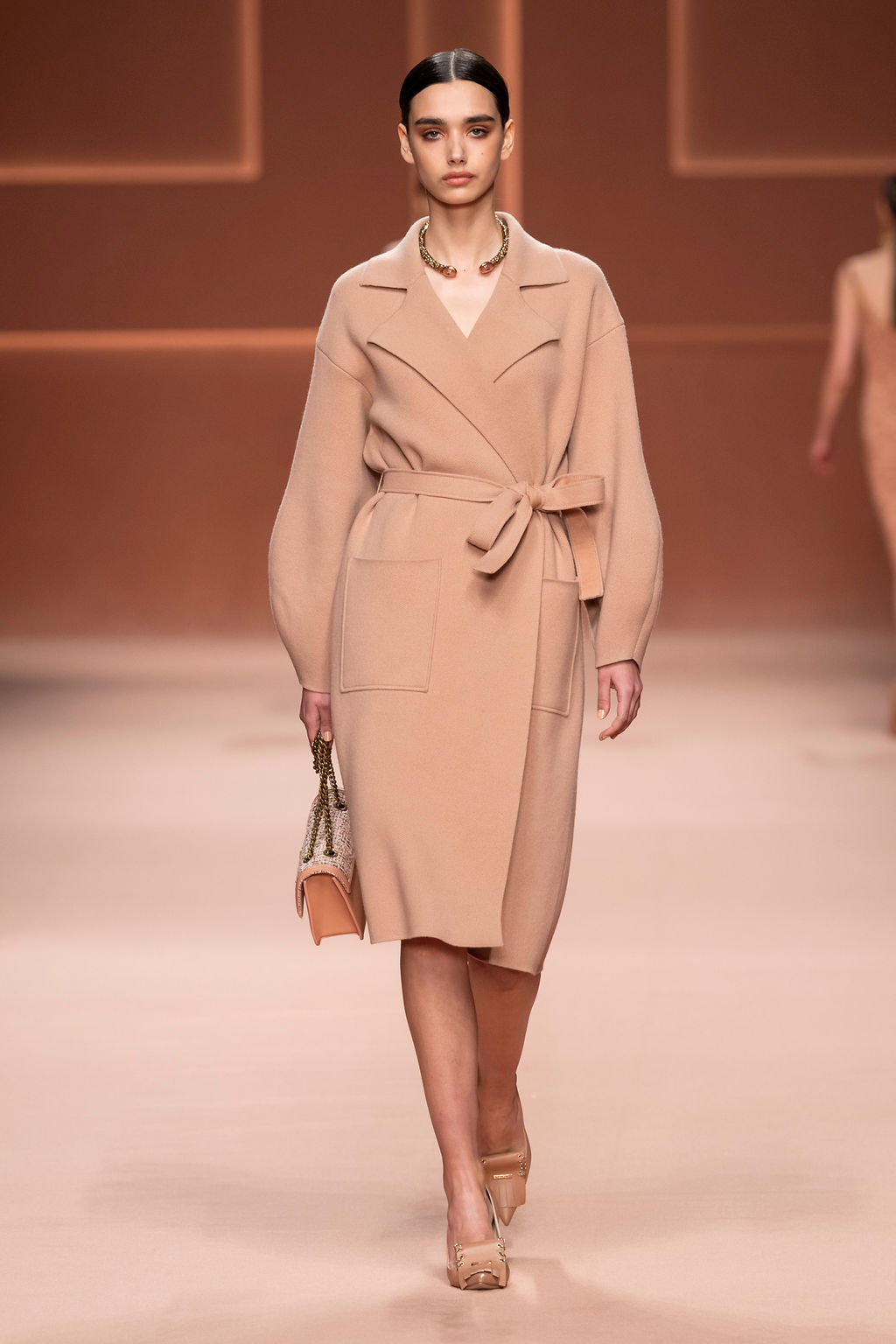 Rempli de forces inspirantes, le défilé célèbre une femme qui peut tout faire, libre d’être ce qu’elle veut, ressent et désire. Cette saison, Elisabetta Franchi communique l’unicité et la force de l’univers féminin à travers la couleur, en utilisant une palette faite de nuances douces sur une trajectoire de femmes différentes mais reconnaissables, dévoilant leur nature authentique.