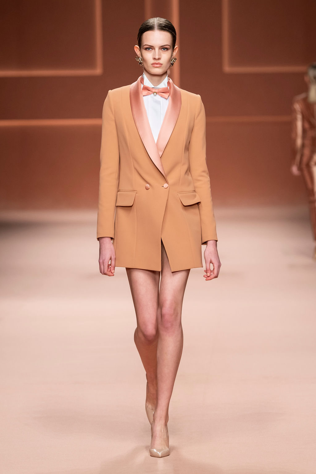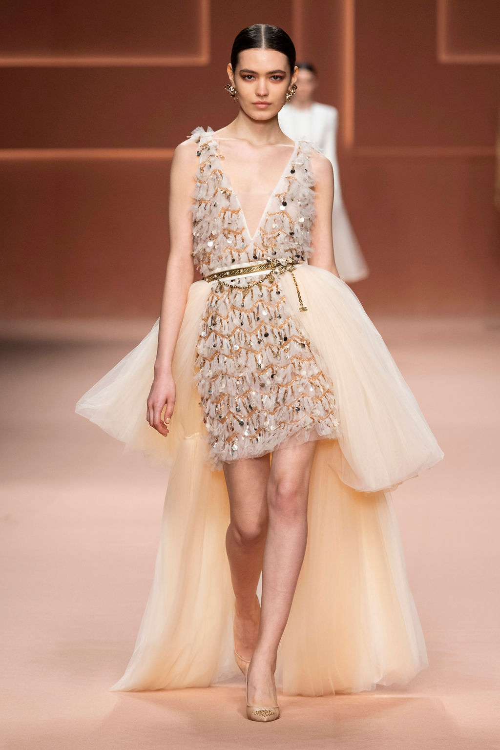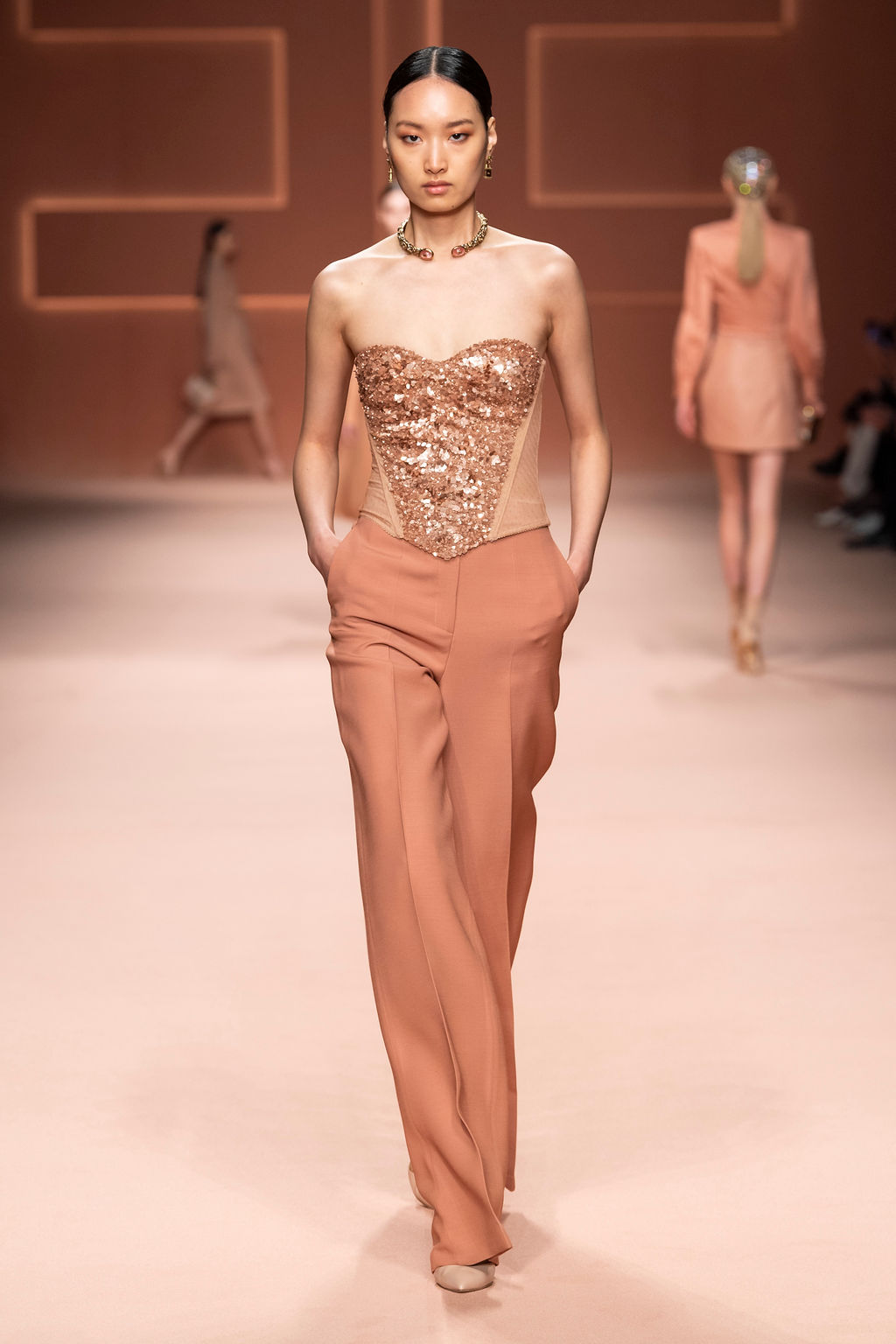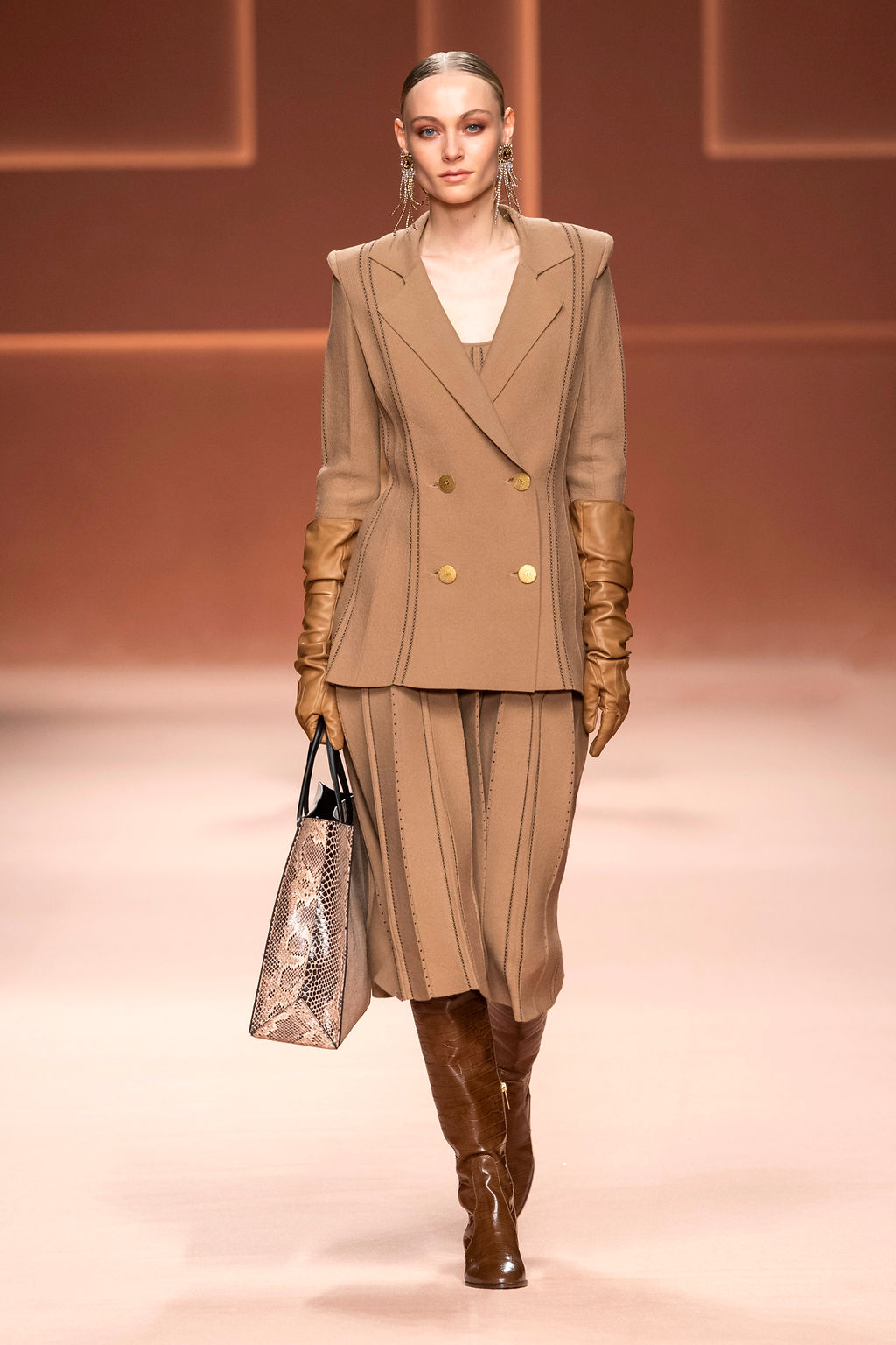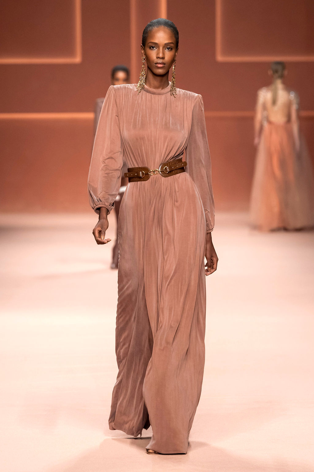 Rempli de forces inspirantes, le défilé célèbre une femme qui peut tout faire, libre d’être ce qu’elle veut, ressent et désire. Cette saison, Elisabetta Franchi communique l’unicité et la force de l’univers féminin à travers la couleur, en utilisant une palette faite de nuances douces sur une trajectoire de femmes différentes mais reconnaissables, dévoilant leur nature authentique.
