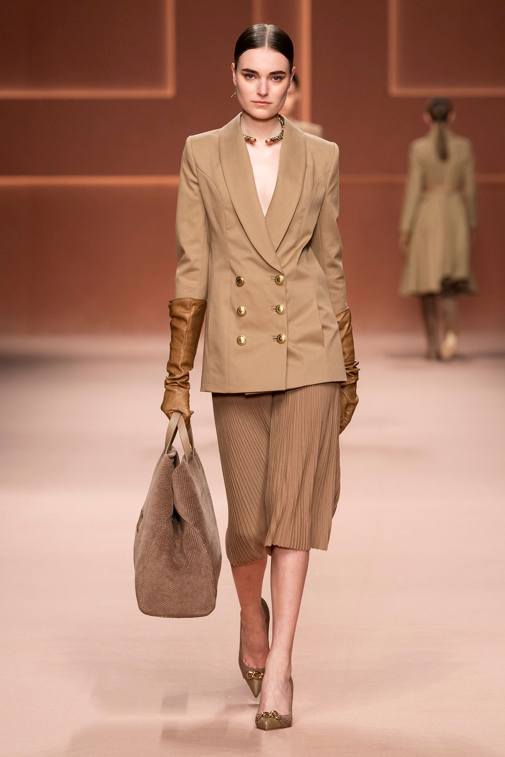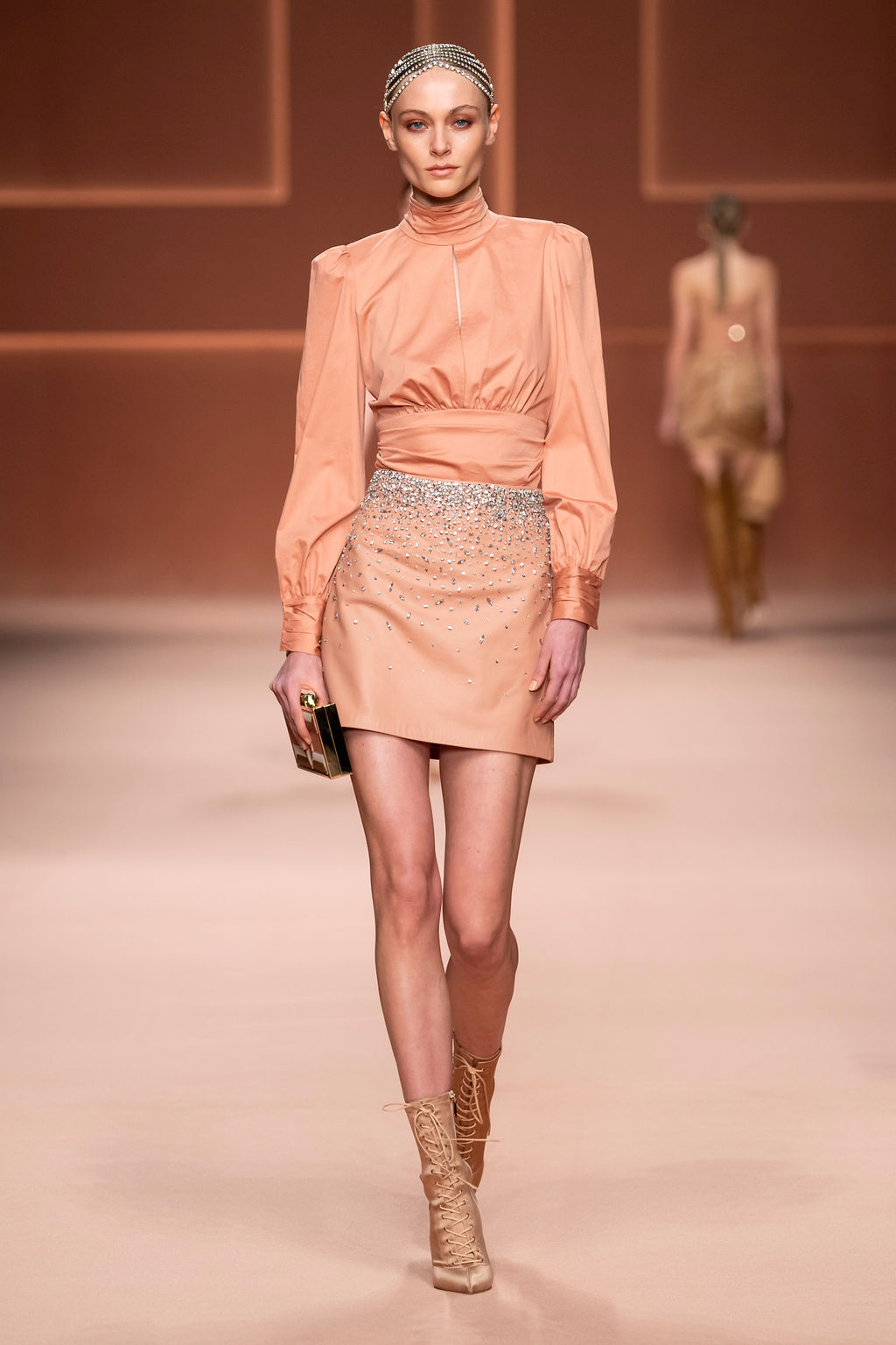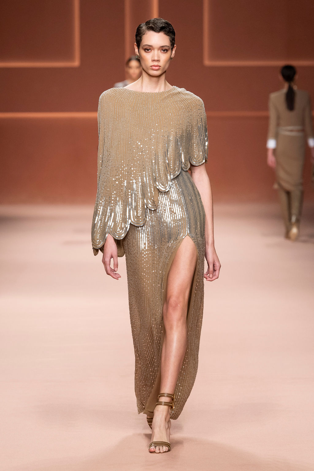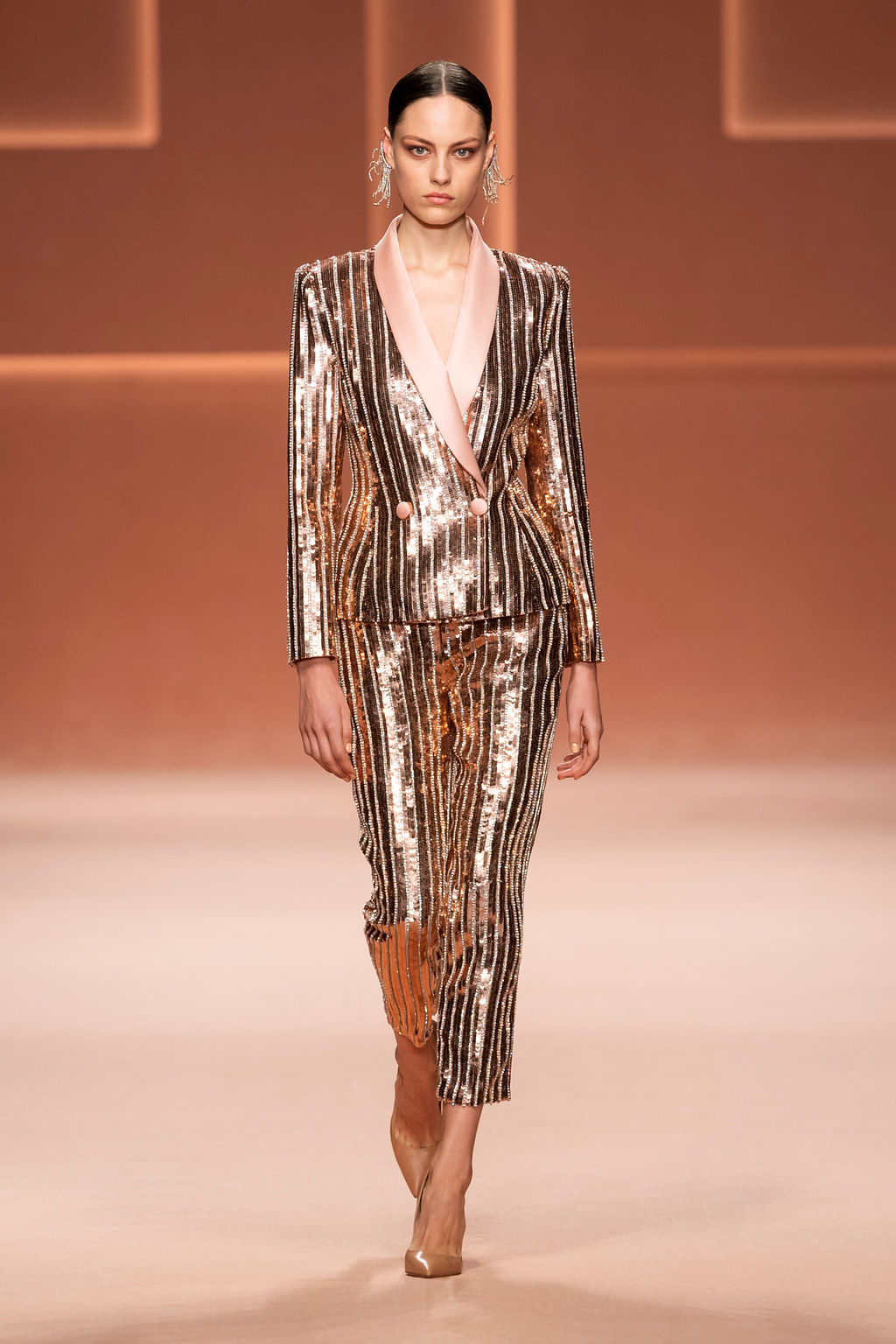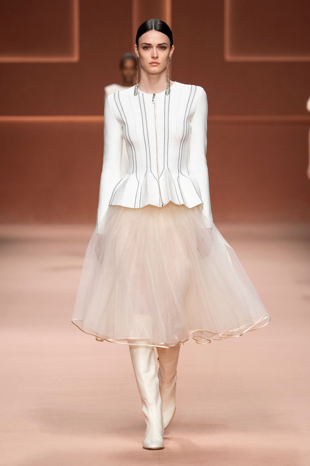 Rempli de forces inspirantes, le défilé célèbre une femme qui peut tout faire, libre d’être ce qu’elle veut, ressent et désire. Cette saison, Elisabetta Franchi communique l’unicité et la force de l’univers féminin à travers la couleur, en utilisant une palette faite de nuances douces sur une trajectoire de femmes différentes mais reconnaissables, dévoilant leur nature authentique.