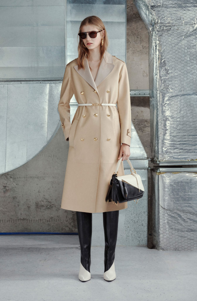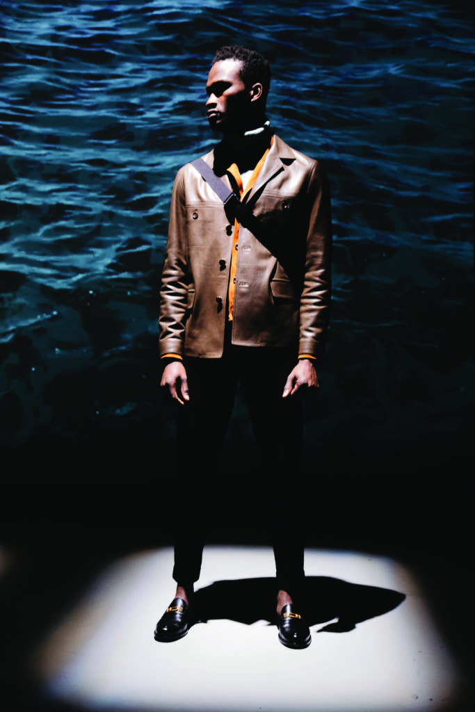 Leatherwork reprises its role, whether layered, light plonge, thin shearling or smooth suedes. Warm, woven knits present as luxurious cashmere-cotton flannels, fluid wools with vintage treatments, and technical jacquard. Accessories and shoes see unlined and waterproof sartorial-effect nylons, B-chain jacquards, croc-embossed matte leather and hardware highlights, like the 1851.