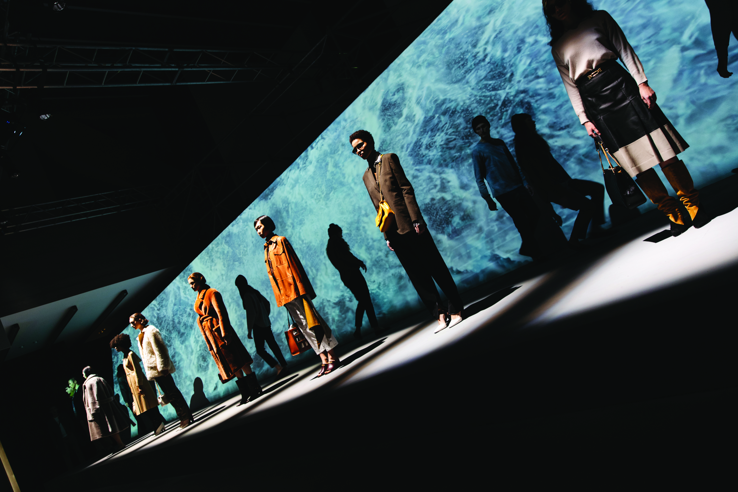 Bally introduces its Autumn/Winter 2020 collection through the sensory art of performance, Kaleidoscope; an immersive installation enhancing the seasonal message through subtle choreography, combining movement, film and sound to explore different perspectives, through the ever-changing synthesis of natural elements. A tunnel in black and white graphic preludes the experience reflecting the collection’s signature motif. The installation awaits you: roles are reversed as guests traverse the runway, while a crowd moves in the opposite direction, curiously alluding to the importance of understanding our place in nature. A celebration of the beauty and power of water and our intrinsic relationship to the oceans, rain and ice, culminates in a storm before giving way to the cyclically calm that follows. The pace of the performance slows, allowing a time for renewal: the warmth of the sun and the balm of crystal clear water that gathers in mountain valleys, before running through rivers to the sea. Kaleidoscope underpins the values of Bally. Light filters in, illuminating standout silhouettes of models outfitted in the new collection, where craftsmanship, quality and advanced tailoring are designed to stand the test of time. A series of optical crystal prisms inspired by alpine glaciers focus attention and magnify detail in footwear and accessories. The installation is an opportunity to see things from a myriad of viewpoints; proposing a lifestyle that is sensitive and aware of its place in the world.