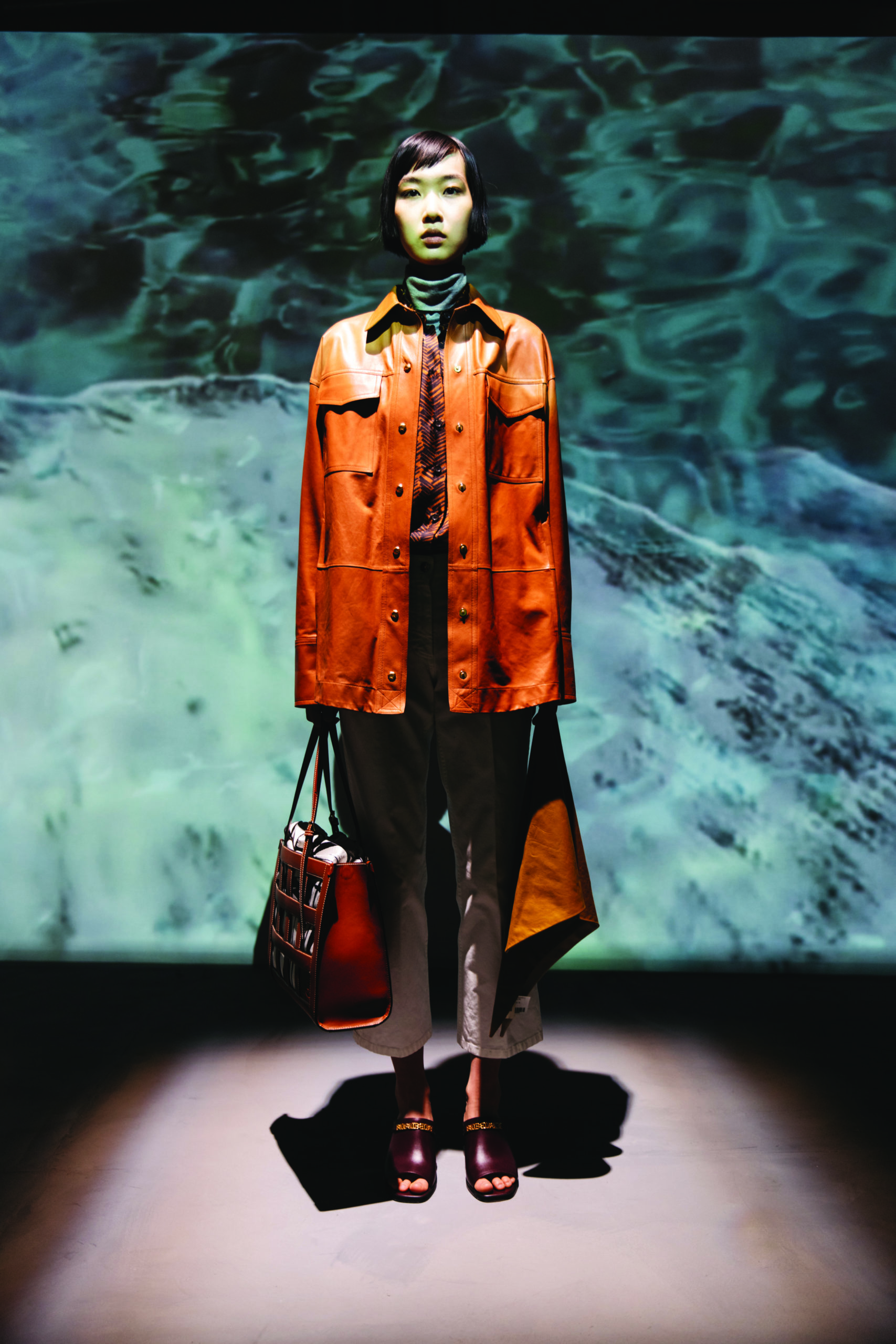 Leatherwork reprises its role, whether layered, light plonge, thin shearling or smooth suedes. Warm, woven knits present as luxurious cashmere-cotton flannels, fluid wools with vintage treatments, and technical jacquard. Accessories and shoes see unlined and waterproof sartorial-effect nylons, B-chain jacquards, croc-embossed matte leather and hardware highlights, like the 1851.