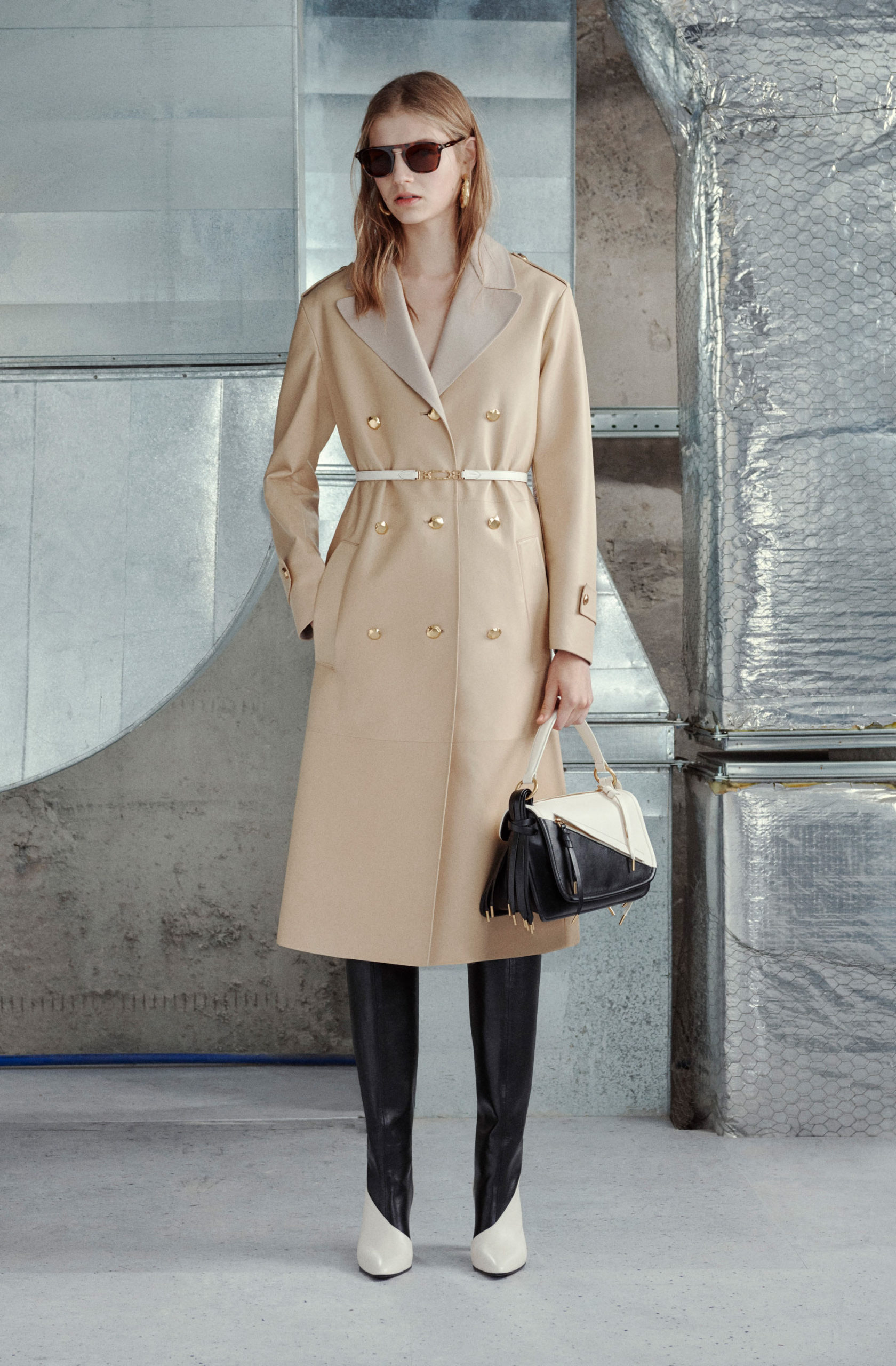 Soft knit cashmere cardigans and roll necks meet the sharp tailored silhouettes of heritage-printed silk shirts and split-seam pants. Outerwear projects a confident approach to dressing through cinch-waisted leather coats and elegant shearling styles, punctuated by hammered-metal buttons. Always the architect of leather, a graphic chevron patchwork coat with hand-cut black-and-white segments is a highlight, as are the collection’s oversized leather shirts and high-waisted leather skirts.