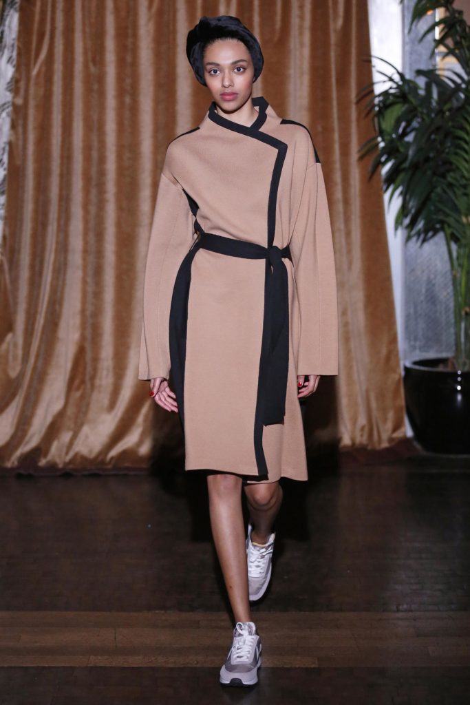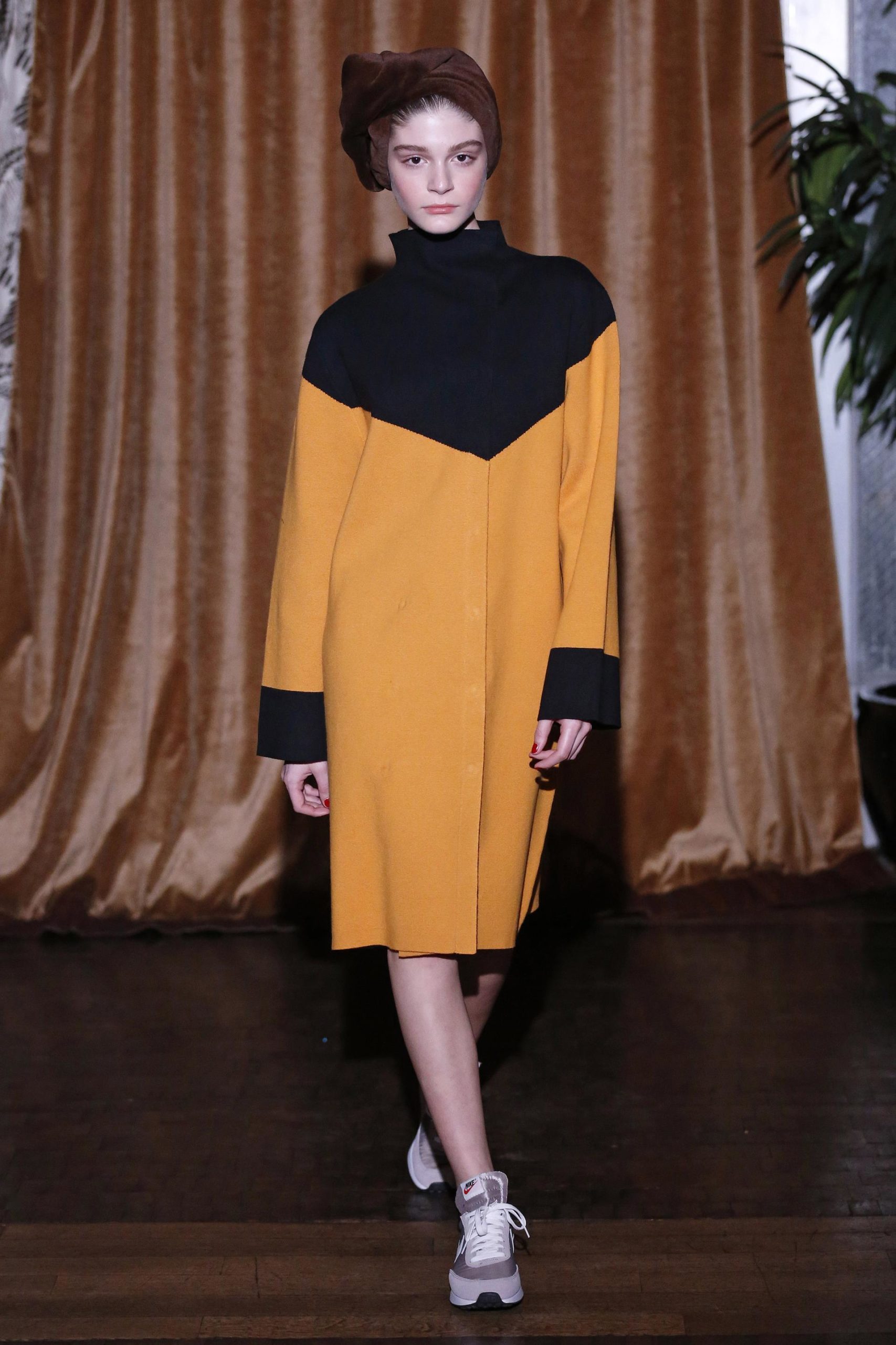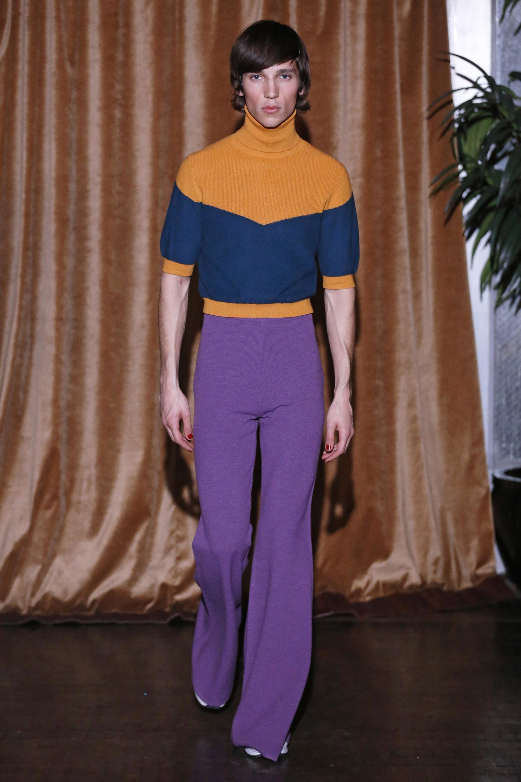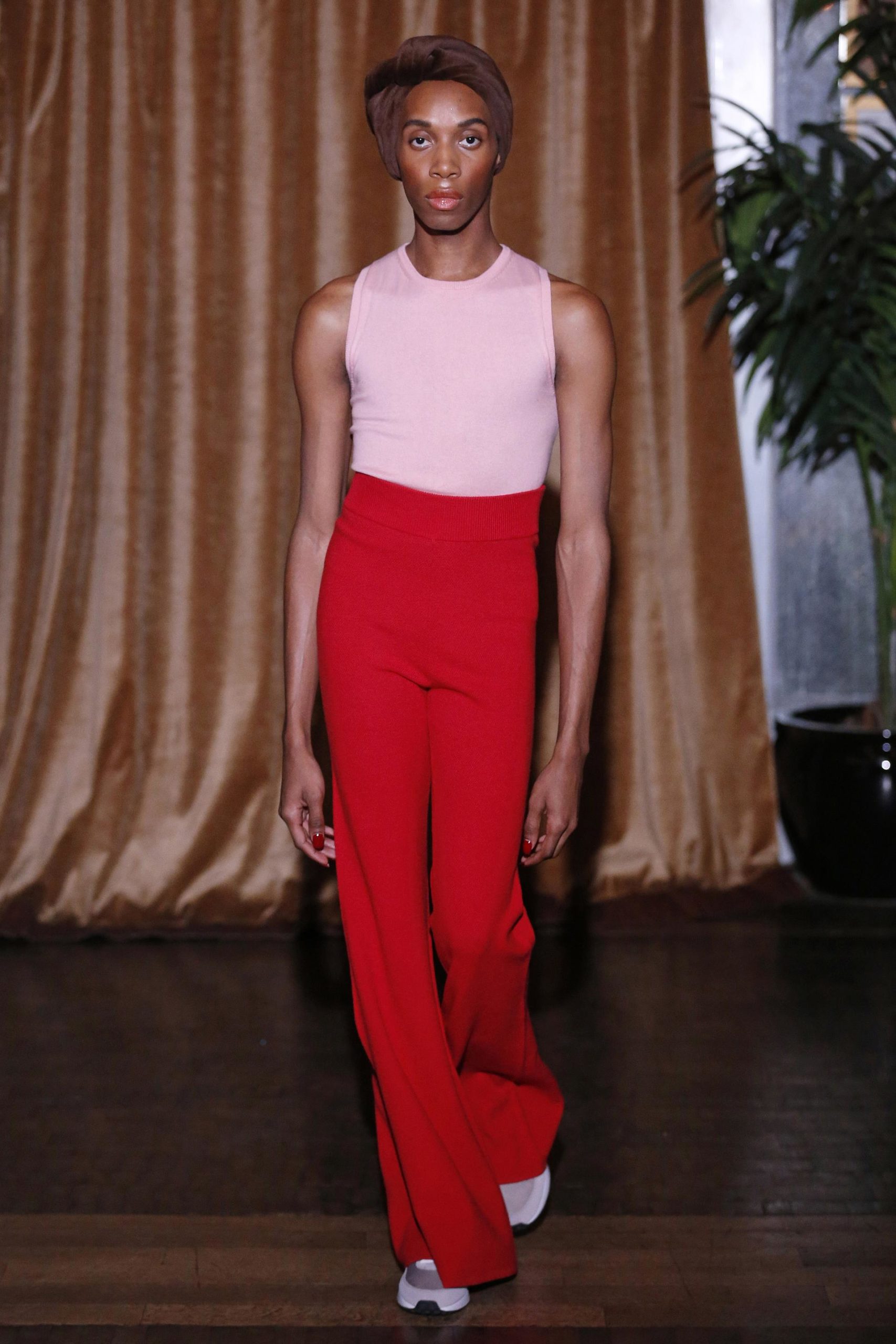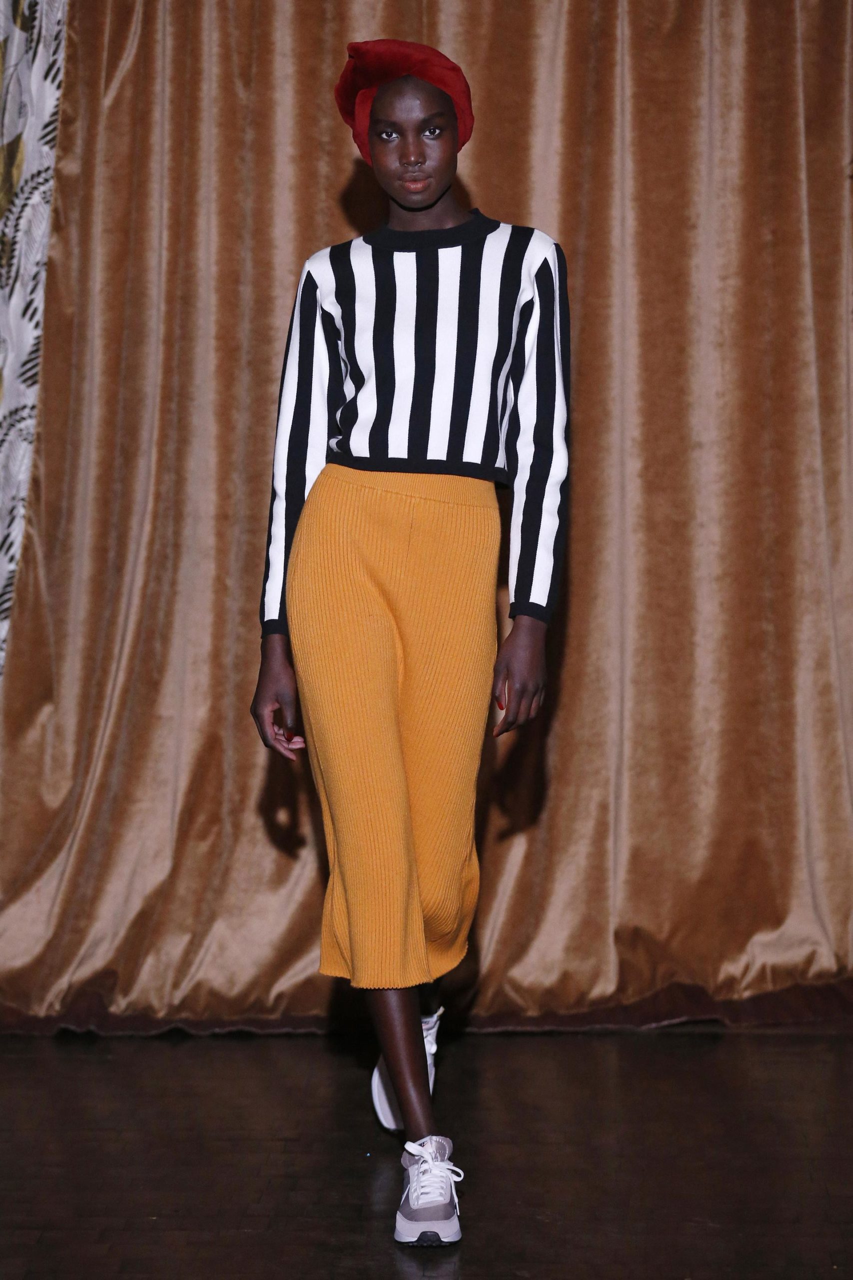 Knitwear focuses on natural yarns of merino, cotton cashmere and merino-cotton-ramie blend, in various stitch work, including Milano stitch. A mix of silhouettes include sweaters, crop tops, flared pants, skirts in varying lengths and long sleeve, sleeveless, one-shoulder and off-shoulder dresses integrating the “slash” pattern, and coats with snap closures. The looks, modeled by an inclusive cast celebrating gender and body-positivity, are accessorized with shaved mink turbans in collaboration with Saga Furs and inspired by his dear friend Camilla Stærk, as well as with classic old school Nike Tailwind sneakers.
