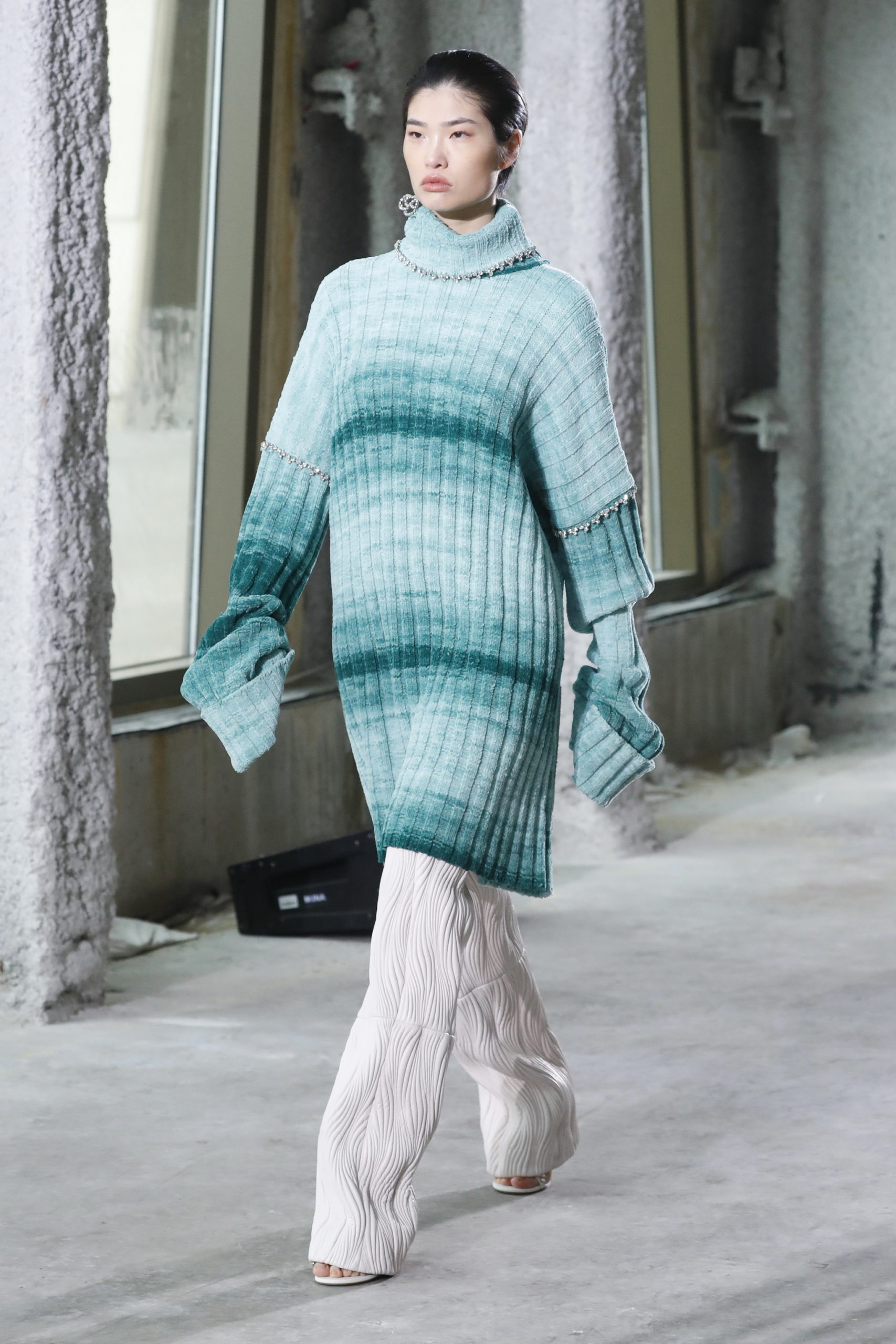 Le point de départ de la collection AREA AH20 est le travail de drapé de l’iconique Madame Grès. Les créateurs ont recontextualisé cette influence majeure dans leur propre langage visuel en utilisant leur matériau signature, les chaînes de cristaux Preciosa. Une autre source d’inspiration cette saison est la créatrice de costume japonaise Eiko Ishioka.