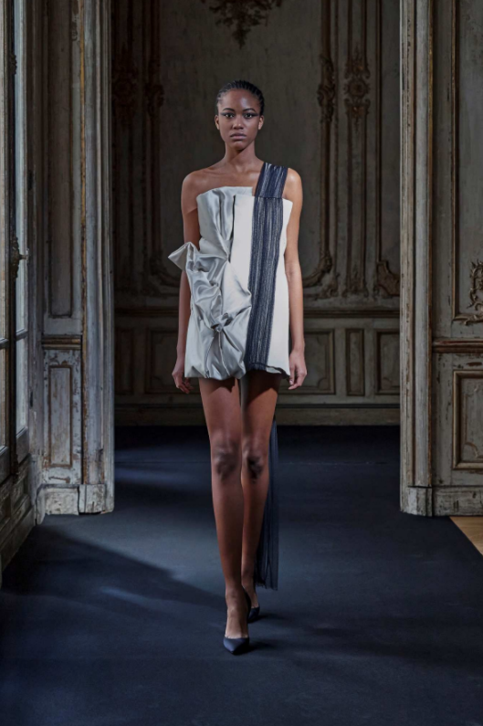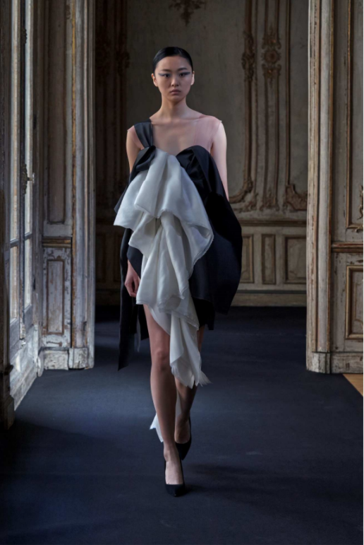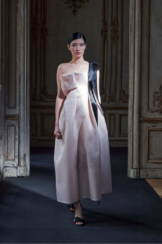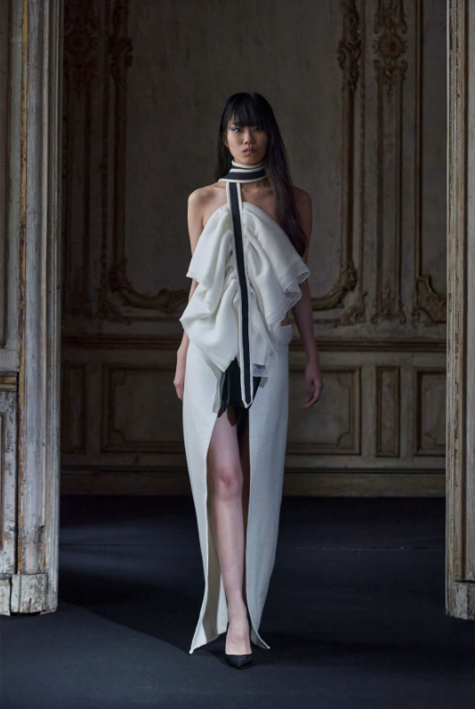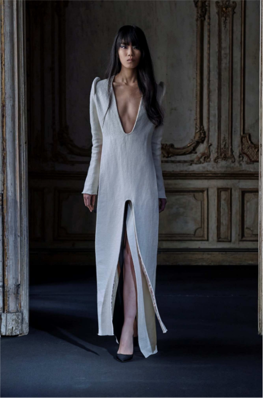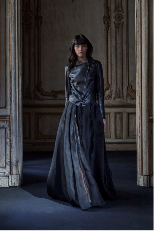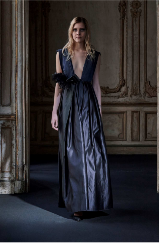 fabrication artisanale de chaque pièce de la collection. Du Japon arrive ainsi un tissu à la technique ancestrale utilisé pour réaliser les kimonos, et devient une robe ruban en bandes de soie. Le denim en chanvre naturel teinté dans l’indigo par Majotae, s’associe à du satin duchesse et à des plumes noires dans une robe, et suggère une évolution écologique de la toile de jean. Enfin, des vestes d’homme vintage, héritages de famille, sont rebrodées de bandes de tweed, de strass, de pétales de cristal et