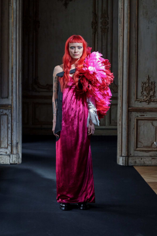 Mêlant le rouge du soleil couchant au bleu de l’eau, la mer s’habille de mille nuances de pourpre que l’on retrouve dans toute cette collection. Une robe en taffetas de soie naturelle, aux couleurs crépusculaires, se noue comme une vague océanique autour du corps. Une cape à plis verticaux est portée avec un talisman créé pour Aelis par les Intéressants. 400 mètres de ruché coupé à la main en rubans et teinté un par un, forment une autre robe évoquant la beauté hypnotisante d’une méduse.