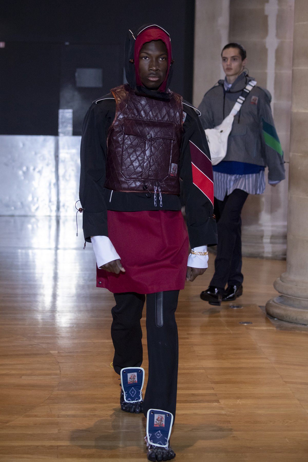 La collection montre un contraste allant de veste tailleur en laine, de sévères manteaux en Skaï noir, des chemises multicolores, des bombers en faux cuir piqué et des parkas en taffetas colorés.