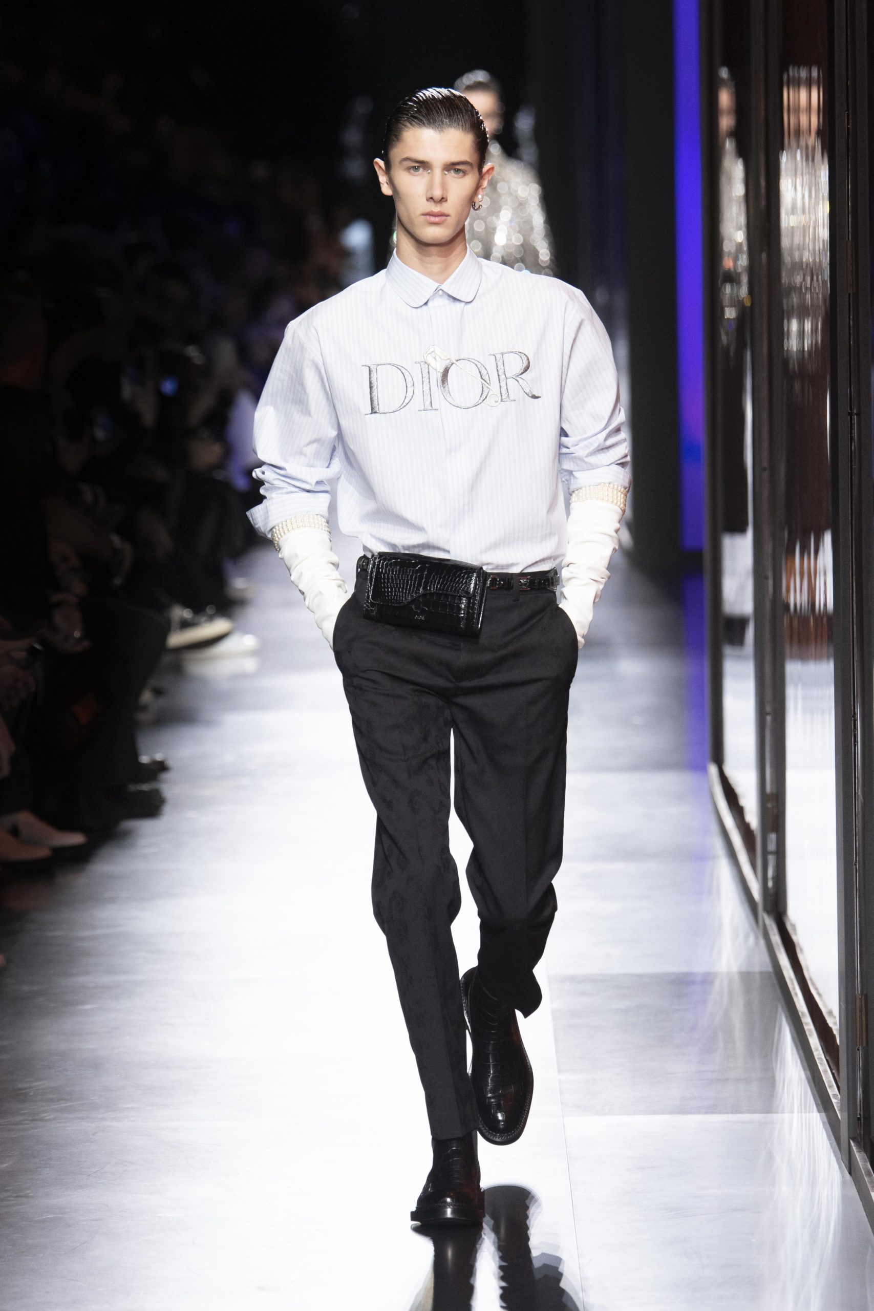 LES SILHOUETTES EXPLORENT LES VALEURS D’EXCELLENCE ET D’AUTHENTICITÉ, DÉFINISSANT LA MODE NON SEULEMENT COMME ŒUVRE FINALE MAIS AUSSI COMME PROCESSUS CRÉATIF. LES VÊTEMENTS, SOULIERS ET ACCESSOIRES SONT DOTÉS DE ZIPS SUBLIMANT LEUR CONSTRUCTION, SOULIGNANT LEURS DÉTAILS ET LEUR COUPE, UNE ODE À L’ARCHITECTURE CHÈRE À CHRISTIAN DIOR. LA TOILE DIOR OBLIQUE EST RÉINVENTÉE PAR DES BRODERIES DE PERLES, TANDIS QUE LE LOGO DIOR EST PIQUÉ D’UNE ÉPINGLE À NOURRICE – UN ÉCHO AU STYLE DE JUDY BLAME INFLUENCÉ PAR LE DIY.