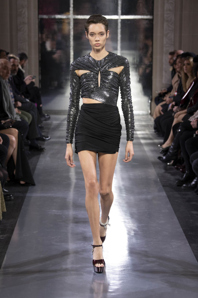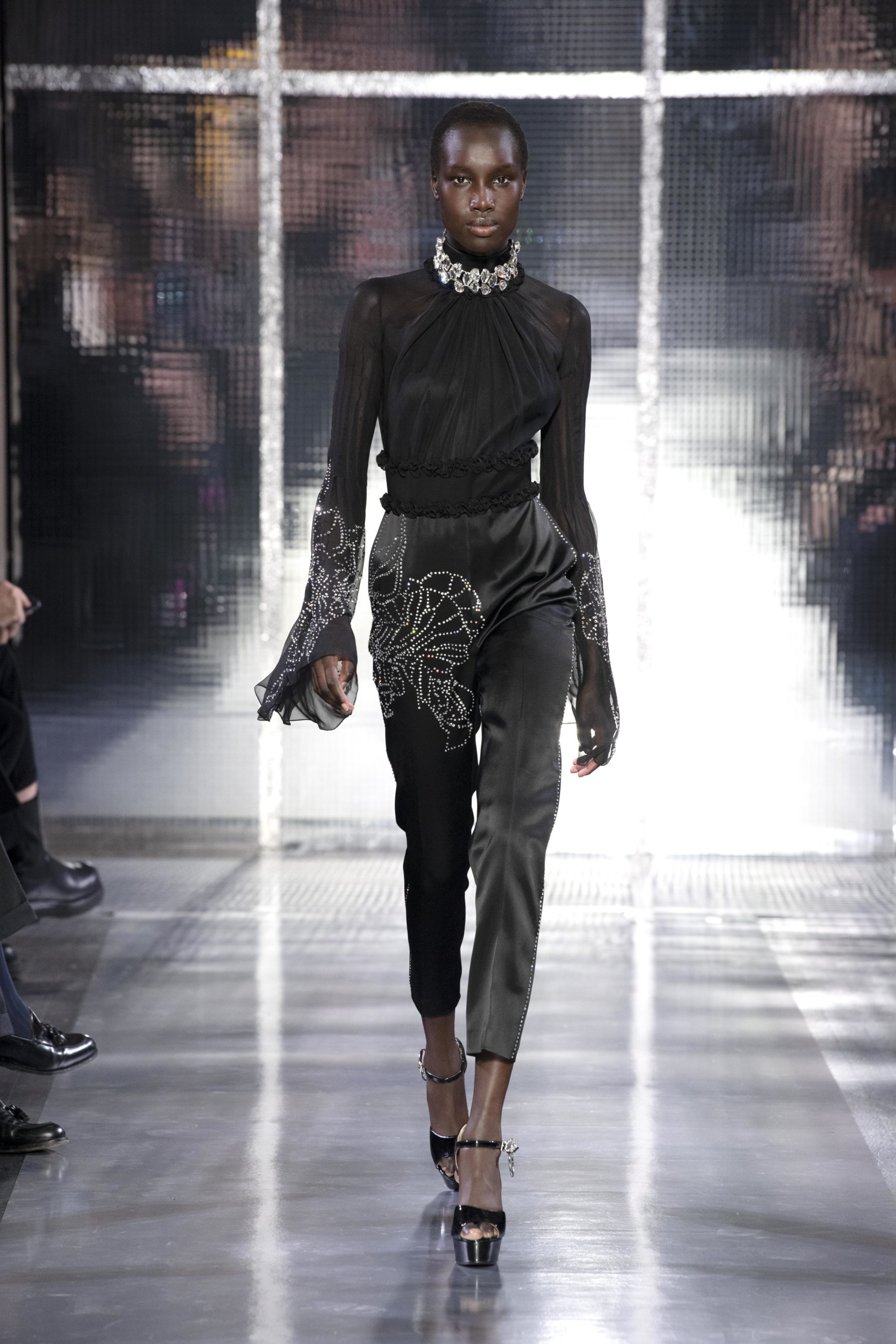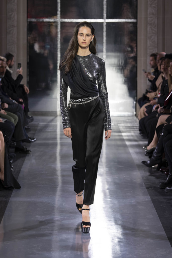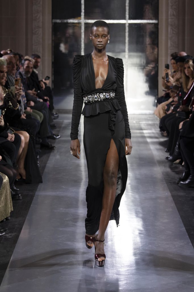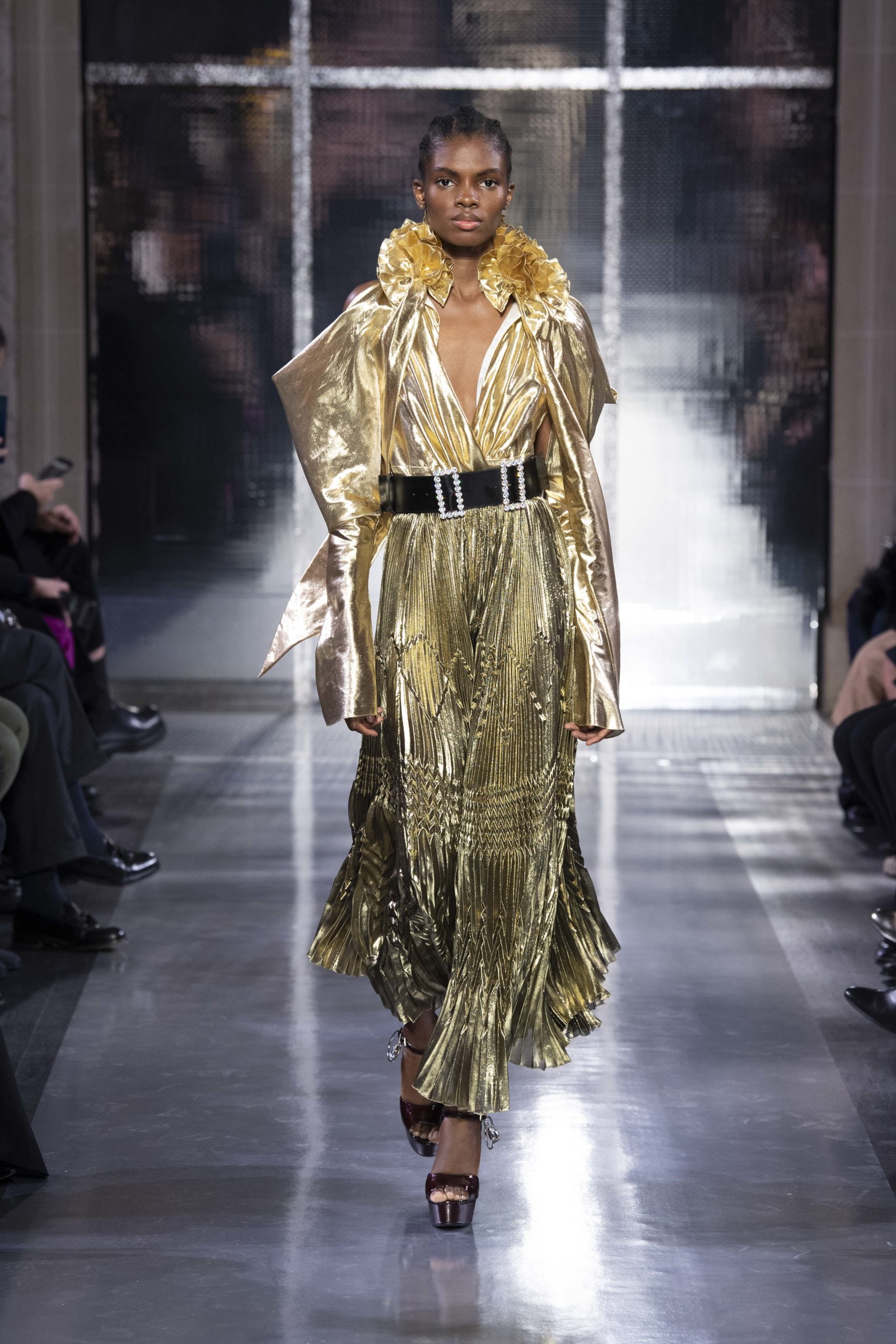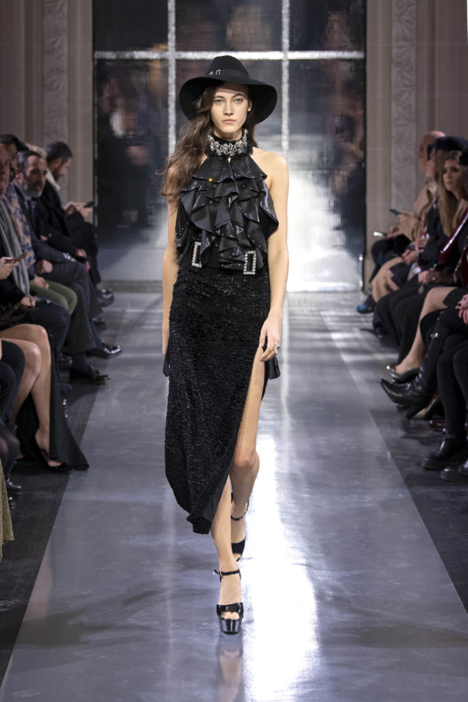 The flamboyant sensuousness of the Azzaro female has stood the test of time, and this season the Brand celebrates the woman of this new world: a liberated, assertive epicurean Amazon who draws strength on her uniqueness. Wreathed in mystery, the designs cultivate a retro-futurist aesthetic where structure and movement are used to delineate plays on light and shadow, opacity and transparency, matte and shine. Combining the Brand’s festive, sensuous Couture references with a one-of-a-kind universe straight out of another constellation, the collection explores a fleshy, graphic futurist flora with generous volumes and the illusion of simplicity. The tailoring is relentless, the waistline high and nipped-in, the V-necks open and assertive, the sleeves low-cut. The sleeves offer a number of effects: here balloon-shaped to accentuate the build, there a more fluid pagoda shape to cover the hands or reveal the shoulders. Feminine in its essence, the dress remains the key piece of this collection. Long or extra-short, the dress is adorned with ruching, draping or sunray pleats, with cut-outs that subtly reveal the body’s curves, made more exquisite there with a zip and a constellation of beads and crystals. This elegance also appears in the design of trousers, of which the legs are adorned with a succession of flounces or straight-cut black satin enhanced with pleats; or in the jewellery pieces, featuring irregular crystal stones. The opacity of a long double-breasted coat in wool broadcloth and silky eco-fur interacts with the daintiness of diaphanous chiffon, mesh embroidered with crystals or aluminium-laminated leather. In the image of otherworldly foliage, fine embroidery – in metal beads, crystalline stones or sequins – is irregularly sprinkled across the designs, providing a precious sparkle that enhances the shine of a leather-effect laminate, crepe, satin or jersey, one of the emblematic materials of the Azzaro brand. This light, captured by the omnipresence of gold and silver, is enhanced by the depth of the black and punctuated with flamboyant colours such as crimson, purple and cobalt yellow. The men’s wardrobe, driven by the same inspiration, echoes this new world with its flawless cuts brightened by incandescent lurex, straps embroidered with imaginary marine flora in beads and metal, celestial fringed embroideries, or jacquard featuring abstract patterns inspired by the moon’s relief, entirely embroidered with charcoal grey stones. This collection travels between the past and the future in a new world where the attitude is liberated and the sophistication iconoclastic.