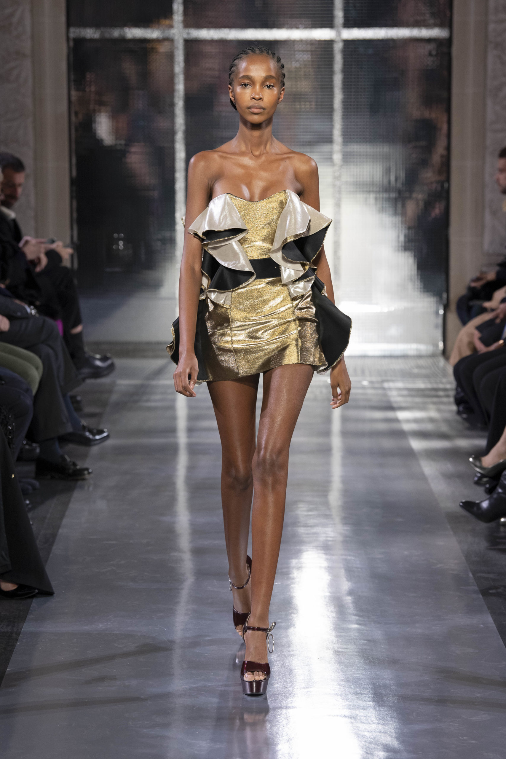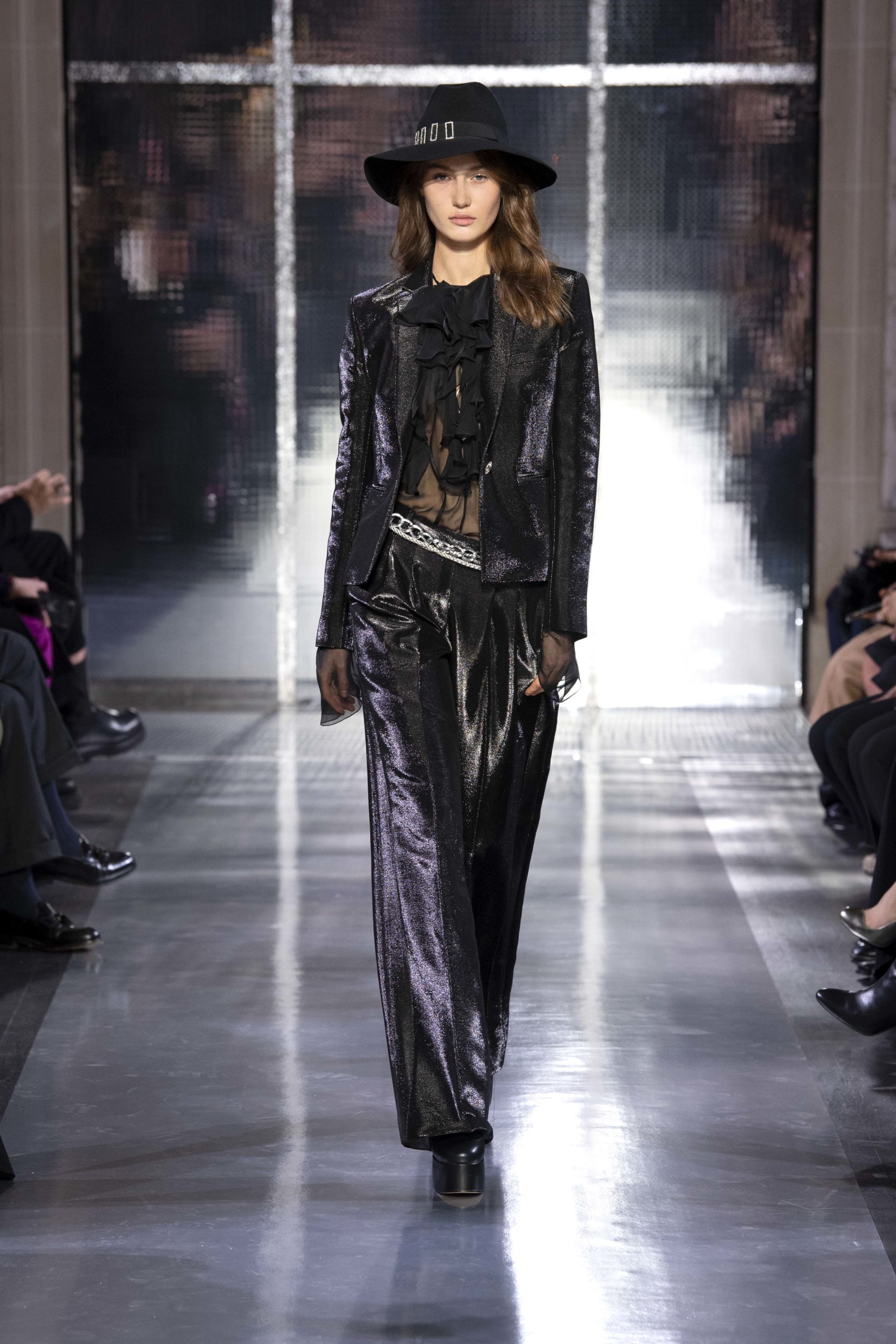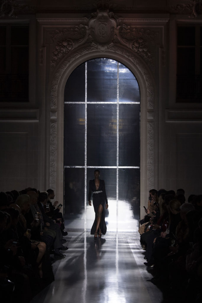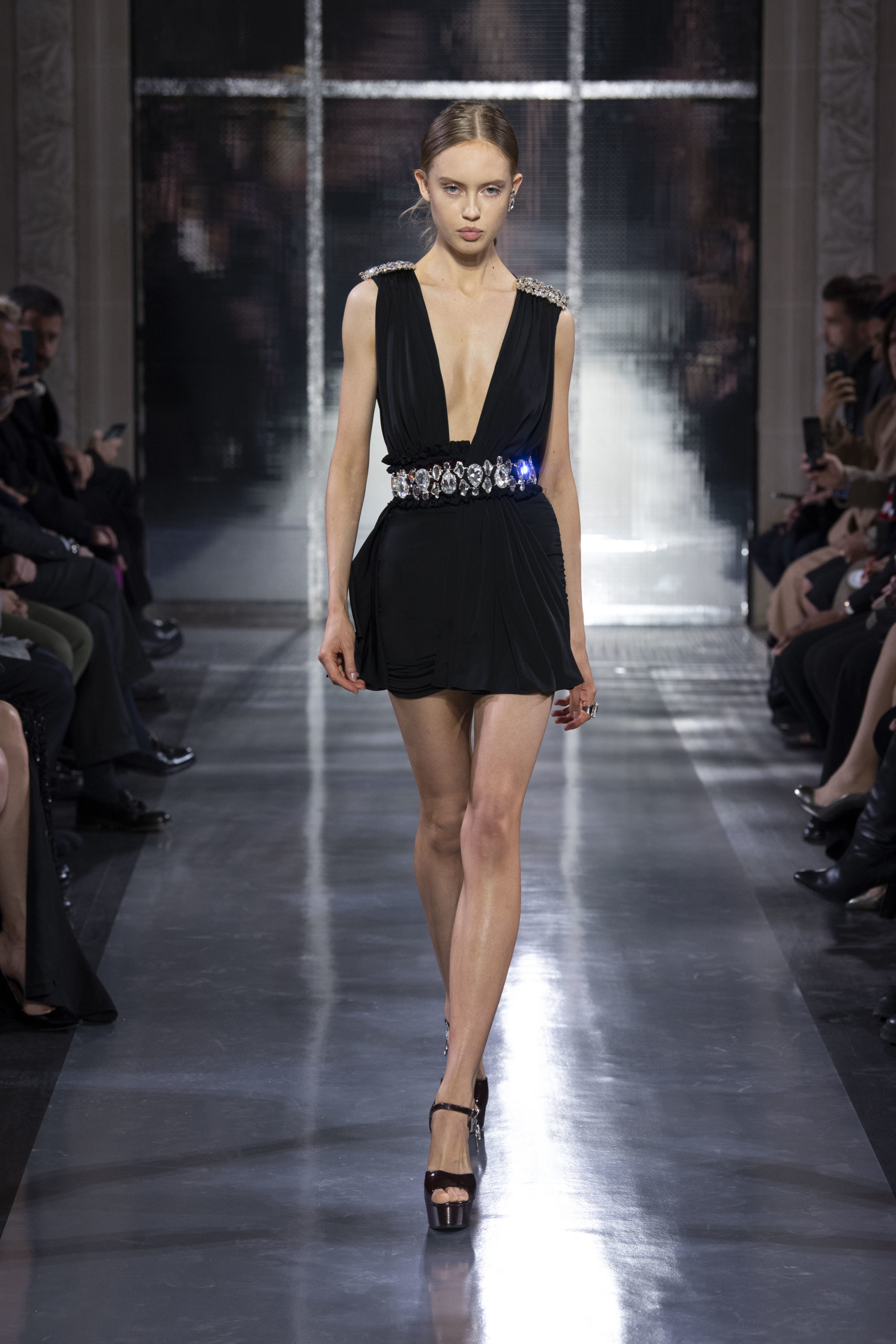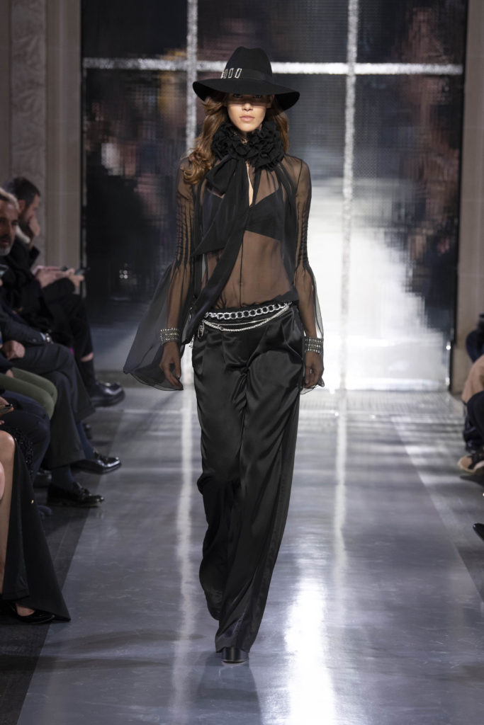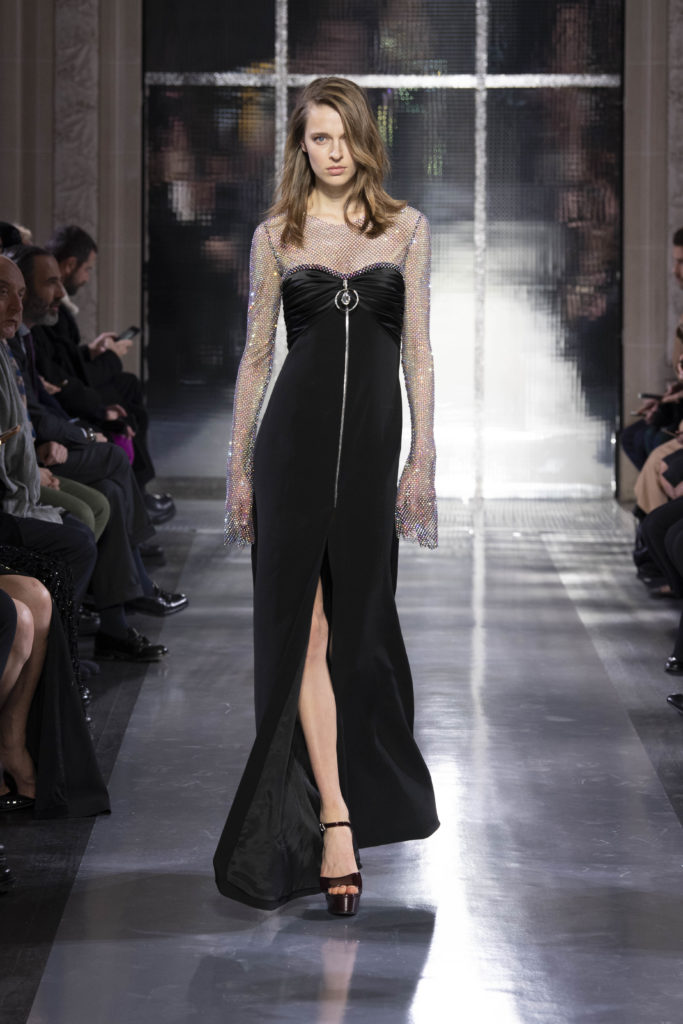 The flamboyant sensuousness of the Azzaro female has stood the test of time, and this season the Brand celebrates the woman of this new world: a liberated, assertive epicurean Amazon who draws strength on her uniqueness. Wreathed in mystery, the designs cultivate a retro-futurist aesthetic where structure and movement are used to delineate plays on light and shadow, opacity and transparency, matte and shine. Combining the Brand’s festive, sensuous Couture references with a one-of-a-kind universe straight out of another constellation, the collection explores a fleshy, graphic futurist flora with generous volumes and the illusion of simplicity. The tailoring is relentless, the waistline high and nipped-in, the V-necks open and assertive, the sleeves low-cut. The sleeves offer a number of effects: here balloon-shaped to accentuate the build, there a more fluid pagoda shape to cover the hands or reveal the shoulders. Feminine in its essence, the dress remains the key piece of this collection. Long or extra-short, the dress is adorned with ruching, draping or sunray pleats, with cut-outs that subtly reveal the body’s curves, made more exquisite there with a zip and a constellation of beads and crystals. This elegance also appears in the design of trousers, of which the legs are adorned with a succession of flounces or straight-cut black satin enhanced with pleats; or in the jewellery pieces, featuring irregular crystal stones. The opacity of a long double-breasted coat in wool broadcloth and silky eco-fur interacts with the daintiness of diaphanous chiffon, mesh embroidered with crystals or aluminium-laminated leather. In the image of otherworldly foliage, fine embroidery – in metal beads, crystalline stones or sequins – is irregularly sprinkled across the designs, providing a precious sparkle that enhances the shine of a leather-effect laminate, crepe, satin or jersey, one of the emblematic materials of the Azzaro brand. This light, captured by the omnipresence of gold and silver, is enhanced by the depth of the black and punctuated with flamboyant colours such as crimson, purple and cobalt yellow. The men’s wardrobe, driven by the same inspiration, echoes this new world with its flawless cuts brightened by incandescent lurex, straps embroidered with imaginary marine flora in beads and metal, celestial fringed embroideries, or jacquard featuring abstract patterns inspired by the moon’s relief, entirely embroidered with charcoal grey stones. This collection travels between the past and the future in a new world where the attitude is liberated and the sophistication iconoclastic.