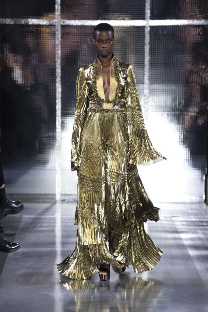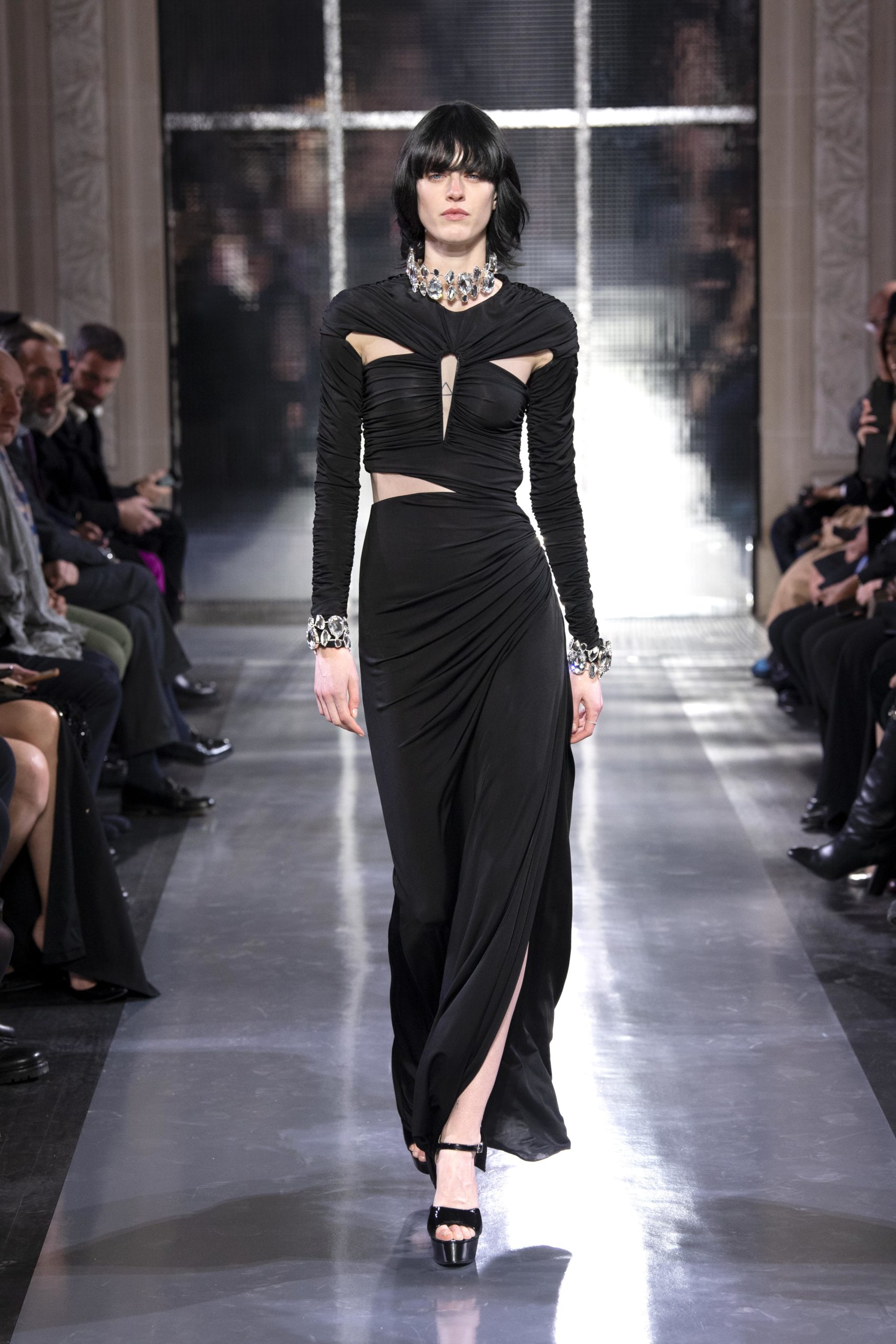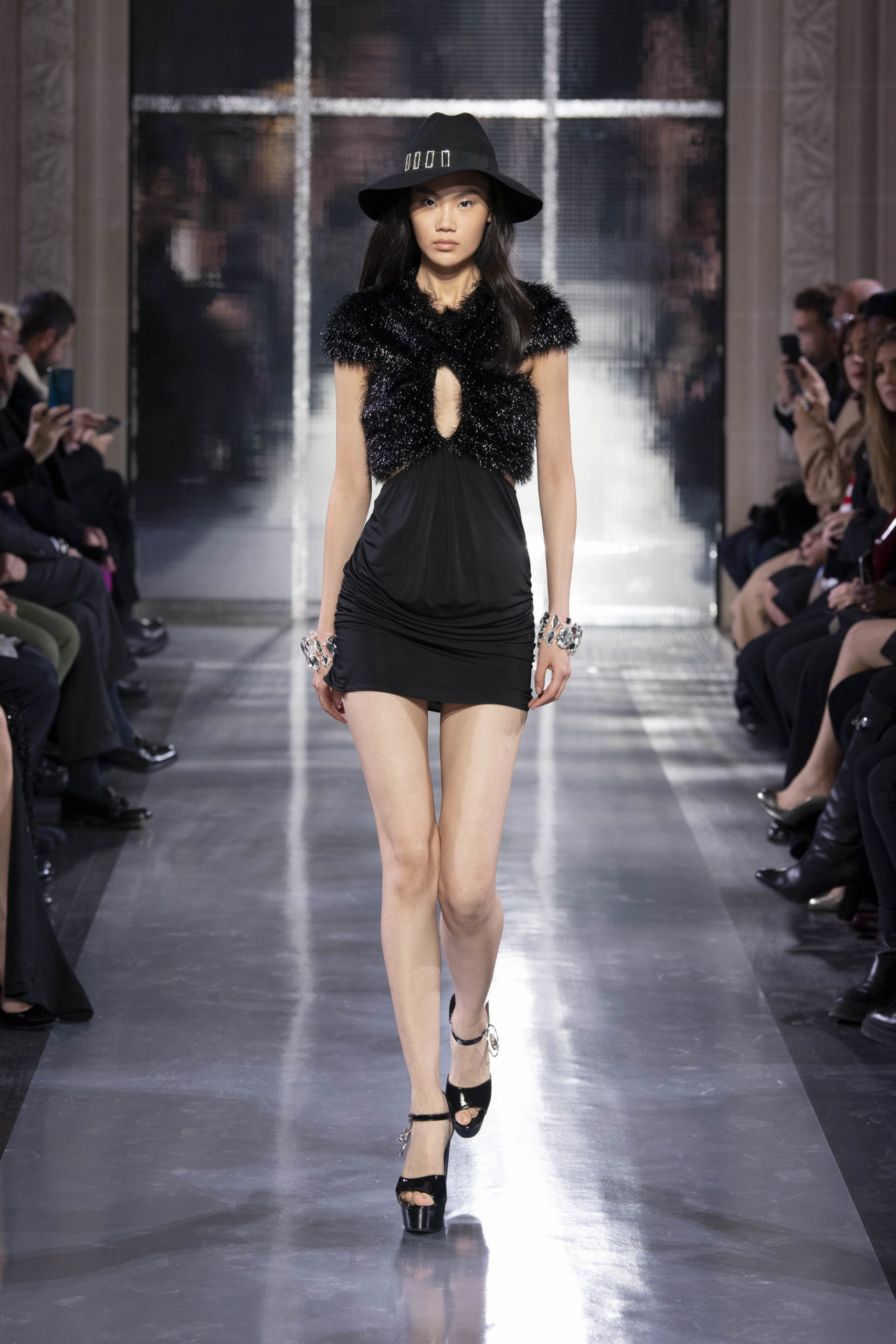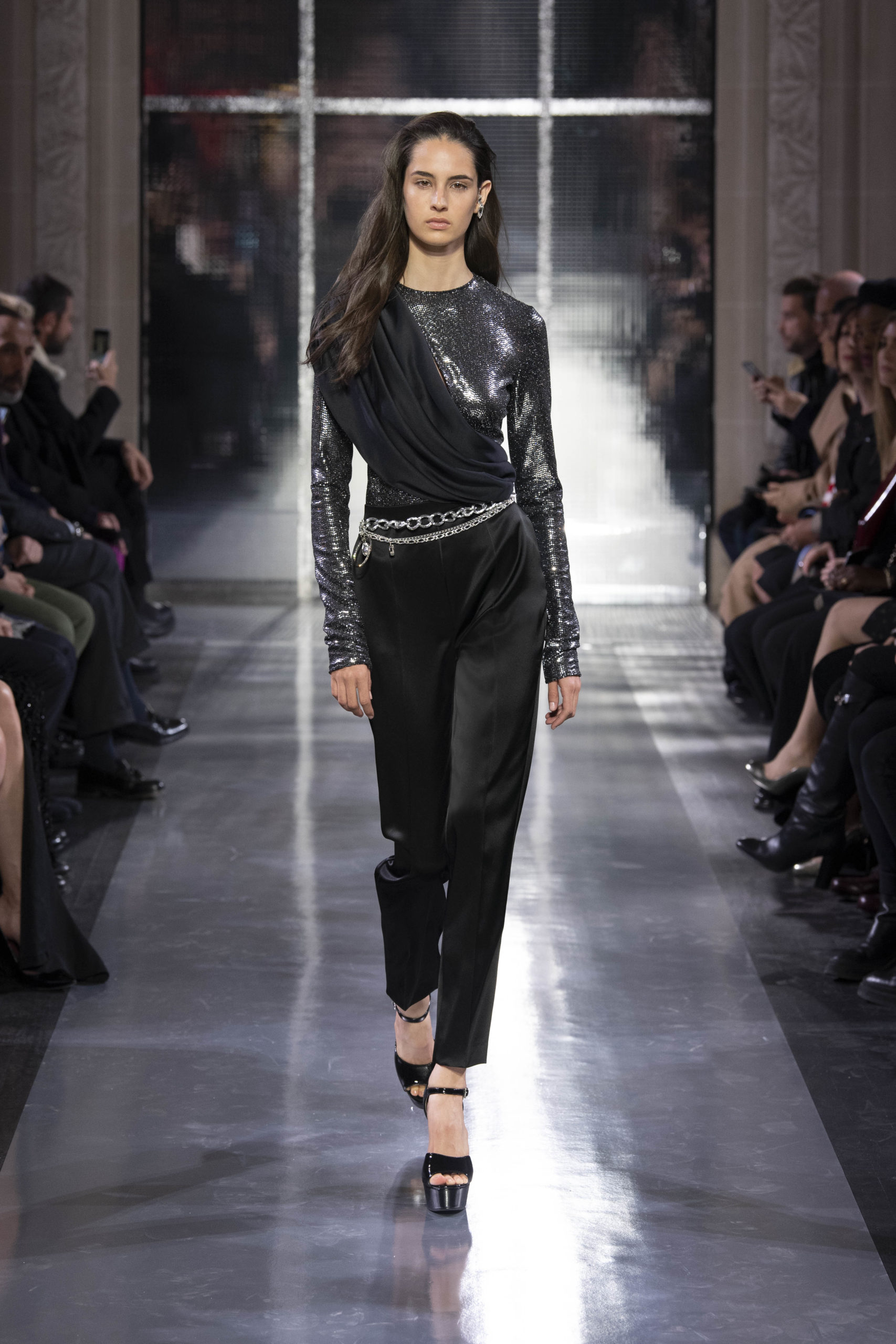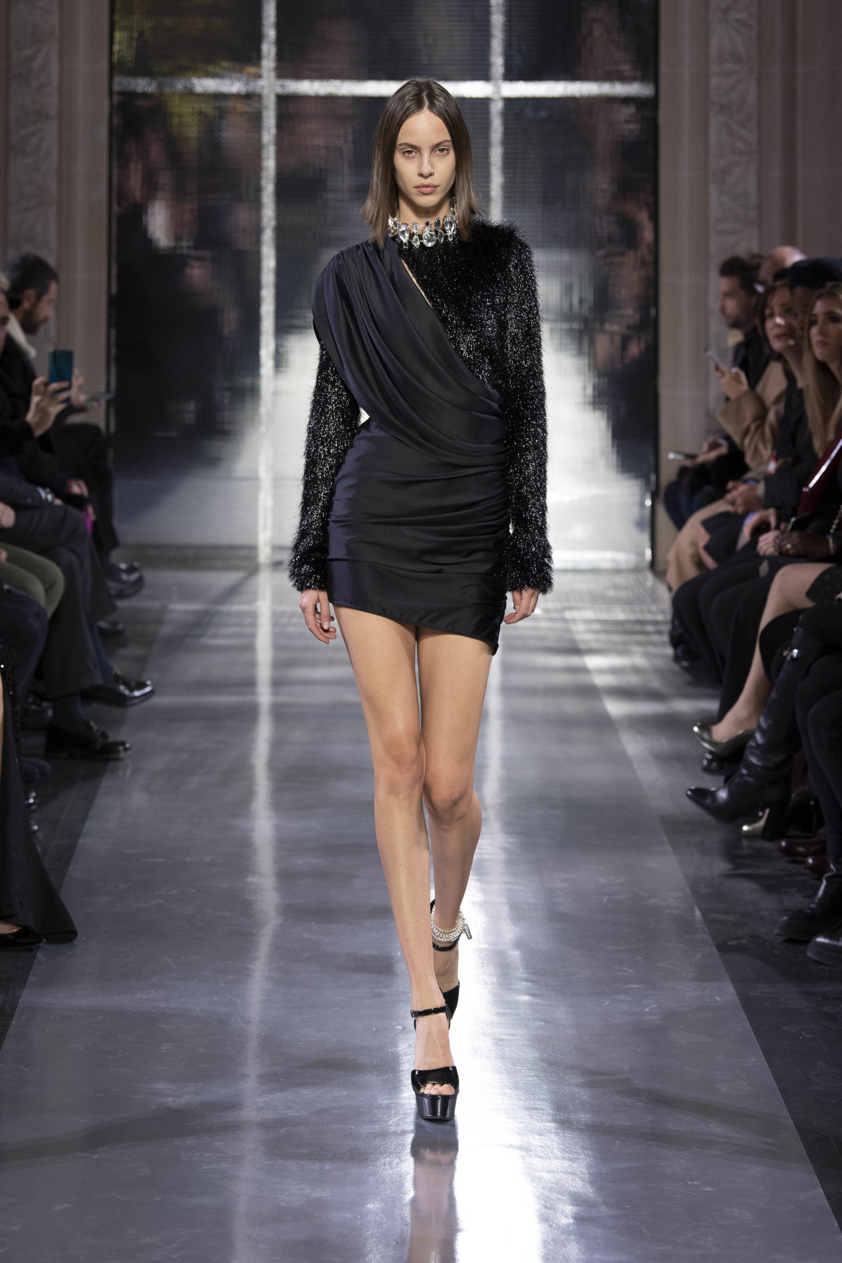 The flamboyant sensuousness of the Azzaro female has stood the test of time, and this season the Brand celebrates the woman of this new world: a liberated, assertive epicurean Amazon who draws strength on her uniqueness. Wreathed in mystery, the designs cultivate a retro-futurist aesthetic where structure and movement are used to delineate plays on light and shadow, opacity and transparency, matte and shine. Combining the Brand’s festive, sensuous Couture references with a one-of-a-kind universe straight out of another constellation, the collection explores a fleshy, graphic futurist flora with generous volumes and the illusion of simplicity. The tailoring is relentless, the waistline high and nipped-in, the V-necks open and assertive, the sleeves low-cut. The sleeves offer a number of effects: here balloon-shaped to accentuate the build, there a more fluid pagoda shape to cover the hands or reveal the shoulders. Feminine in its essence, the dress remains the key piece of this collection. Long or extra-short, the dress is adorned with ruching, draping or sunray pleats, with cut-outs that subtly reveal the body’s curves, made more exquisite there with a zip and a constellation of beads and crystals. This elegance also appears in the design of trousers, of which the legs are adorned with a succession of flounces or straight-cut black satin enhanced with pleats; or in the jewellery pieces, featuring irregular crystal stones. The opacity of a long double-breasted coat in wool broadcloth and silky eco-fur interacts with the daintiness of diaphanous chiffon, mesh embroidered with crystals or aluminium-laminated leather. In the image of otherworldly foliage, fine embroidery – in metal beads, crystalline stones or sequins – is irregularly sprinkled across the designs, providing a precious sparkle that enhances the shine of a leather-effect laminate, crepe, satin or jersey, one of the emblematic materials of the Azzaro brand. This light, captured by the omnipresence of gold and silver, is enhanced by the depth of the black and punctuated with flamboyant colours such as crimson, purple and cobalt yellow. The men’s wardrobe, driven by the same inspiration, echoes this new world with its flawless cuts brightened by incandescent lurex, straps embroidered with imaginary marine flora in beads and metal, celestial fringed embroideries, or jacquard featuring abstract patterns inspired by the moon’s relief, entirely embroidered with charcoal grey stones. This collection travels between the past and the future in a new world where the attitude is liberated and the sophistication iconoclastic.