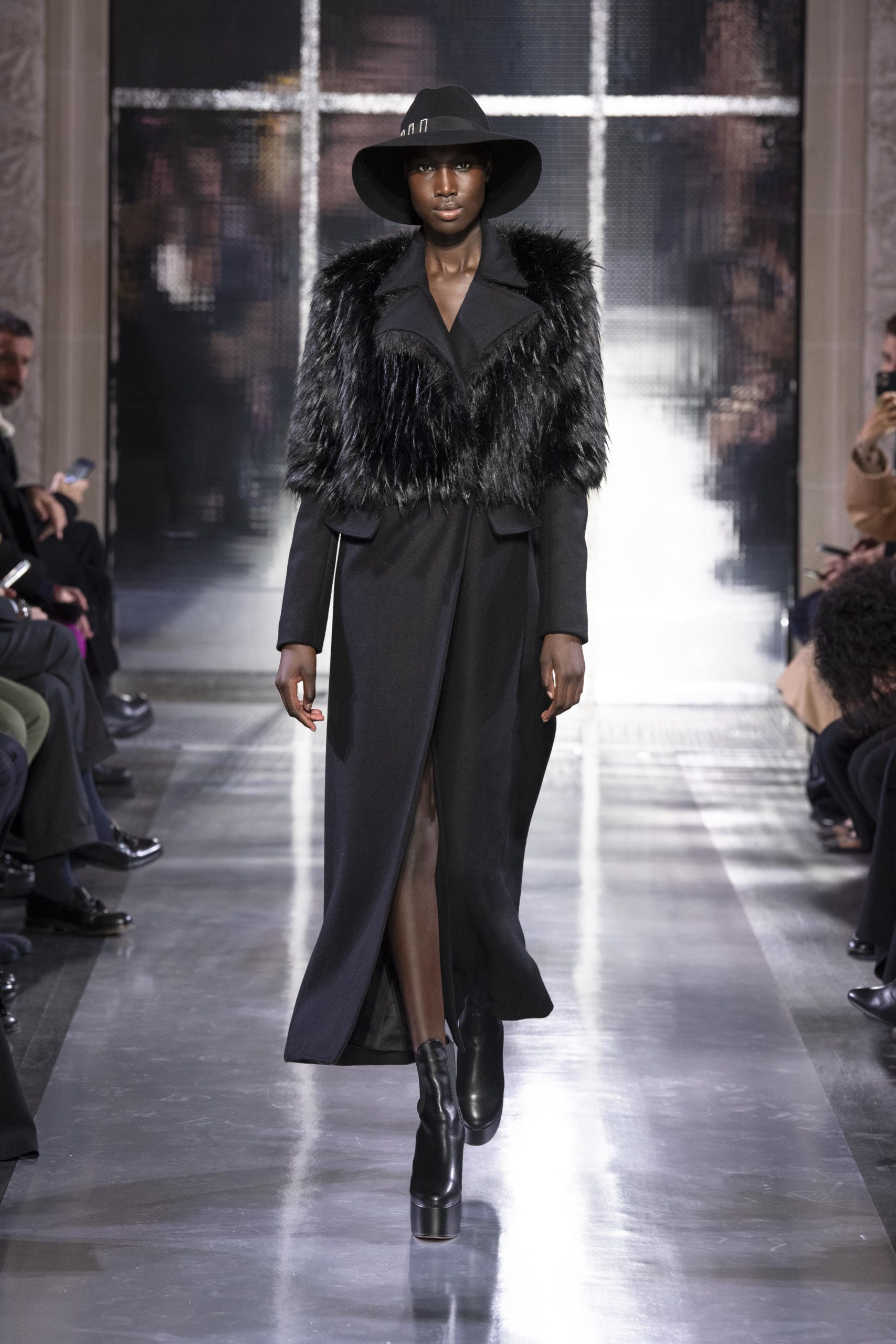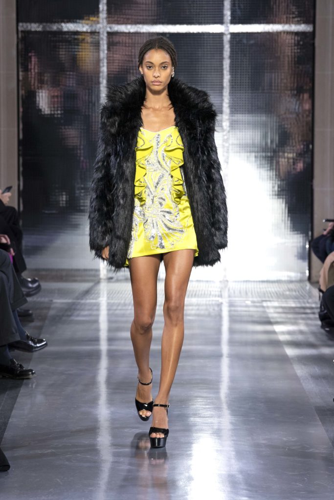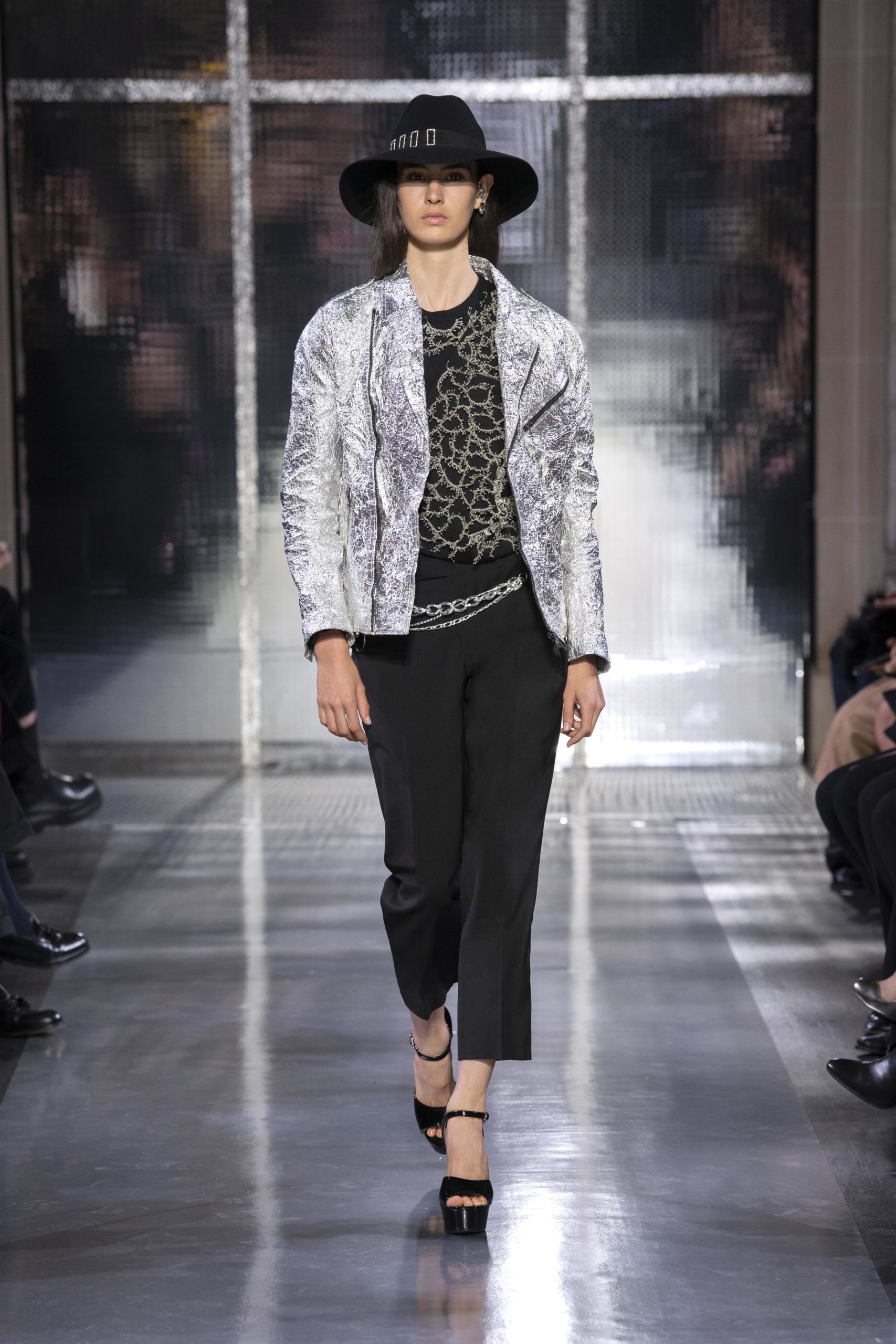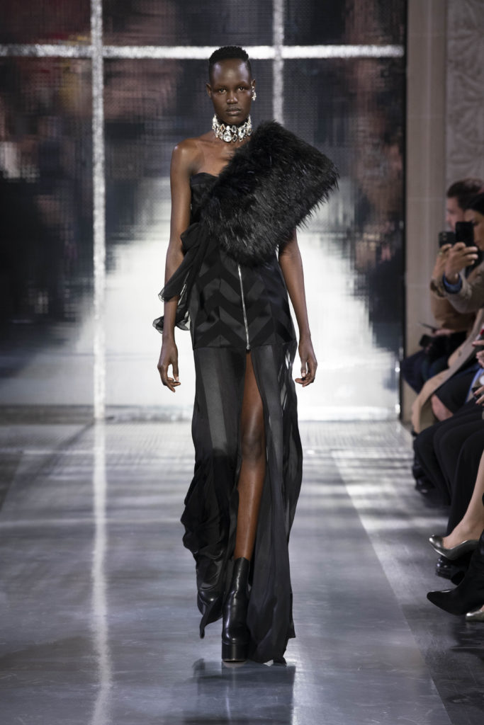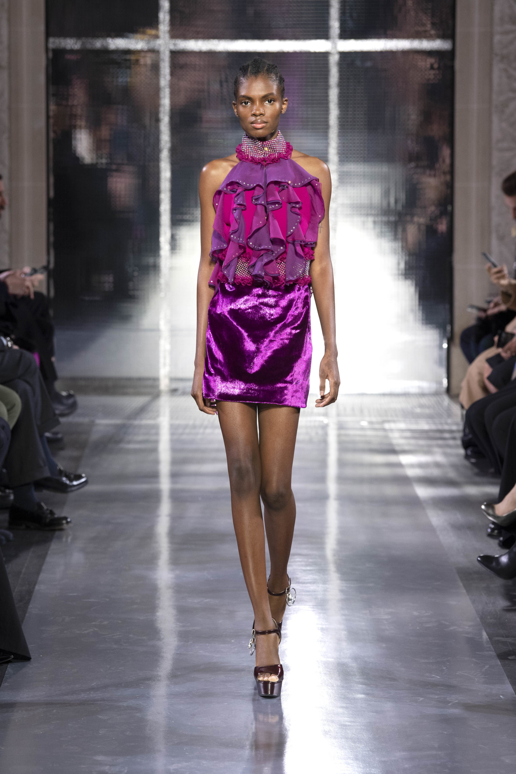 The flamboyant sensuousness of the Azzaro female has stood the test of time, and this season the Brand celebrates the woman of this new world: a liberated, assertive epicurean Amazon who draws strength on her uniqueness. Wreathed in mystery, the designs cultivate a retro-futurist aesthetic where structure and movement are used to delineate plays on light and shadow, opacity and transparency, matte and shine. Combining the Brand’s festive, sensuous Couture references with a one-of-a-kind universe straight out of another constellation, the collection explores a fleshy, graphic futurist flora with generous volumes and the illusion of simplicity. The tailoring is relentless, the waistline high and nipped-in, the V-necks open and assertive, the sleeves low-cut. The sleeves offer a number of effects: here balloon-shaped to accentuate the build, there a more fluid pagoda shape to cover the hands or reveal the shoulders. Feminine in its essence, the dress remains the key piece of this collection. Long or extra-short, the dress is adorned with ruching, draping or sunray pleats, with cut-outs that subtly reveal the body’s curves, made more exquisite there with a zip and a constellation of beads and crystals. This elegance also appears in the design of trousers, of which the legs are adorned with a succession of flounces or straight-cut black satin enhanced with pleats; or in the jewellery pieces, featuring irregular crystal stones. The opacity of a long double-breasted coat in wool broadcloth and silky eco-fur interacts with the daintiness of diaphanous chiffon, mesh embroidered with crystals or aluminium-laminated leather. In the image of otherworldly foliage, fine embroidery – in metal beads, crystalline stones or sequins – is irregularly sprinkled across the designs, providing a precious sparkle that enhances the shine of a leather-effect laminate, crepe, satin or jersey, one of the emblematic materials of the Azzaro brand. This light, captured by the omnipresence of gold and silver, is enhanced by the depth of the black and punctuated with flamboyant colours such as crimson, purple and cobalt yellow. The men’s wardrobe, driven by the same inspiration, echoes this new world with its flawless cuts brightened by incandescent lurex, straps embroidered with imaginary marine flora in beads and metal, celestial fringed embroideries, or jacquard featuring abstract patterns inspired by the moon’s relief, entirely embroidered with charcoal grey stones. This collection travels between the past and the future in a new world where the attitude is liberated and the sophistication iconoclastic.