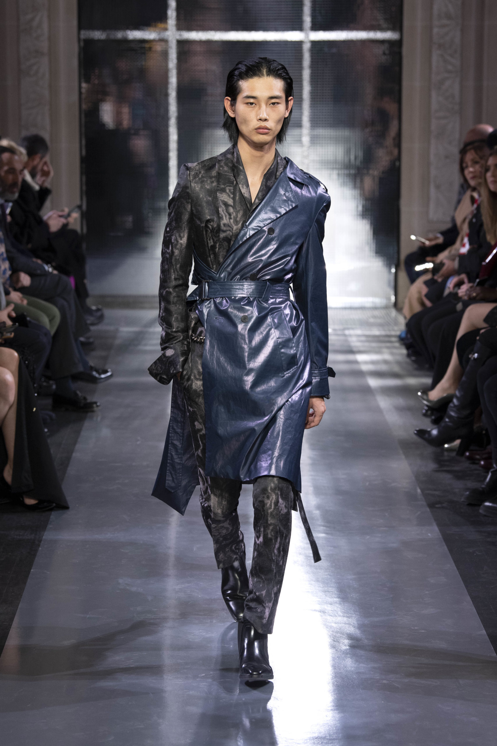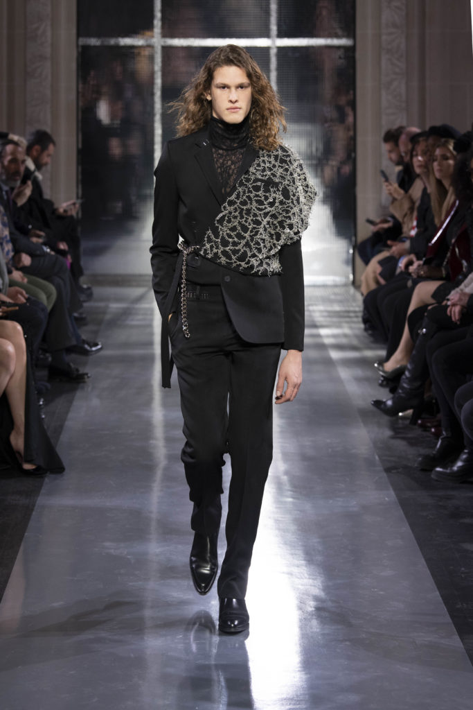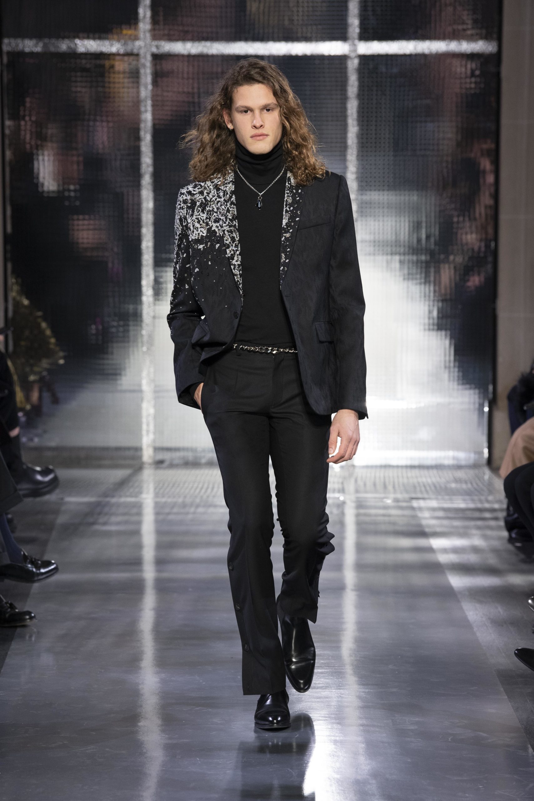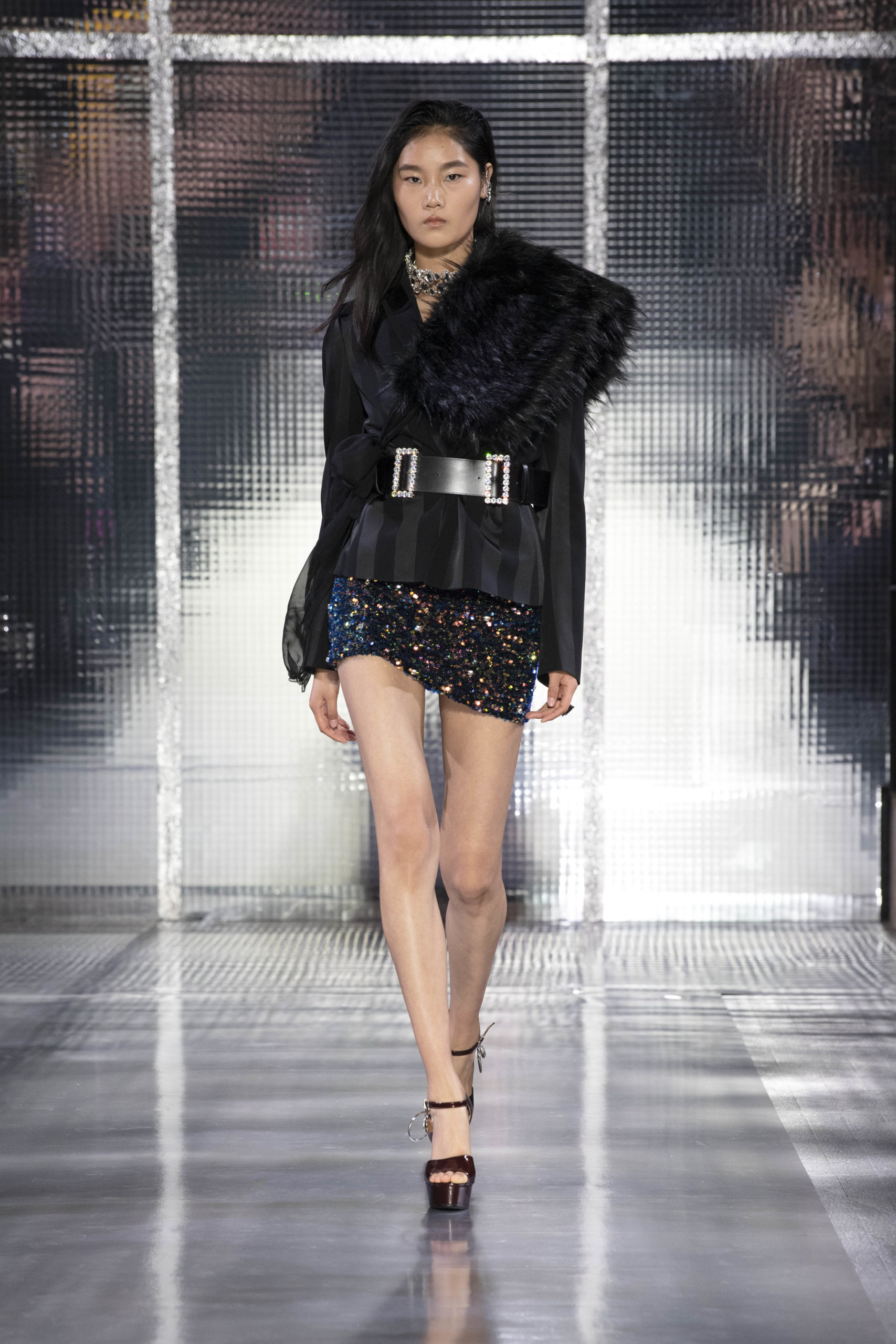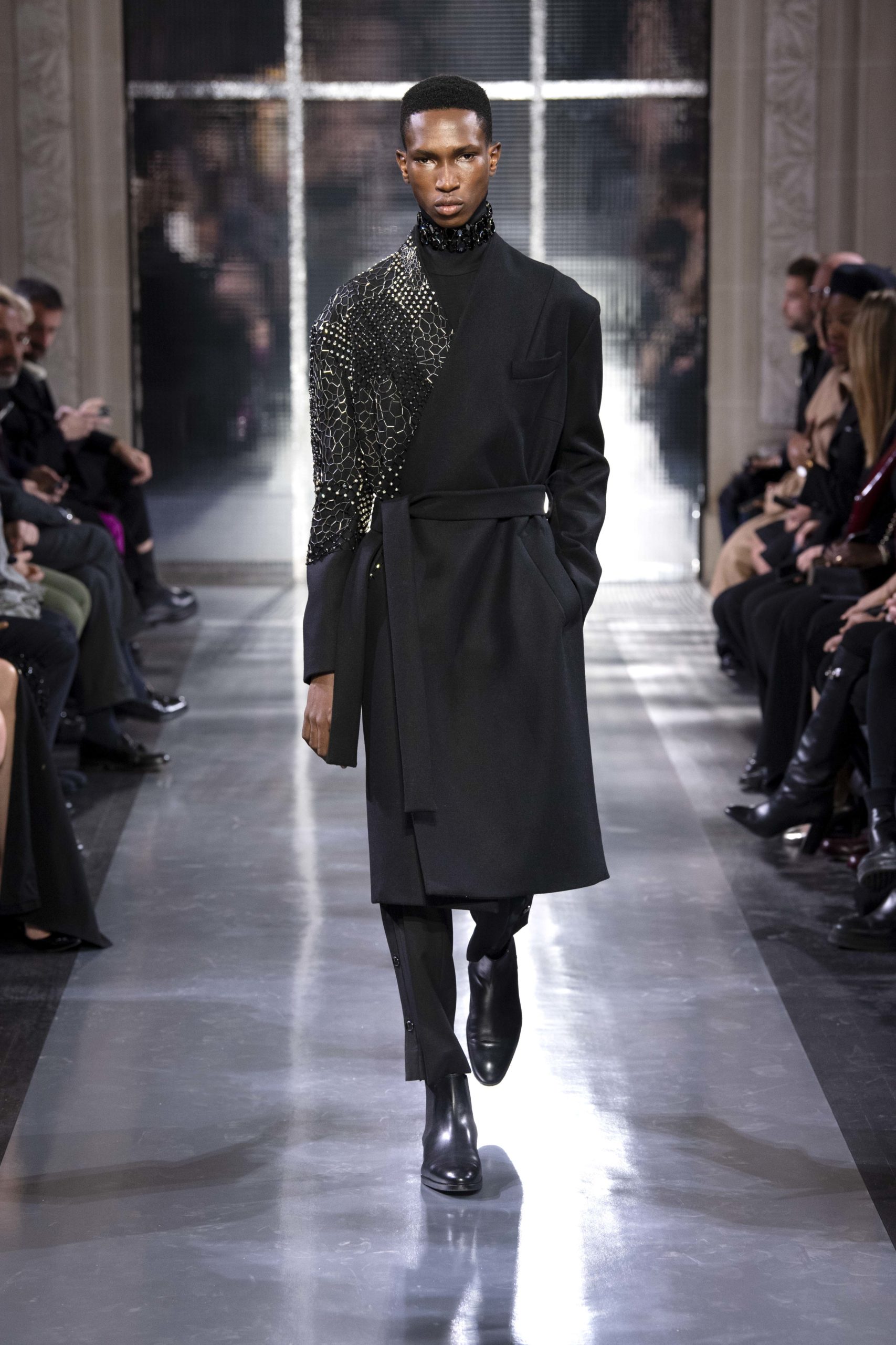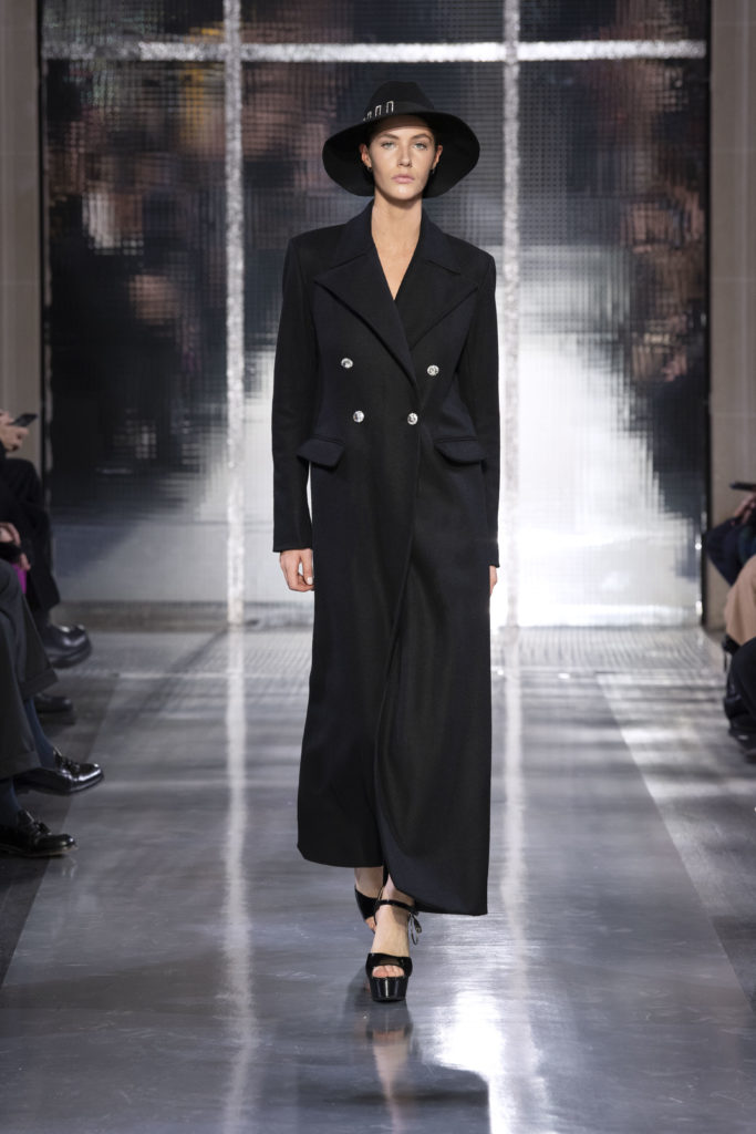 The flamboyant sensuousness of the Azzaro female has stood the test of time, and this season the Brand celebrates the woman of this new world: a liberated, assertive epicurean Amazon who draws strength on her uniqueness. Wreathed in mystery, the designs cultivate a retro-futurist aesthetic where structure and movement are used to delineate plays on light and shadow, opacity and transparency, matte and shine. Combining the Brand’s festive, sensuous Couture references with a one-of-a-kind universe straight out of another constellation, the collection explores a fleshy, graphic futurist flora with generous volumes and the illusion of simplicity. The tailoring is relentless, the waistline high and nipped-in, the V-necks open and assertive, the sleeves low-cut. The sleeves offer a number of effects: here balloon-shaped to accentuate the build, there a more fluid pagoda shape to cover the hands or reveal the shoulders. Feminine in its essence, the dress remains the key piece of this collection. Long or extra-short, the dress is adorned with ruching, draping or sunray pleats, with cut-outs that subtly reveal the body’s curves, made more exquisite there with a zip and a constellation of beads and crystals. This elegance also appears in the design of trousers, of which the legs are adorned with a succession of flounces or straight-cut black satin enhanced with pleats; or in the jewellery pieces, featuring irregular crystal stones. The opacity of a long double-breasted coat in wool broadcloth and silky eco-fur interacts with the daintiness of diaphanous chiffon, mesh embroidered with crystals or aluminium-laminated leather. In the image of otherworldly foliage, fine embroidery – in metal beads, crystalline stones or sequins – is irregularly sprinkled across the designs, providing a precious sparkle that enhances the shine of a leather-effect laminate, crepe, satin or jersey, one of the emblematic materials of the Azzaro brand. This light, captured by the omnipresence of gold and silver, is enhanced by the depth of the black and punctuated with flamboyant colours such as crimson, purple and cobalt yellow. The men’s wardrobe, driven by the same inspiration, echoes this new world with its flawless cuts brightened by incandescent lurex, straps embroidered with imaginary marine flora in beads and metal, celestial fringed embroideries, or jacquard featuring abstract patterns inspired by the moon’s relief, entirely embroidered with charcoal grey stones. This collection travels between the past and the future in a new world where the attitude is liberated and the sophistication iconoclastic.