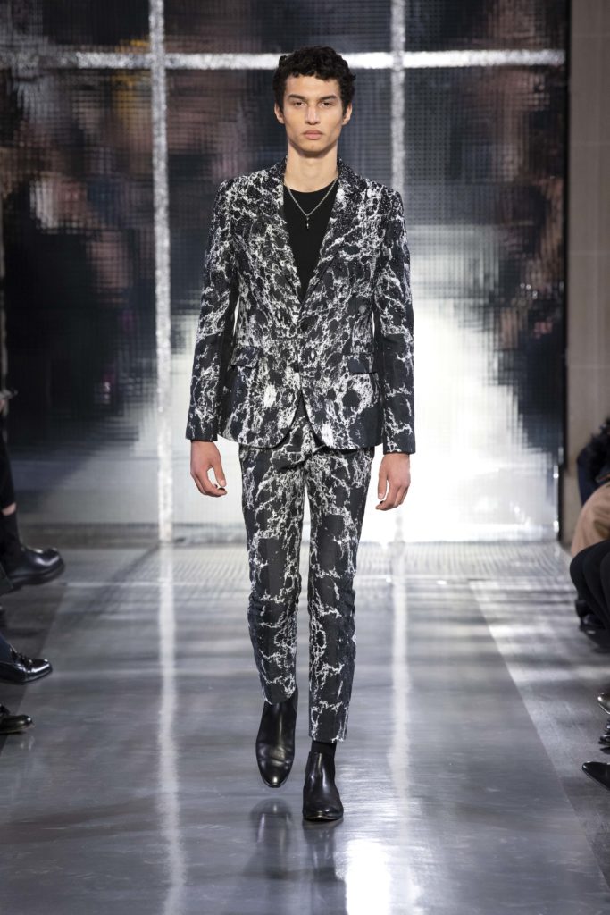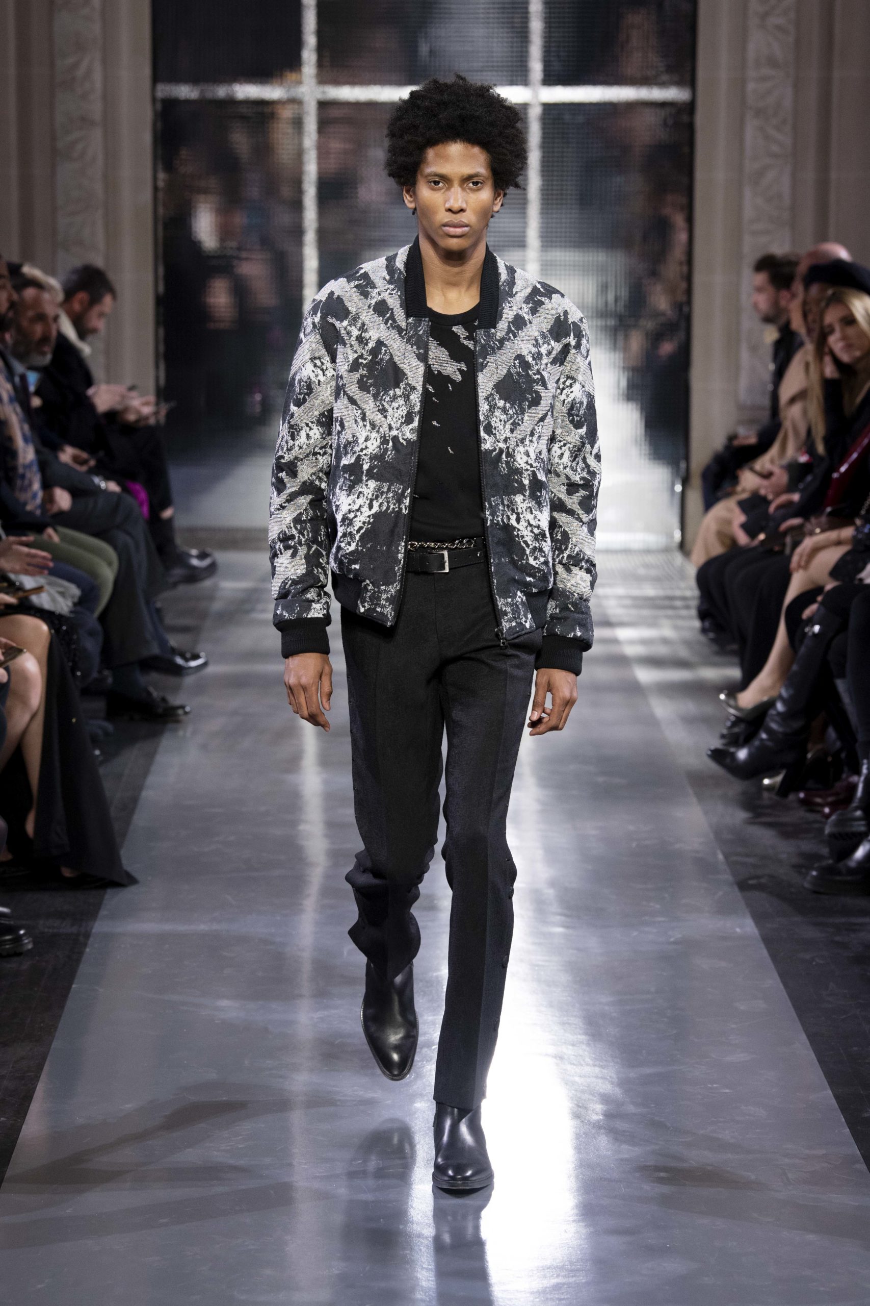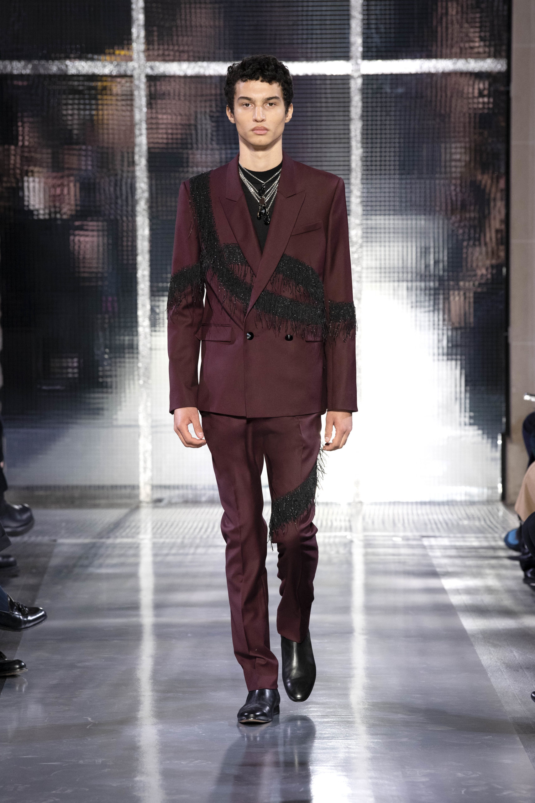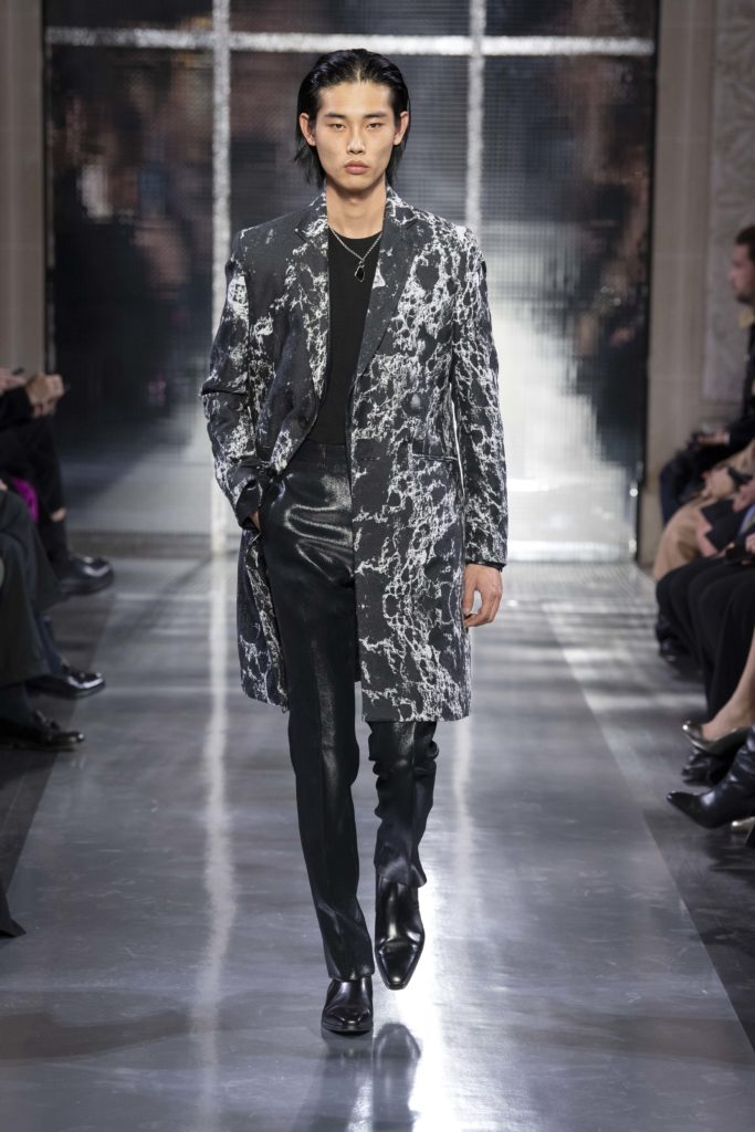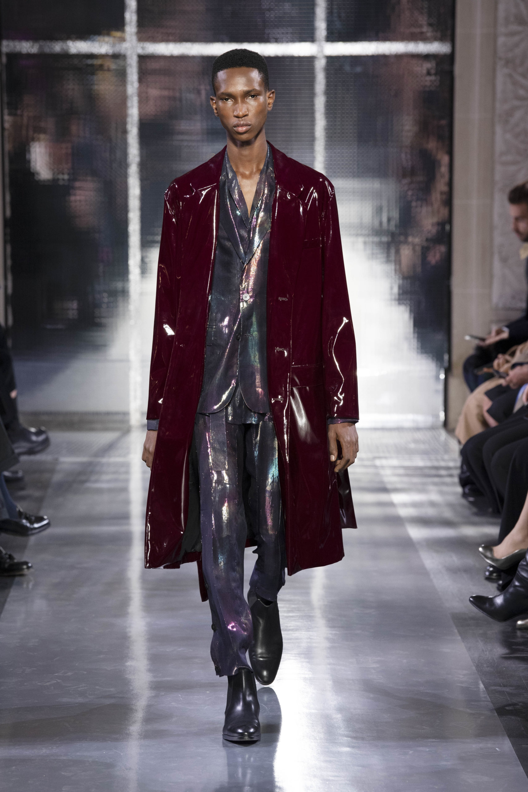 The flamboyant sensuousness of the Azzaro female has stood the test of time, and this season the Brand celebrates the woman of this new world: a liberated, assertive epicurean Amazon who draws strength on her uniqueness. Wreathed in mystery, the designs cultivate a retro-futurist aesthetic where structure and movement are used to delineate plays on light and shadow, opacity and transparency, matte and shine. Combining the Brand’s festive, sensuous Couture references with a one-of-a-kind universe straight out of another constellation, the collection explores a fleshy, graphic futurist flora with generous volumes and the illusion of simplicity. The tailoring is relentless, the waistline high and nipped-in, the V-necks open and assertive, the sleeves low-cut. The sleeves offer a number of effects: here balloon-shaped to accentuate the build, there a more fluid pagoda shape to cover the hands or reveal the shoulders. Feminine in its essence, the dress remains the key piece of this collection. Long or extra-short, the dress is adorned with ruching, draping or sunray pleats, with cut-outs that subtly reveal the body’s curves, made more exquisite there with a zip and a constellation of beads and crystals. This elegance also appears in the design of trousers, of which the legs are adorned with a succession of flounces or straight-cut black satin enhanced with pleats; or in the jewellery pieces, featuring irregular crystal stones. The opacity of a long double-breasted coat in wool broadcloth and silky eco-fur interacts with the daintiness of diaphanous chiffon, mesh embroidered with crystals or aluminium-laminated leather. In the image of otherworldly foliage, fine embroidery – in metal beads, crystalline stones or sequins – is irregularly sprinkled across the designs, providing a precious sparkle that enhances the shine of a leather-effect laminate, crepe, satin or jersey, one of the emblematic materials of the Azzaro brand. This light, captured by the omnipresence of gold and silver, is enhanced by the depth of the black and punctuated with flamboyant colours such as crimson, purple and cobalt yellow. The men’s wardrobe, driven by the same inspiration, echoes this new world with its flawless cuts brightened by incandescent lurex, straps embroidered with imaginary marine flora in beads and metal, celestial fringed embroideries, or jacquard featuring abstract patterns inspired by the moon’s relief, entirely embroidered with charcoal grey stones. This collection travels between the past and the future in a new world where the attitude is liberated and the sophistication iconoclastic.