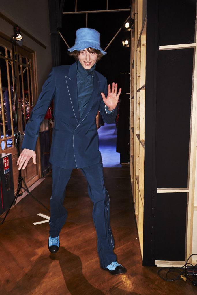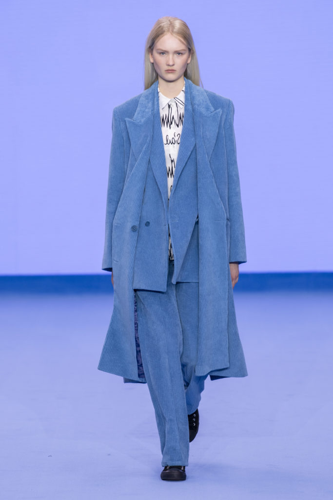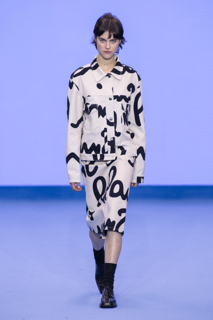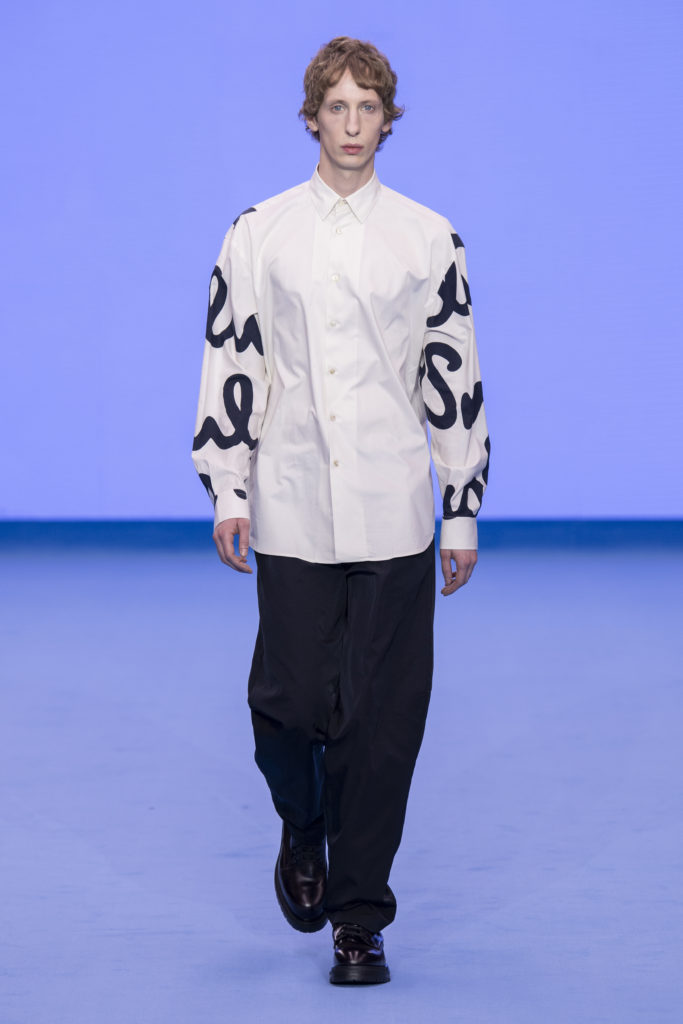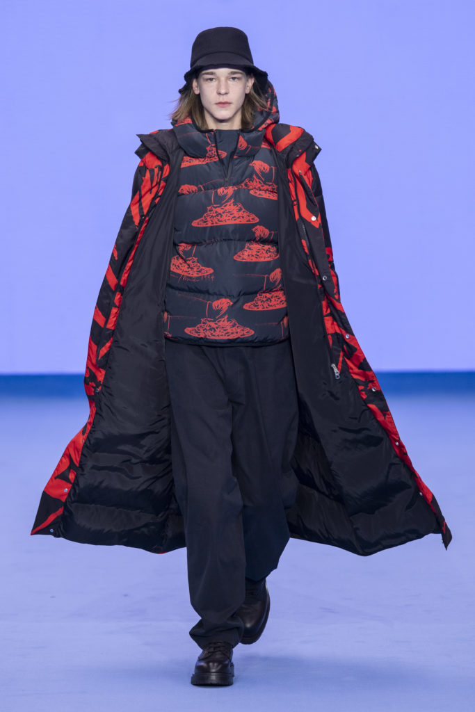 Natural tones fill the colour palette; teal, terracotta and clay all compliment a bright shade of sky blue that dominates the collection bringing some much-needed positivity. Archival prints are refreshed. On an early trip to Tokyo, a wax plate of spaghetti from a fake food shop found its way into a photographic print on ready-to-wear. The spaghetti print is revisited for Autumn/Winter ’20, scaled-up, reworked and woven in textural wool jumpers and printed on floor-length down-filled jackets. A fax print from a previous collection that was inspired by the faulty printing of a warped Paul Smith signature, has new-found irreverence in 2020 with the ever-growing prominence of logomania.