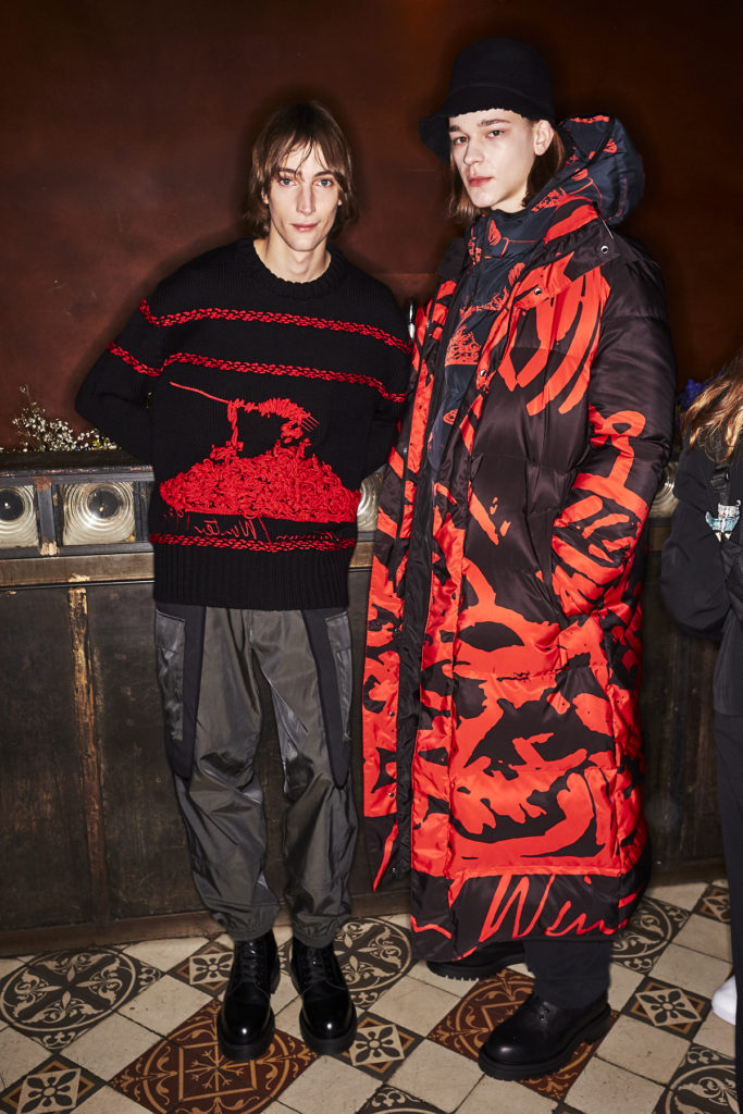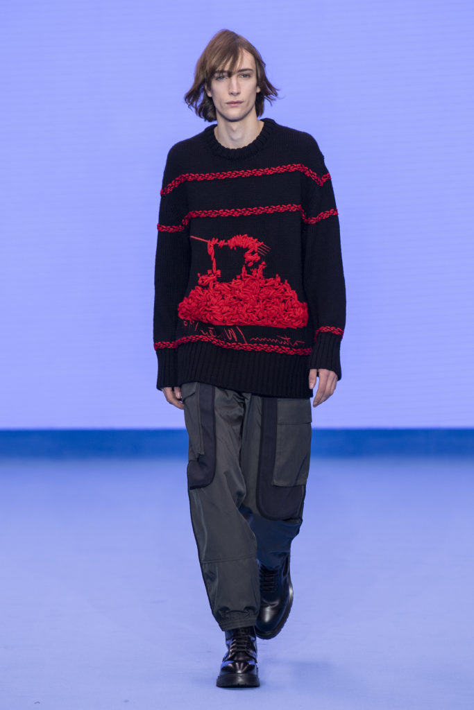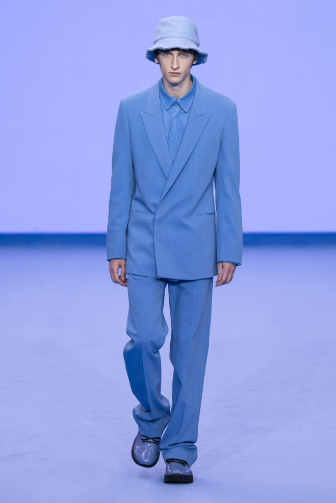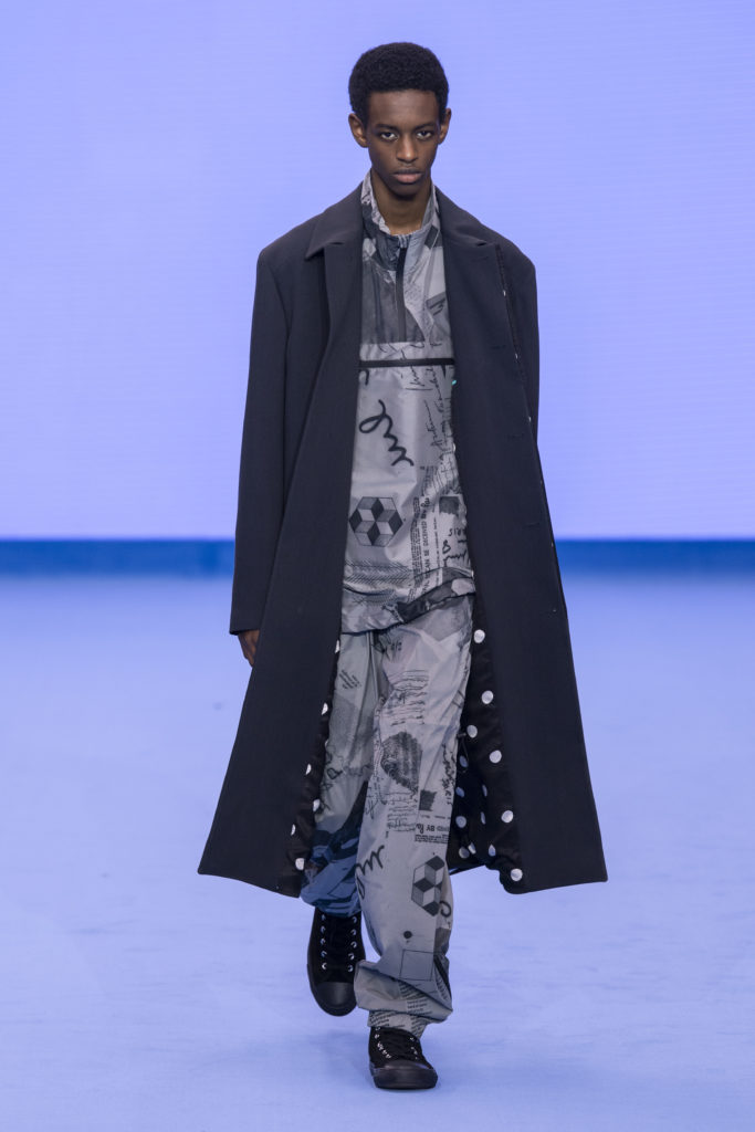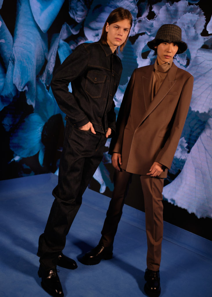 Natural tones fill the colour palette; teal, terracotta and clay all compliment a bright shade of sky blue that dominates the collection bringing some much-needed positivity. Archival prints are refreshed. On an early trip to Tokyo, a wax plate of spaghetti from a fake food shop found its way into a photographic print on ready-to-wear. The spaghetti print is revisited for Autumn/Winter ’20, scaled-up, reworked and woven in textural wool jumpers and printed on floor-length down-filled jackets. A fax print from a previous collection that was inspired by the faulty printing of a warped Paul Smith signature, has new-found irreverence in 2020 with the ever-growing prominence of logomania.