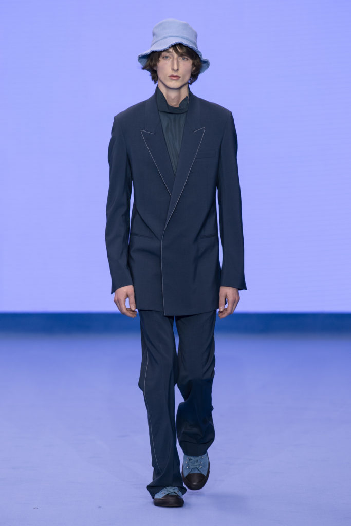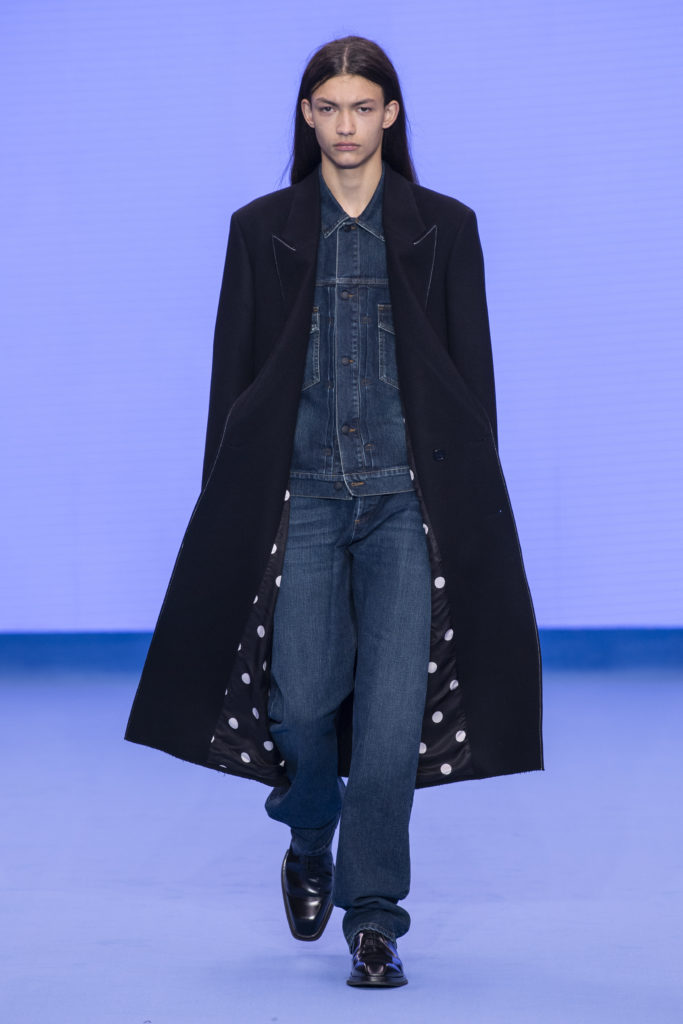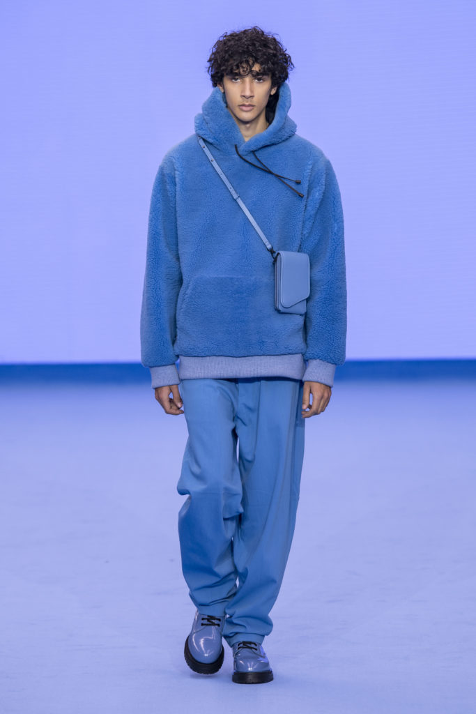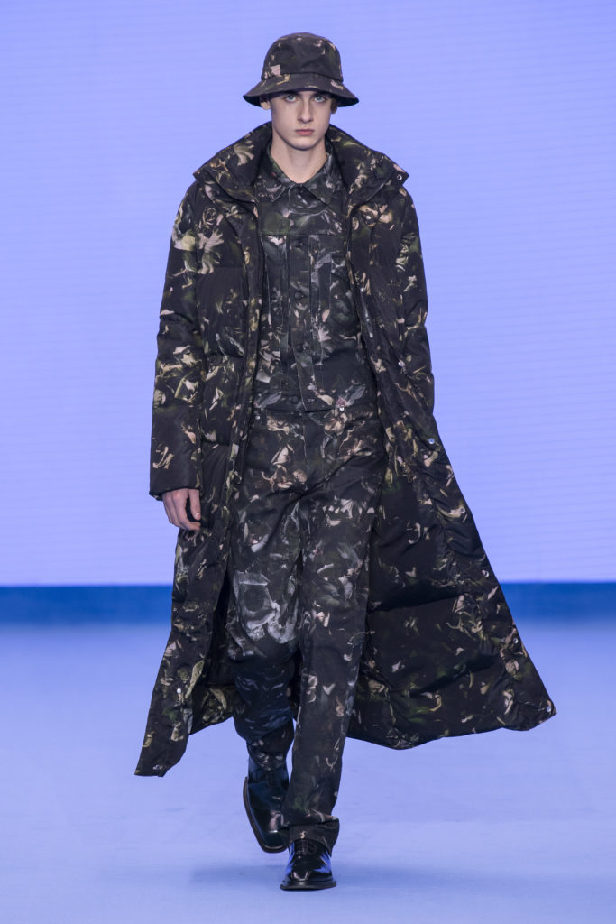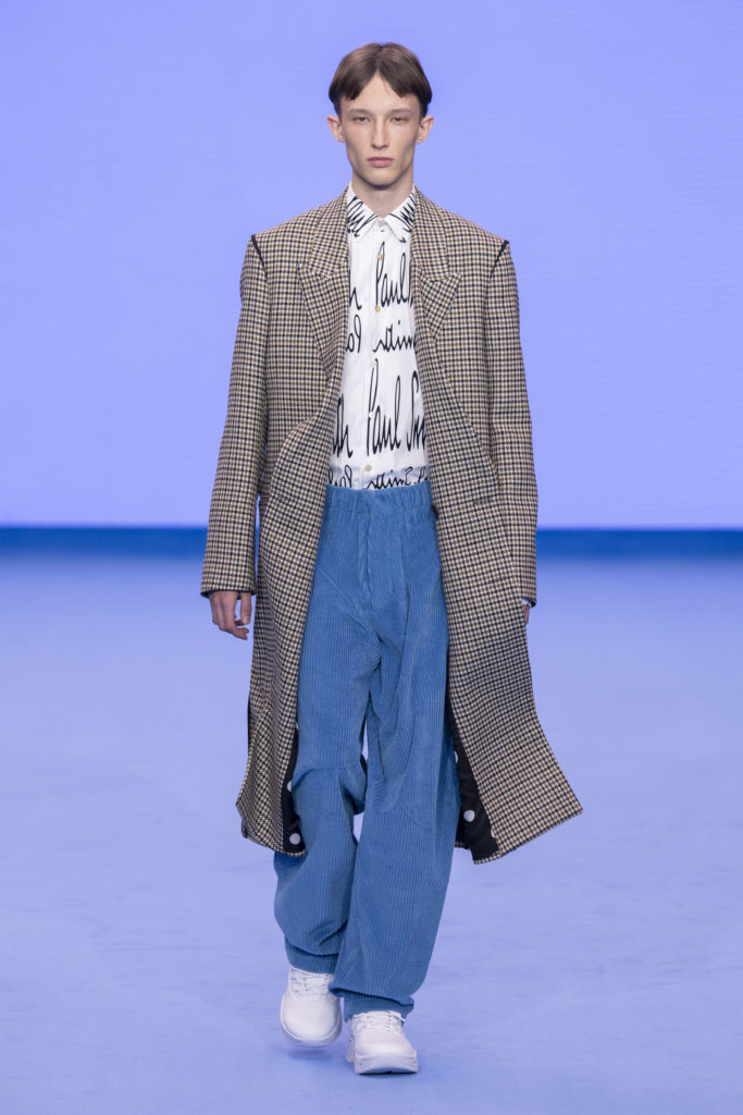 This spirit of reinvention returns when check and houndstooth tailoring is British in its feel but has the fluidity of lightweight Italian cloths. A heavy jumbo corduroy in the predominant sky blue injects cloud-like bounce into the collection and elsewhere proportions are exaggerated in puffer jackets and trainers to create an air of dreamy fantasy. Denim–a regular feature of Paul Smith catwalk collections–appears raw, indigo-washed and overdyed with a floral camouflage. Shearling coats nod to Paul’s dandyish pals wearing their Grandmas’ fur coats in the Seventies.
