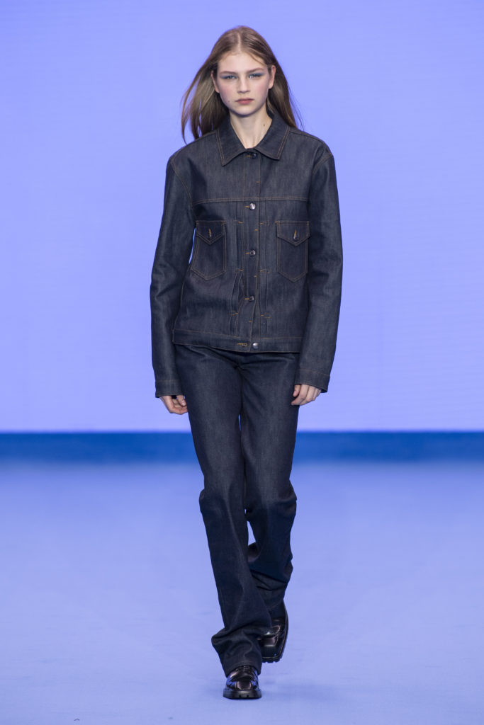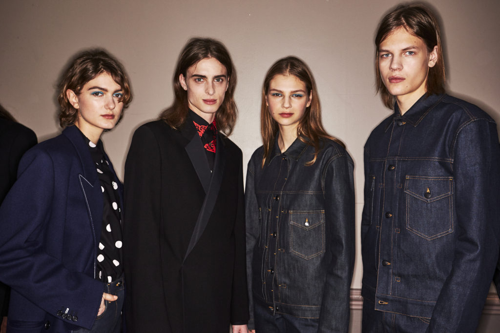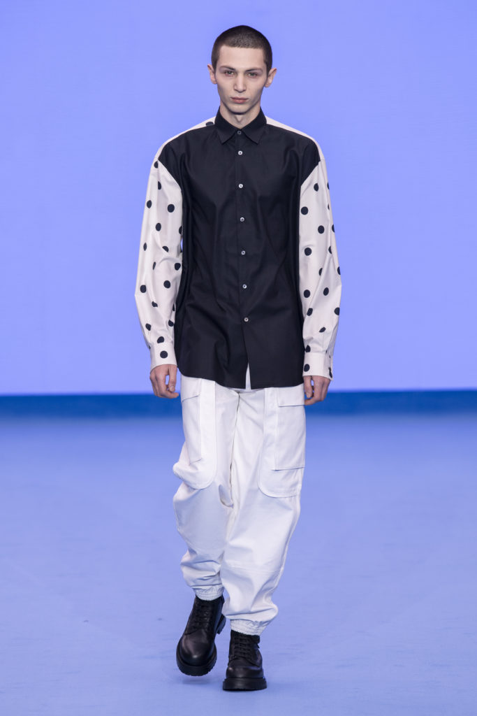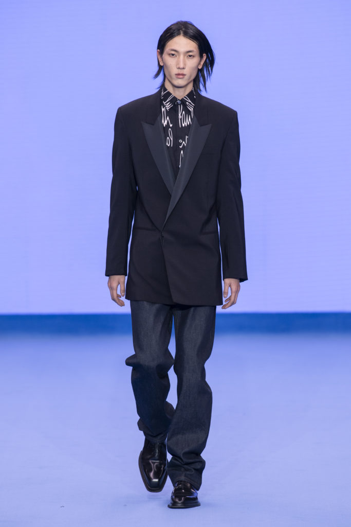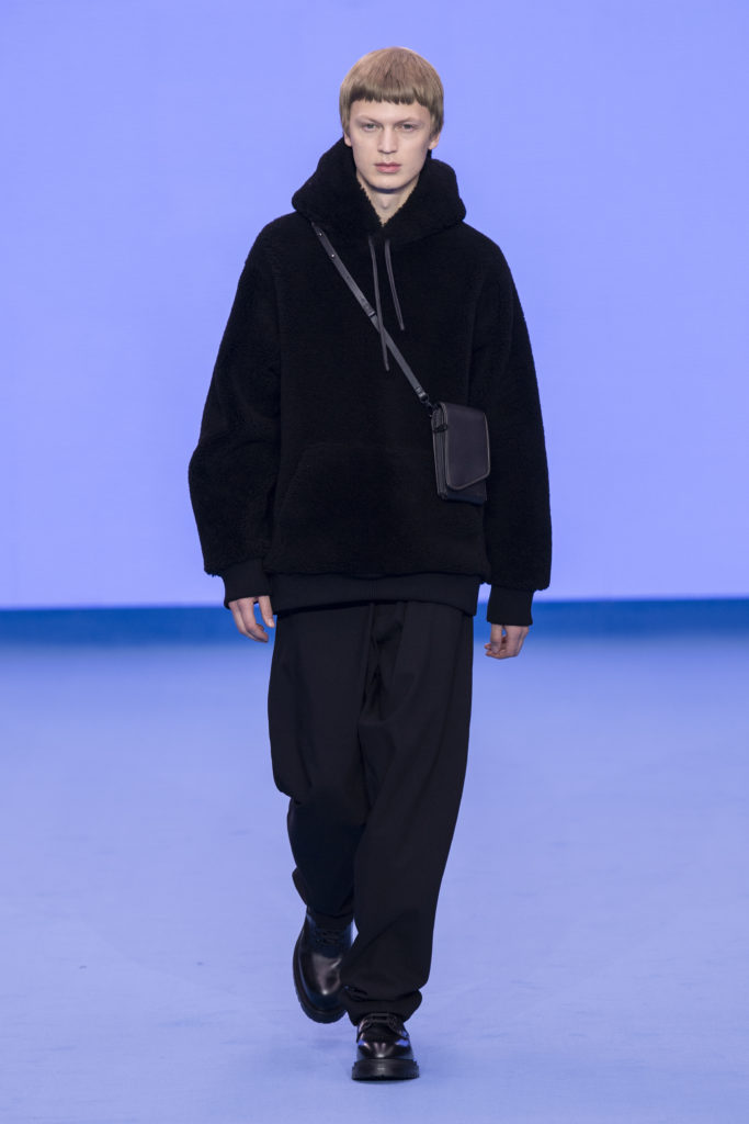 This spirit of reinvention returns when check and houndstooth tailoring is British in its feel but has the fluidity of lightweight Italian cloths. A heavy jumbo corduroy in the predominant sky blue injects cloud-like bounce into the collection and elsewhere proportions are exaggerated in puffer jackets and trainers to create an air of dreamy fantasy. Denim–a regular feature of Paul Smith catwalk collections–appears raw, indigo-washed and overdyed with a floral camouflage. Shearling coats nod to Paul’s dandyish pals wearing their Grandmas’ fur coats in the Seventies.