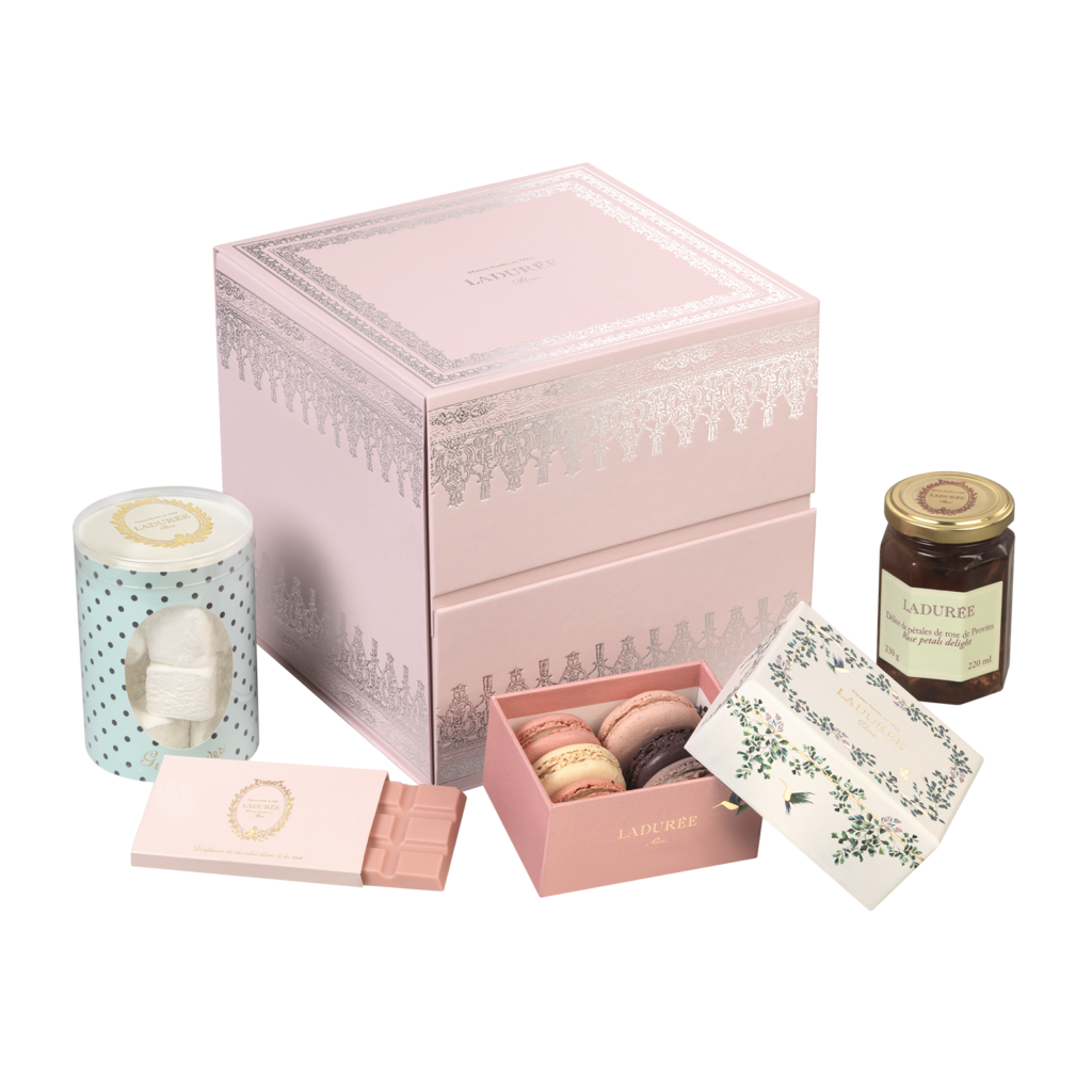 Une délicate attention pour célébrer toutes les Mamans grâce à ce coffret composé de produits fleuris Ladurée : un coffret Jardin Bucolique assorti de 6 macarons, une tablette de chocolat aromatisée à la rose, un délice à la rose et des guimauves à la fleur d’oranger.