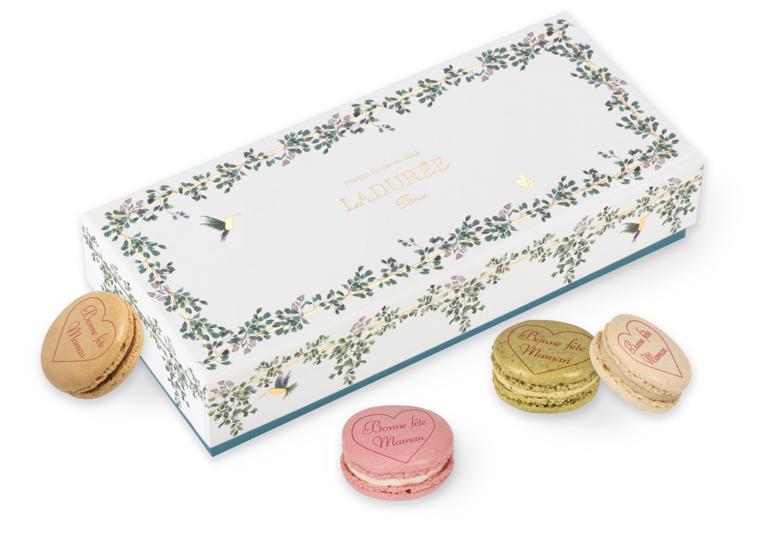 Une délicate attention pour célébrer toutes les Mamans grâce à ce coffret composé de produits fleuris Ladurée : un coffret Jardin Bucolique assorti de 6 macarons, une tablette de chocolat aromatisée à la rose, un délice à la rose et des guimauves à la fleur d’oranger.