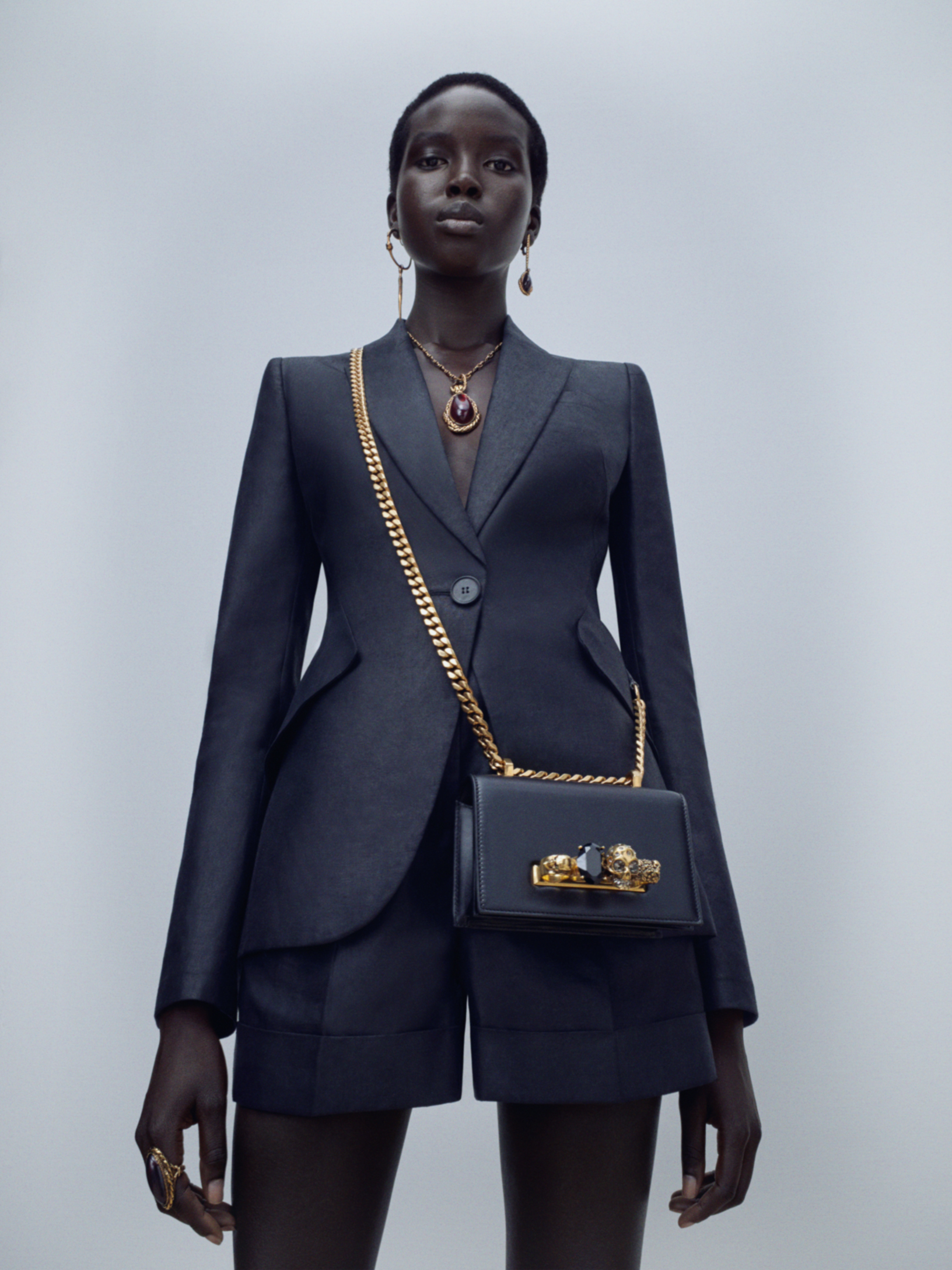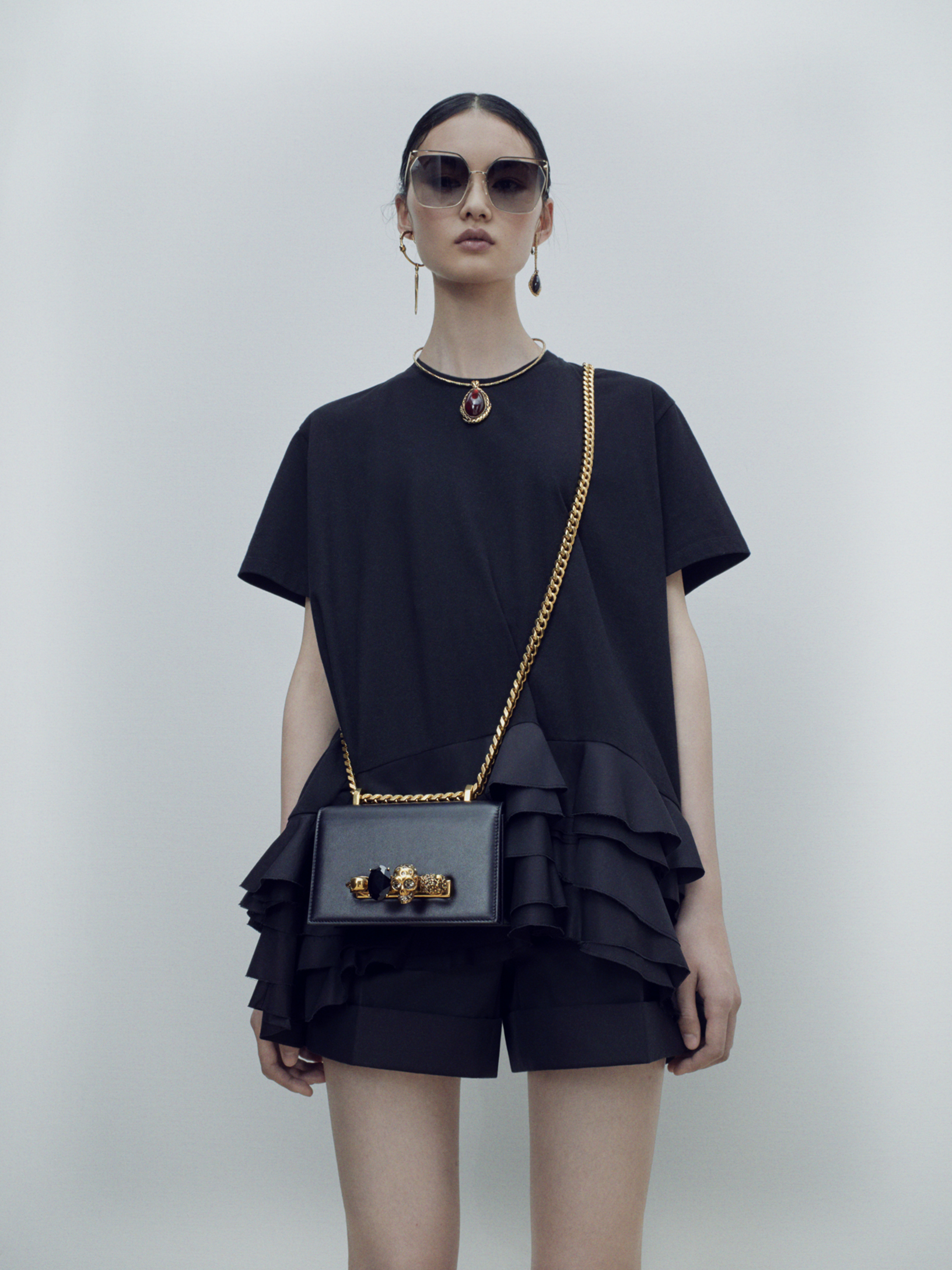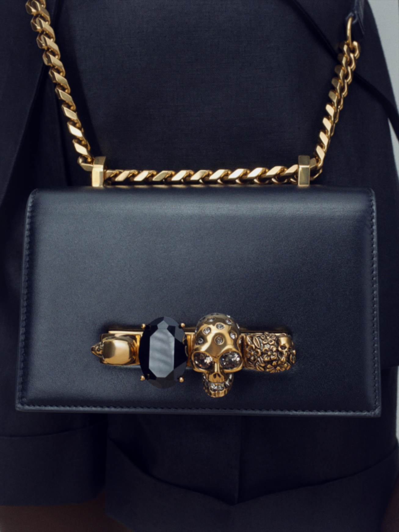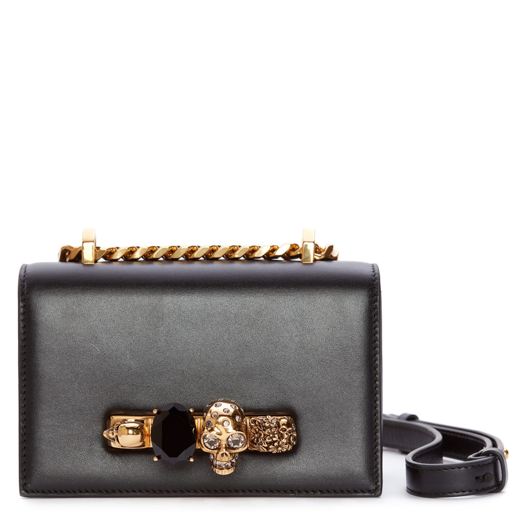 Le Mini Jewelled Satchel se caractérise par la poignée bijou emblématique de la maison avec le crâne. Le sac peut être porté en bandoulière ou porté comme une pochette à travers les quatre anneaux avant.