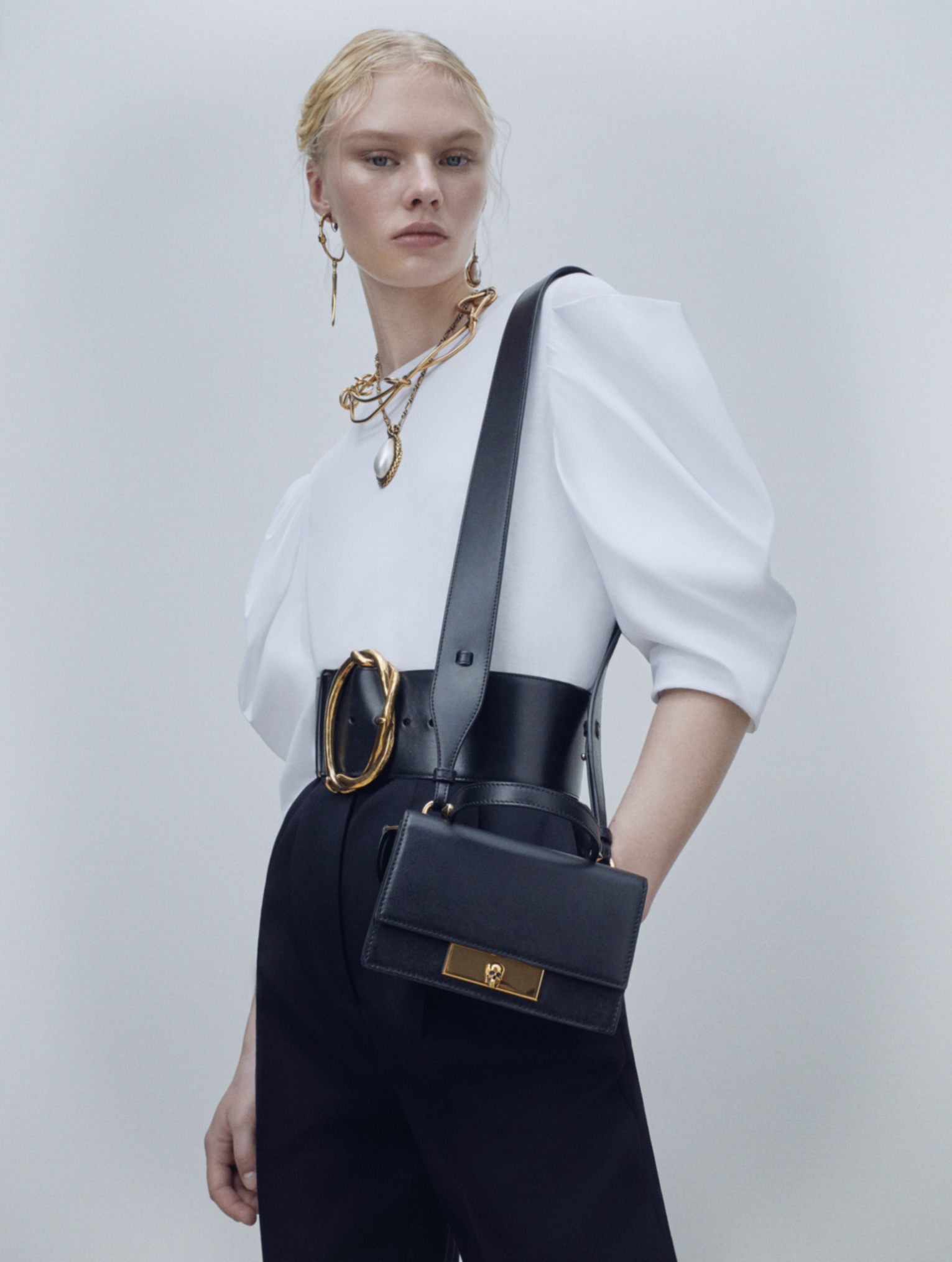 Le Mini Skull Lock Bag possède un fermoir tête de mort et peut également être tenu à la main à l’aide de la poignée supérieure ou porté avec une bandoulière en cuir amovible.