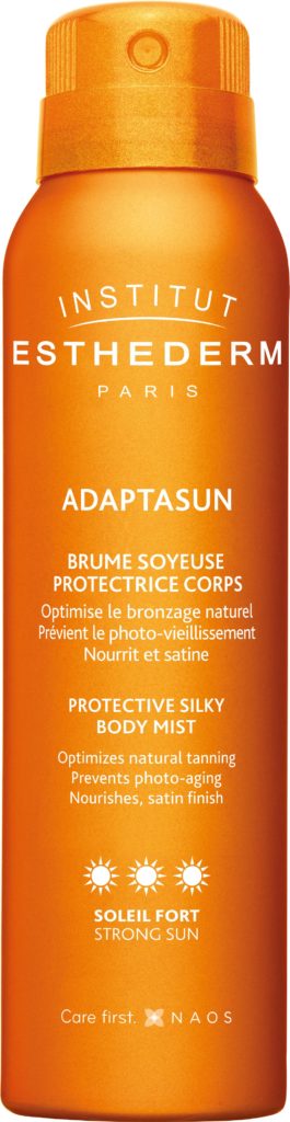 . ADAPTASUN. La BRUME SOYEUSE PROTECTRICE CORPS SOLEIL MODÉRÉ optimise la protection cellulaire et prévient le photovieillissement grâce à la technologie brevetée GLOBAL CELLULAR PROTECTION (visuel).
