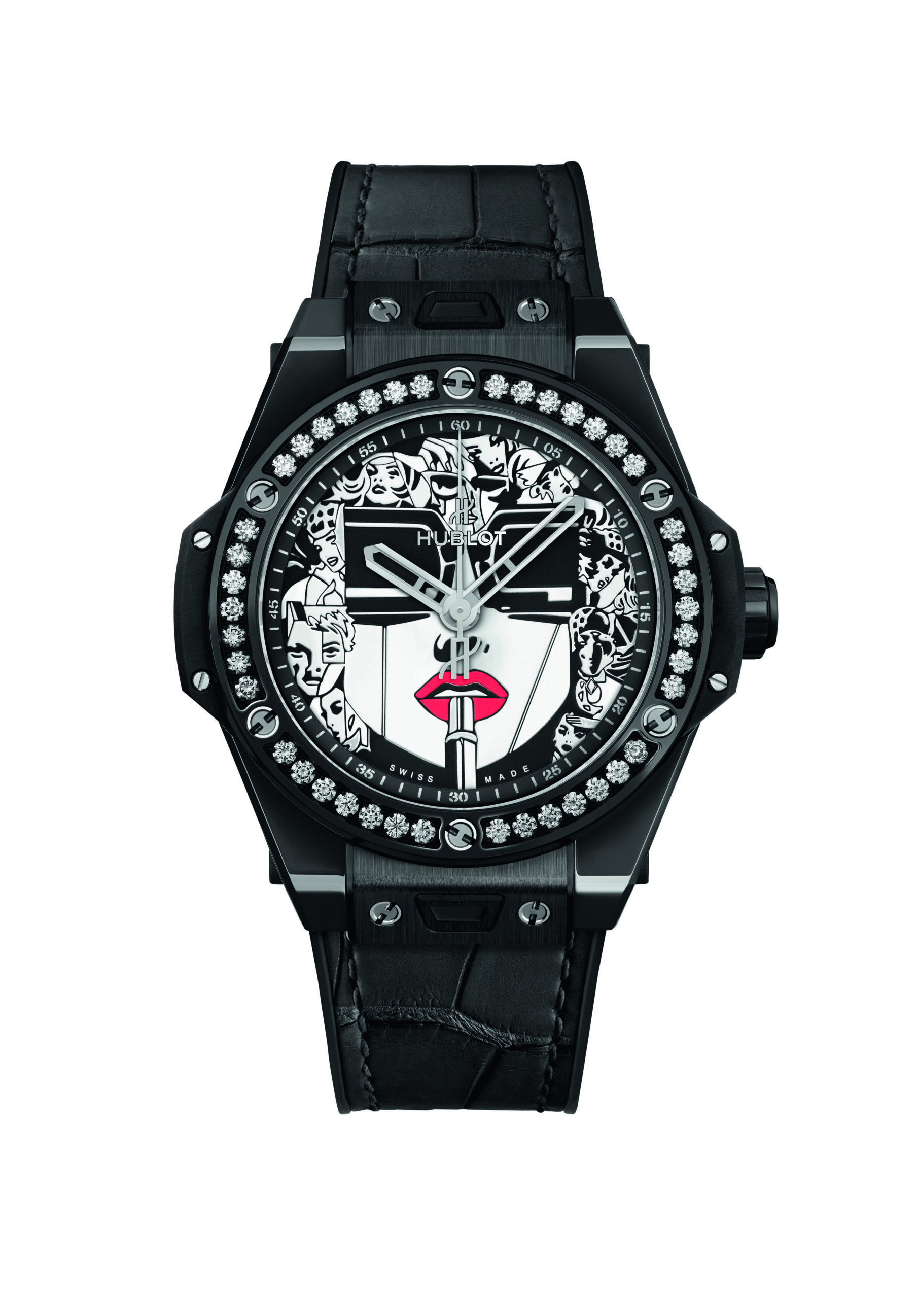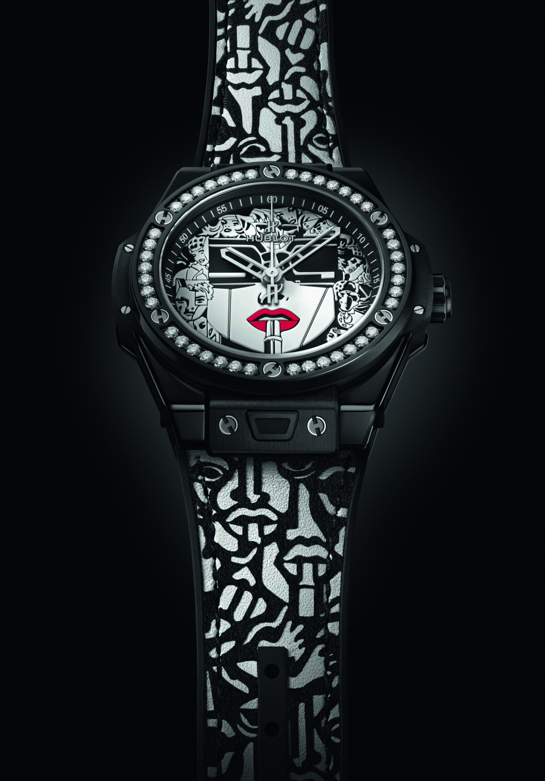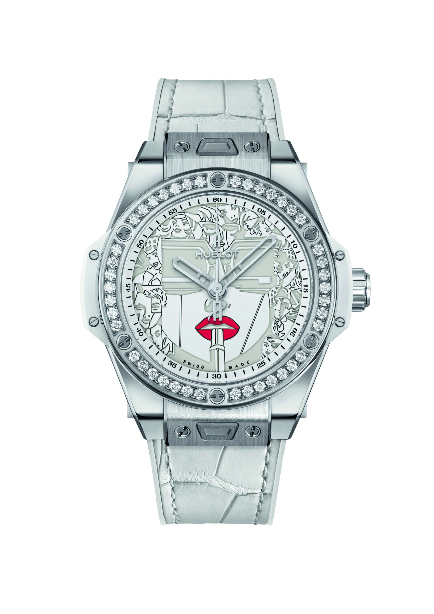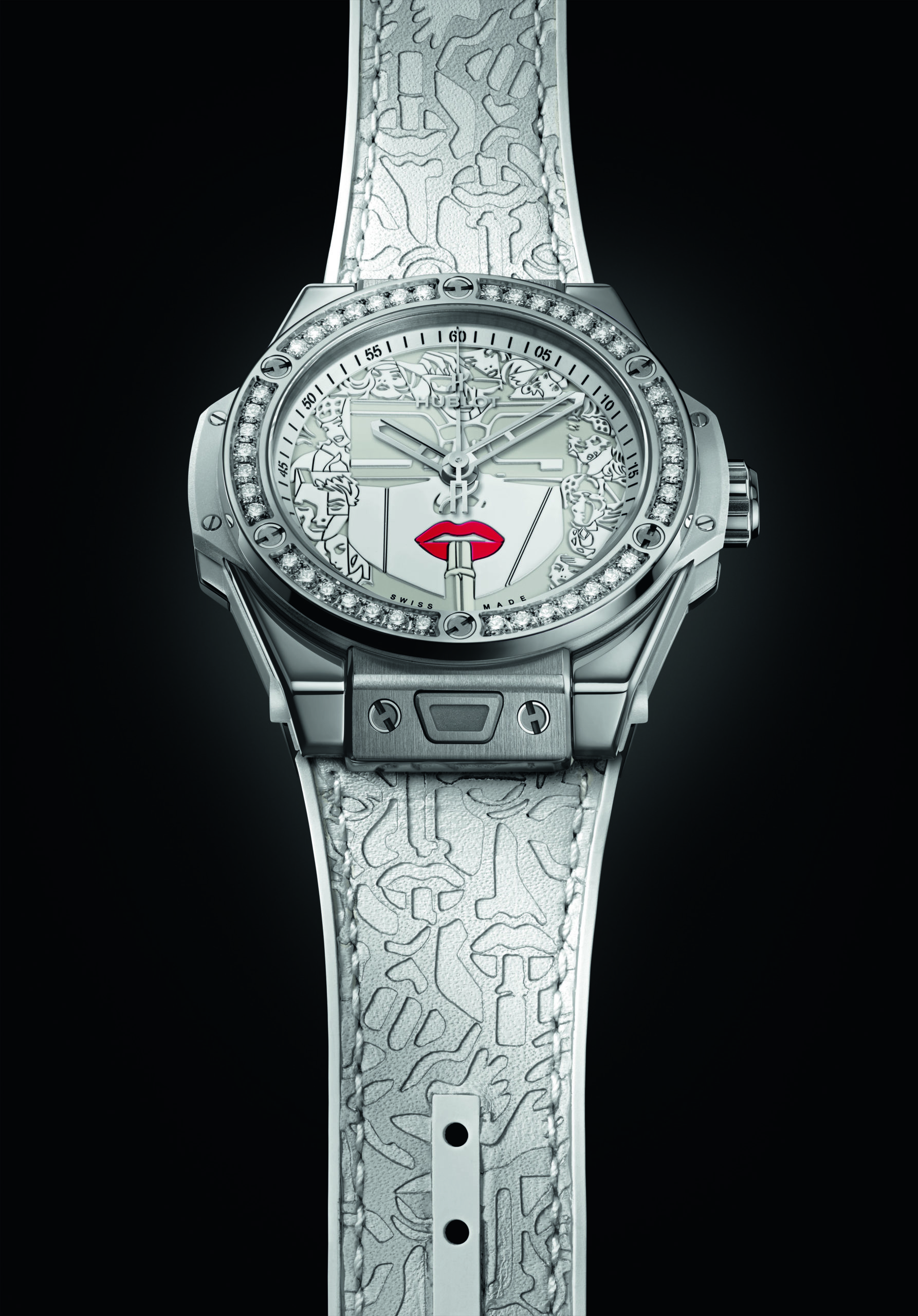 Pour sa deuxième collaboration artistique avec le maître du Storytelling Art, Hublot réinvite Lipstick, l’oeuvre la plus emblématique de Marc Ferrero, sur le cadran de sa Big Bang One Click 39mm.