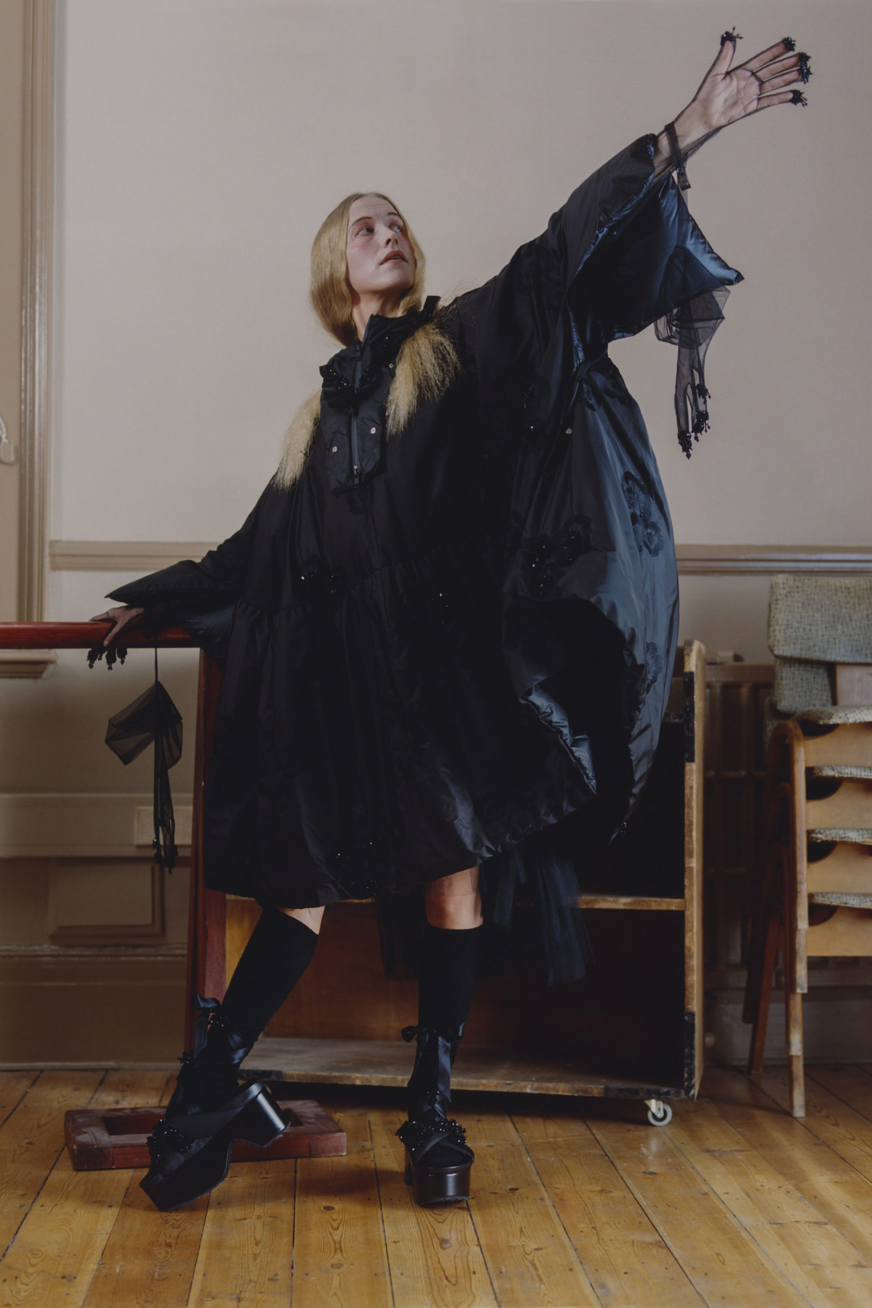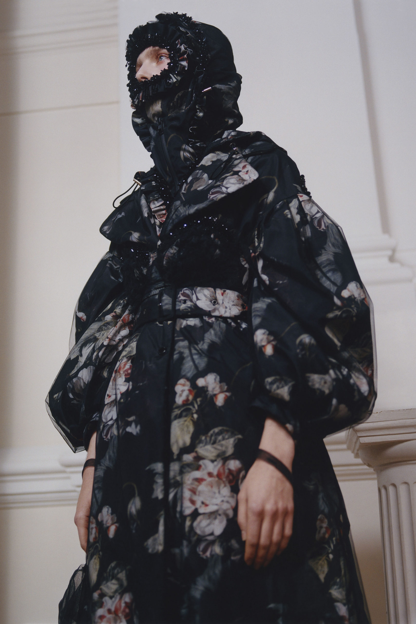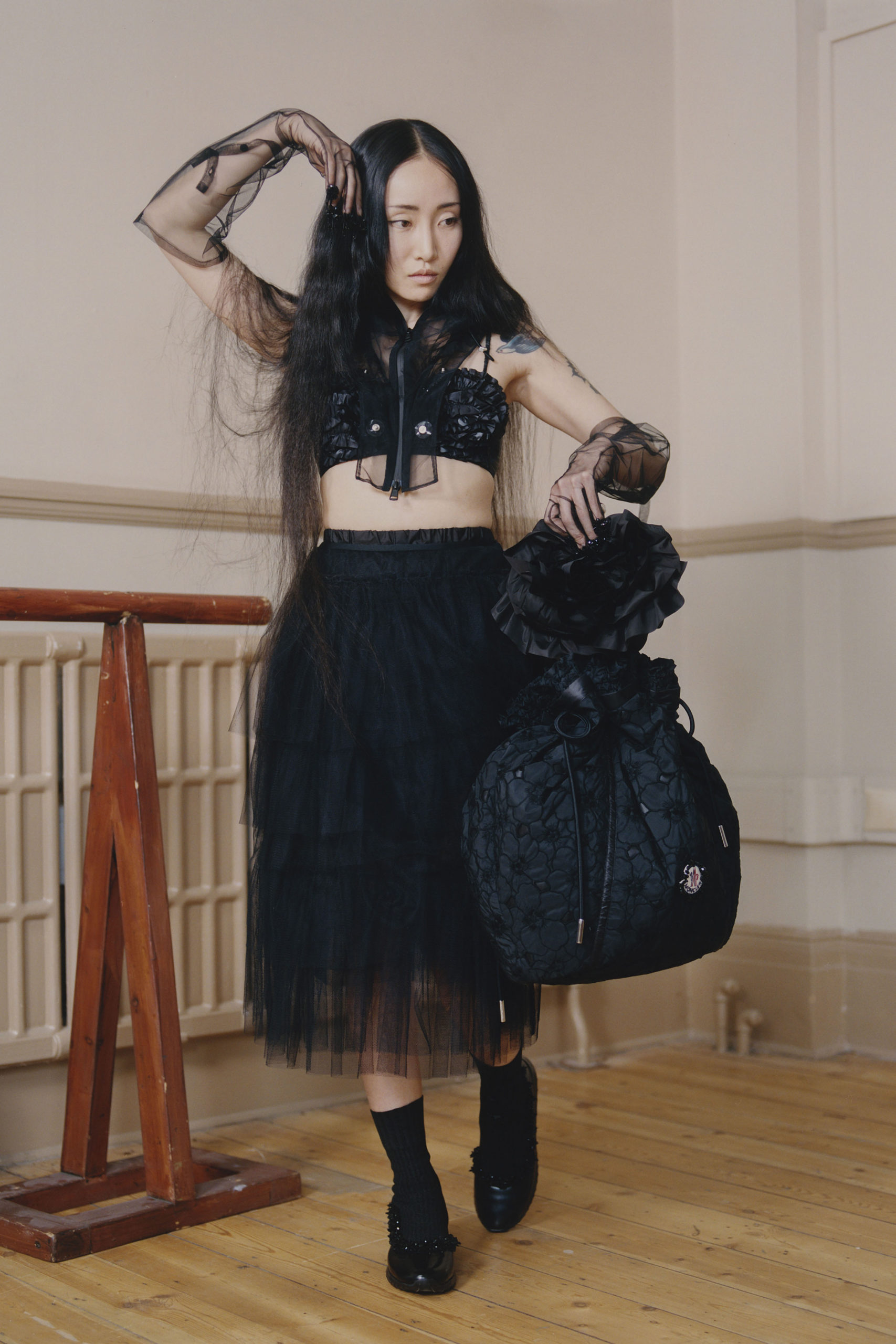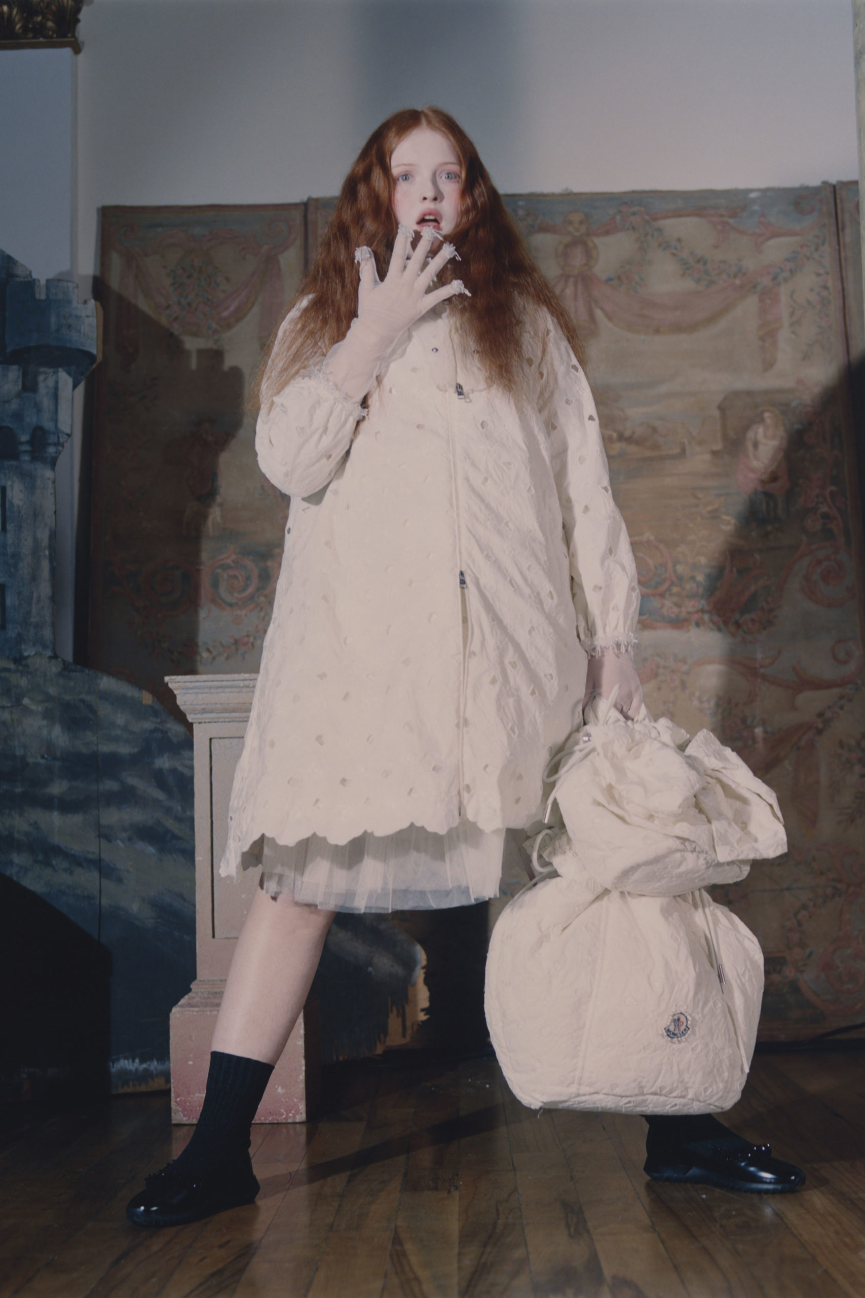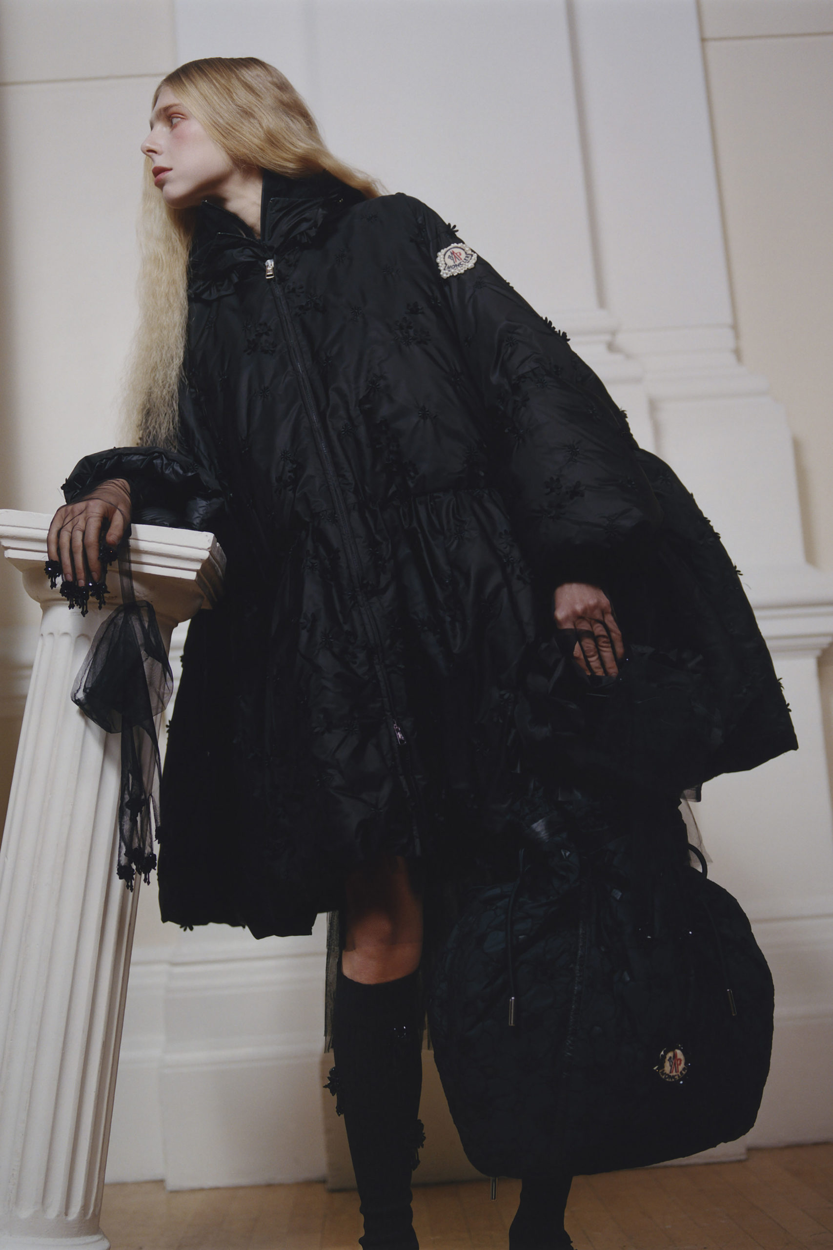 Simone Rocha revisite ses inimitables silhouettes romantiques dans un style à la fois onirique et sportif. S’inspirant de la danse, elle a réalisé des vestes et manteaux de ville en tulle, tissu éthéré par excellence. Les roses, marguerites et pensées fleurissent sous la forme de broderies, accompagnées d’imprimés rehaussés d’une cascade de petits volants. L’esprit « outdoor » de Moncler donne le cadre idéal pour cette collection aux détails sombres et fantaisistes qui s’inspire de Fellini et du mouvement. Les robes trapèze en duvet léger sont recouvertes d’un voile de tulle qui effleure le corps avec grâce. Les vestes et manteaux cintrés explosent en rose, les volants décorent les capuches et la taille des vestes coupe-vent en nylon, des jupes, des shorts, des sweat-shirts ainsi que des T-shirts. Le trench-coat est réinventé dans des formes arrondies et volumineuses accompagné d’ornements précieux, s’éloignant de ses origines militaires pour se teinter de féminité quant au logo il devient un écusson en cristal. Les matières utilisées sont le micro-taffetas, le nylon laqué, le tulle et le nylon léger, déclinés en ivoire, rouge, vert citron, bleu ciel, beige et noir. Les talons compensés, les ballerines et les sacs complètent la collection.