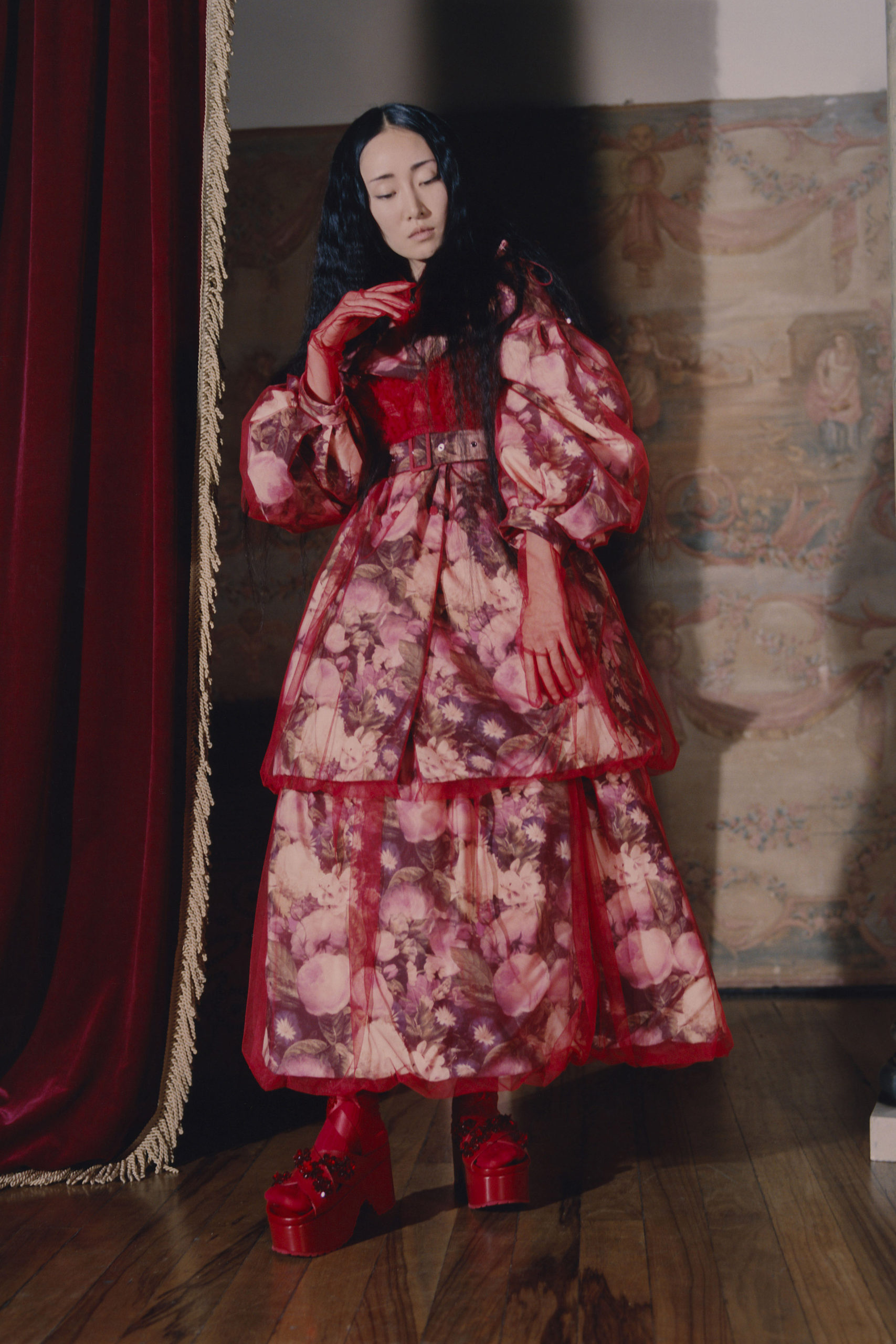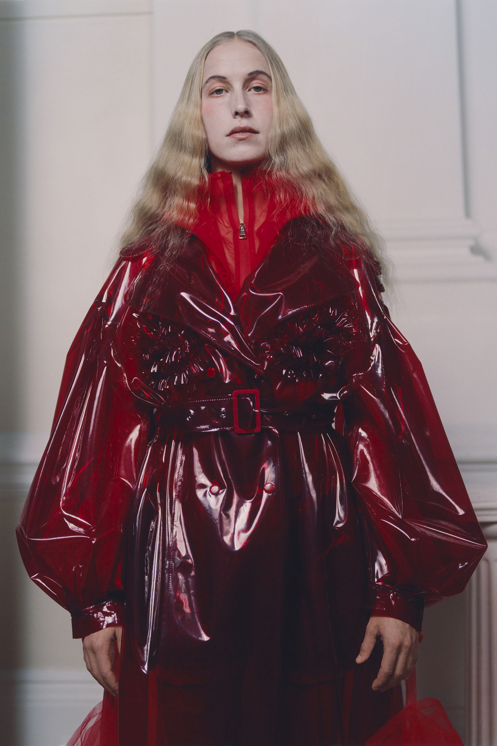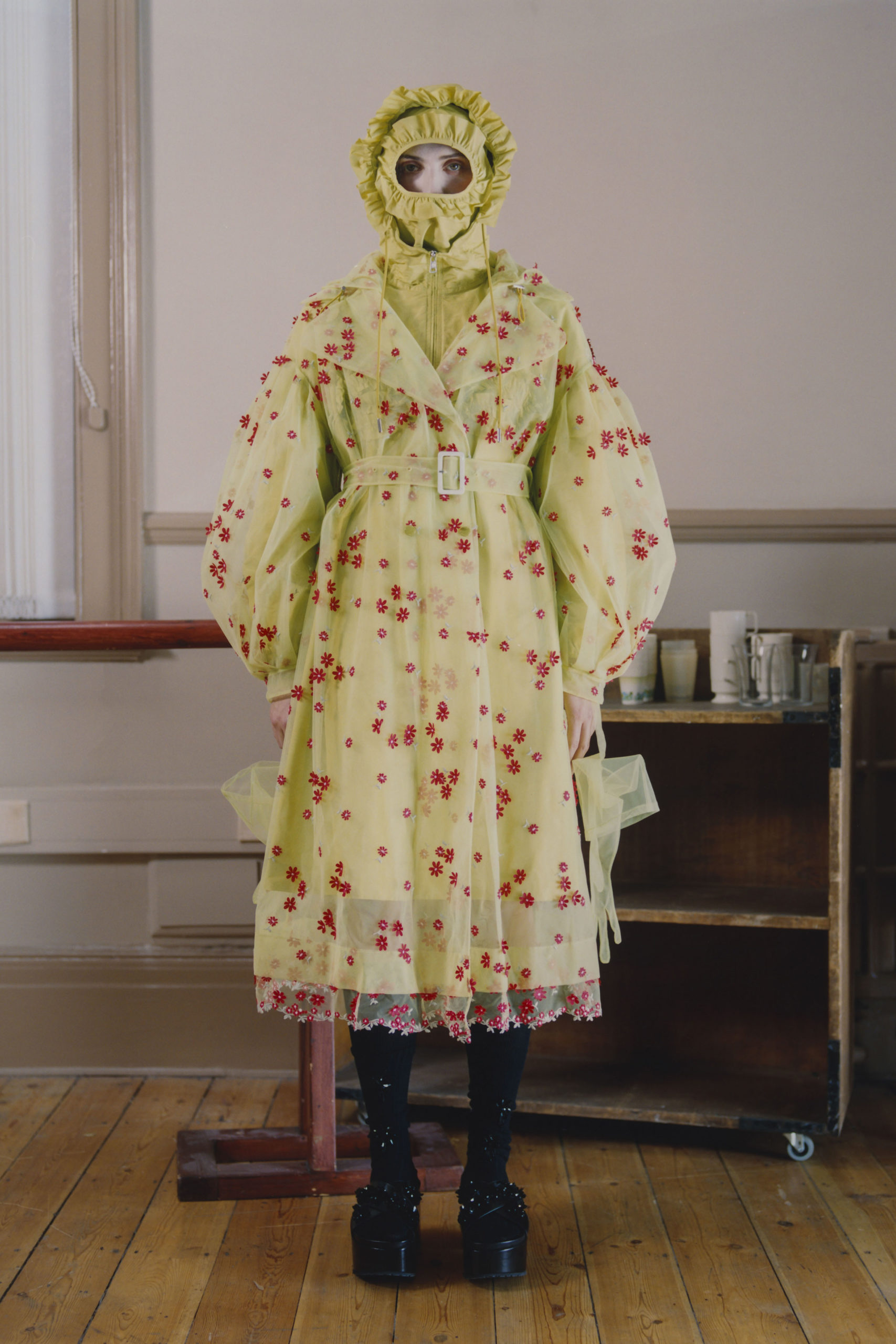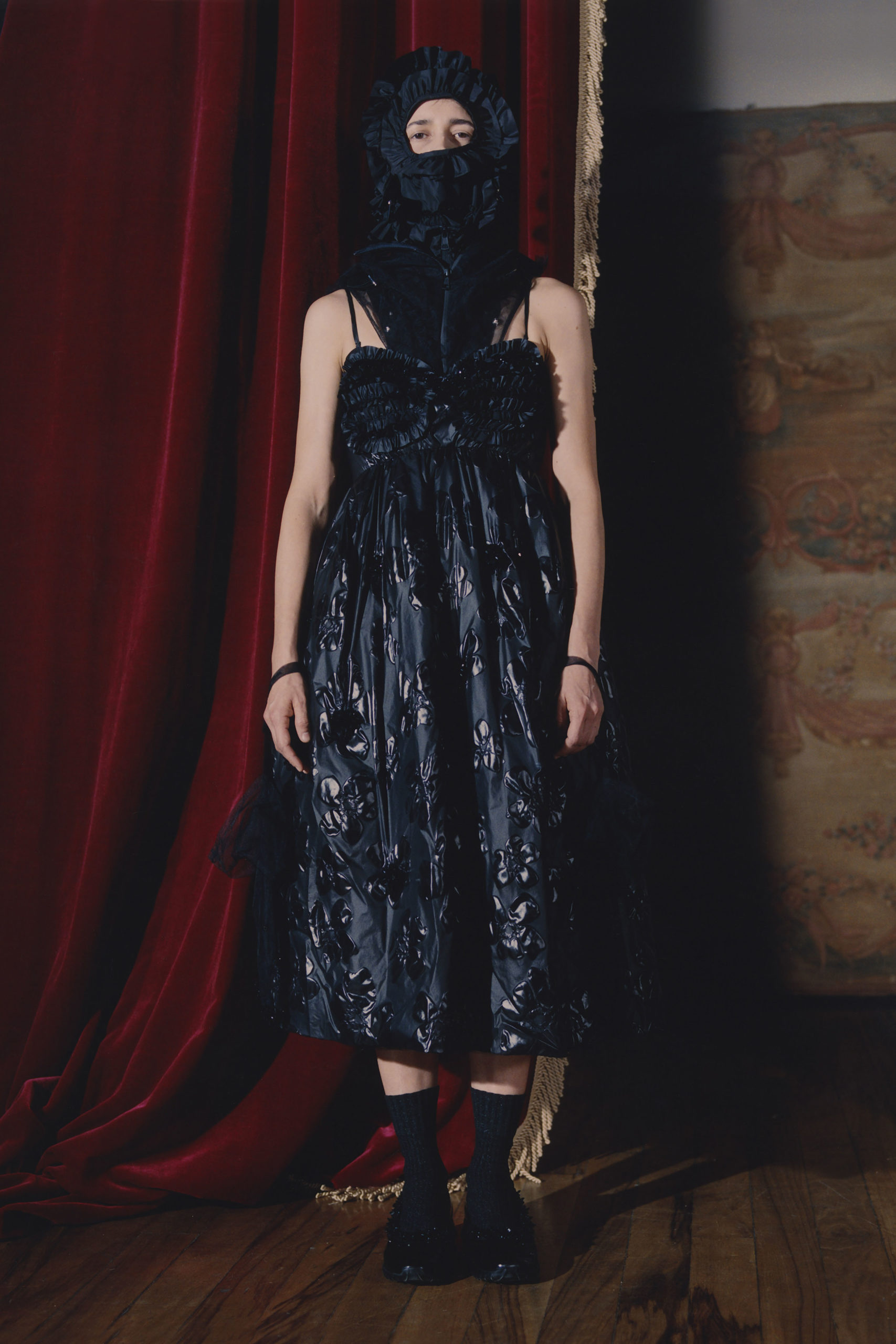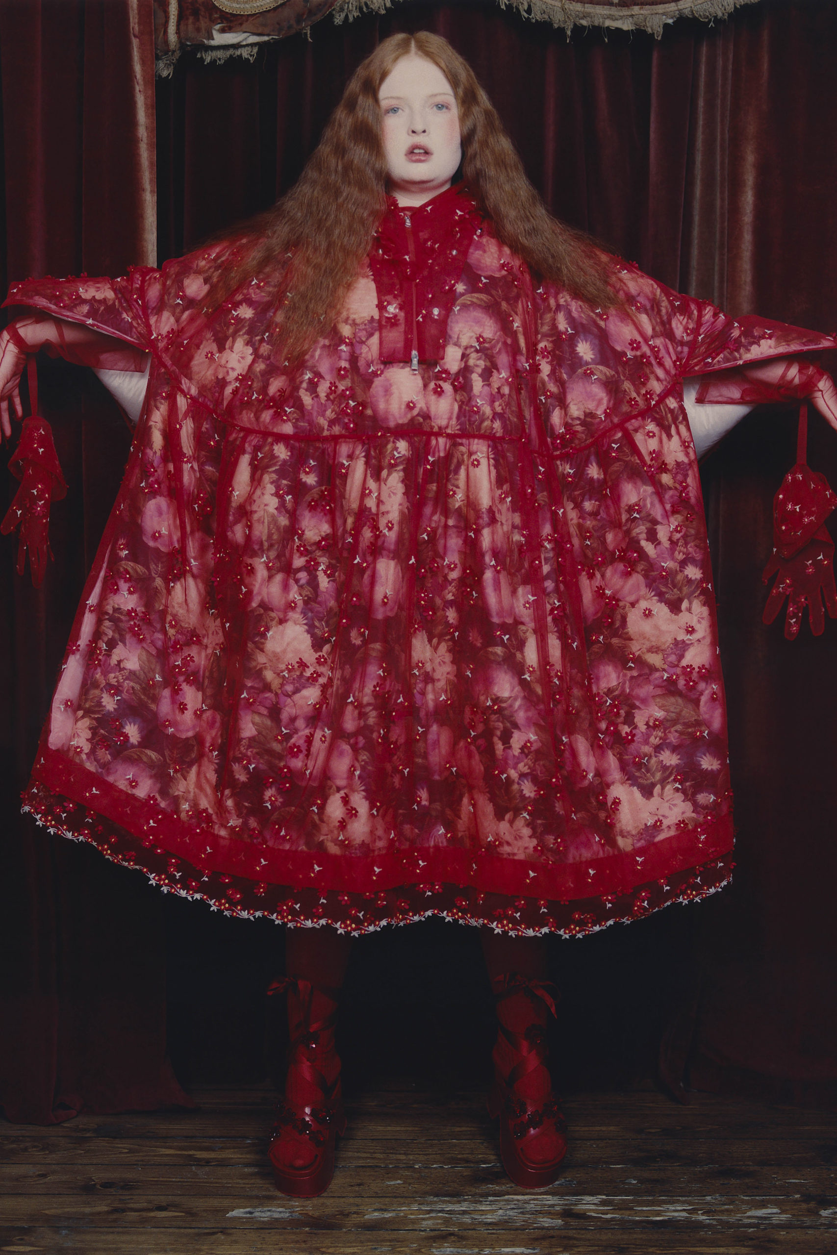 Simone Rocha revisite ses inimitables silhouettes romantiques dans un style à la fois onirique et sportif. S’inspirant de la danse, elle a réalisé des vestes et manteaux de ville en tulle, tissu éthéré par excellence. Les roses, marguerites et pensées fleurissent sous la forme de broderies, accompagnées d’imprimés rehaussés d’une cascade de petits volants. L’esprit « outdoor » de Moncler donne le cadre idéal pour cette collection aux détails sombres et fantaisistes qui s’inspire de Fellini et du mouvement. Les robes trapèze en duvet léger sont recouvertes d’un voile de tulle qui effleure le corps avec grâce. Les vestes et manteaux cintrés explosent en rose, les volants décorent les capuches et la taille des vestes coupe-vent en nylon, des jupes, des shorts, des sweat-shirts ainsi que des T-shirts. Le trench-coat est réinventé dans des formes arrondies et volumineuses accompagné d’ornements précieux, s’éloignant de ses origines militaires pour se teinter de féminité quant au logo il devient un écusson en cristal. Les matières utilisées sont le micro-taffetas, le nylon laqué, le tulle et le nylon léger, déclinés en ivoire, rouge, vert citron, bleu ciel, beige et noir. Les talons compensés, les ballerines et les sacs complètent la collection.