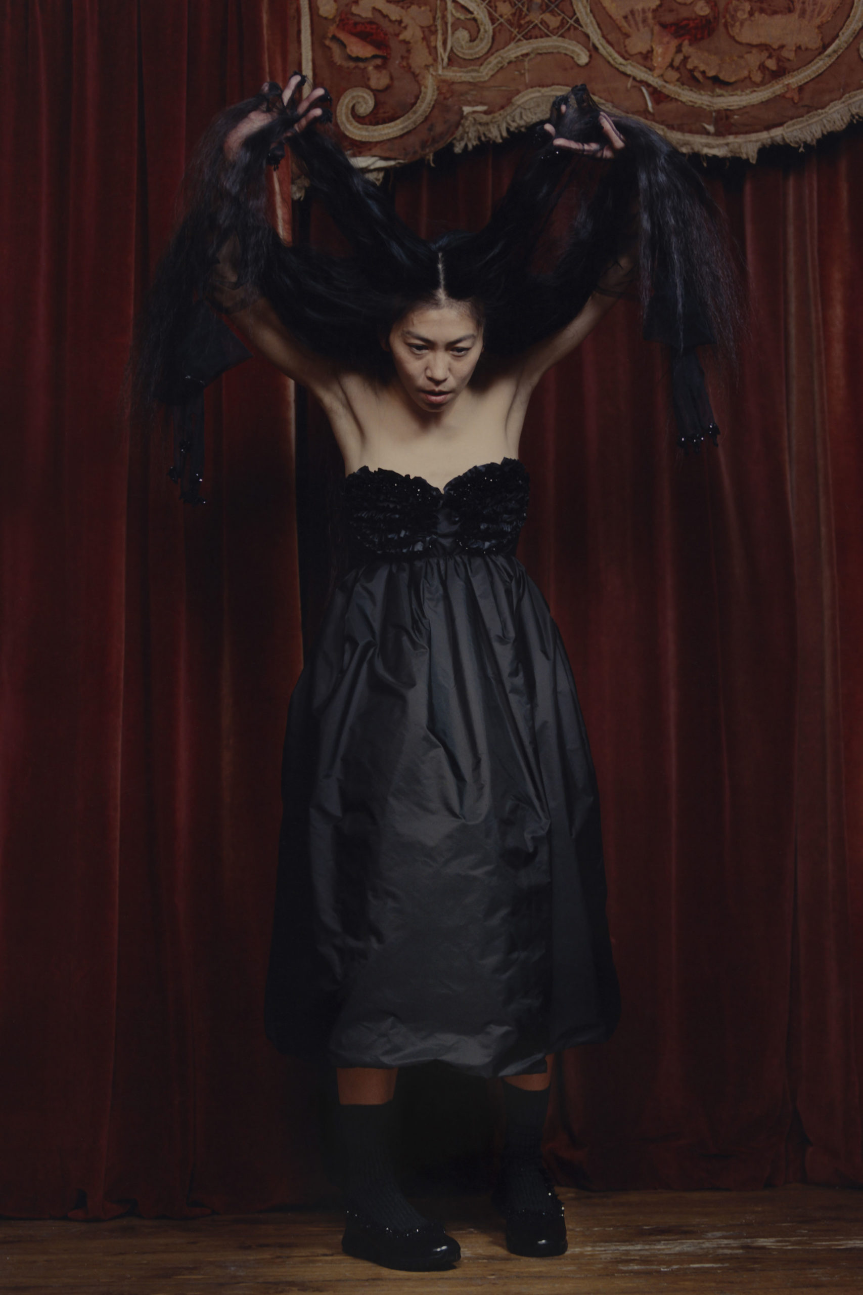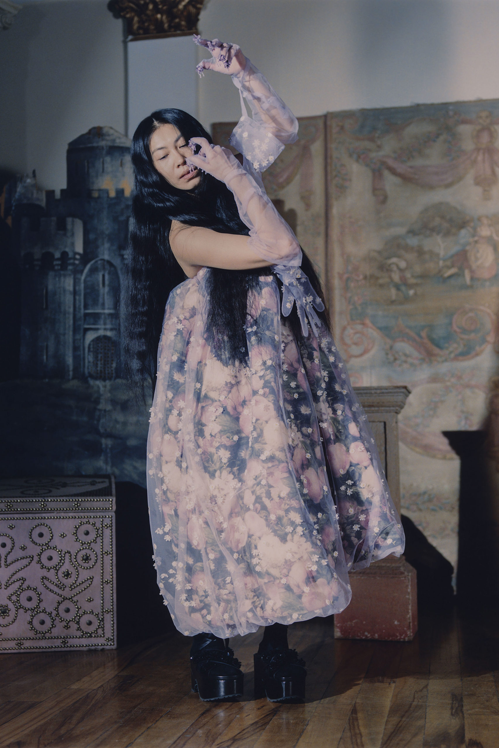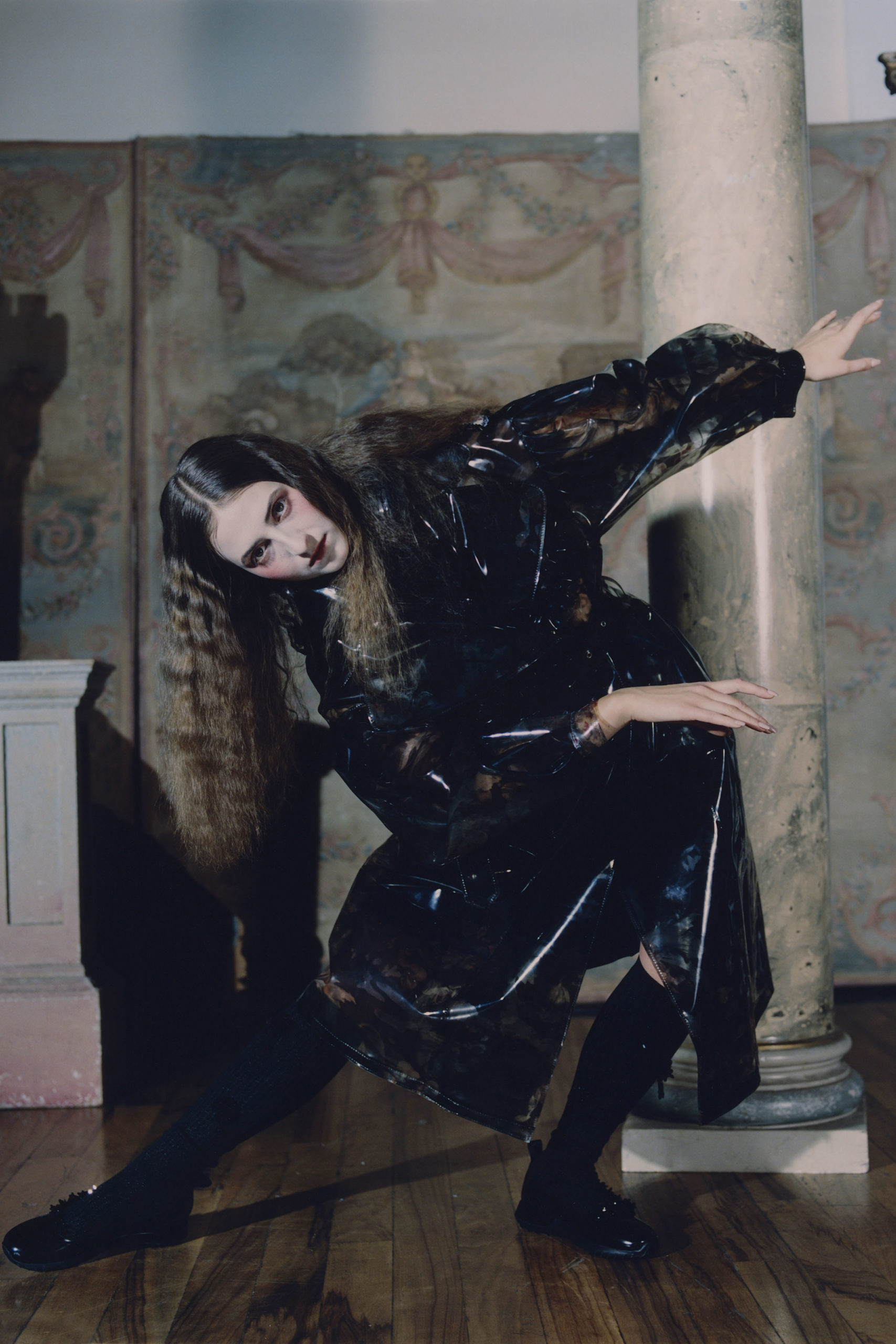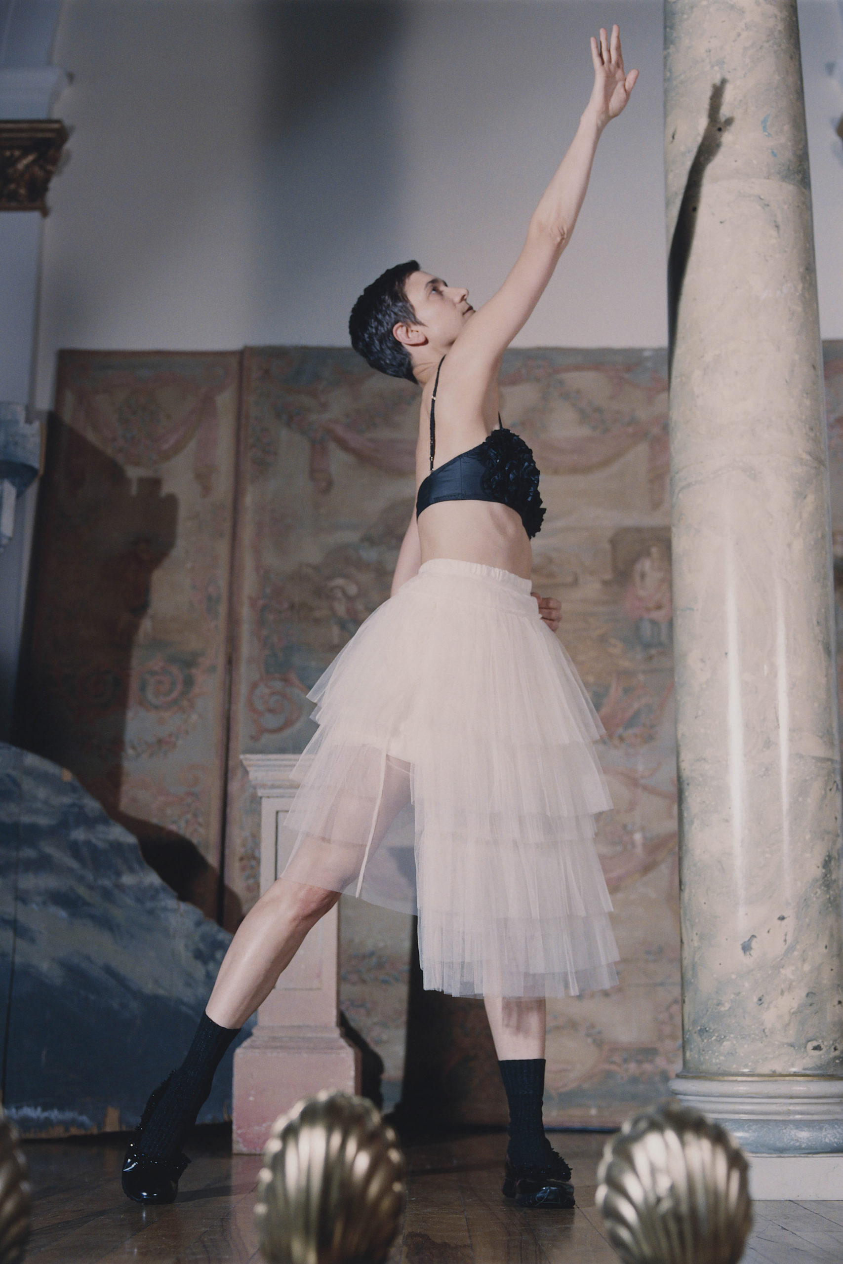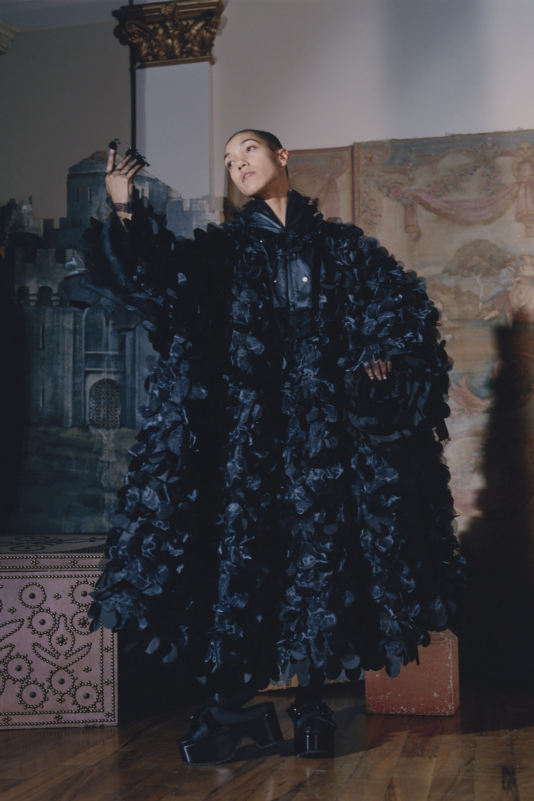 Simone Rocha revisite ses inimitables silhouettes romantiques dans un style à la fois onirique et sportif. S’inspirant de la danse, elle a réalisé des vestes et manteaux de ville en tulle, tissu éthéré par excellence. Les roses, marguerites et pensées fleurissent sous la forme de broderies, accompagnées d’imprimés rehaussés d’une cascade de petits volants. L’esprit « outdoor » de Moncler donne le cadre idéal pour cette collection aux détails sombres et fantaisistes qui s’inspire de Fellini et du mouvement. Les robes trapèze en duvet léger sont recouvertes d’un voile de tulle qui effleure le corps avec grâce. Les vestes et manteaux cintrés explosent en rose, les volants décorent les capuches et la taille des vestes coupe-vent en nylon, des jupes, des shorts, des sweat-shirts ainsi que des T-shirts. Le trench-coat est réinventé dans des formes arrondies et volumineuses accompagné d’ornements précieux, s’éloignant de ses origines militaires pour se teinter de féminité quant au logo il devient un écusson en cristal. Les matières utilisées sont le micro-taffetas, le nylon laqué, le tulle et le nylon léger, déclinés en ivoire, rouge, vert citron, bleu ciel, beige et noir. Les talons compensés, les ballerines et les sacs complètent la collection.