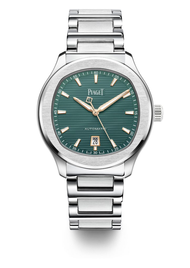 La Piaget Polo est un garde-temps idéal pour les gentlemen qui aiment sortir du lot. Il est audacieux, unique, absolument magnifique et toujours élégant. Il est conçu pour les hommes exigeants envers eux-mêmes, qui aiment célébrer et partager leurs réussites comme ils l’entendent. La Piaget Polo est facilement reconnaissable à son cadran en forme de coussin, niché dans un boîtier rond. Limitée à 888 exemplaires, cette toute nouvelle version arbore un cadran guilloché horizontal d’un vert saisissant, dont émanent des nuances bleutées. Elle est assortie d’un boîtier en acier inoxydable de 42 mm et d’un bracelet intégré qui alterne les maillons polis et satinés, disposés en « H ». Son magnifique cadran vert s’habille d’aiguilles couleur or rose, d’index en or et d’un guichet de date. Les aiguilles et index sont également revêtus de Superluminova pour permettre une lecture optimale lorsque la luminosité est faible, et l’aiguille des secondes affiche l’élégant « P » de Piaget sur son contrepoids. Ce garde-temps est animé par le mouvement 1110P à remontage automatique de Piaget, dont la masse oscillante gris anthracite se dévoile à travers le fond en verre saphir.