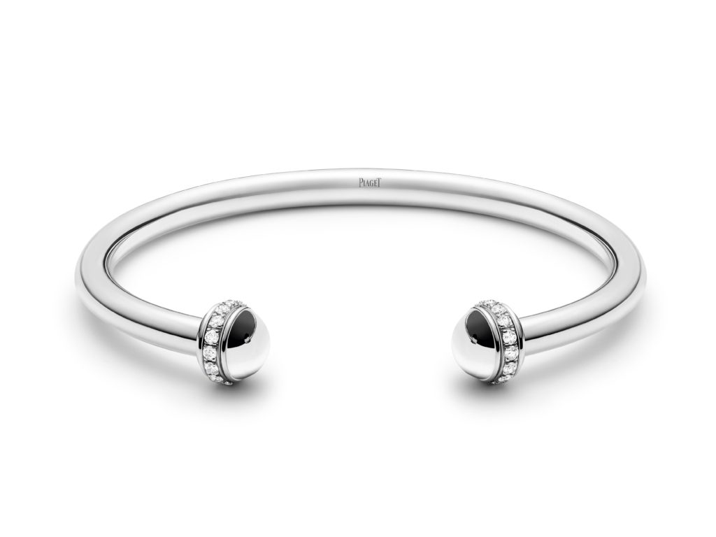 A voluptuous white gold bangle bracelet brings the daily ritual of the Possession ring to the wrist. Putting in motion the wheels of destiny, two turning paved bands sparkling with the shine of brilliant-cut diamonds rotate freely at either end of this elegant companion. A stylish precious white gold bangle bracelet designed to be worn on its own or in combination with other gold colors from the Piaget jewelry collection, Possession is symbolic of the choices every woman makes for herself as she makes the world hers.