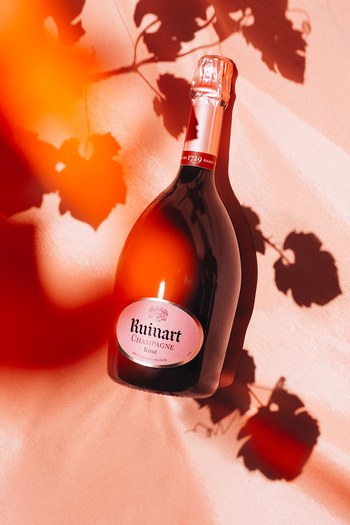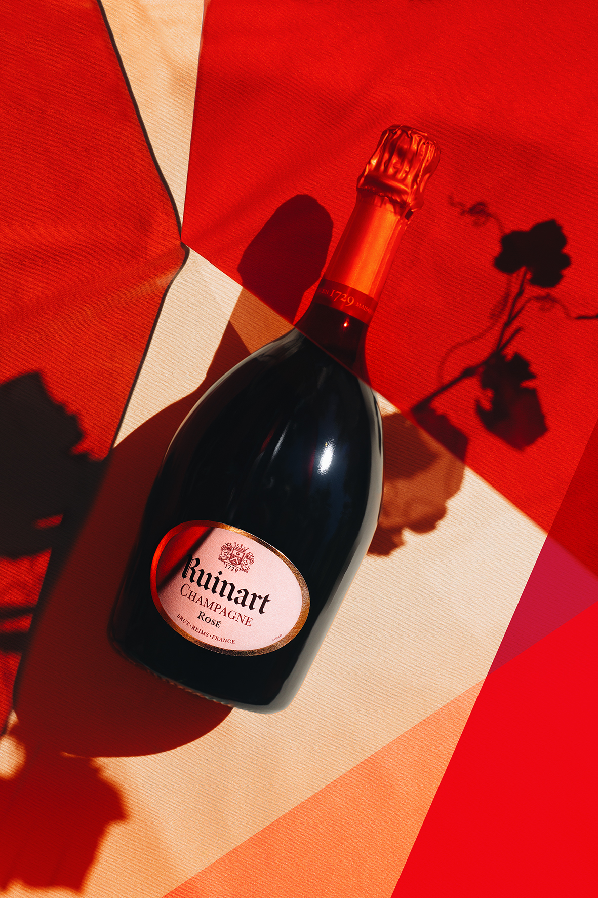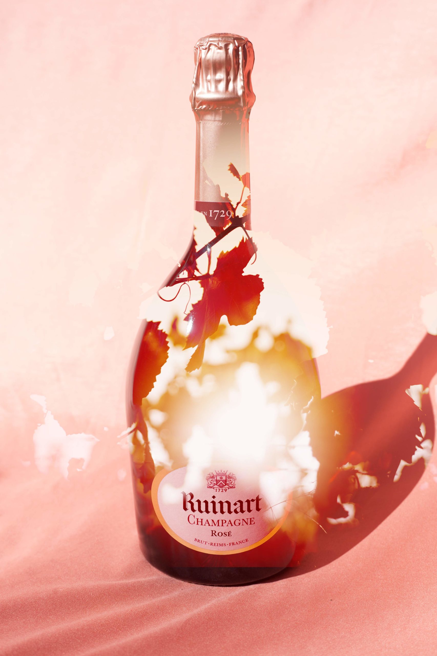 « Il m’importe de ne pas proposer des images qui ne seraient constituées que d’un seul point de vue, mais au contraire de proposer des photographies composées de multiples strates, influences… comme l’est aussi le champagne. Les flacons de Ruinart Rosé sont montrés ici pris entre l’intemporalité des paysages naturels du vignoble champenois évoqués par les feuilles de vignes, et des couleurs et motifs qui évoquent la contemporanéité de notre ère digitale. » explique Elsa Leydier.