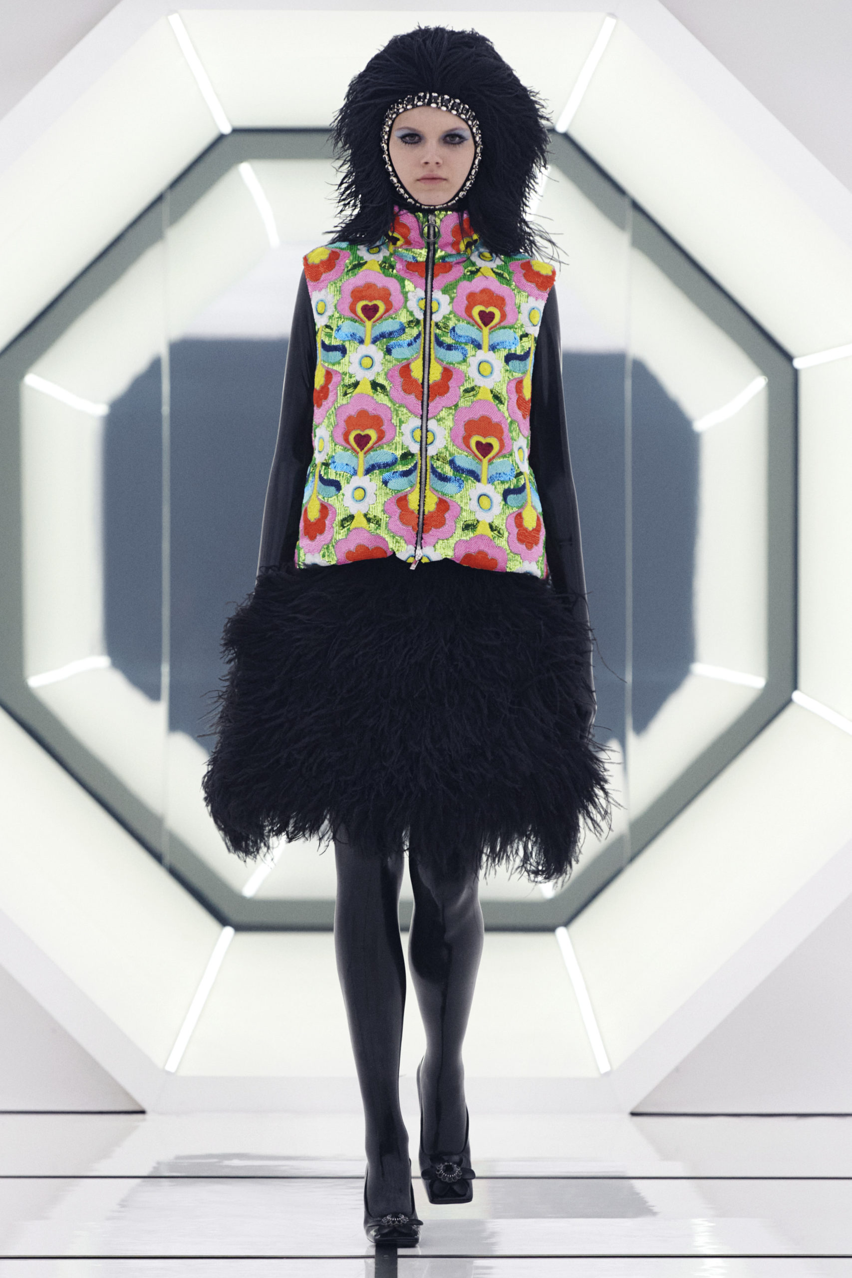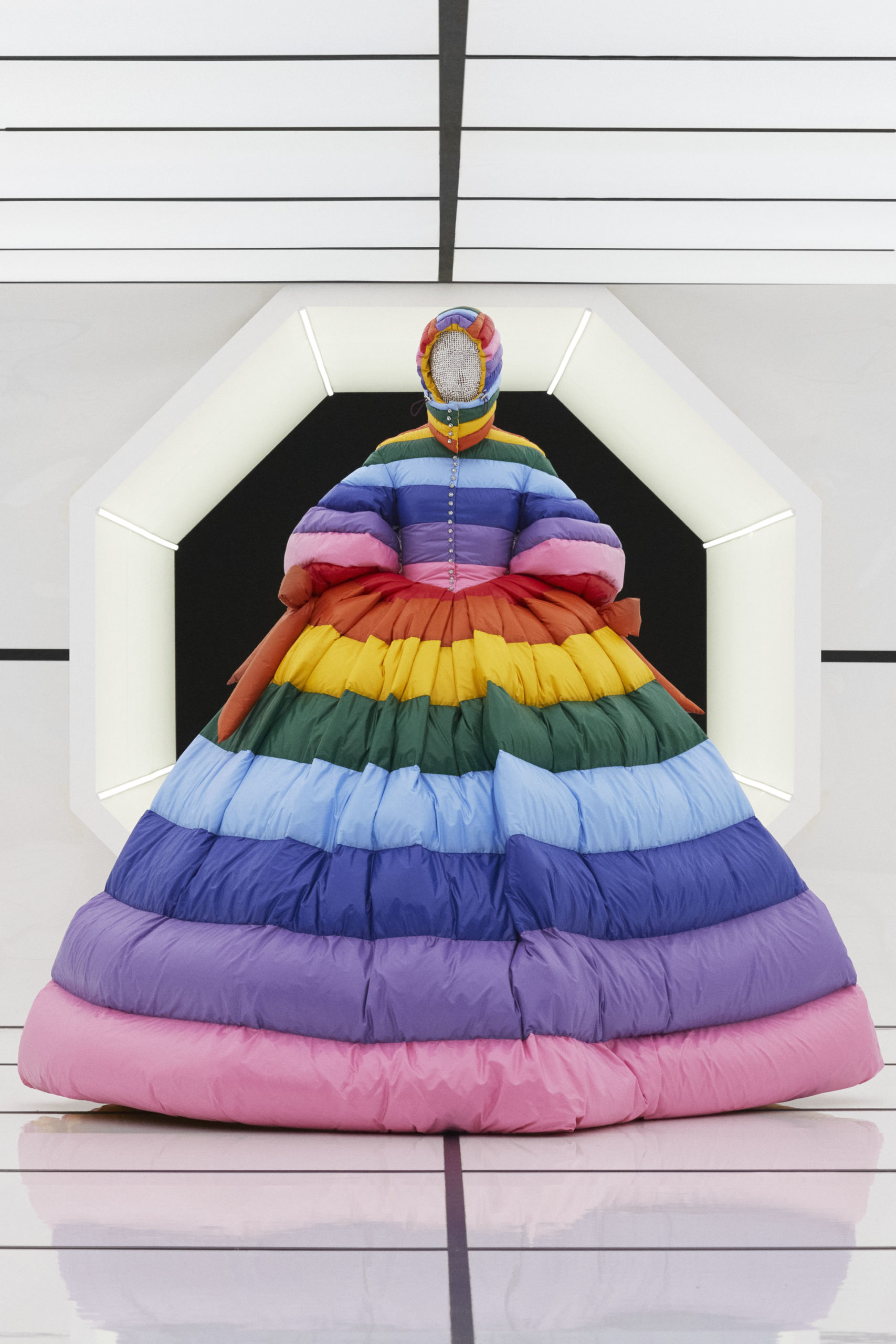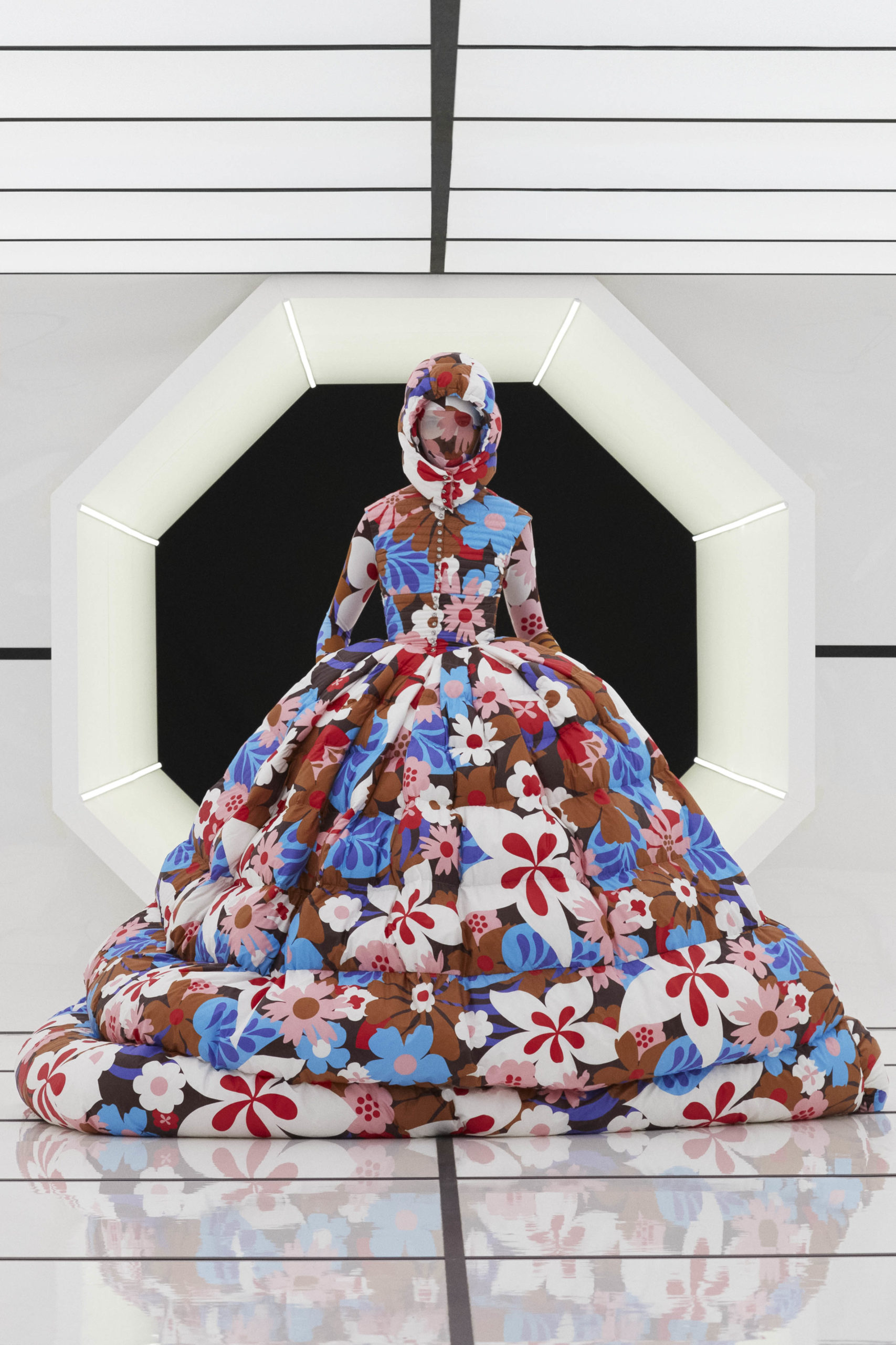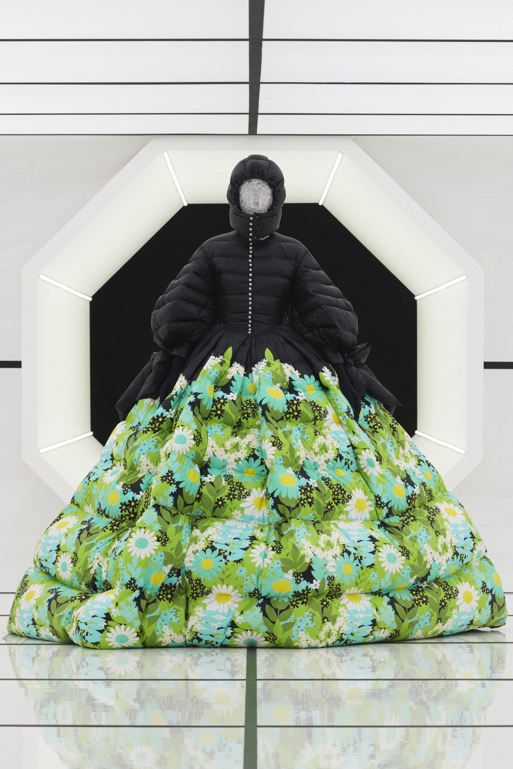 Les matières utilisées sont le nylon laqué, la gabardine enduite de résine pour une coupe droite, le satin duchesse et le twill de nylon technique. Cagoules à plumes, escarpins décorés, bottes matelassées de duvet à talon haut, cabas et sacs Sfera complètent la collection. Une capsule de robes et de jupes haute couture brodées porte le maximalisme à son paroxysme.